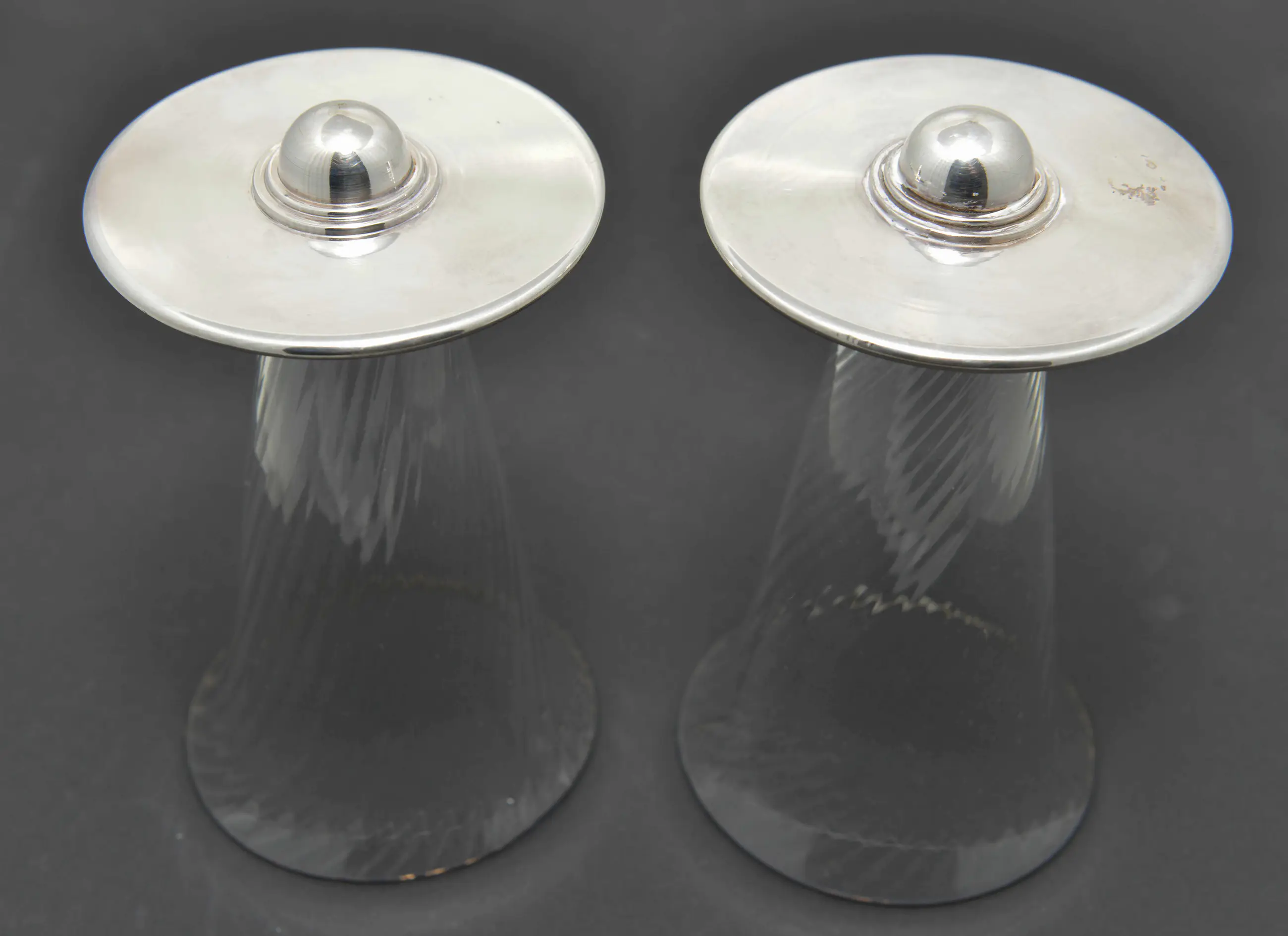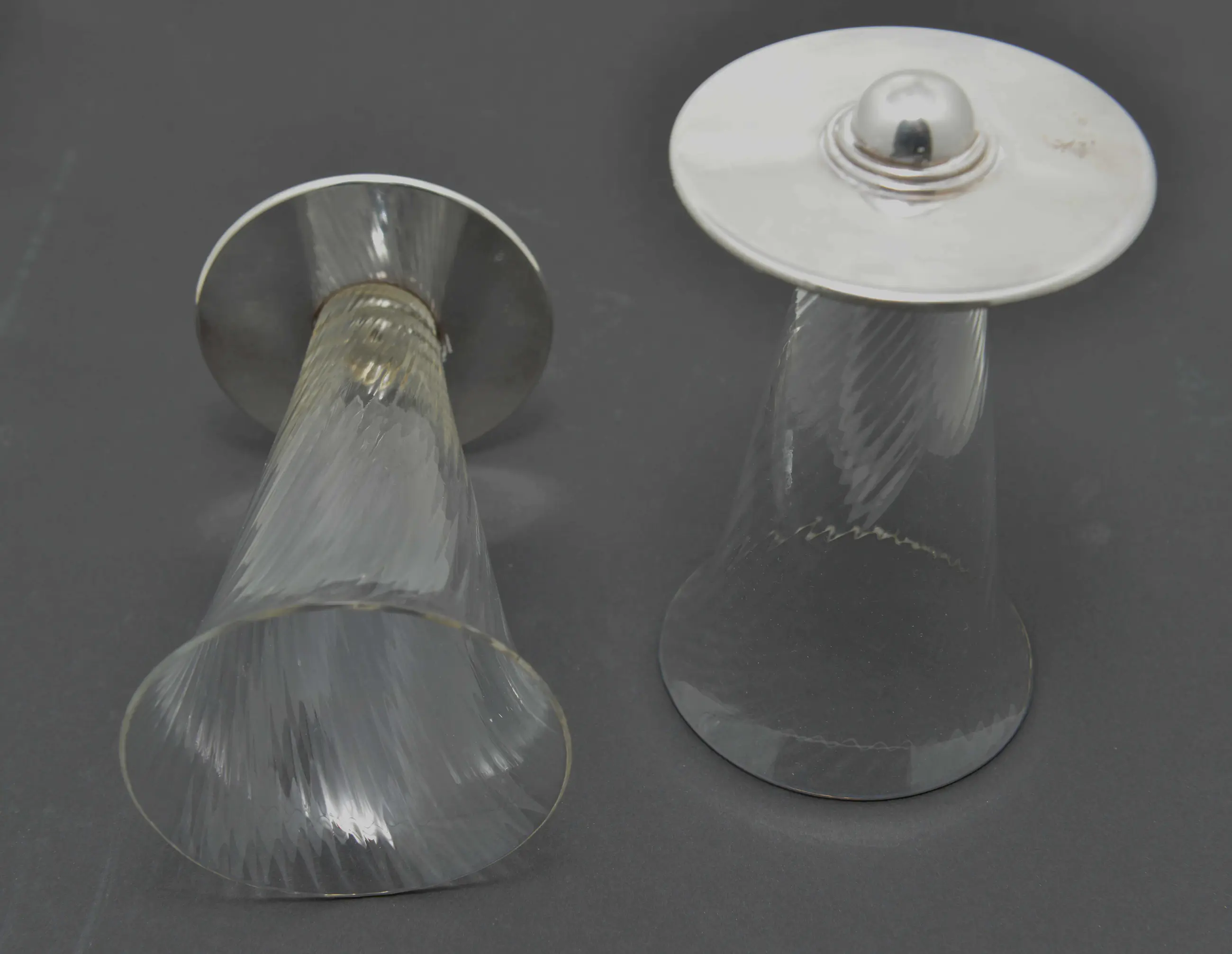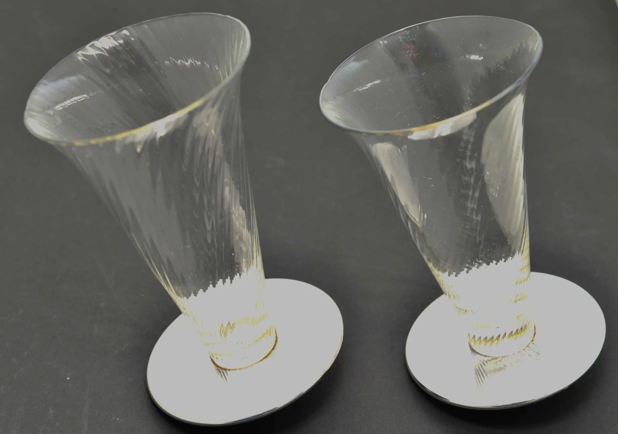 Hand geblazen kristal , in vorm geblazen met draaiende ribbels op zilveren ronde voet waardoor het glas kan ronddraaien