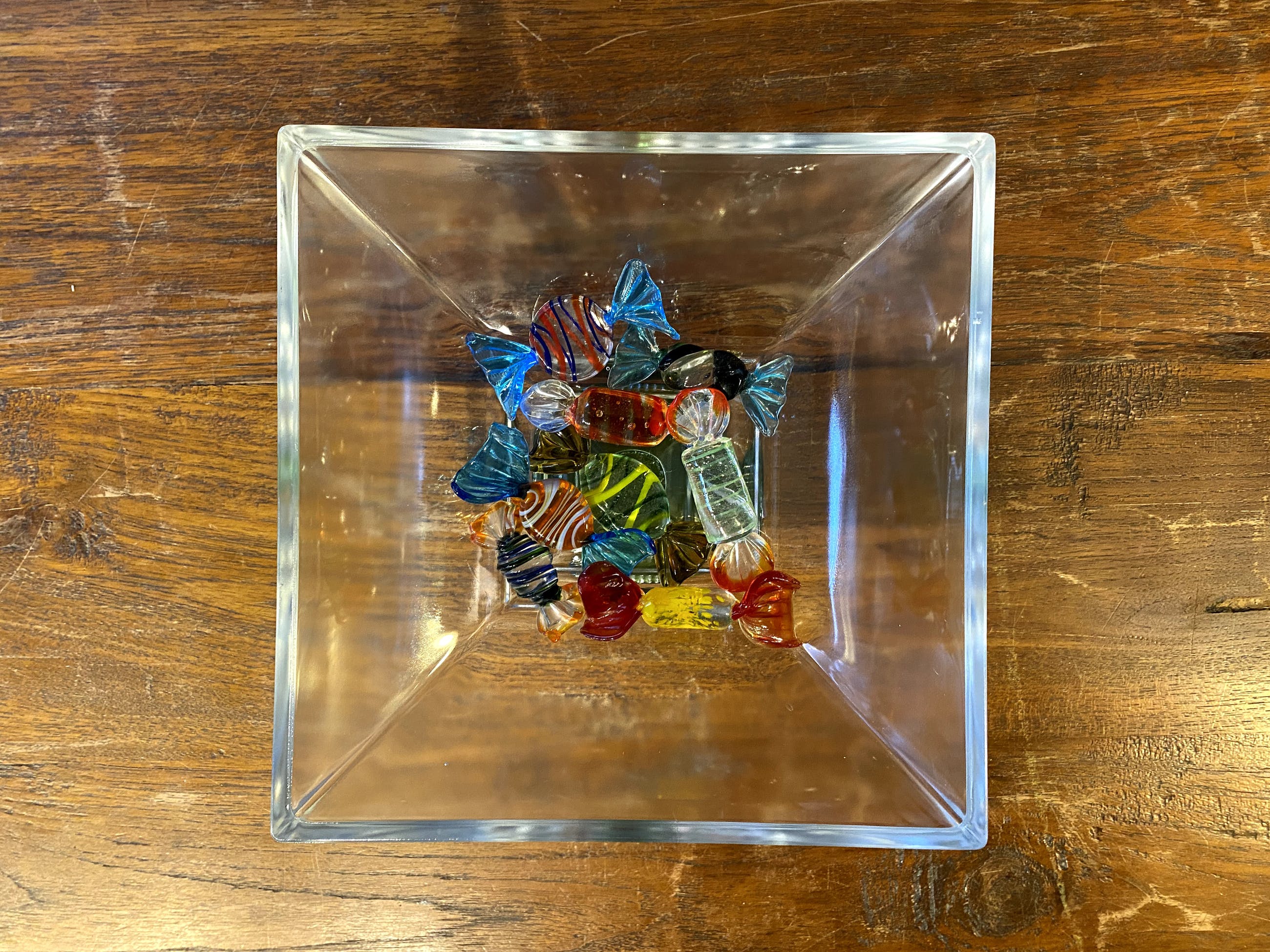 Bovenste kant van een stolp van Borek Sipek. Onderkant is verdwenen. Altijd als schaal gebruikt met enkele glazen snoepjes erin.