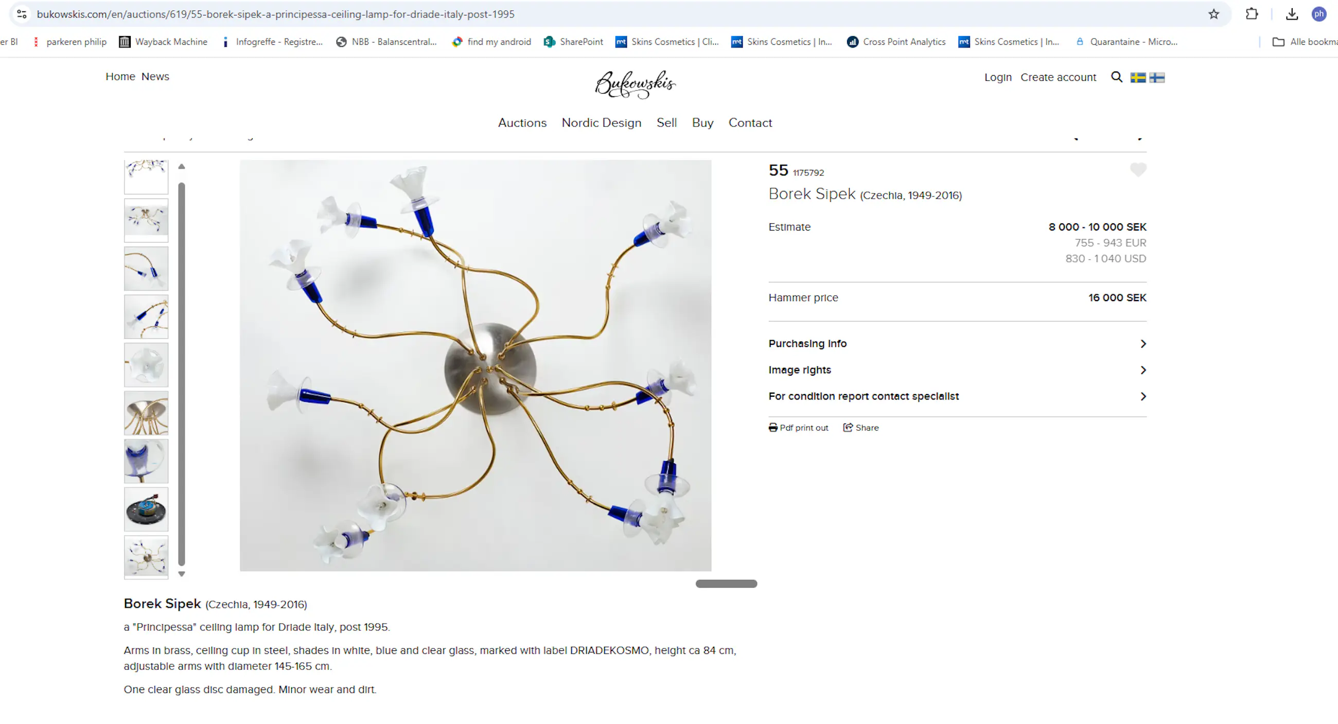 Alles werkt, lampen dimbaar, messing kan poestbeurt gebruiken. In Zweden afgehamerd op € 1.500, zie foto
