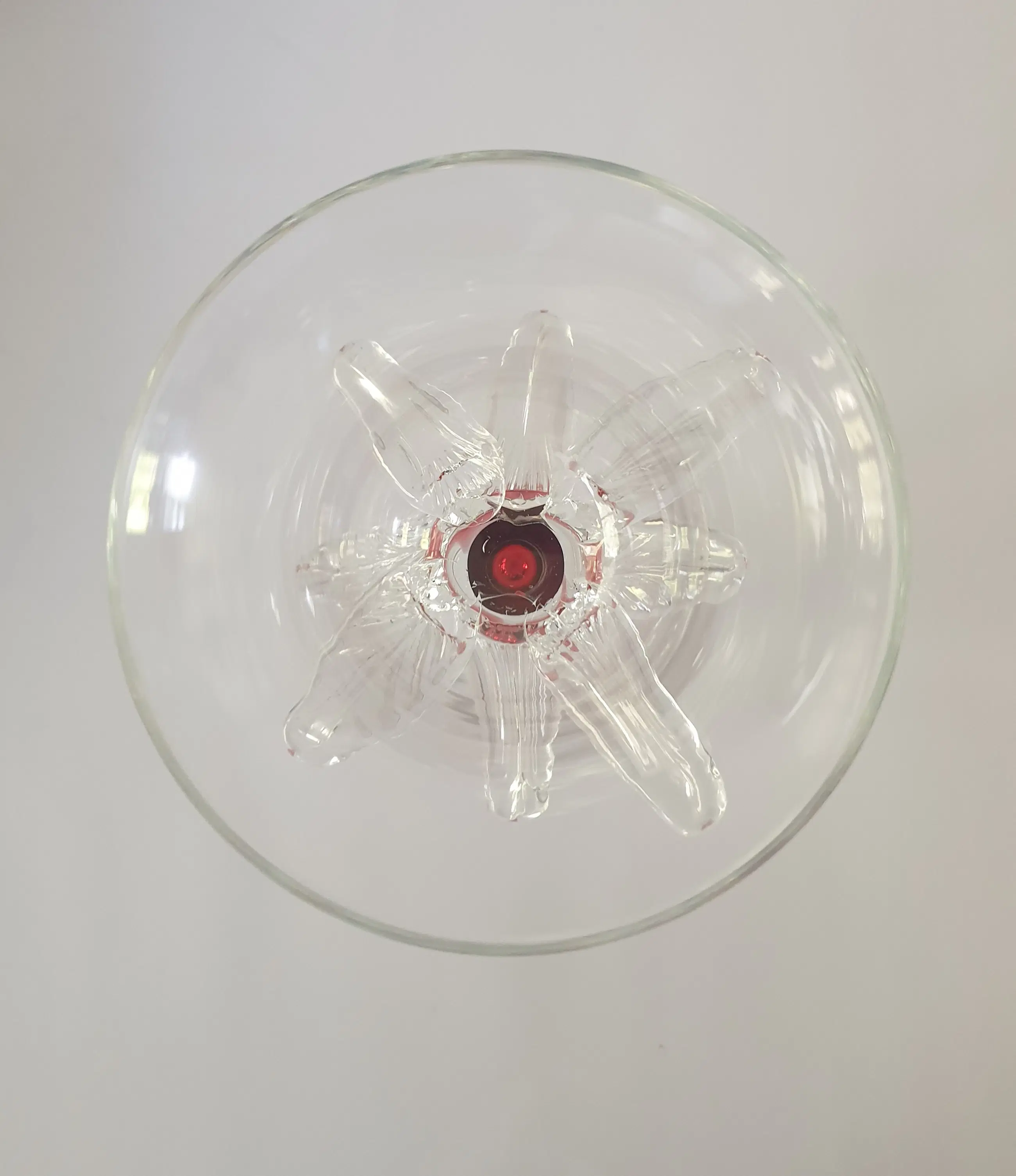 Helderglazen Coupe met roze steel en heldere bladeren van Bořek Šípek (1949 - 2016) uit 1990. Het werk is uitgevoerd door Ajeto/ Tsjechië.