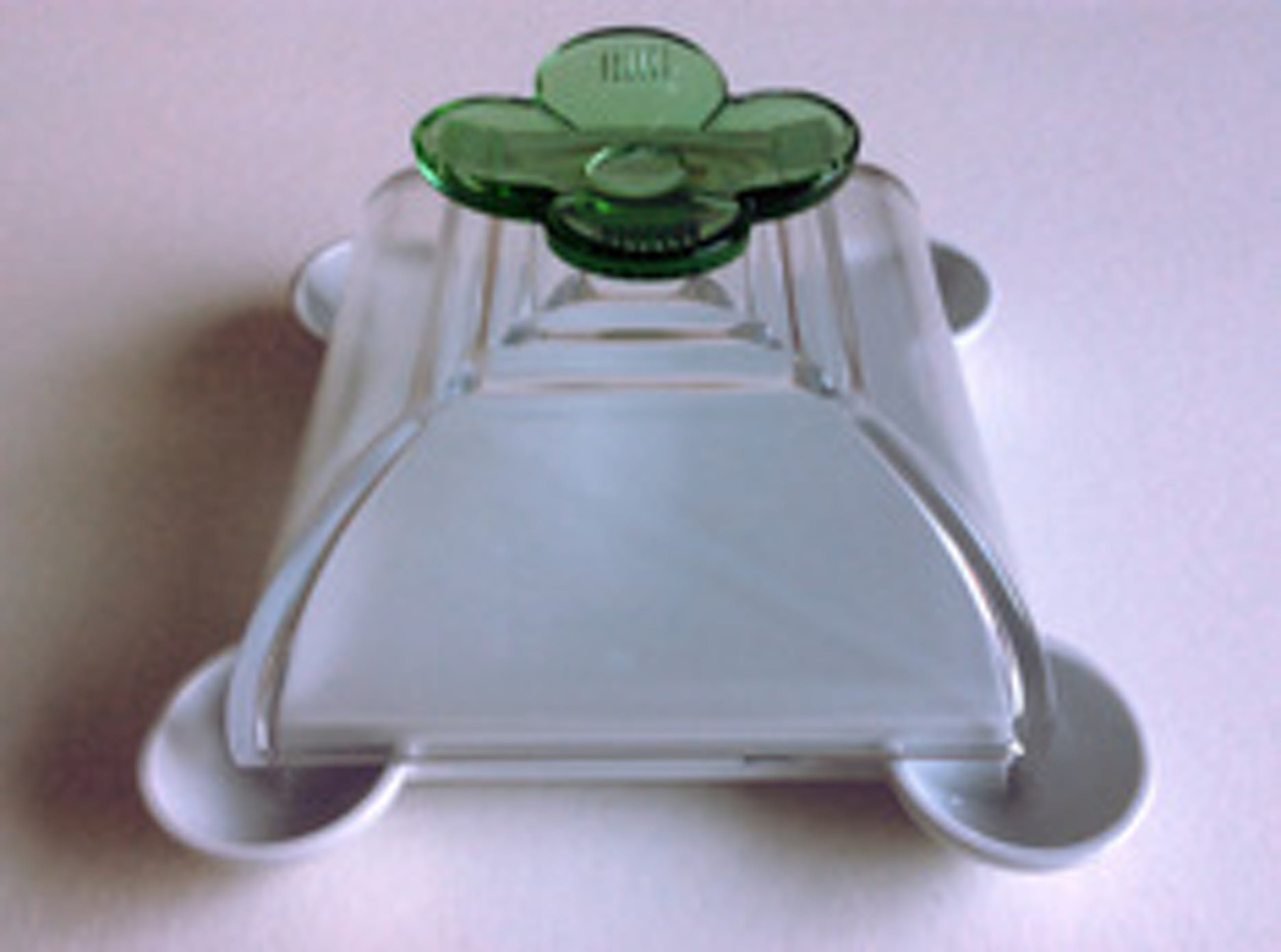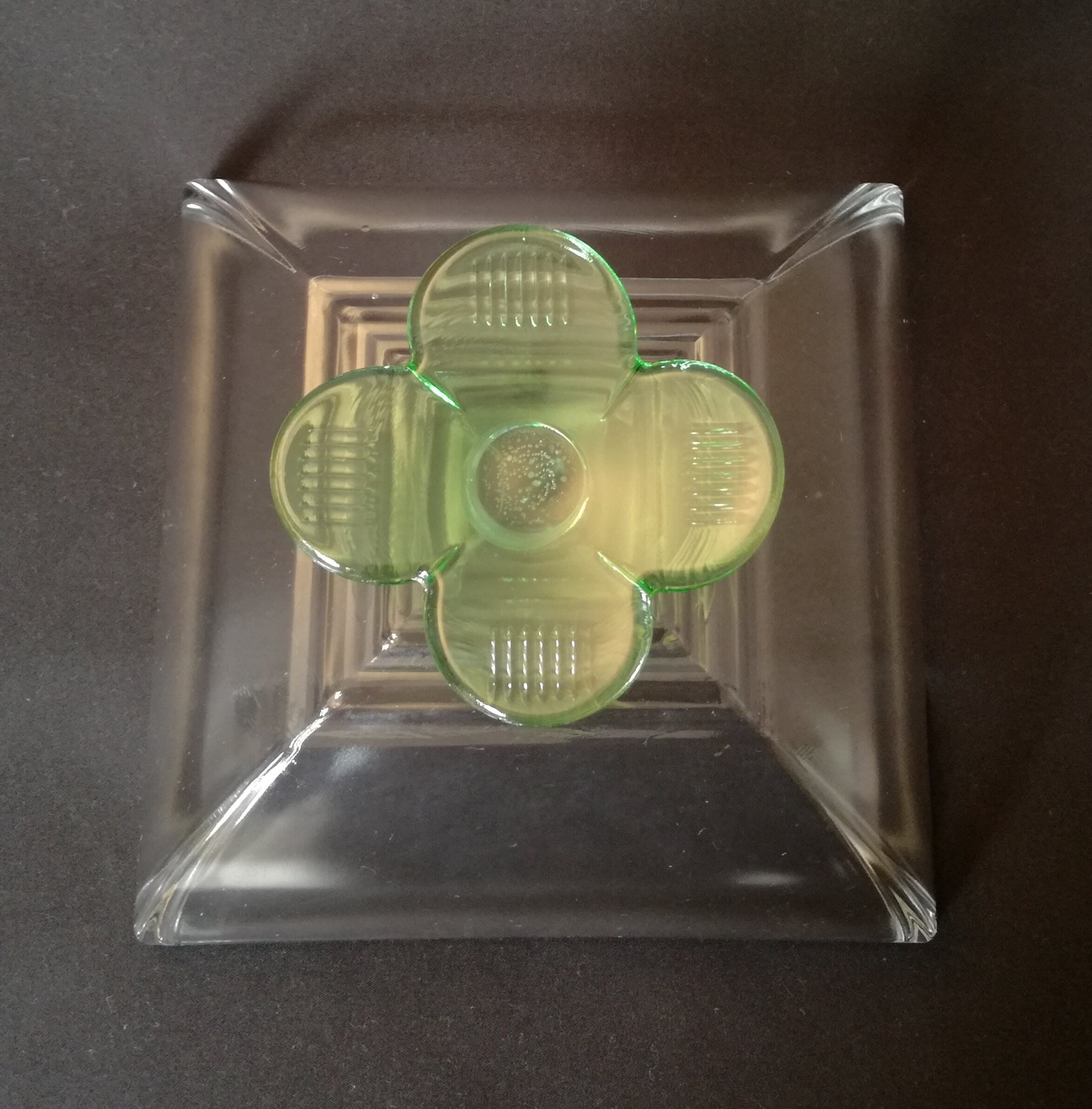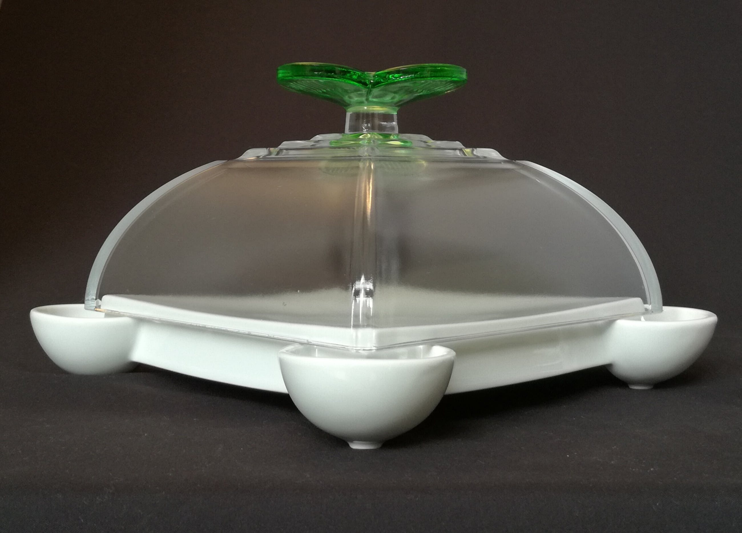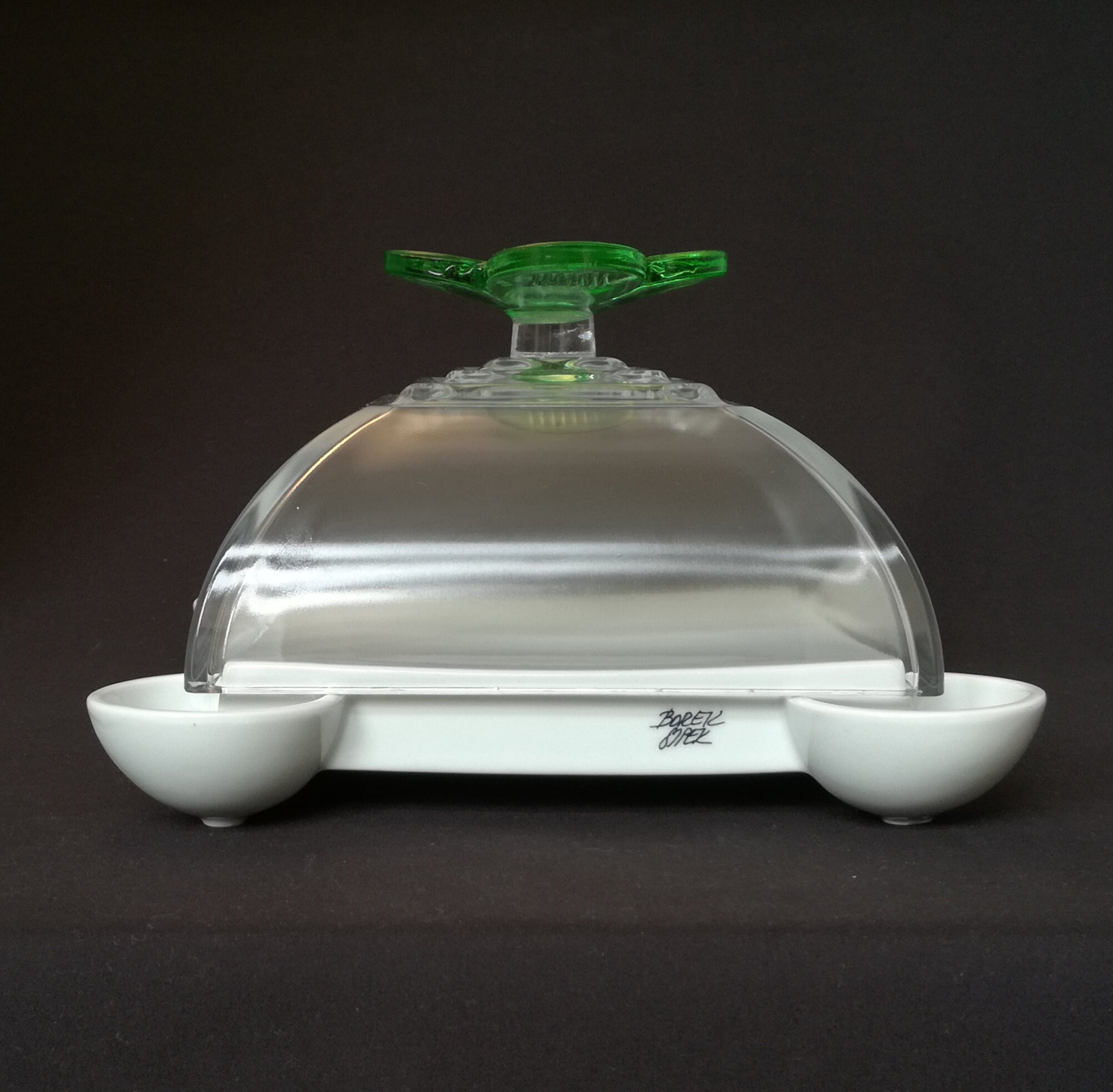 kaasstolp; aan de zijkant gesigneerd. De stolp is van glas, de bodem