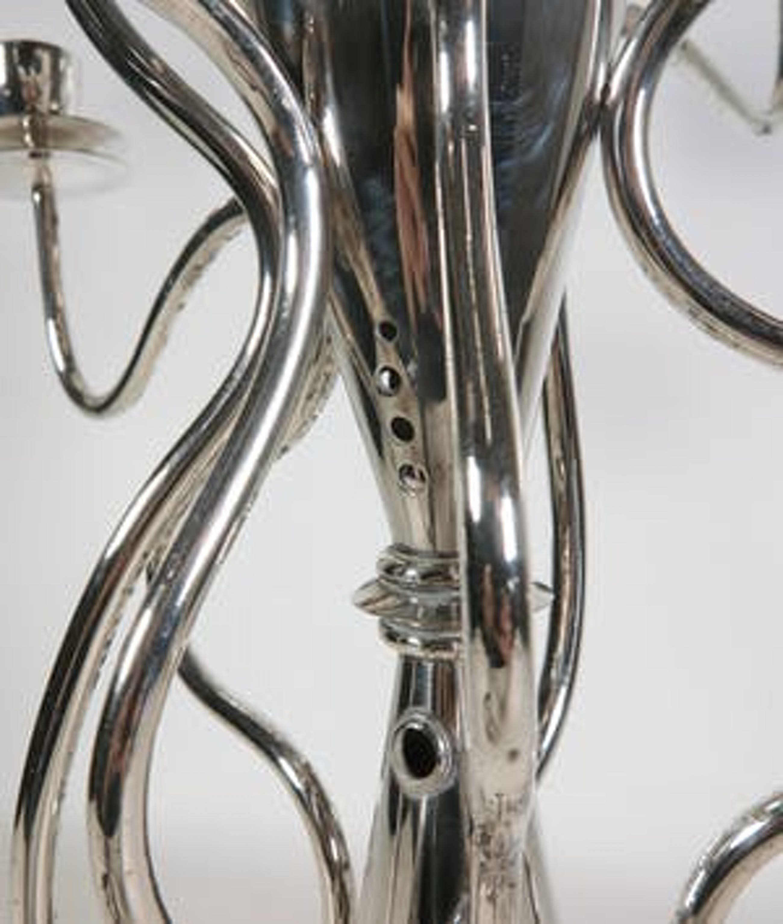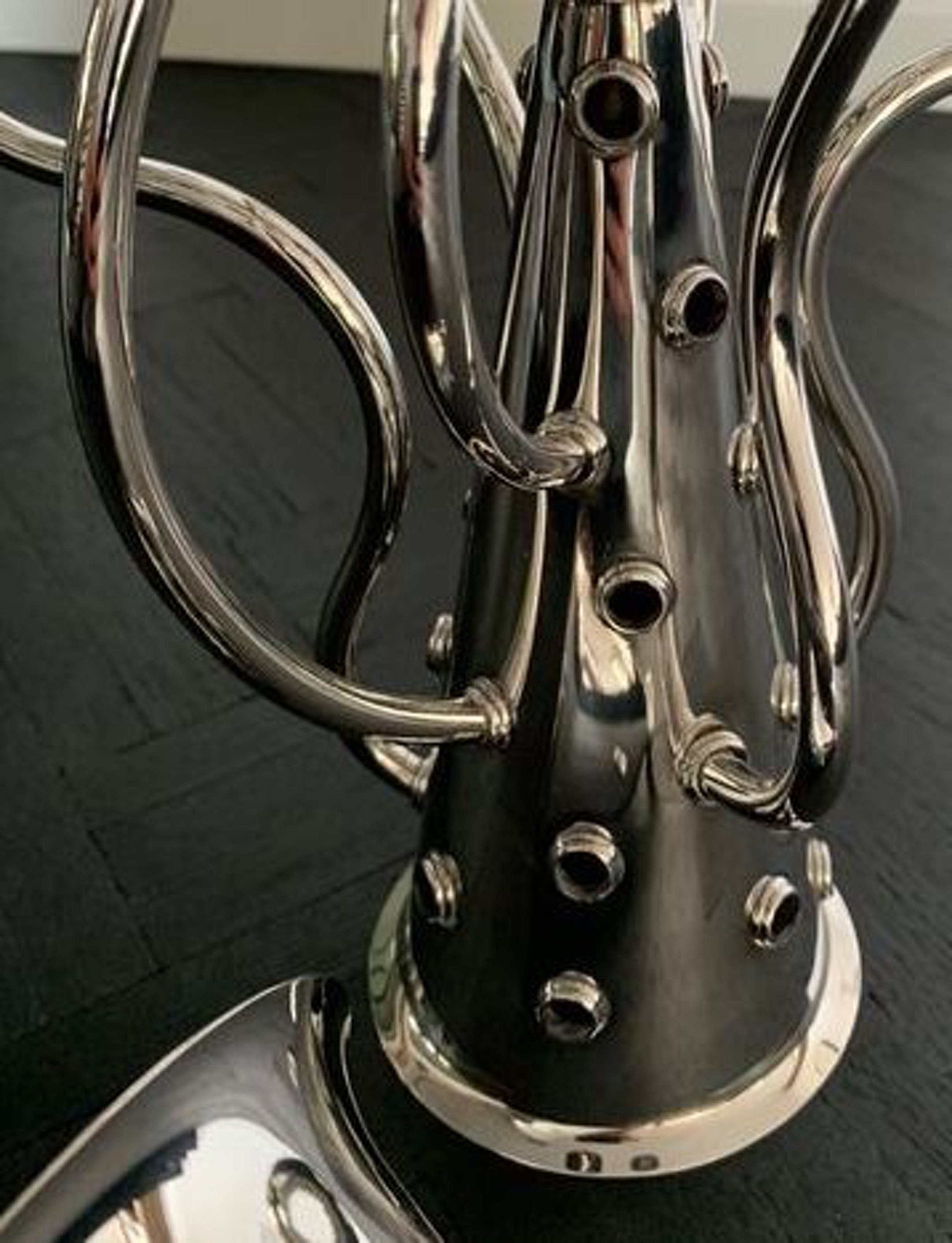 Deze kandelaar is ontworpen door Borek Sipek voor het Italiaanse designermerk Driade. De 7-armige kandelaar is gemaakt van verzilverd metaal. Borek Sipek heeft in het midden een uitneembare vaas ontworpen. De kandelaar is tevens gemerkt met de stempel Driade erin. Een echt fraai design item voor de liefhebber!