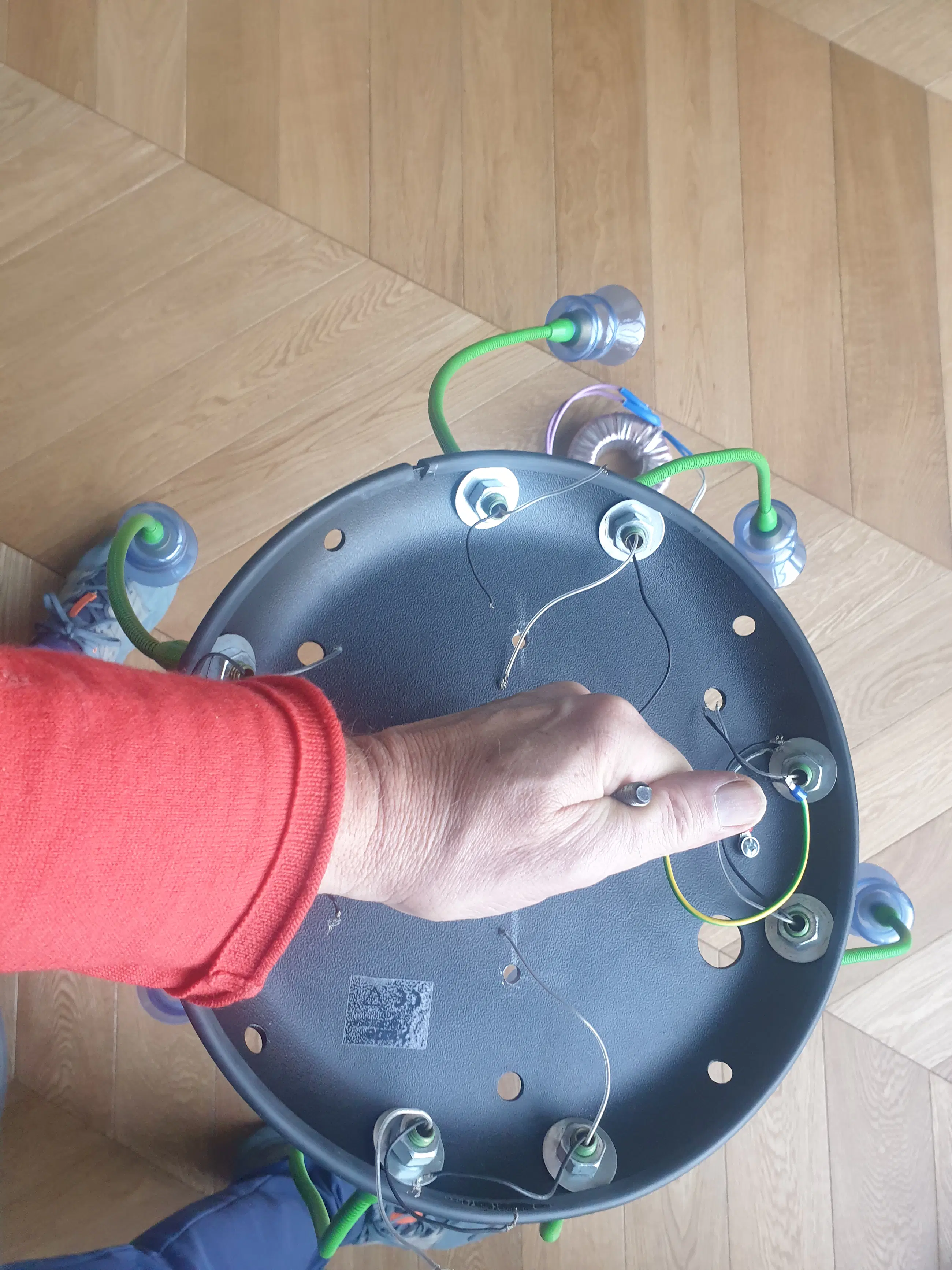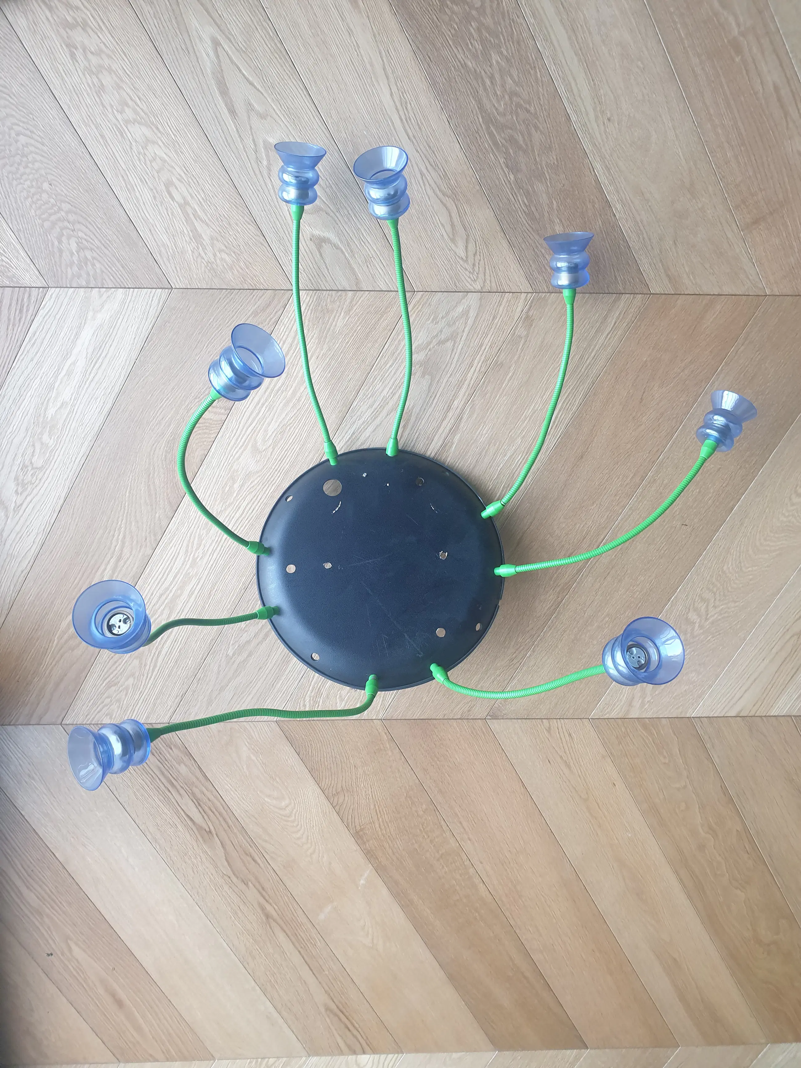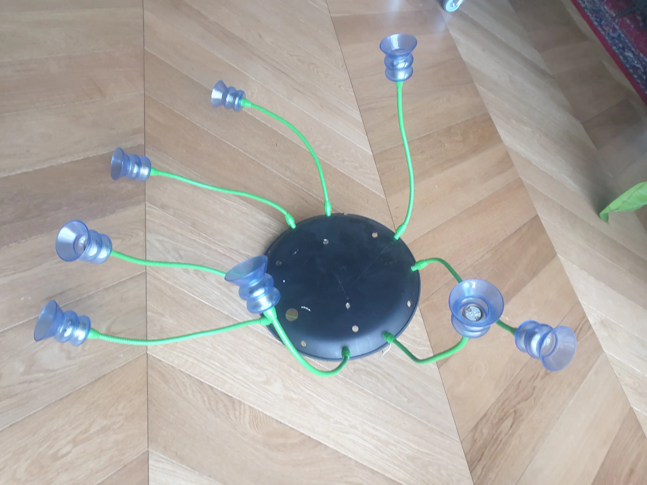 Metalen plafonniere met 8 felgroene buigzame armen met kristallen glaasjes. De lamp moet aangepast worden. Zo moet er een metalen schroefoog komen , een transformator (nu zit er een zeer zware koperen spoel bij.) en lampjes. Er is helaas 1 glaasje met een barst aan onderzijde. Afhalen