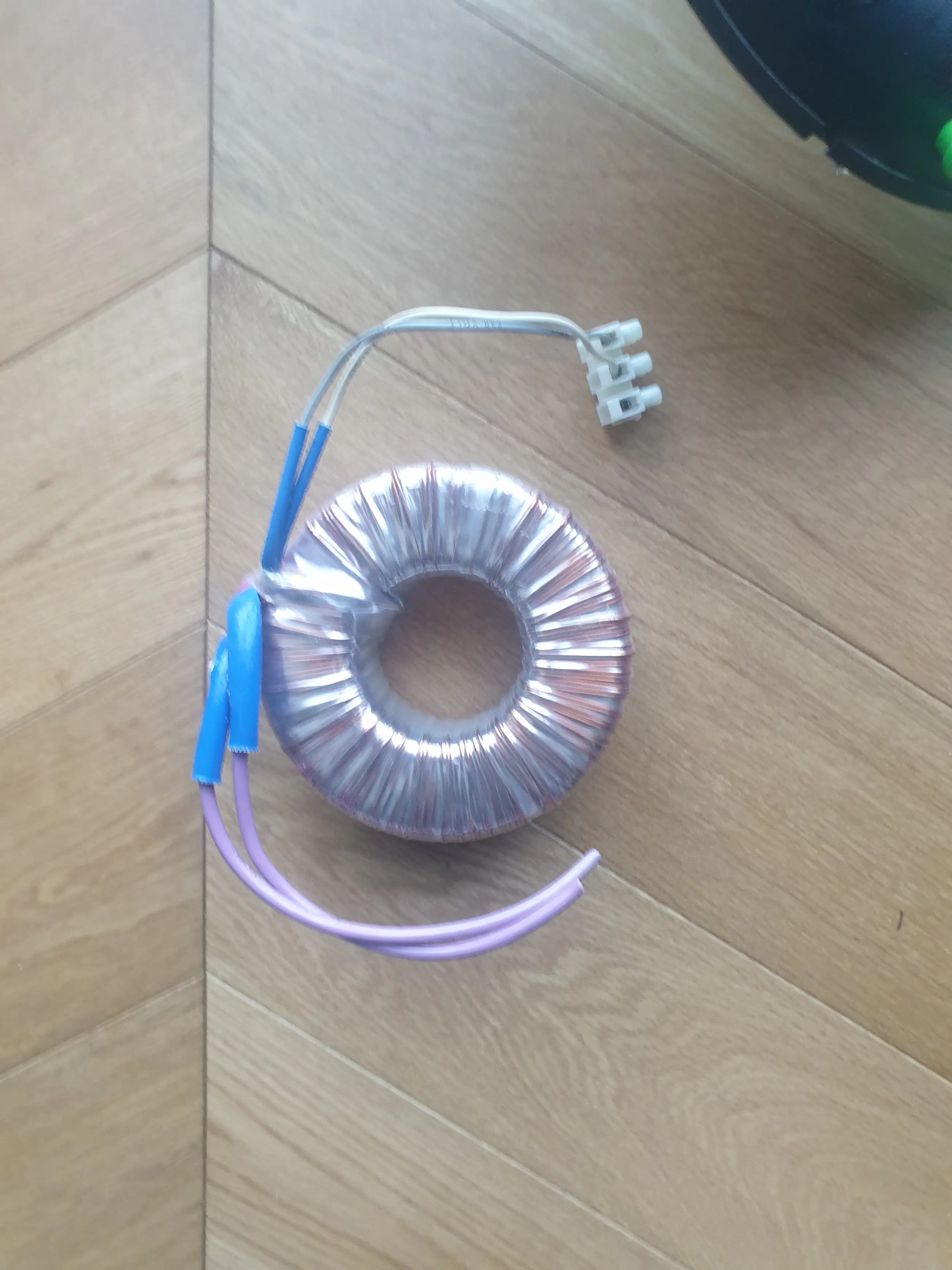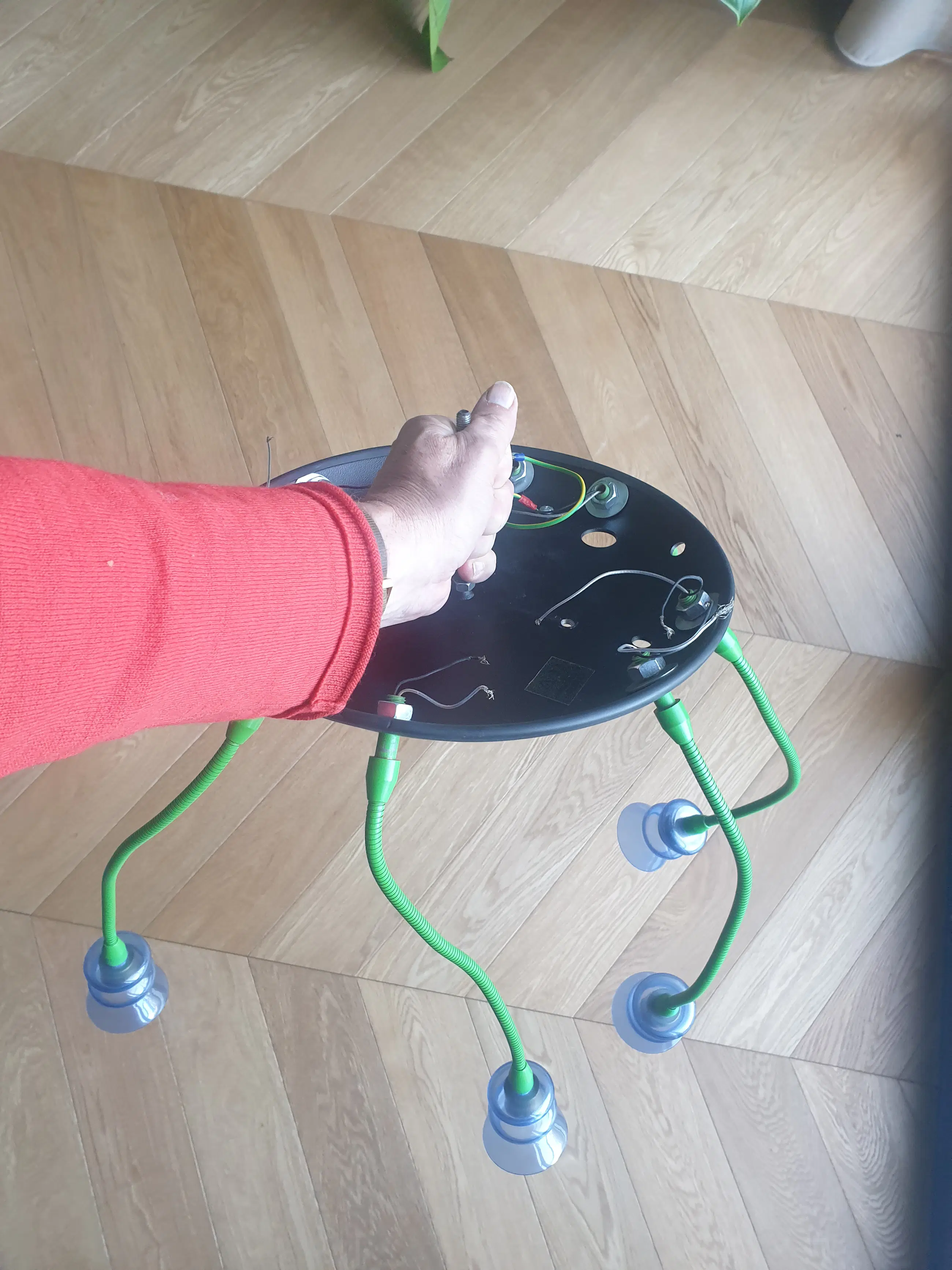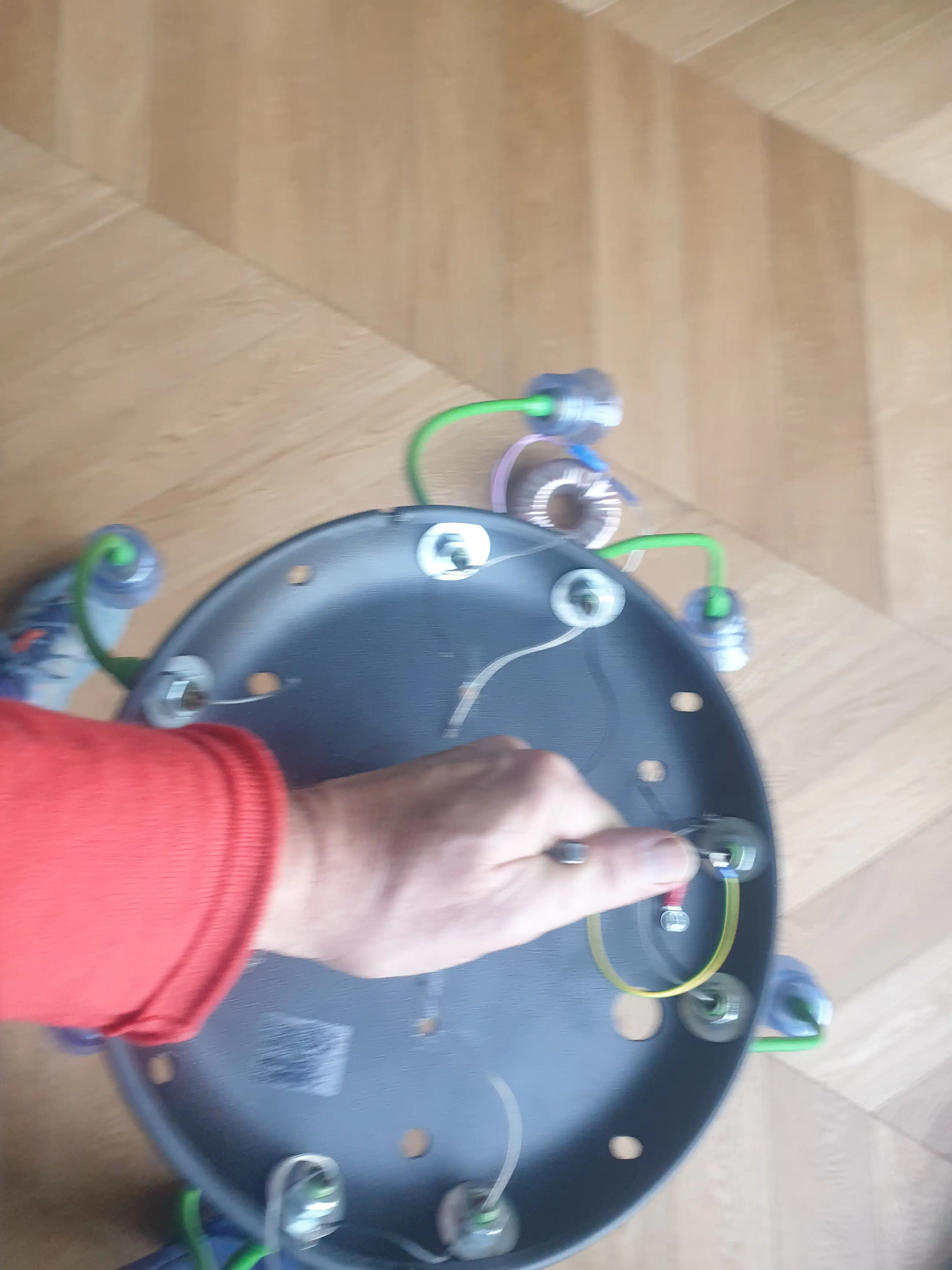 Metalen plafonniere met 8 felgroene buigzame armen met kristallen glaasjes. De lamp moet aangepast worden. Zo moet er een metalen schroefoog komen , een transformator (nu zit er een zeer zware koperen spoel bij.) en lampjes. Er is helaas 1 glaasje met een barst aan onderzijde. Afhalen