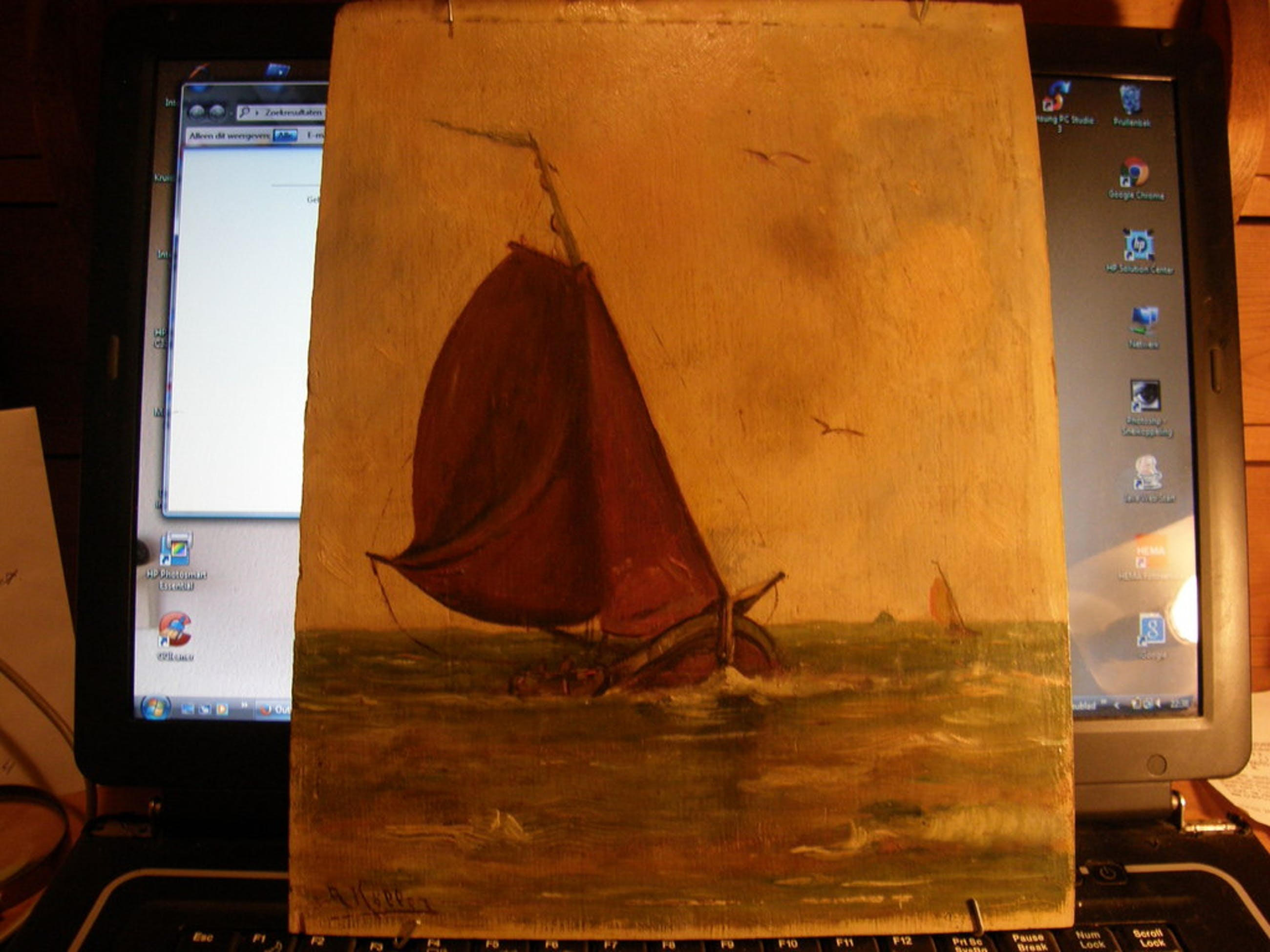 Olieverf op paneeltje en voorstellende botters op zee. gesigneerd. Afm 31 x 24 cm. Geen lijst.