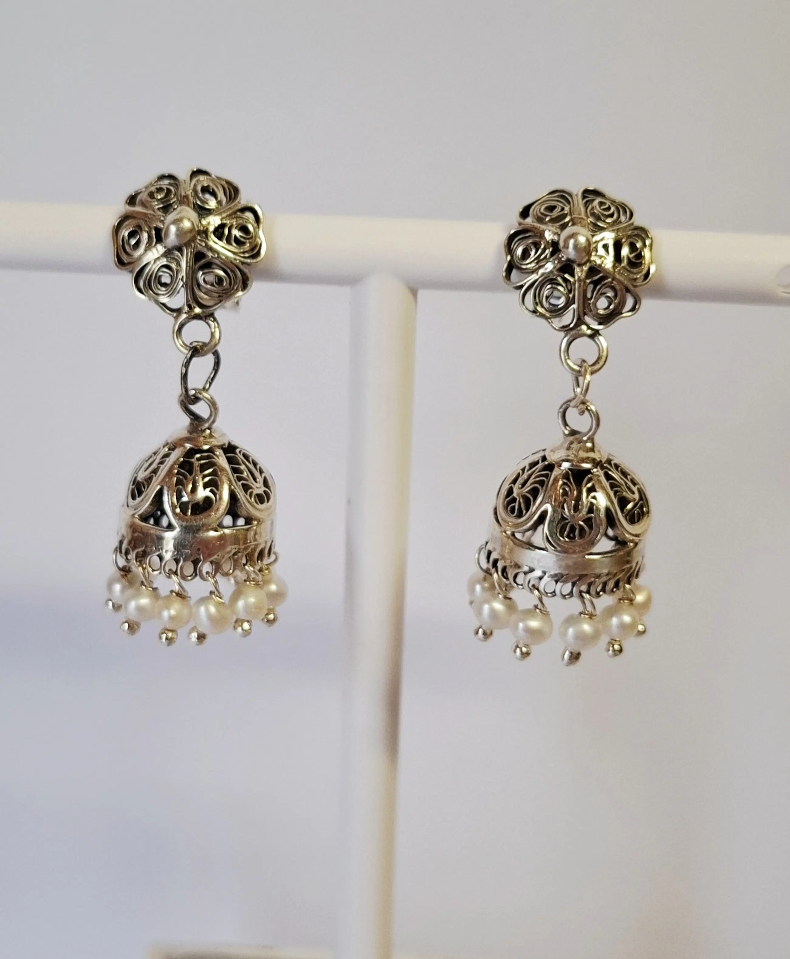 Kies voor een chique etnische stijl met deze prachtige Indiase zilveren oorbellen met parels . Dit traditionele ontwerp is typisch voor Rajasthani sieraden. Deze oorbellen zijn volledig met de hand vervaardigd door een van onze partnerambachtslieden uit deze regio.