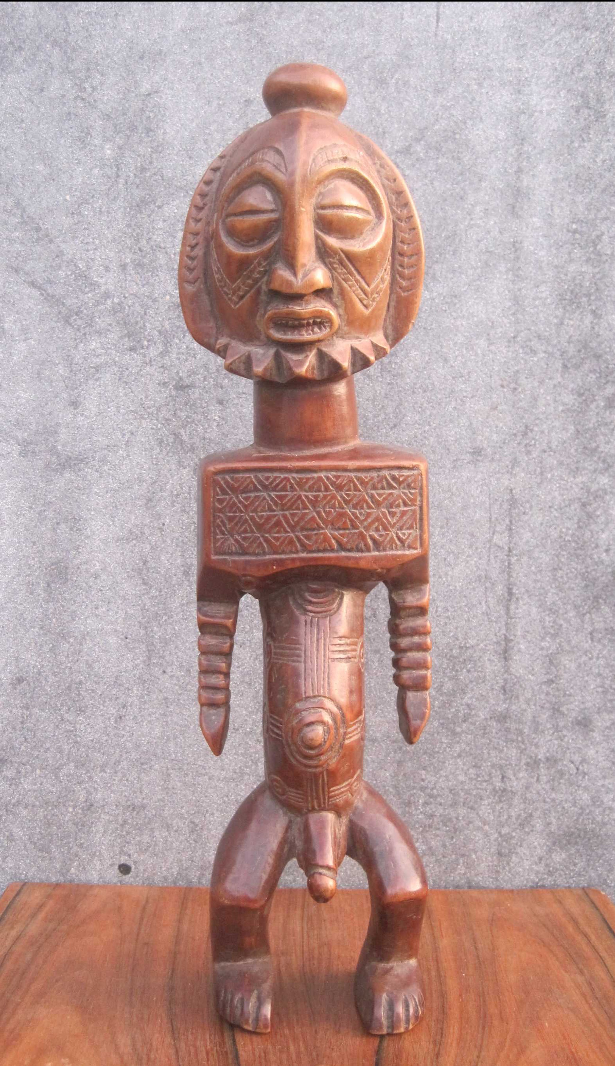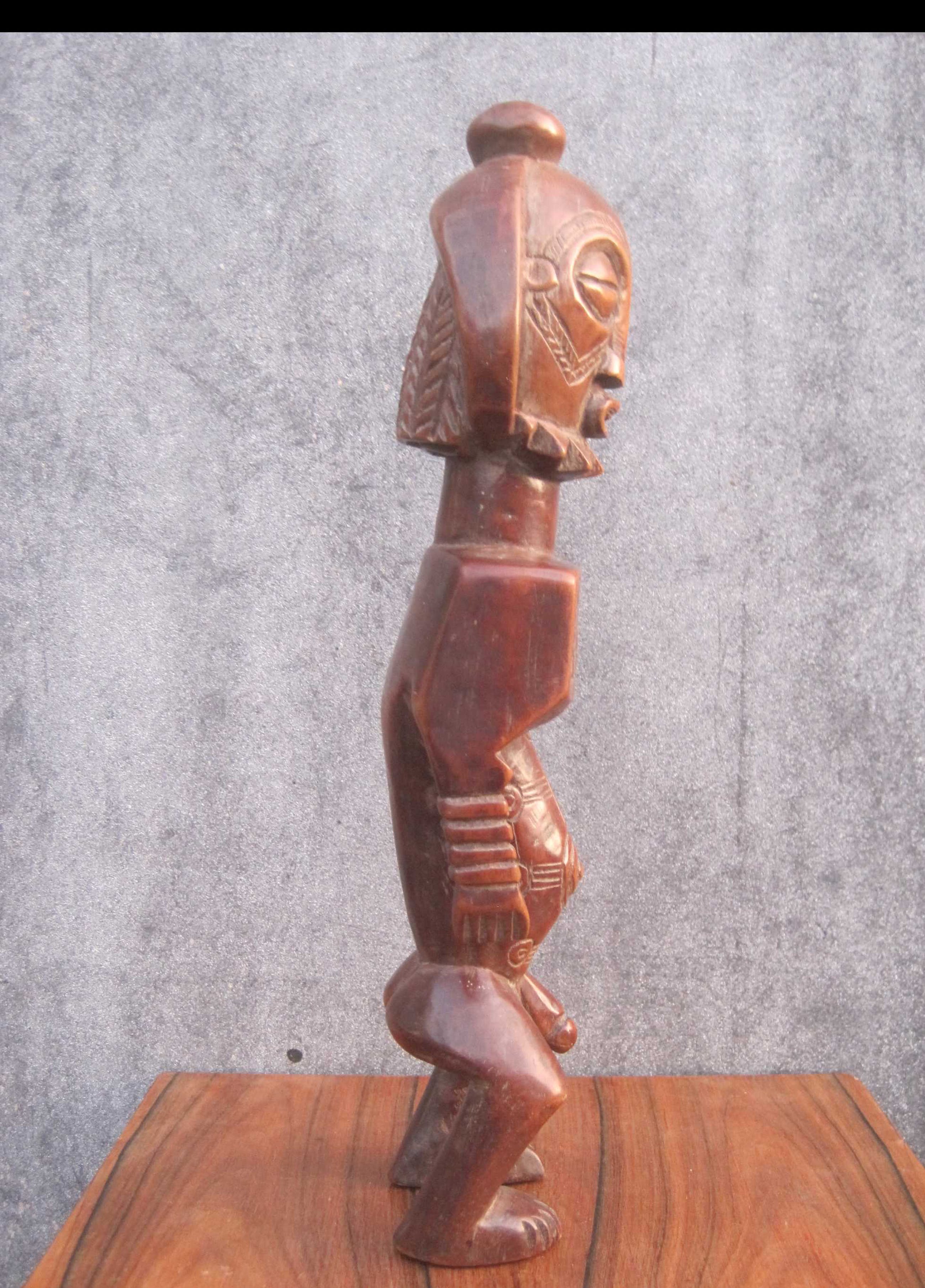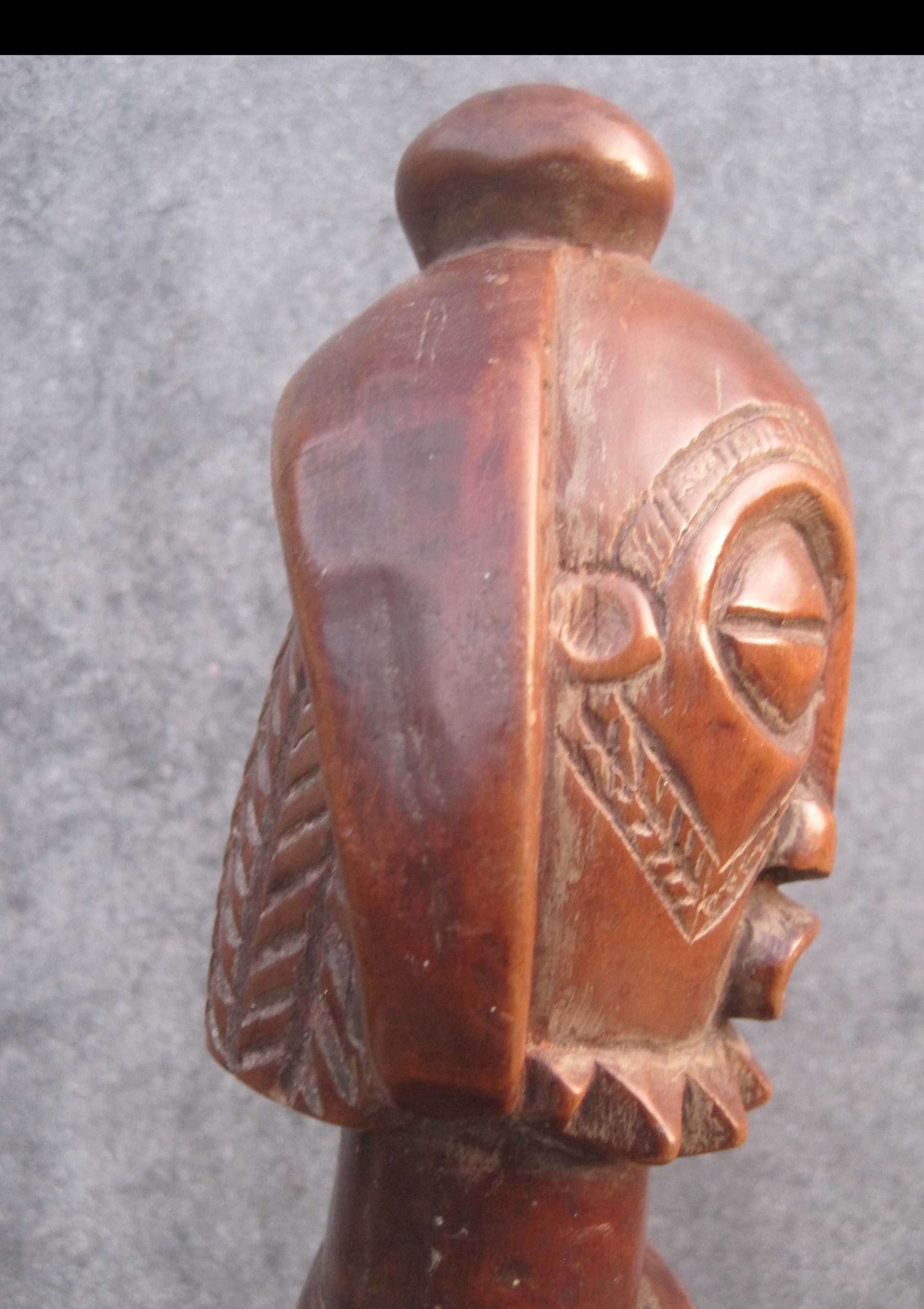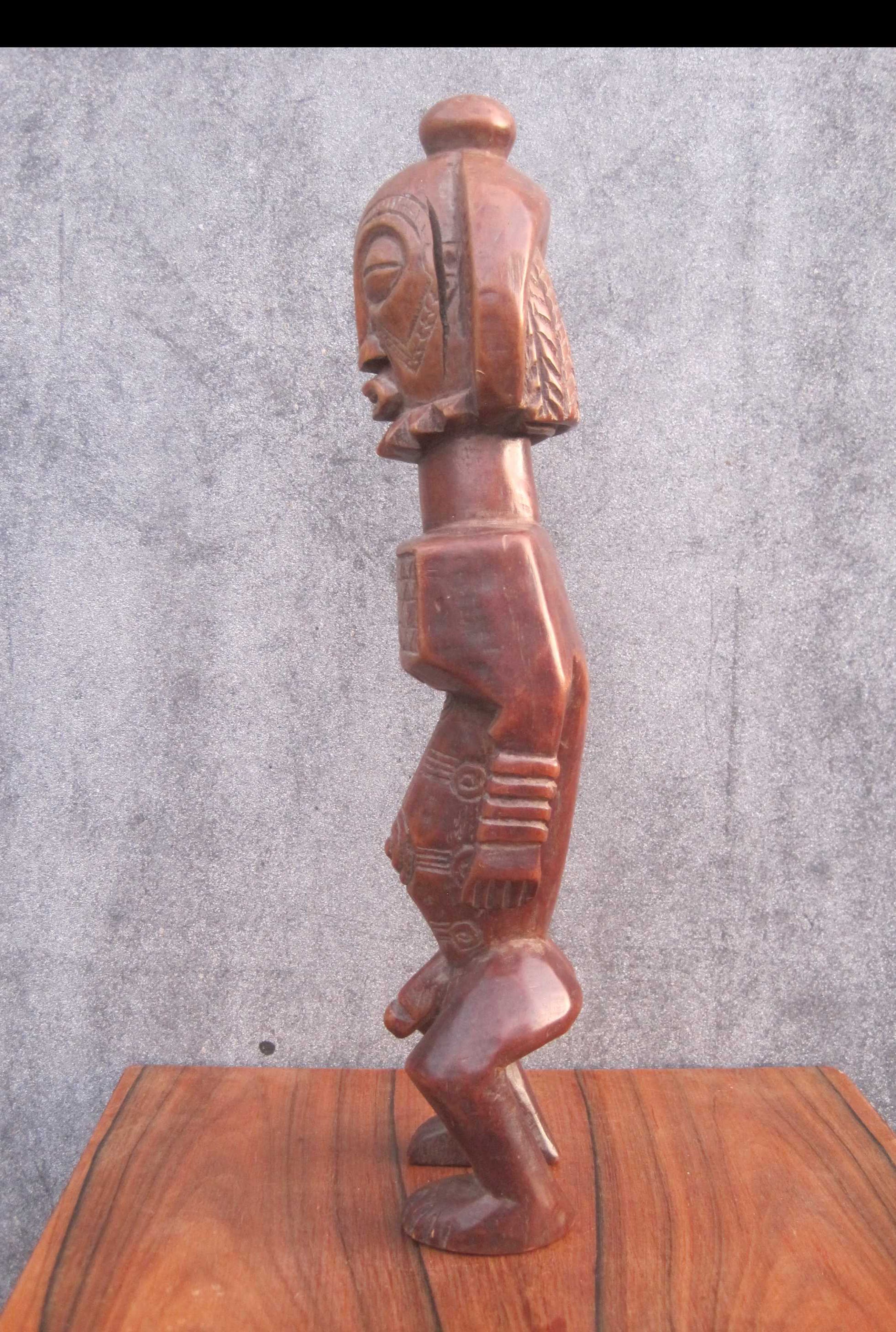 Dit mooie 36 cm lange beeld vertegenwoordigd een voorouderfiguur van het Boyo volk, dat leeft in het oostelijk deel van Kongo langs de oevers van het Tangayika meer.