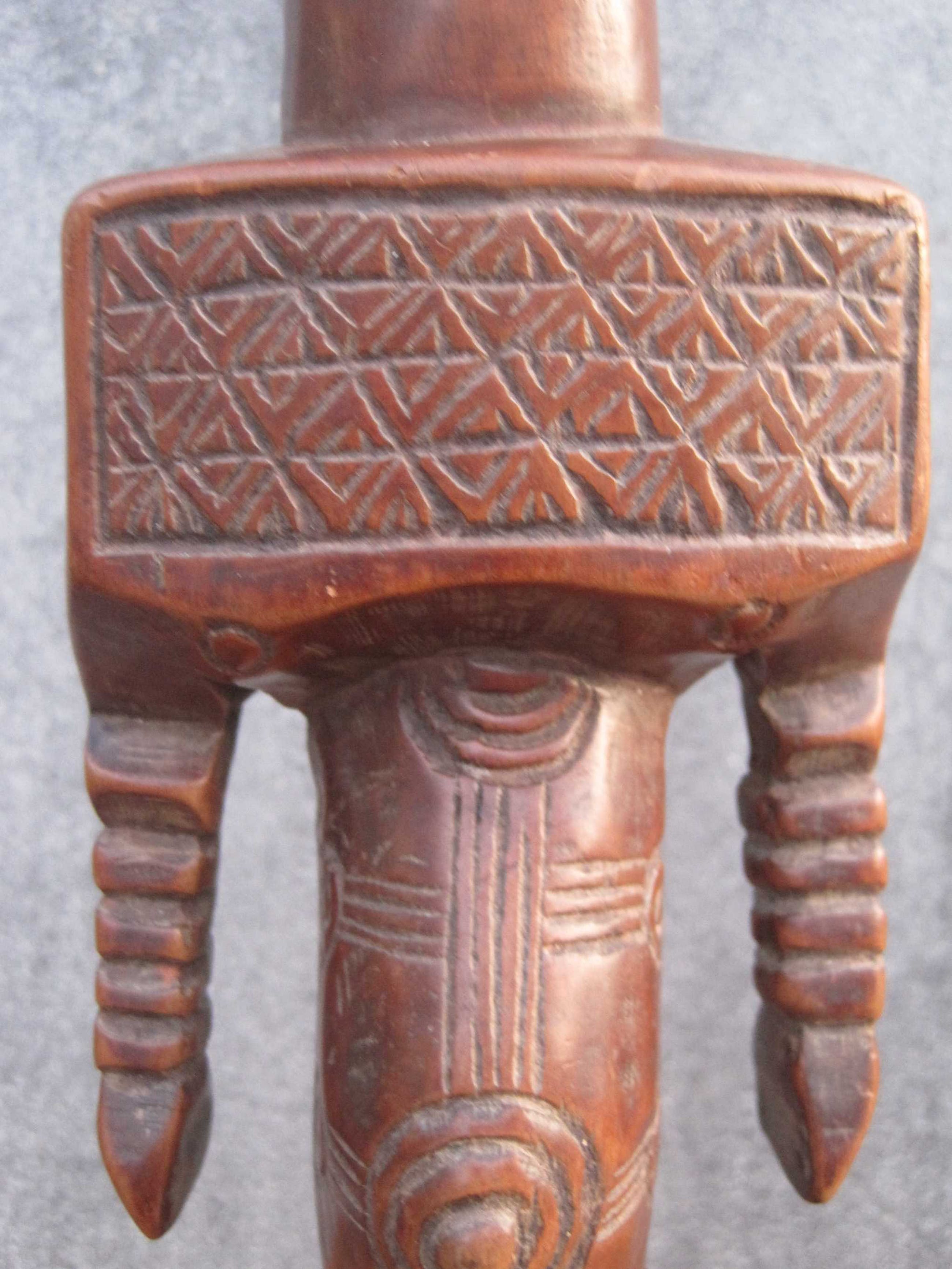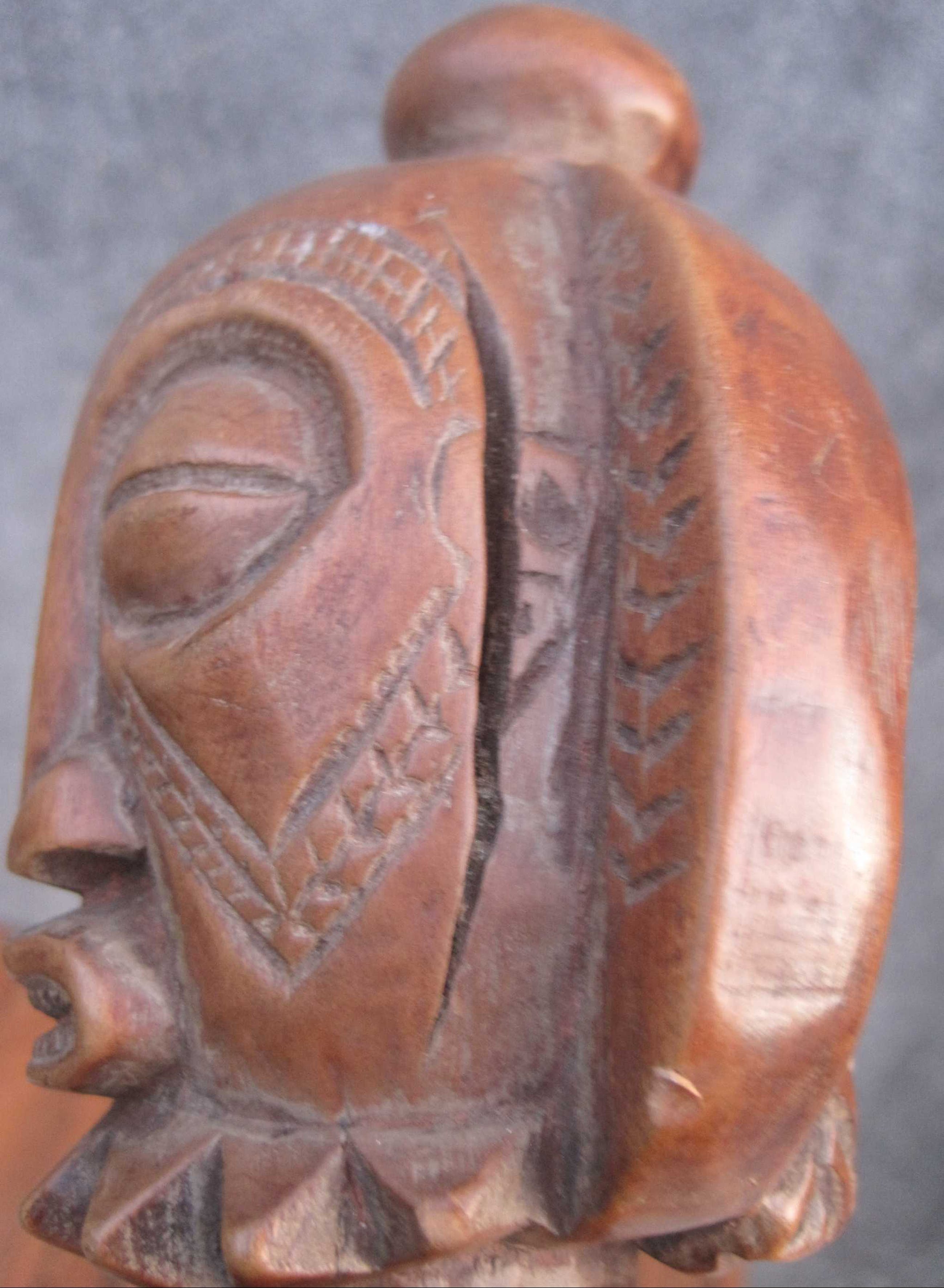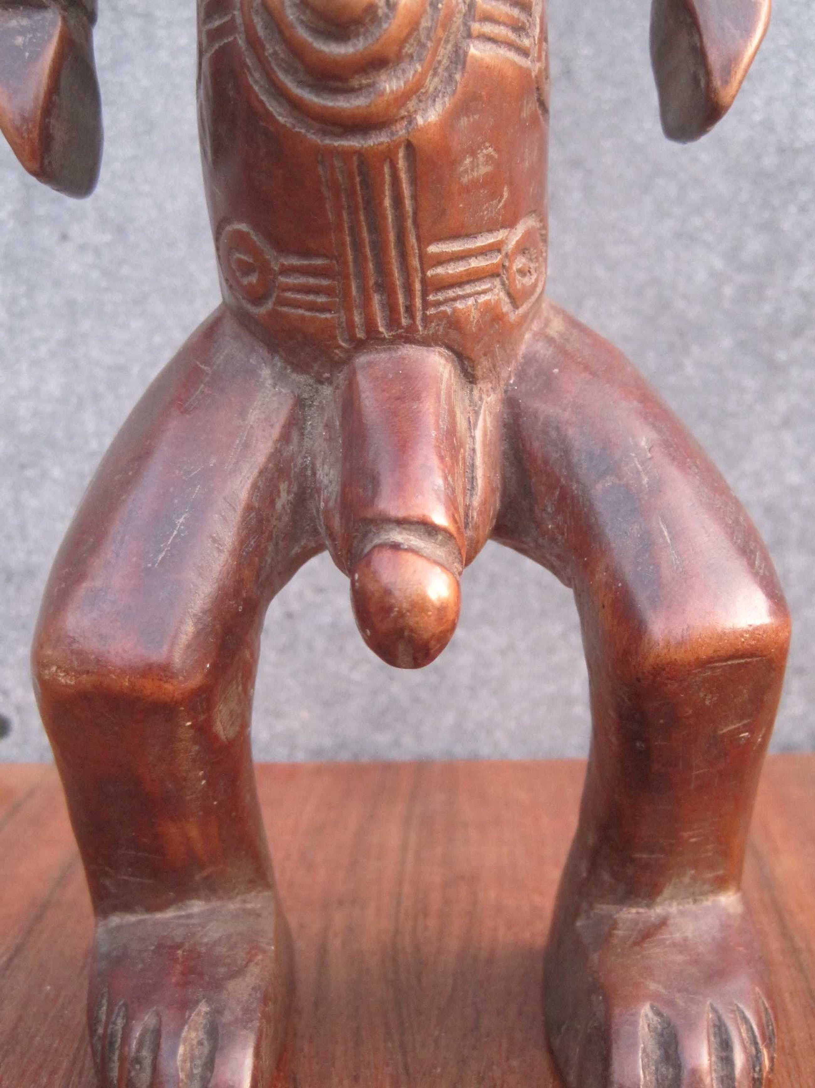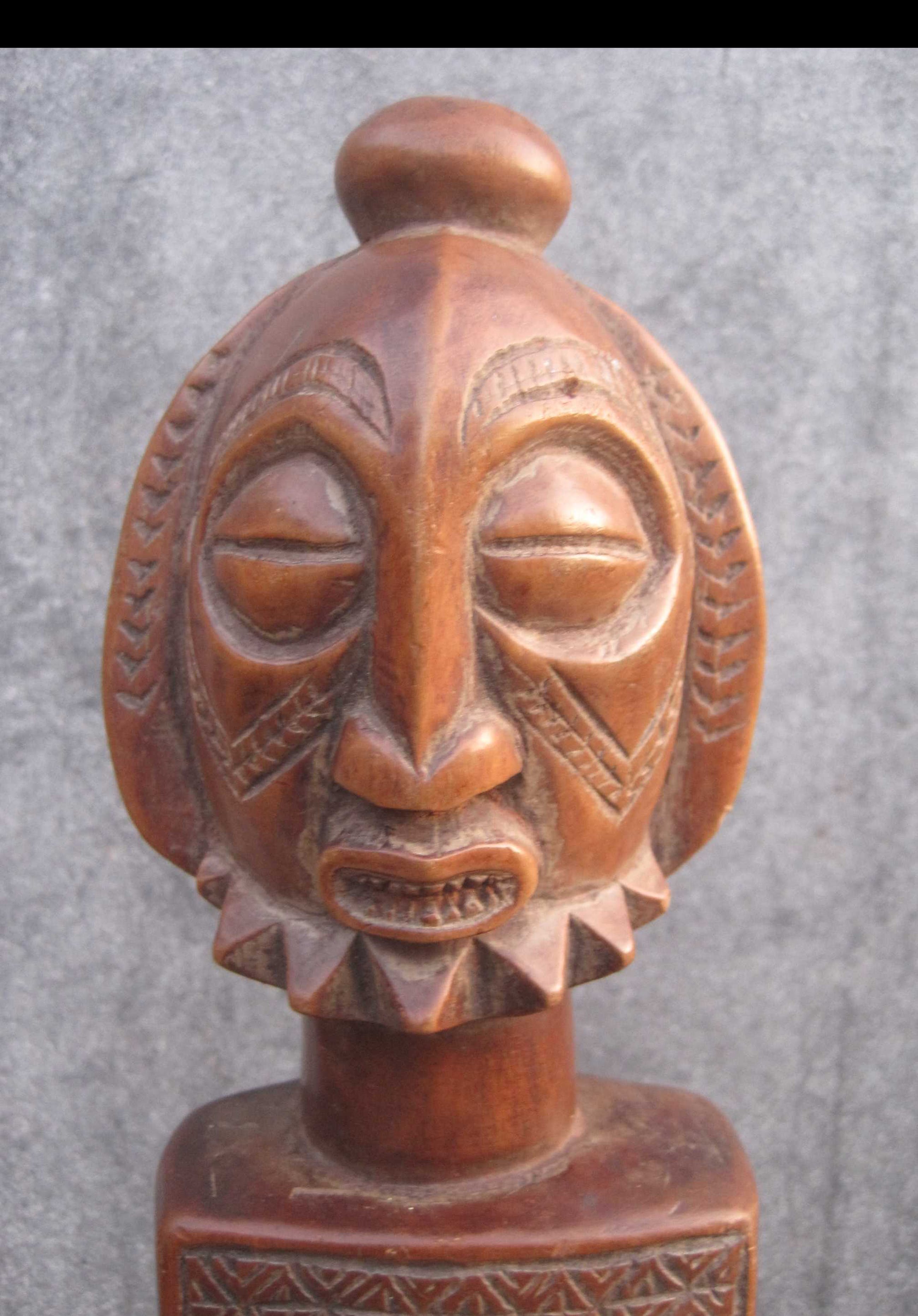 Dit mooie 36 cm lange beeld vertegenwoordigd een voorouderfiguur van het Boyo volk, dat leeft in het oostelijk deel van Kongo langs de oevers van het Tangayika meer.