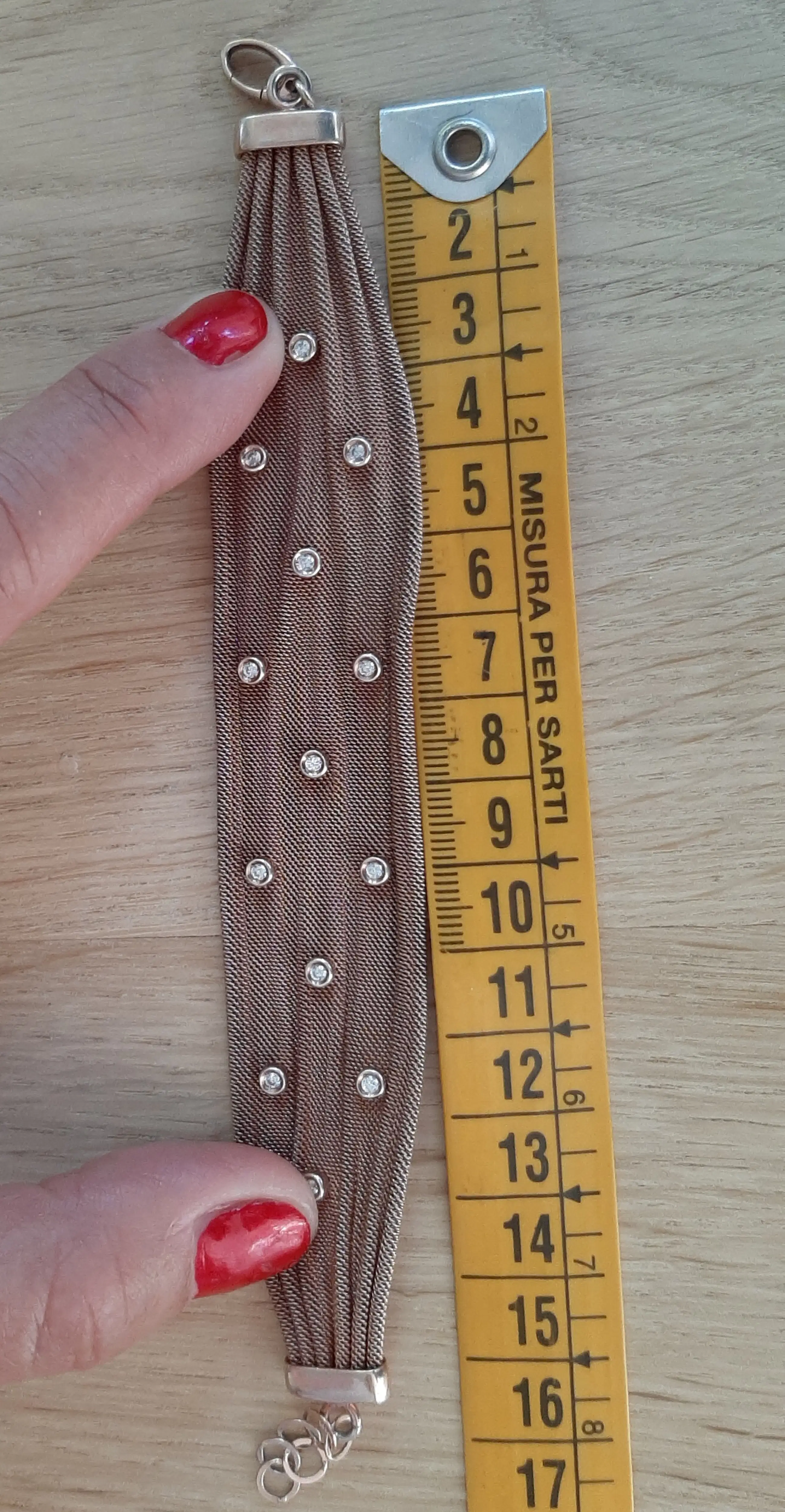 armband, op 'geweven schakeltjes’ bandje met 13 zirkonia steentjes in zetting