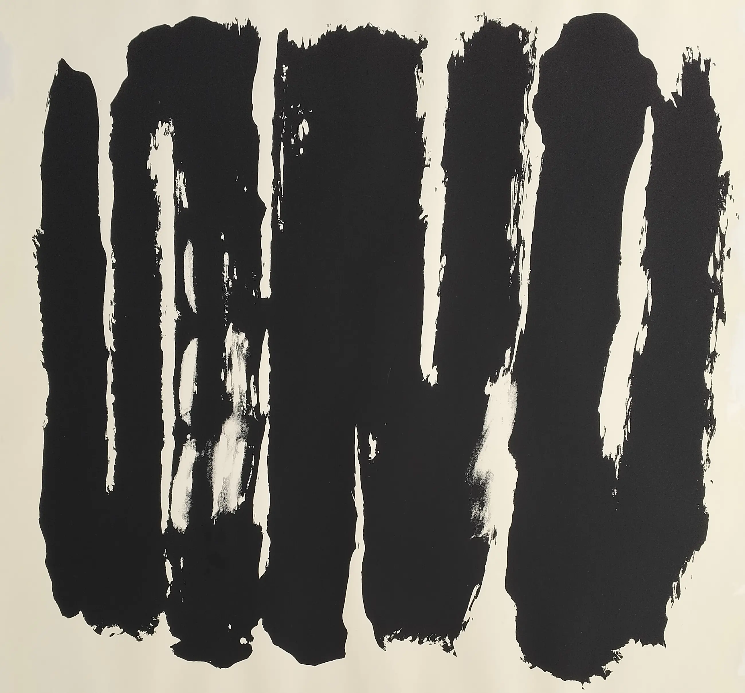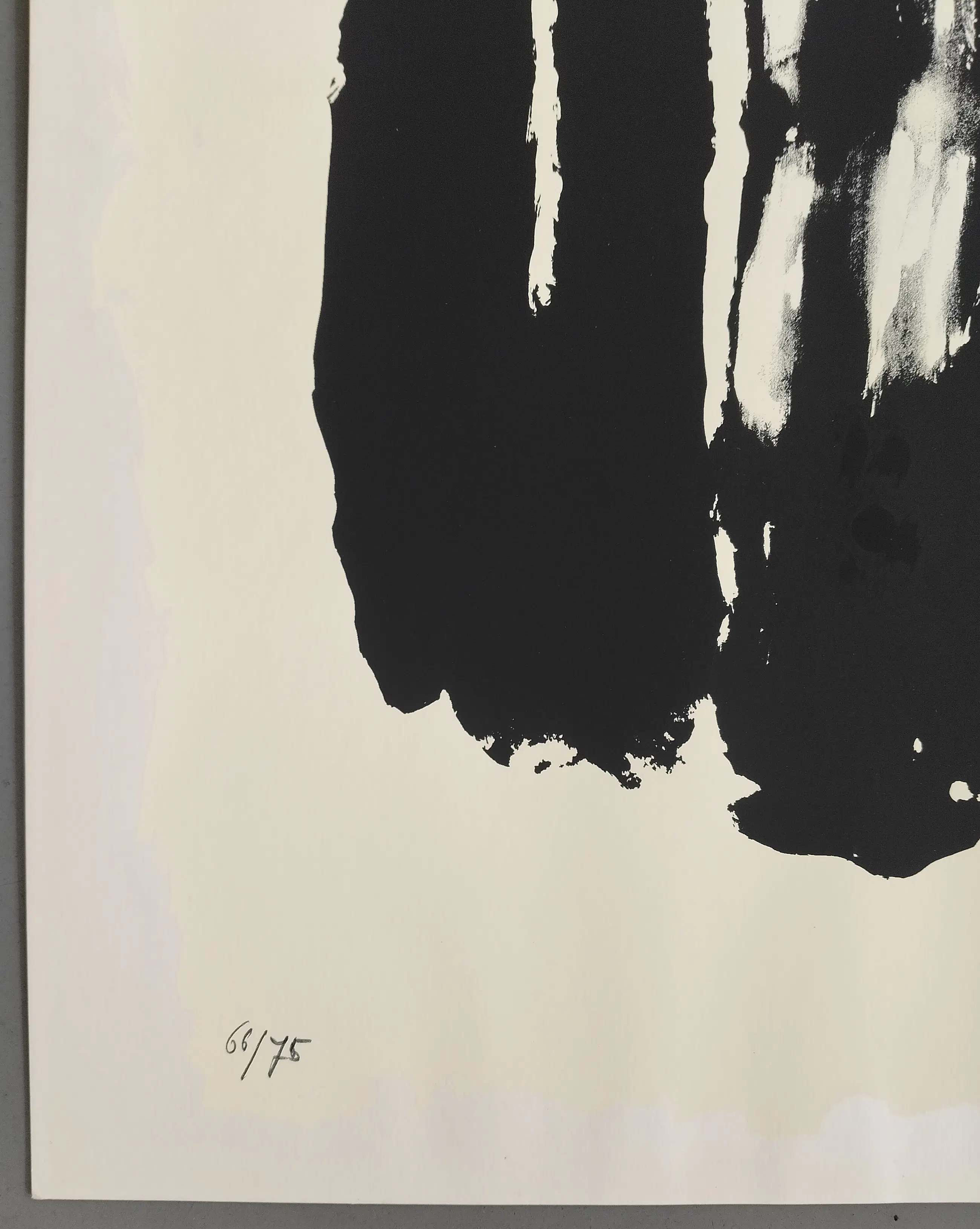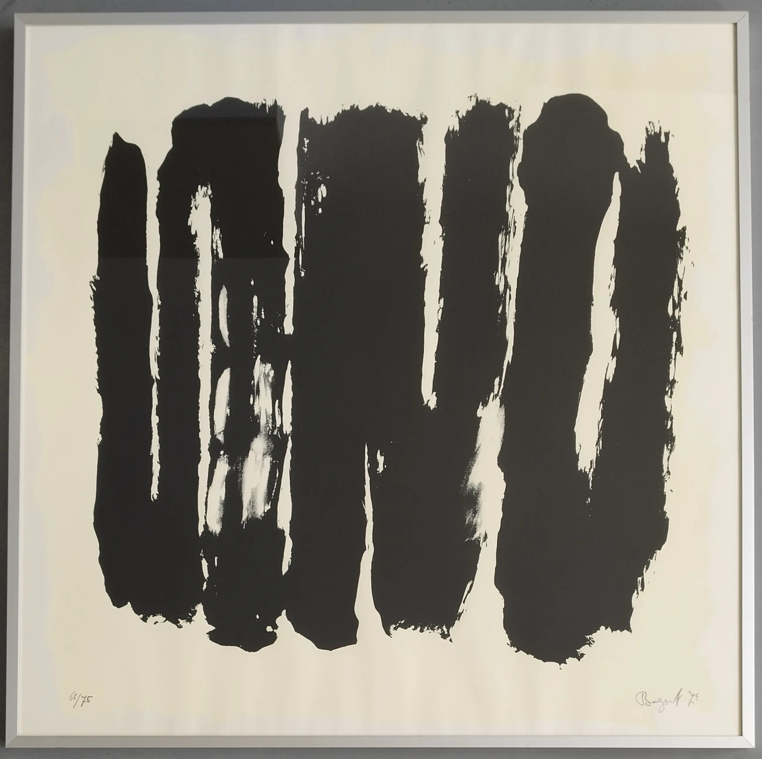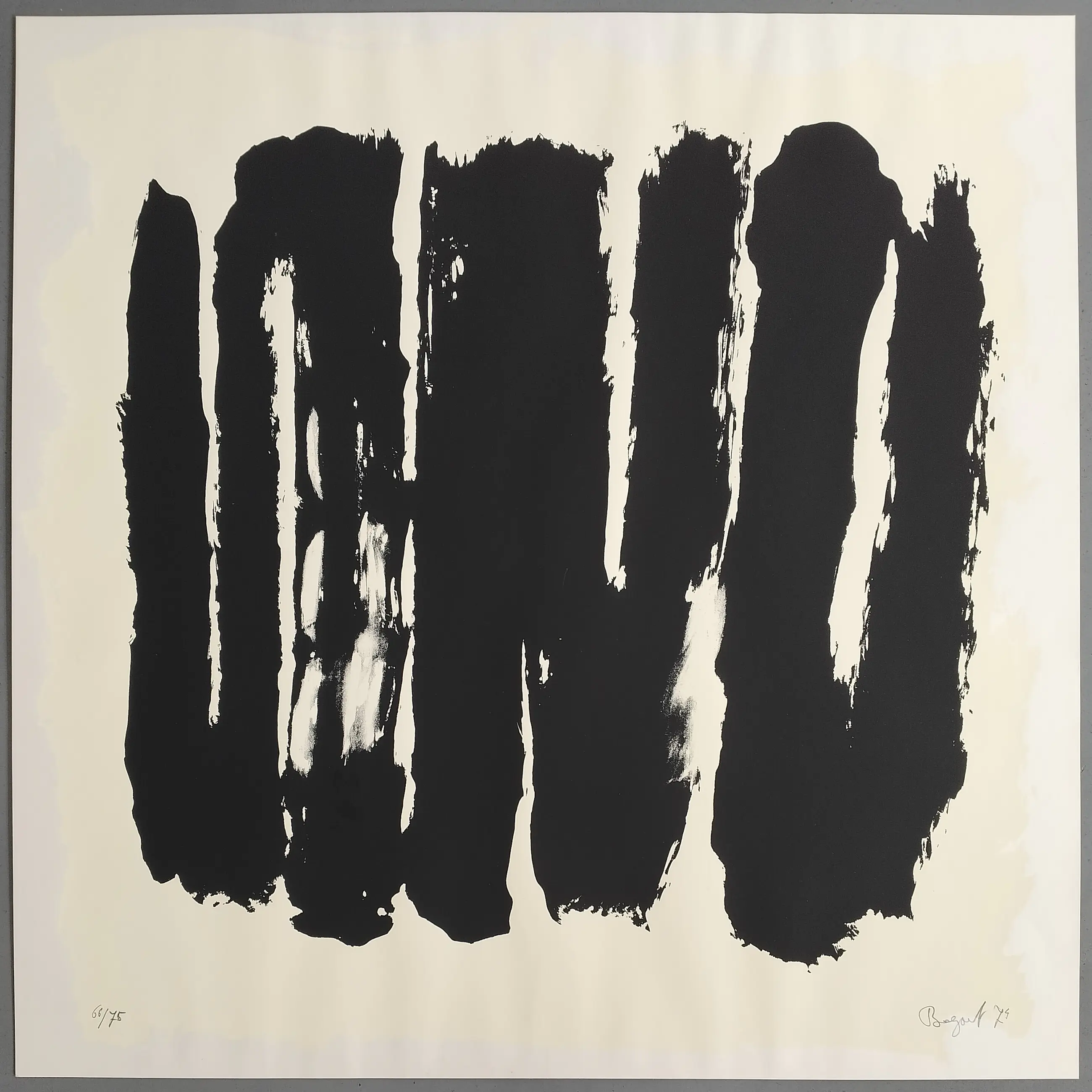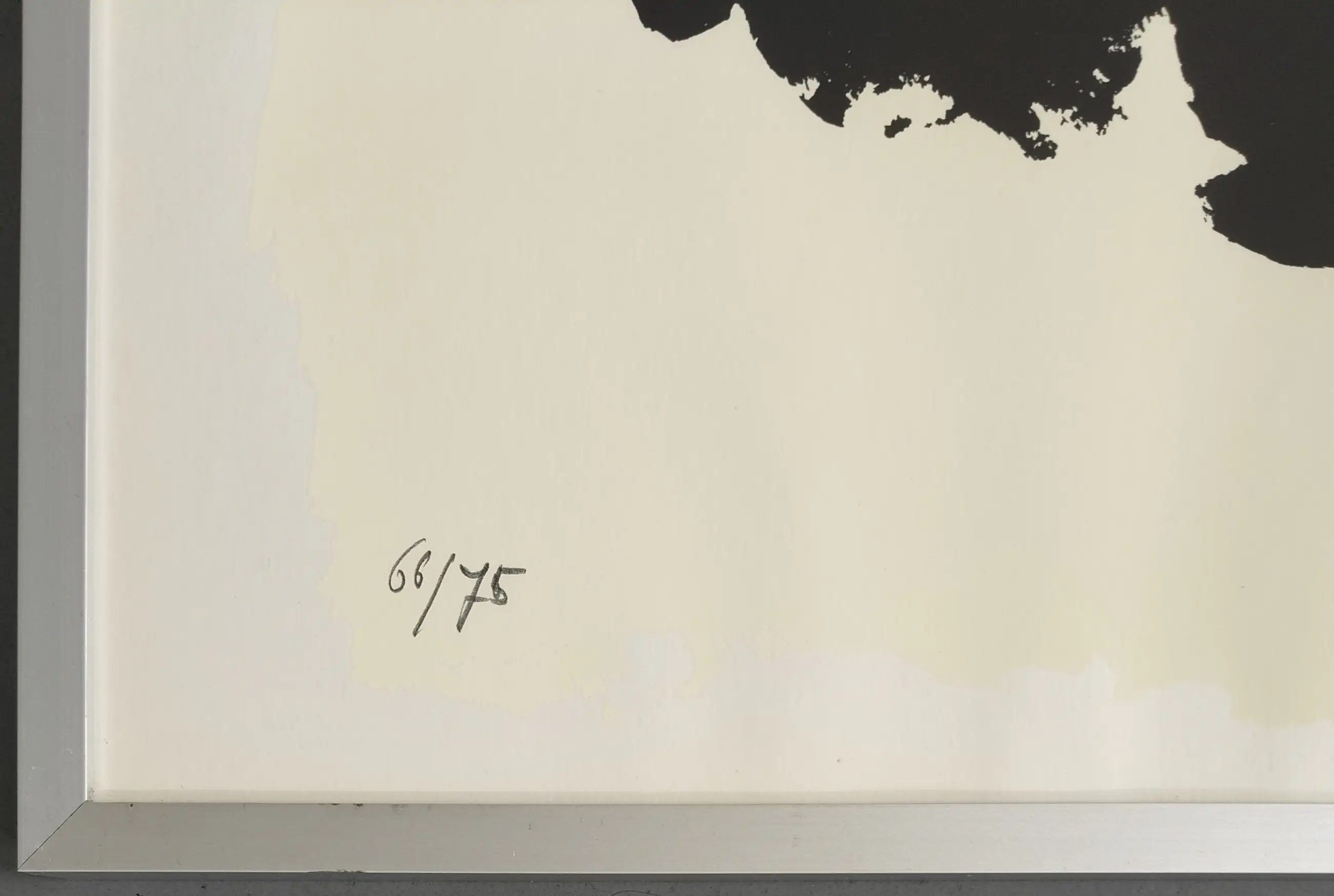 Gesigneerde zeefdruk van de kunstenaar Bram Bogart uit 1978, gedrukt in een oplage van 75 stuks. Rechtsonder is het werk gesigneerd in potlood, gedateerd 74 en linksonder genummerd met 66/75. Papiermaat 70 x 70 cm. Afmeting aluminium wissellijst (met wat krasjes) 71.5 x 71.5 cm. (hxb) Aan de rand van de onderzijde van het papier zitten een paar kleine lichte vlekjes. Het papier is licht golvend. (niet zichtbaar/storend in lijst). Verder is de zeefdruk is in prima staat.