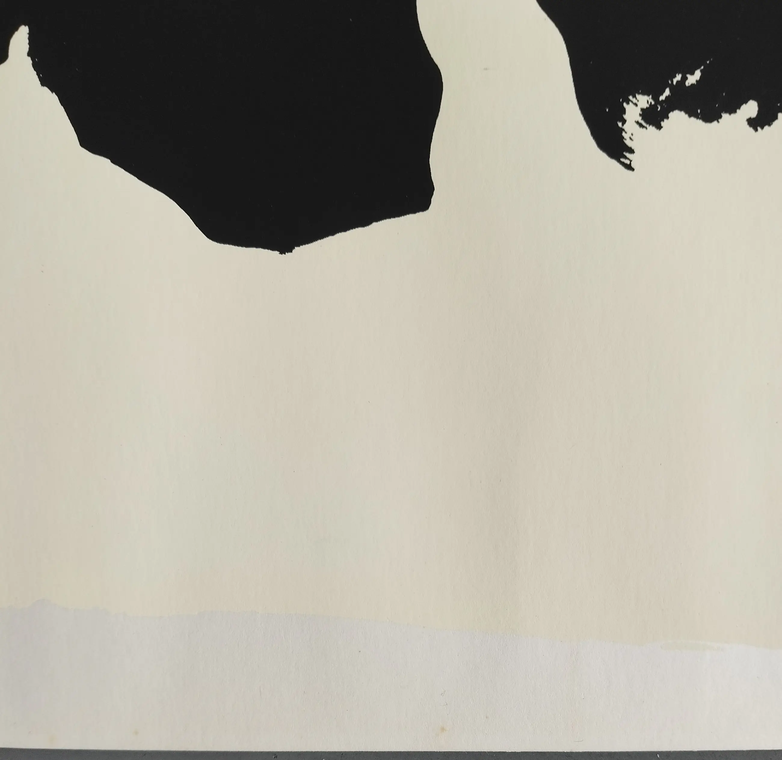 Aan de rand van de onderzijde van het papier zitten een paar kleine lichte vlekjes. Het papier is licht golvend. (niet zichtbaar/storend in lijst). Verder is de zeefdruk is in prima staat.