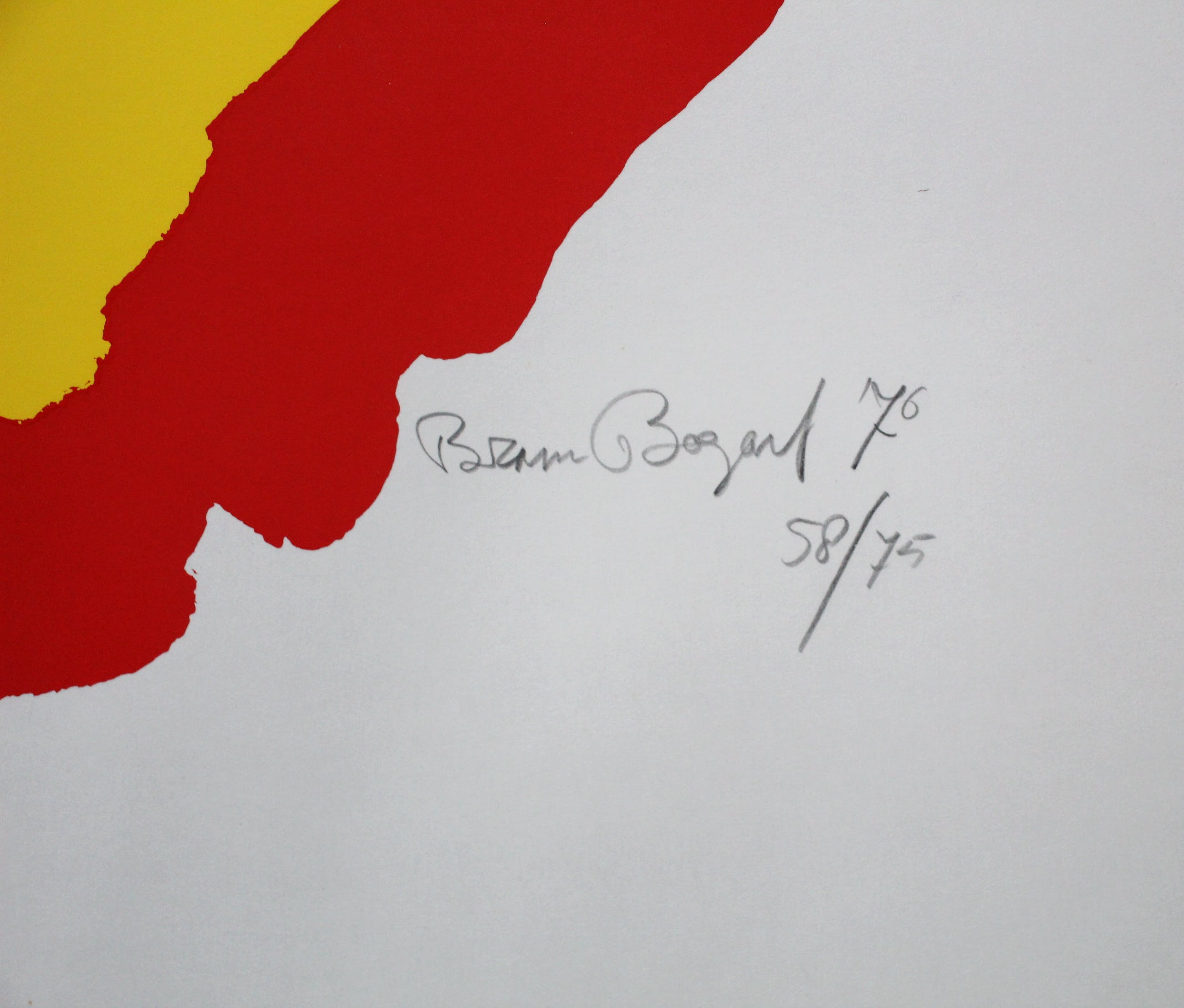 Prachtige zeefdruk van Bram Bogart. Titel: Geel vlak met rode rand. Uit de serie rood-geel-blauw Met potlood gesigneerd, gedateerd (‘76) en genummerd (58/75). Het blad is zeer netjes gemonteerd op stijf, dik papier / dun karton. Afmetingen: 75cm x 70cm (blad), 60cm x 55cm (beeld). Afkomstig uit de kunstcollectie van ABNAMRO. De authenciteit van dit werk wordt volledig gegarandeerd. Een certificaat van echtheid kan, op aanvraag, worden meegestuurd.