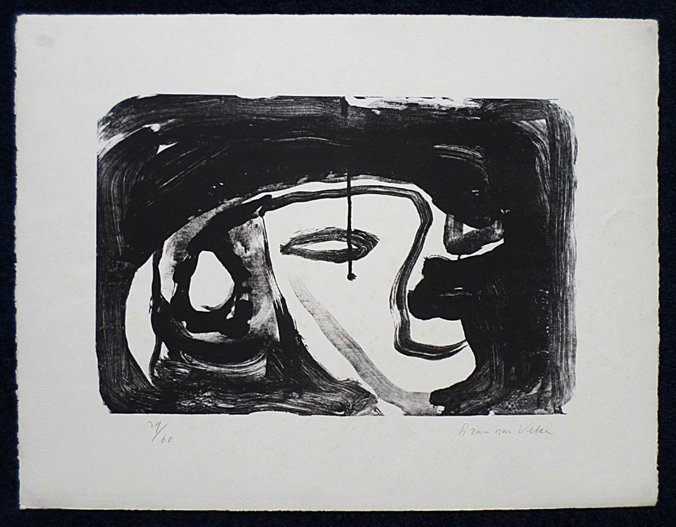 Mooie originele litho op Rives van Bram van Velde uit 1962. Handgesigneerd en genummerd. Dit is nummer 29 uit een oplage van slechts 60 stuks! Deze litho staat afgebeeld in het boek Bram van Velde Les Lithographies I 1923-1973 van Yves Rivière (YR no. 18). Op wat nauwelijks zichtbare ouderdomsplekjes na in uitstekende staat, nooit ingelijst geweest.