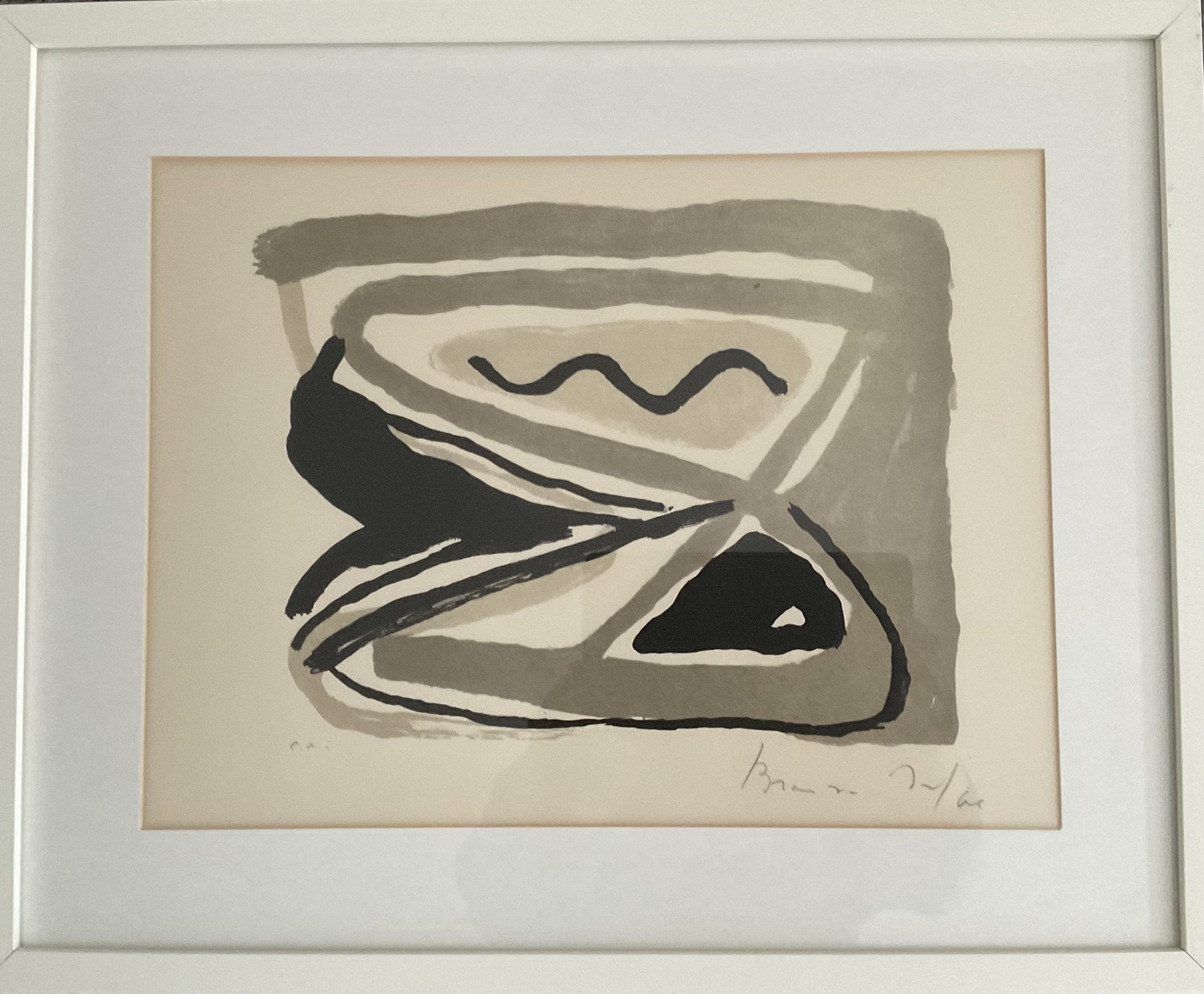 Handgesigneerde zeefdruk van Bram van Velden. Titel: Compositie. Werk is uit 1972 en handgesigneerd.Afmeting: 31,5 x 40 cm (blad) en 24 X 30 cm (afbeelding).