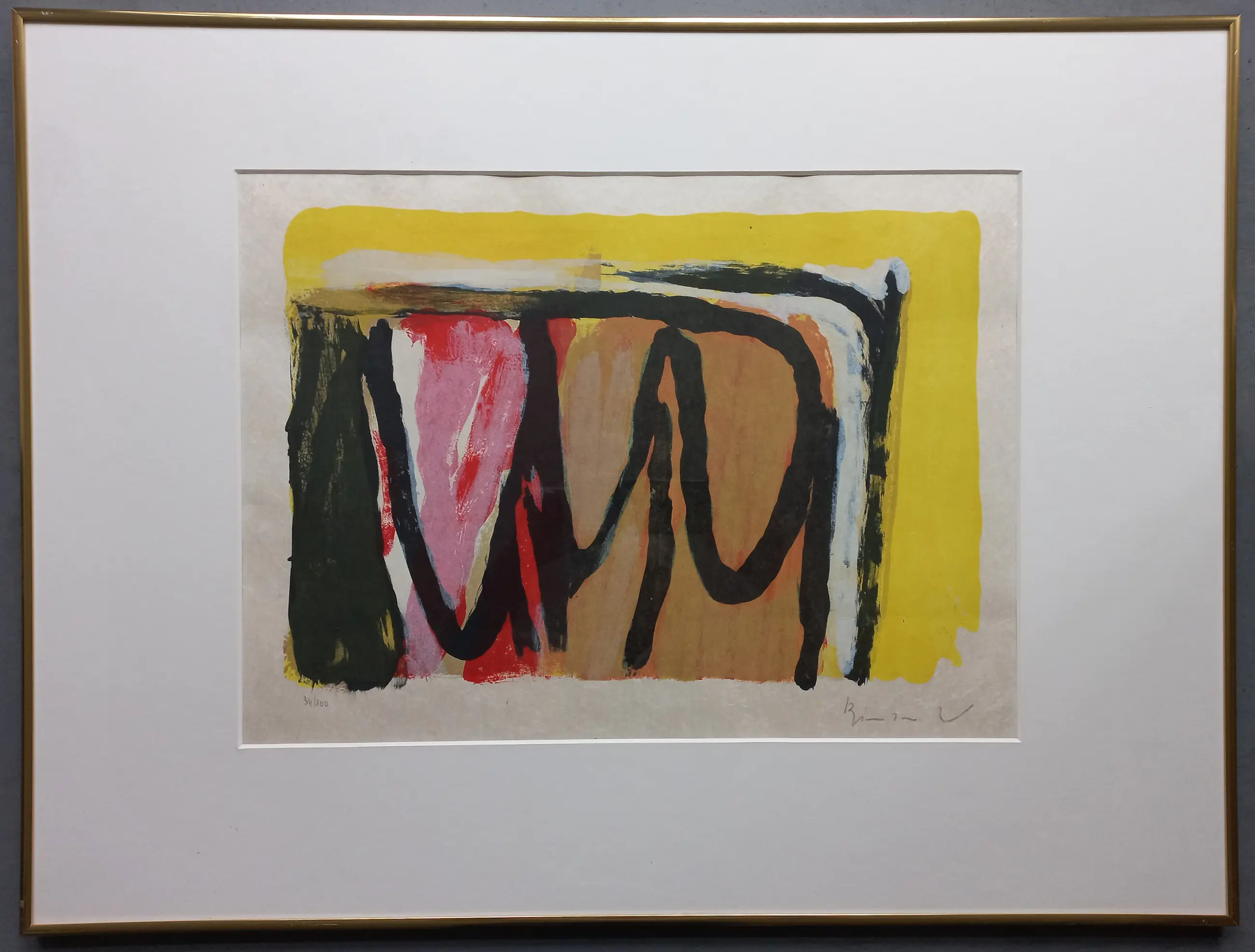Bram van Velde (1895-1981) gesigneerde litho op Japans papier uit 1977. Gedrukt in een oplage van 100 stuks. Rechtsonder is het werk gesigneerd in potlood. Linksonder met 34/100. Beeldmaat 37,5 x 51,5 cm (hxb). Afmeting goude aluminium lijst 60,5 x 80,5 cm (hxb) De litho is in prima conditie Het passe-partout heeft een paar lichte vlekjes en de lijst een paar krasjes.