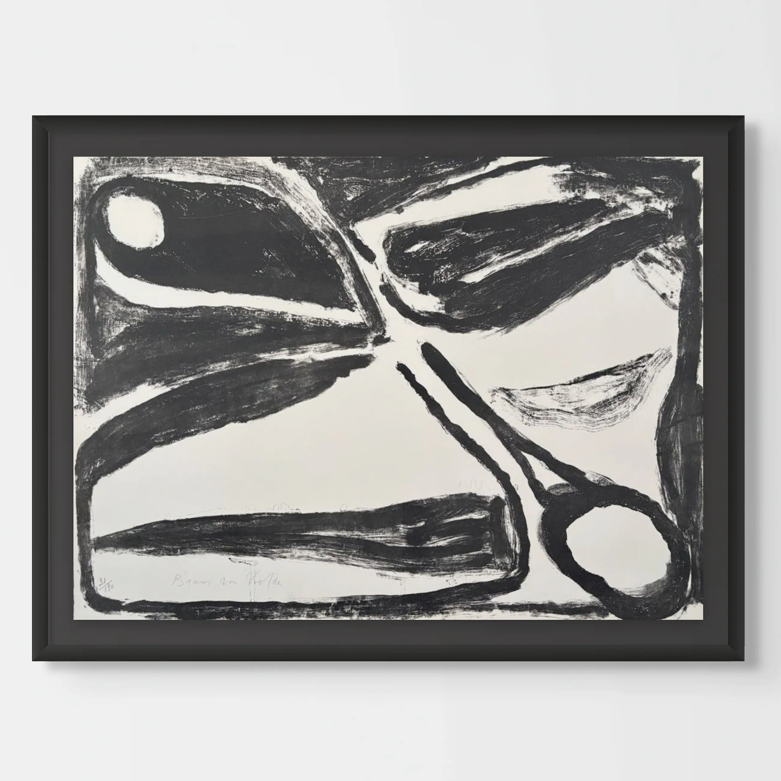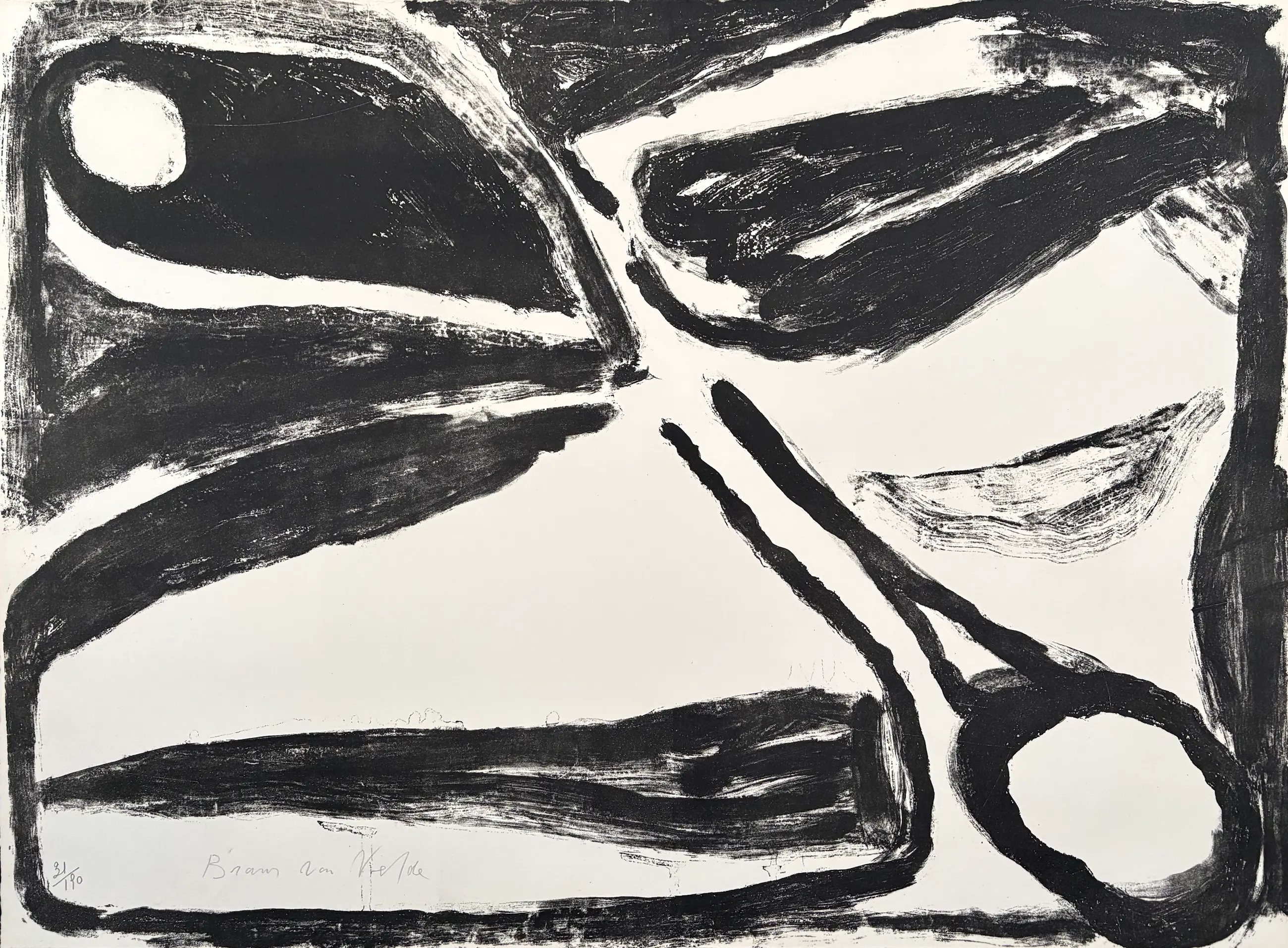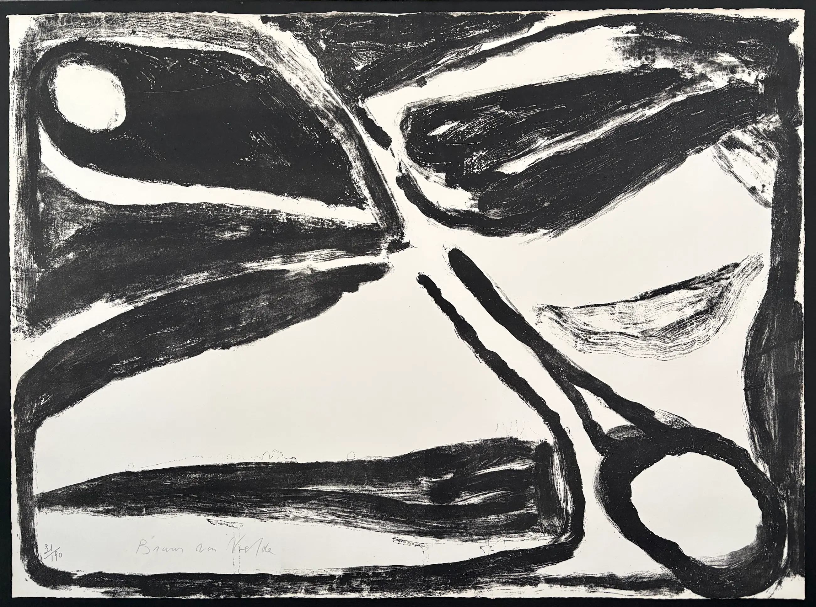 Prachtige originele lithografie in zwart/wit van Bram van Velde uit 1966. Deze lithografie staat gedocumenteerd als MP039 (Mason Putman), en staat vermeld in 'Lithographies originales deel I, Bram van Velde, pagina 57'. Het gaat hier om nummer 31 van 190. De lithografie meet 56x76cm. Wilt u deze lithografie inlijsten dan kan dit optioneel in onze lijstenmakerij te Westzaan (Noord-Holland). De bijgevoegde foto's met lijst zijn ter illustratie. De litho komt met een authenticiteits-certificaat opgemaakt door Modern Dutch Art Gallery.