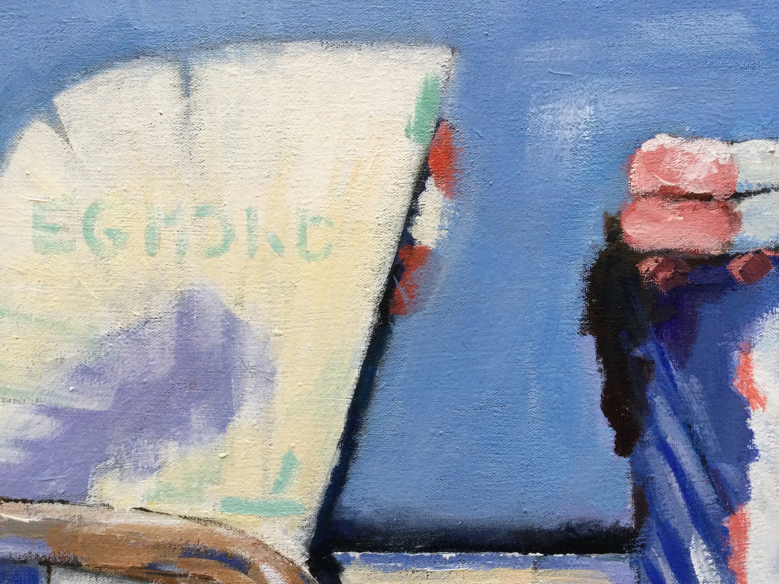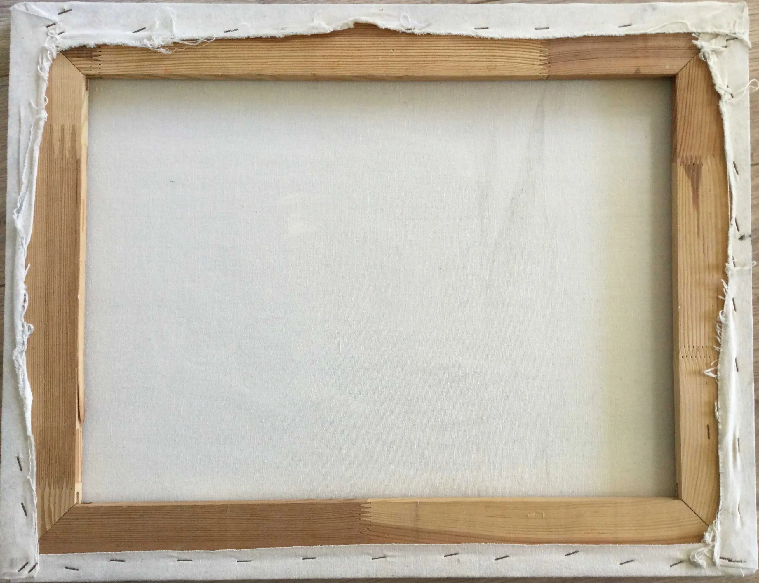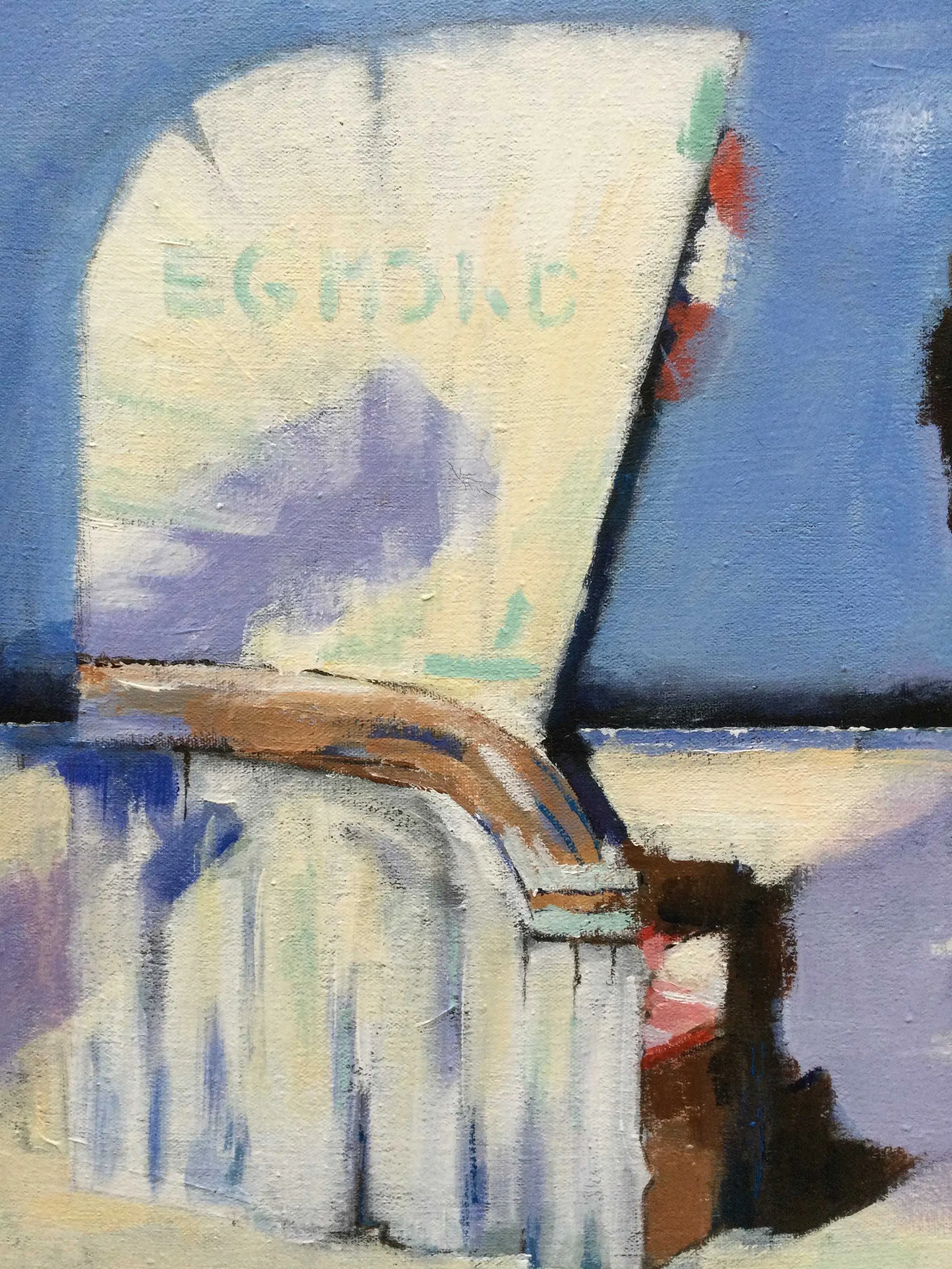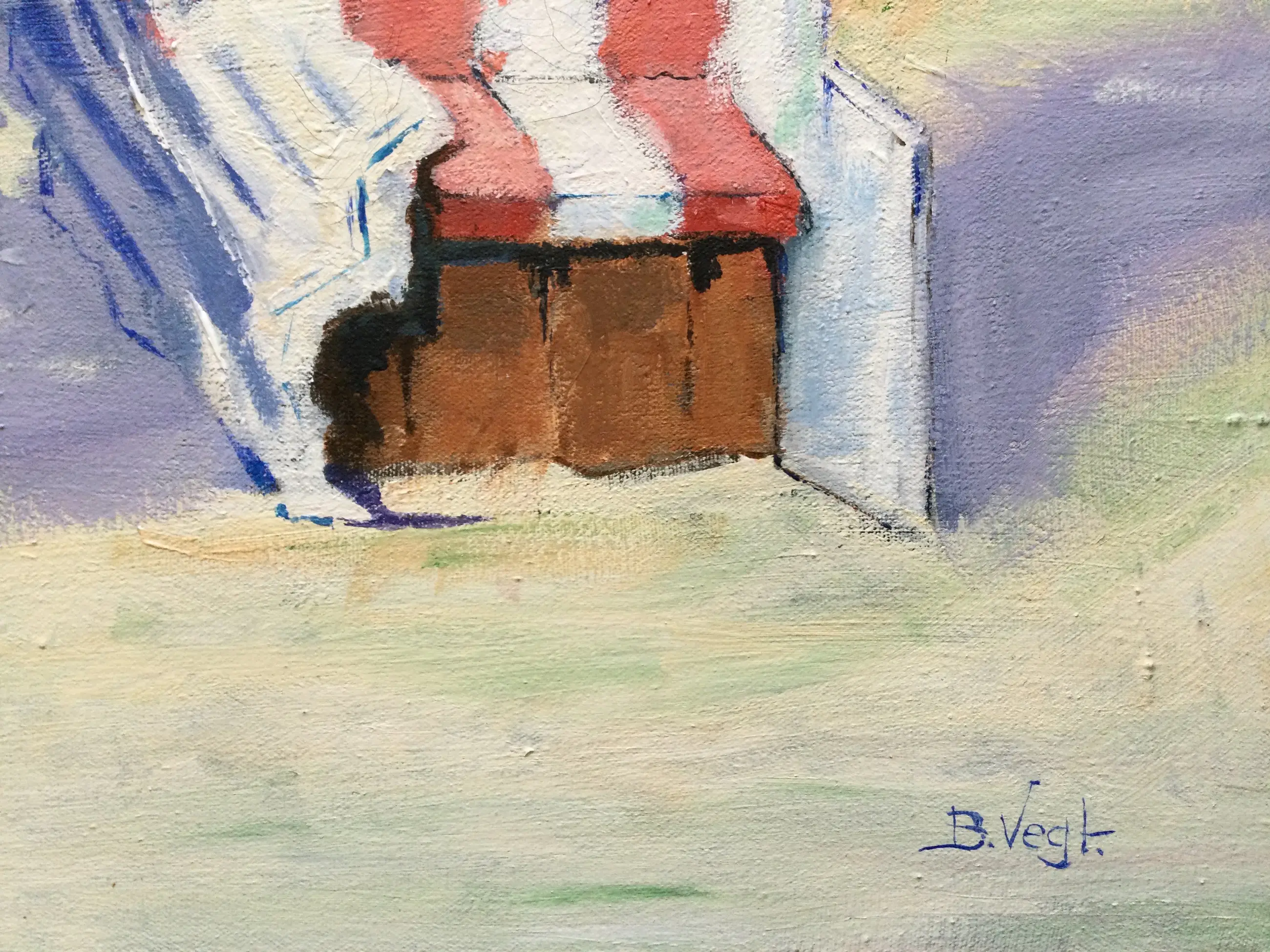 Conditie: de spielatjes ontbreken, zie foto achterzijde. Het doek is volledig intact evenals de verf. De rechter strandstoel heeft licht craquelé in de witte verf. De afbeelding is langs de randen net niet overal meegeschilderd zodat de verf van de ondergrond hier iets zichtbaar is. Zie ook opmerkingen onder 'conditie'.