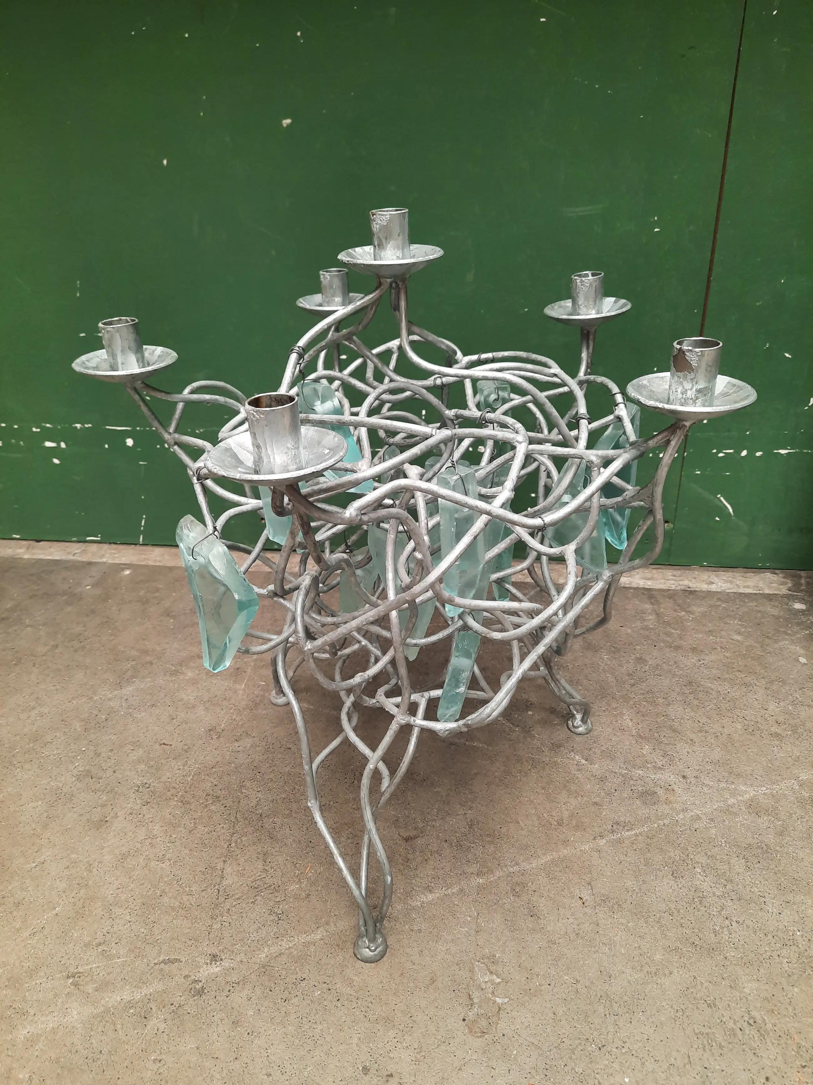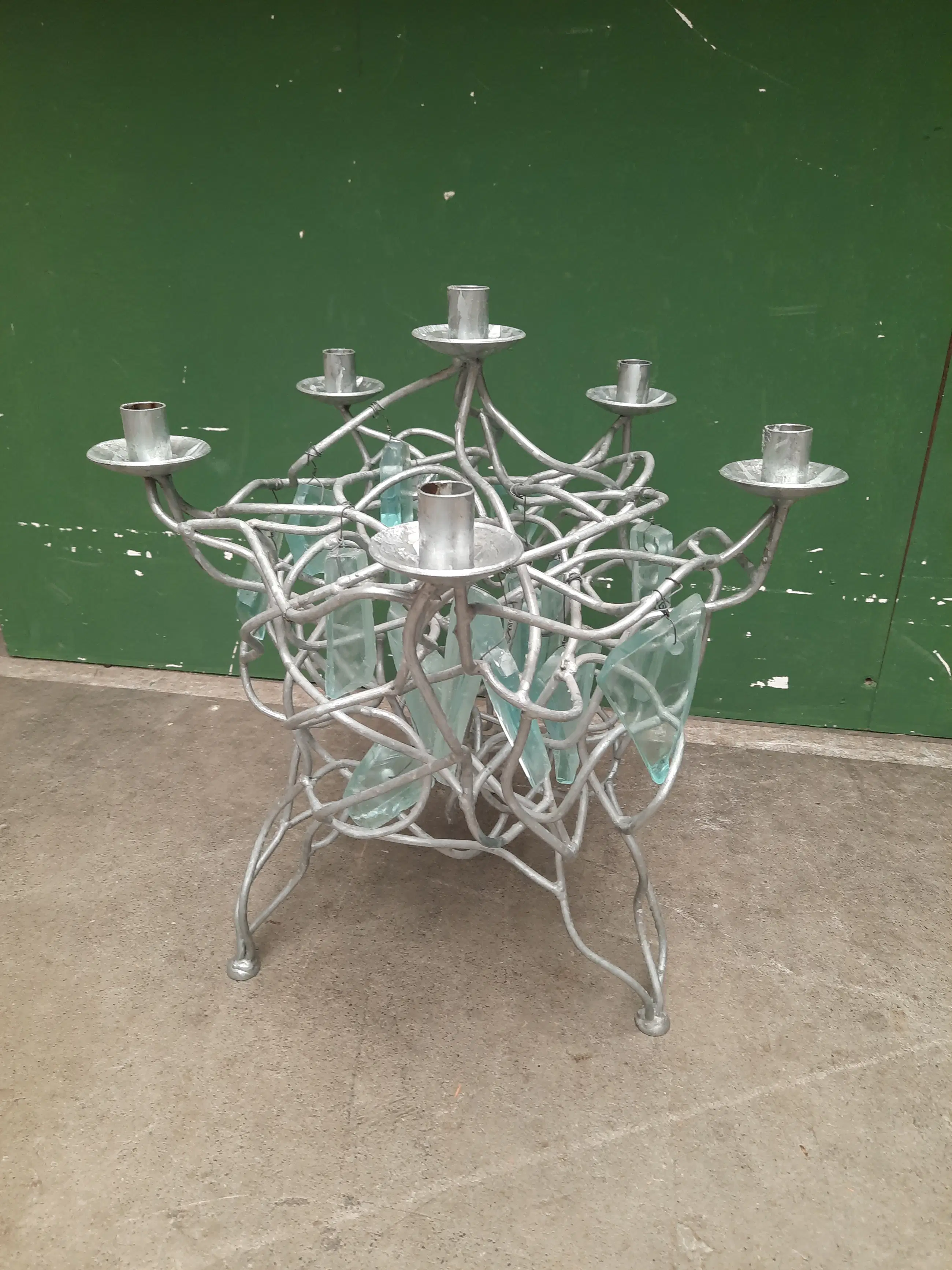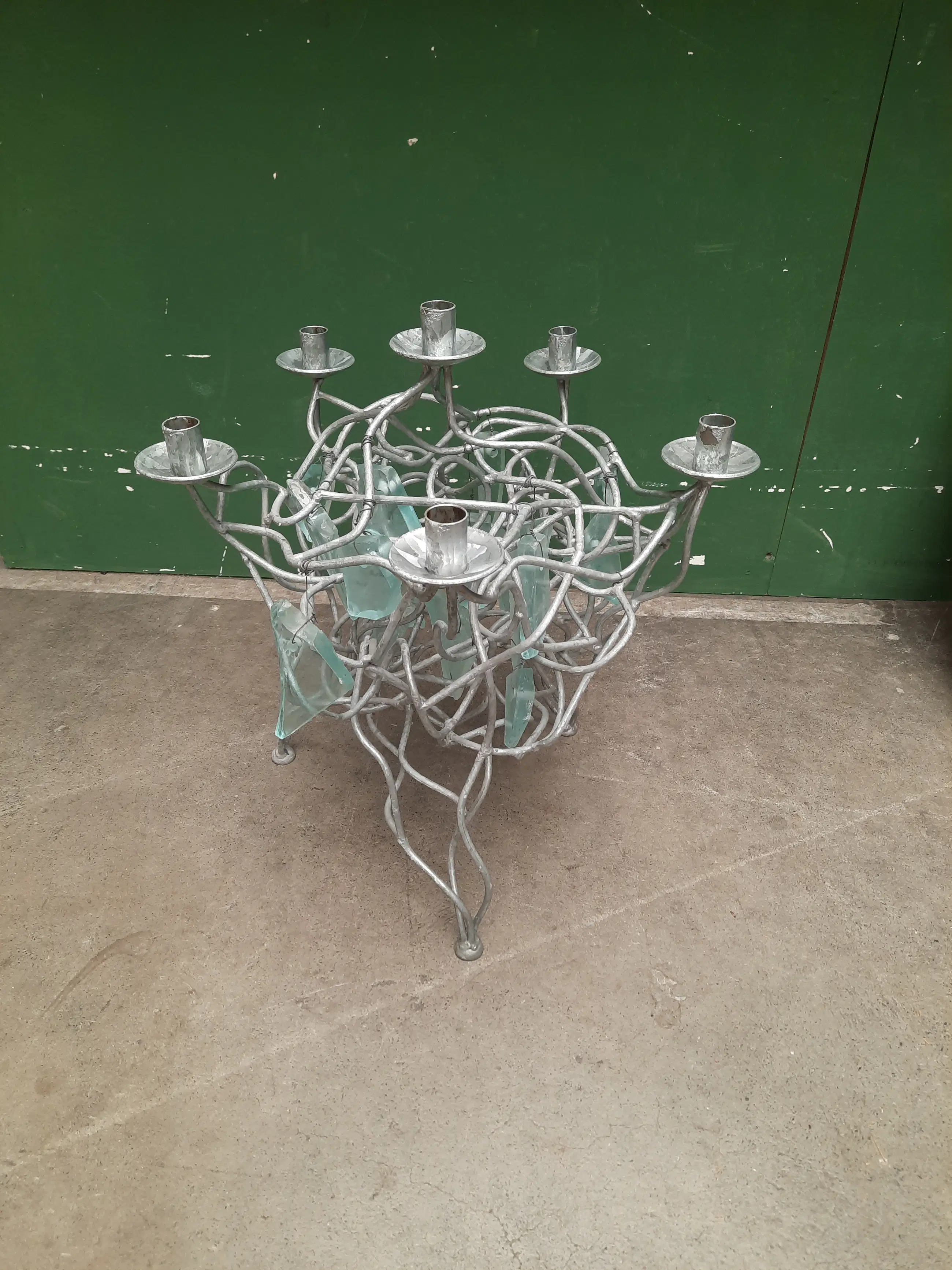Mooie design kandelaar van de hand van Brand van Egmond. Gegalvaniseerd ijzer met dikke glazen stukken. Plek voor 6 kaarsen. 50 cm hoog (zonder kaars)