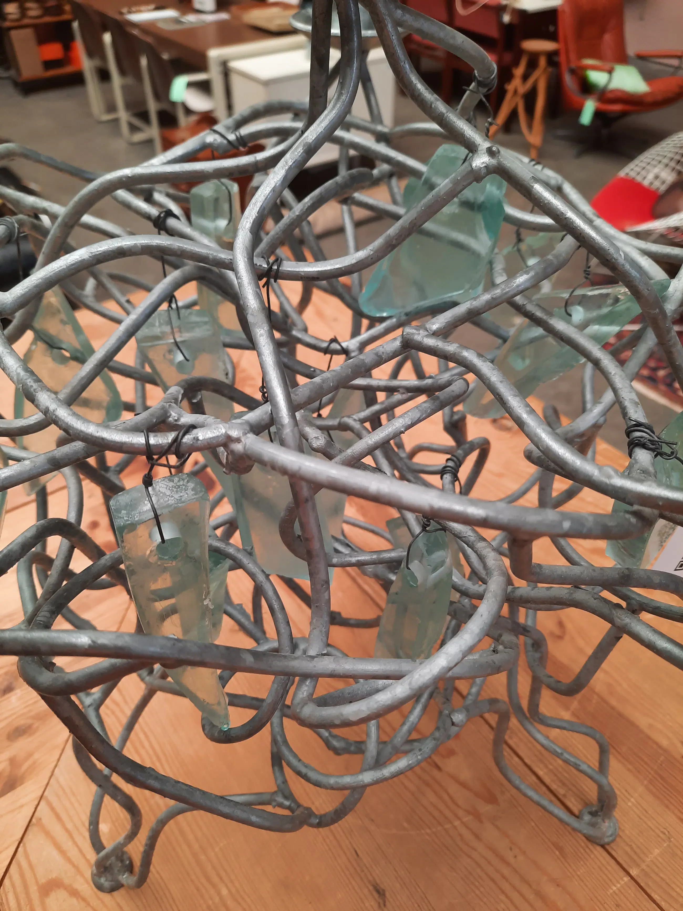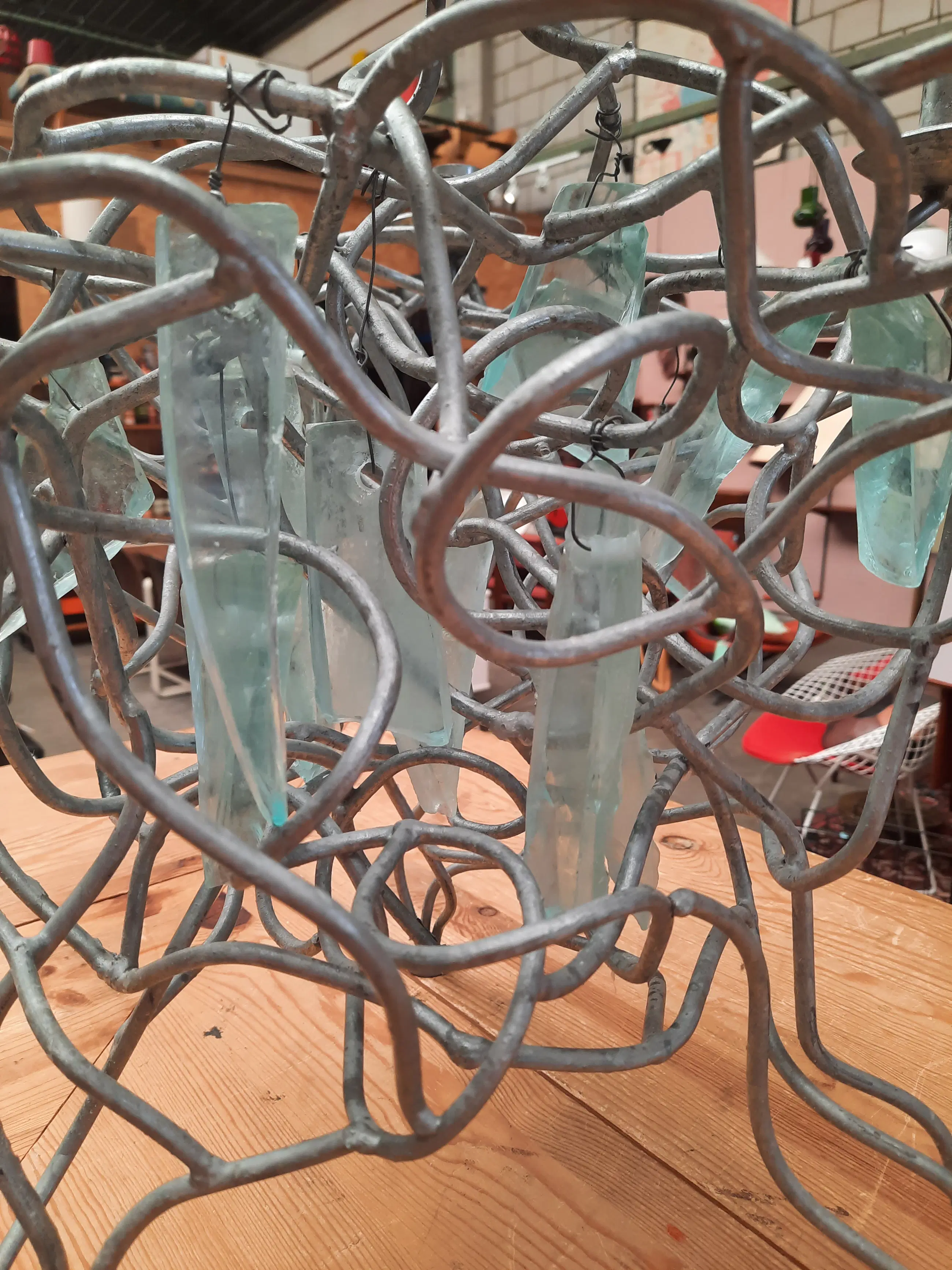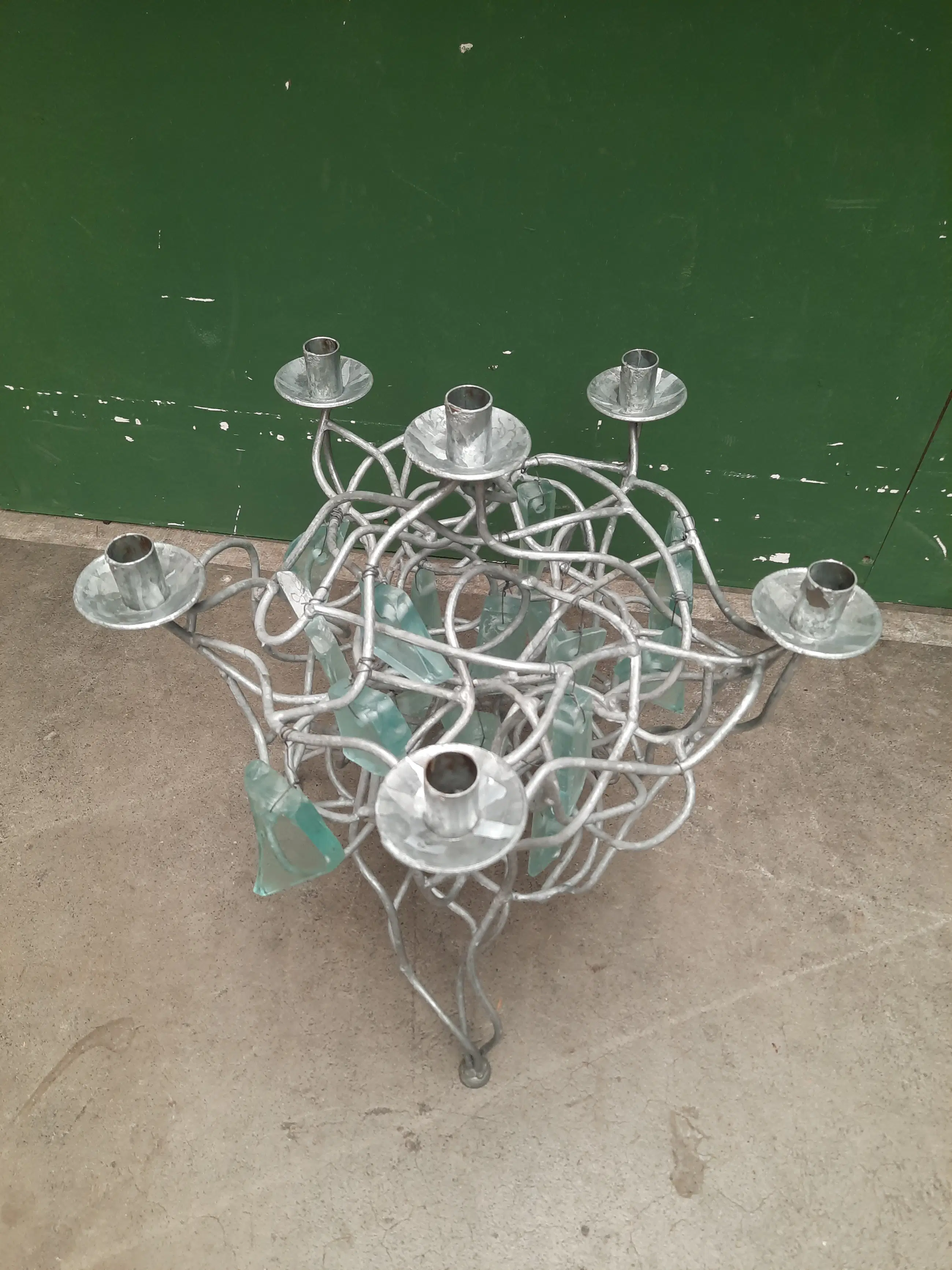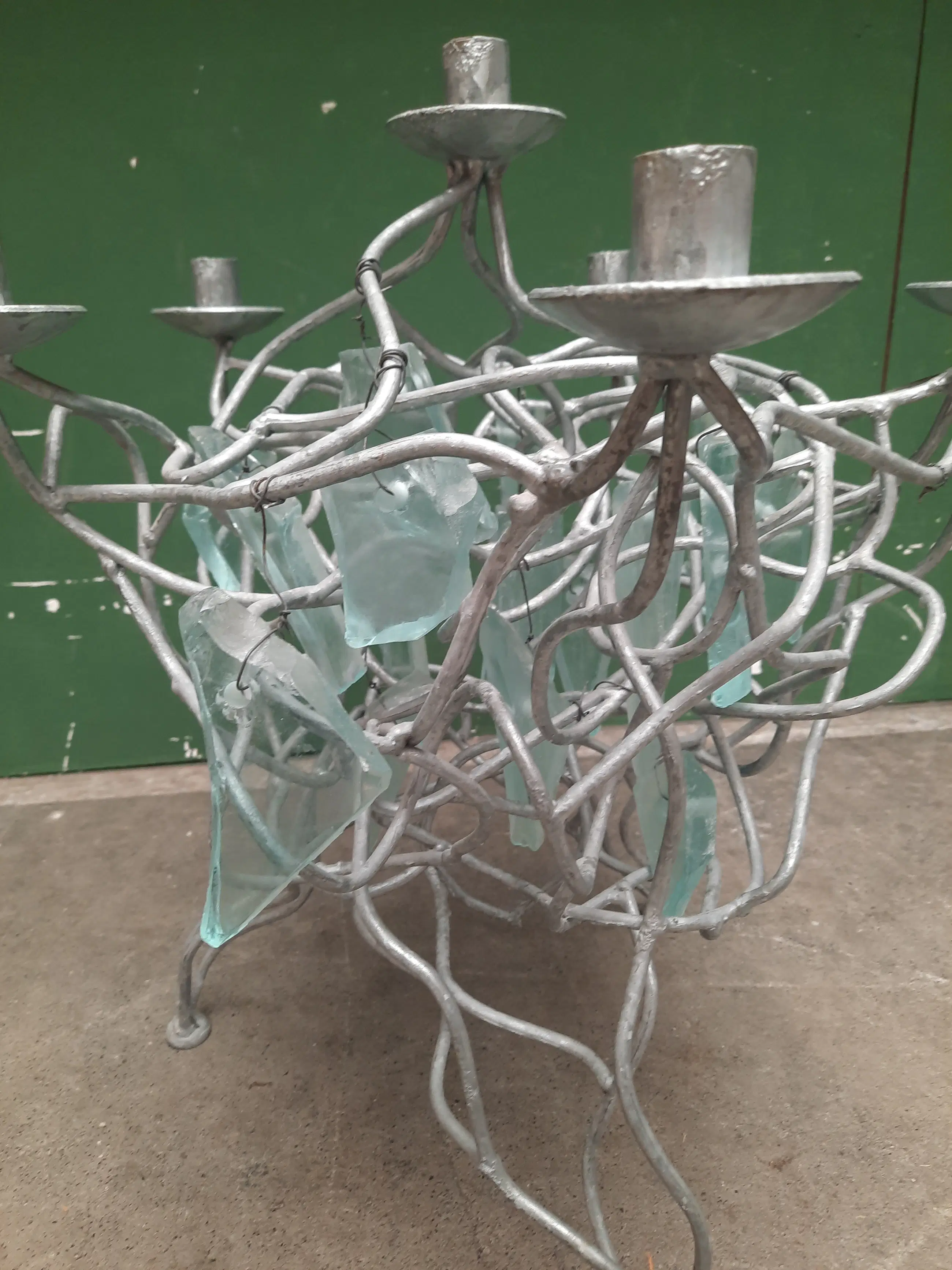 Mooie design kandelaar van de hand van Brand van Egmond. Gegalvaniseerd ijzer met dikke glazen stukken. Plek voor 6 kaarsen. 50 cm hoog (zonder kaars)