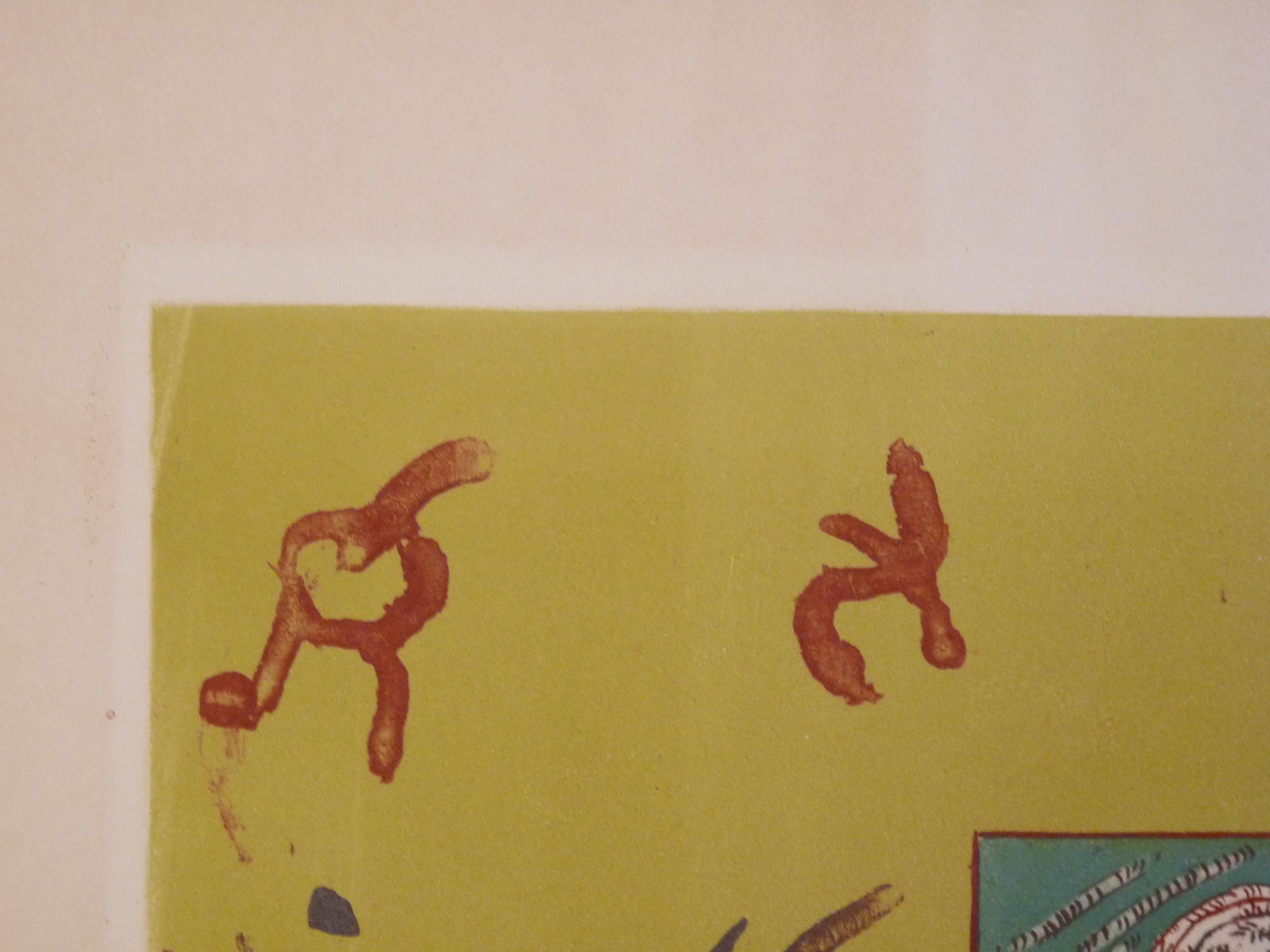 Zeefdruk uit 1968, van een veelzijdige kunstenaar. Het is een "épreuve d'artiste" Blad heeft diverse verschillende verkleuringen, zowel door de afbeelding als de randen. (detailfoto) Afmeting blad 50 x 65 cm. Afbeelding 34,5 x 44 cm.