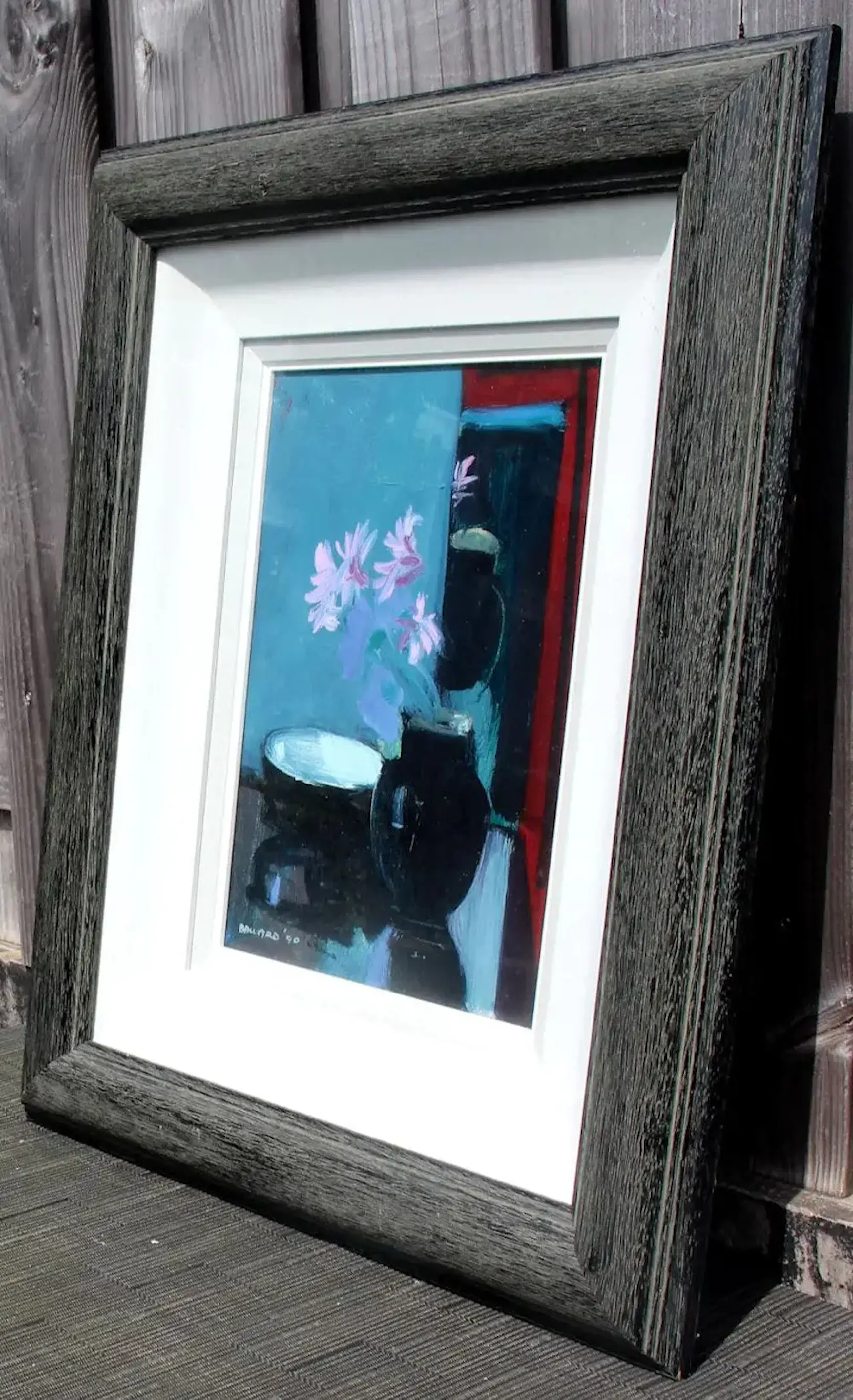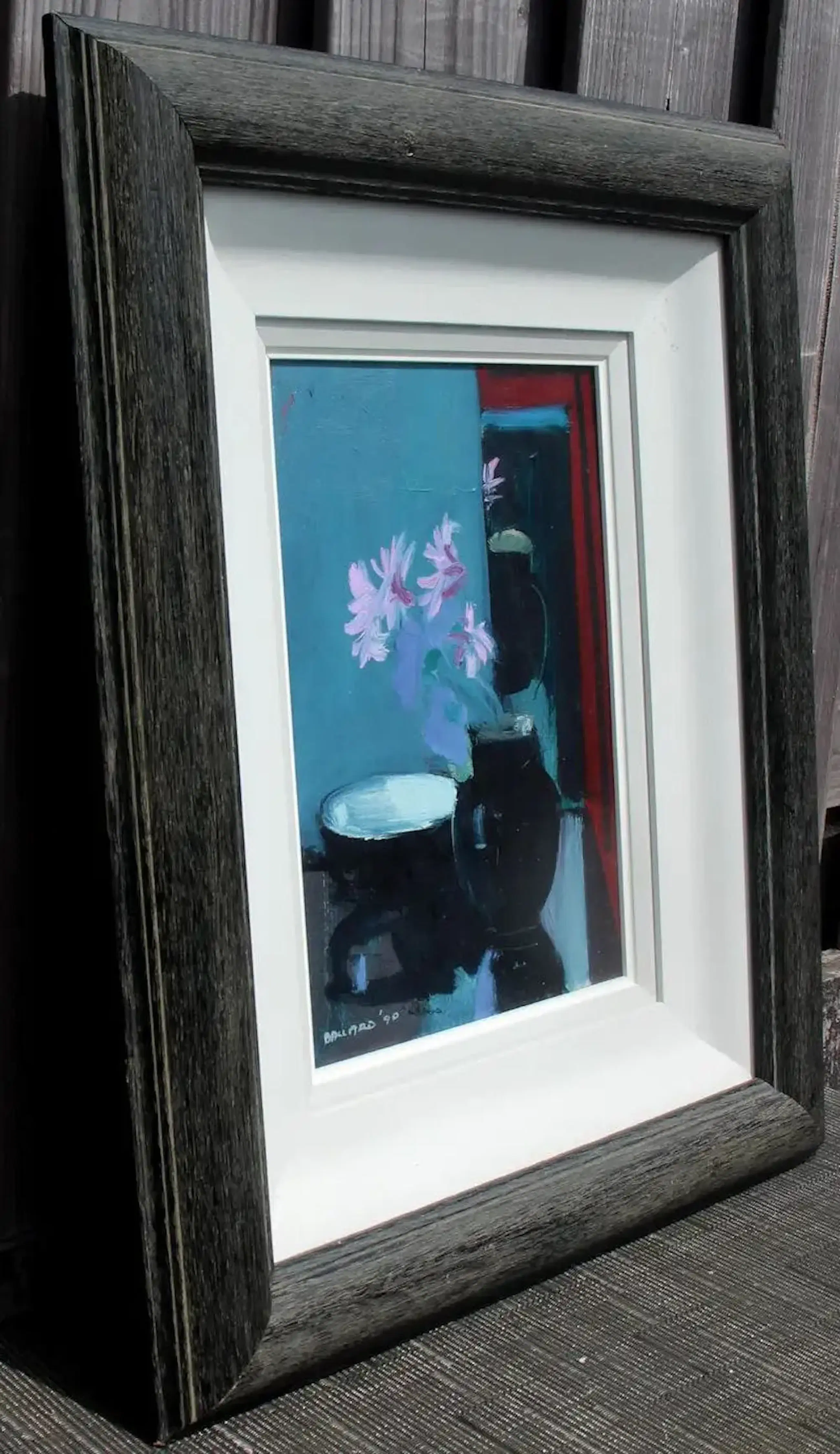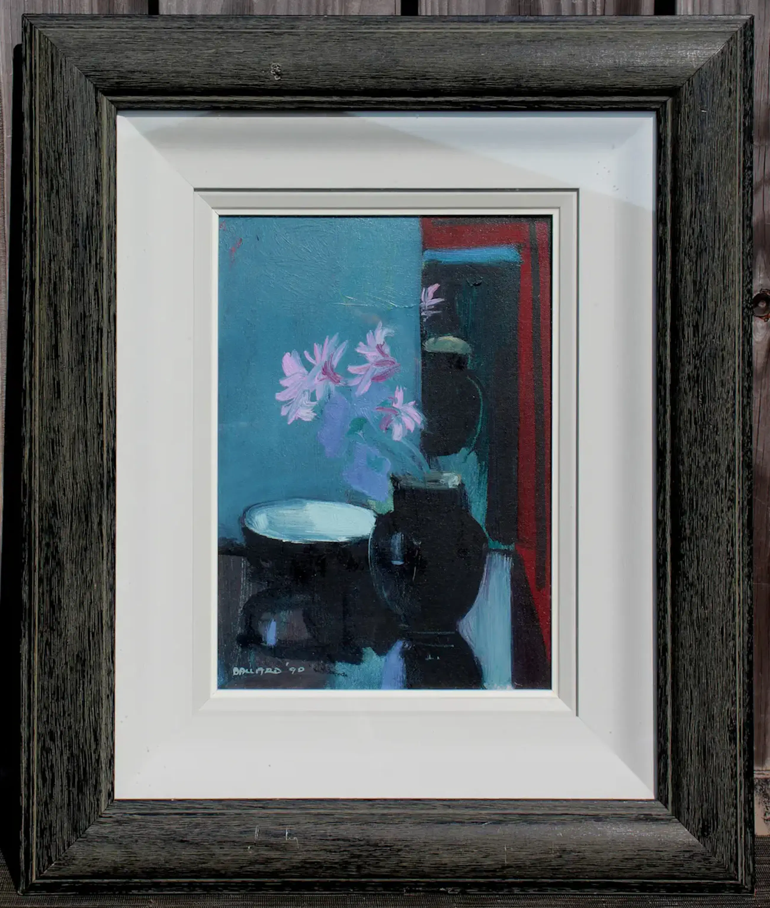 Mooi stilleven van de Ierse kunstenaar Brian Ballard. Jaar: 1990. Titel: Black vase in mirror.