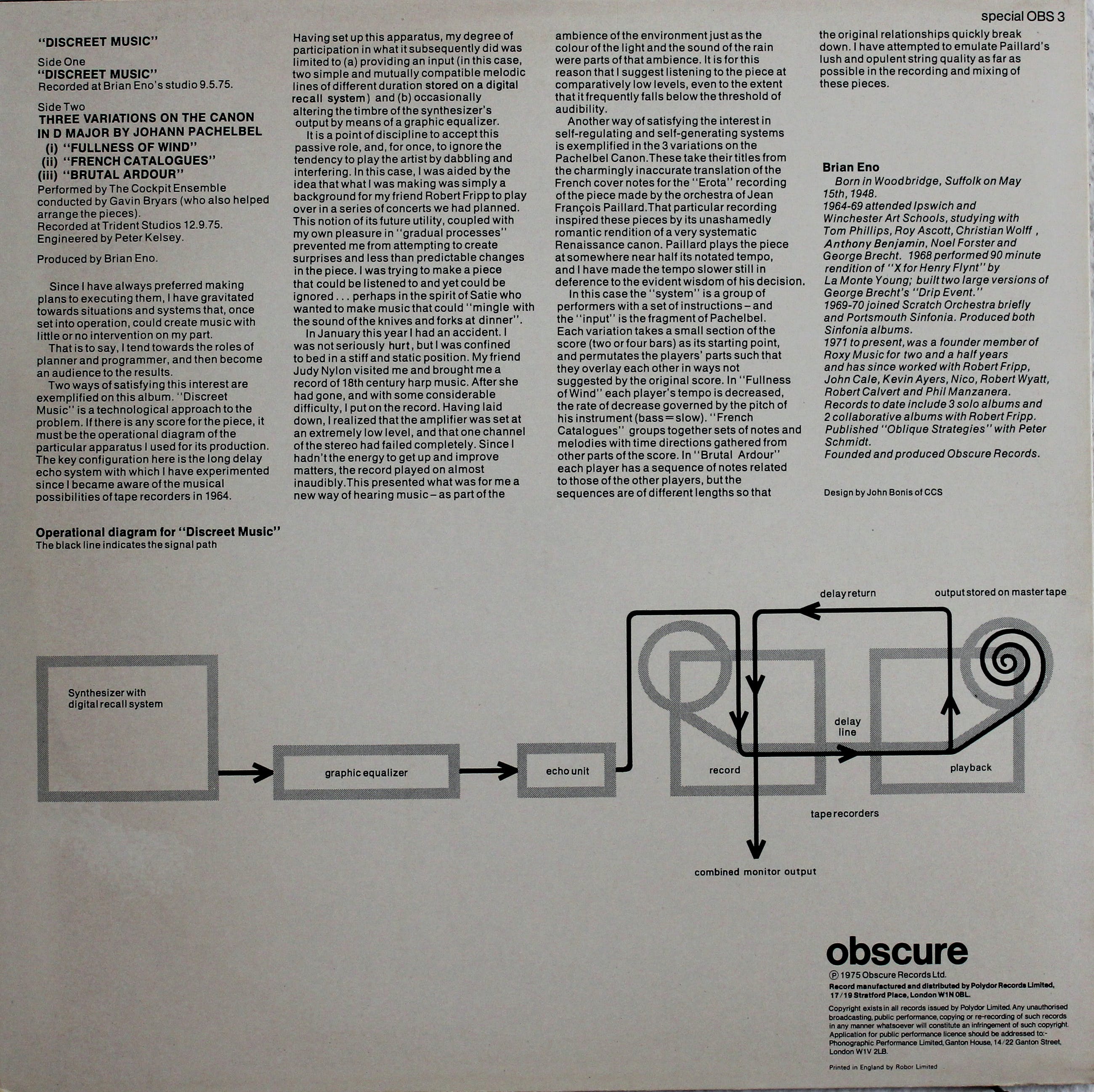 Album uit 1975 uit de Obscure-reeks/label. Eno maakte vroeger deel uit van Roxy Music, maar ging al snel solo. Vele albums volgden, meestal met avant-garde muziek. Heeft samengewerkt met o.a. Robert Fripp, David Bowie en David Byrne.