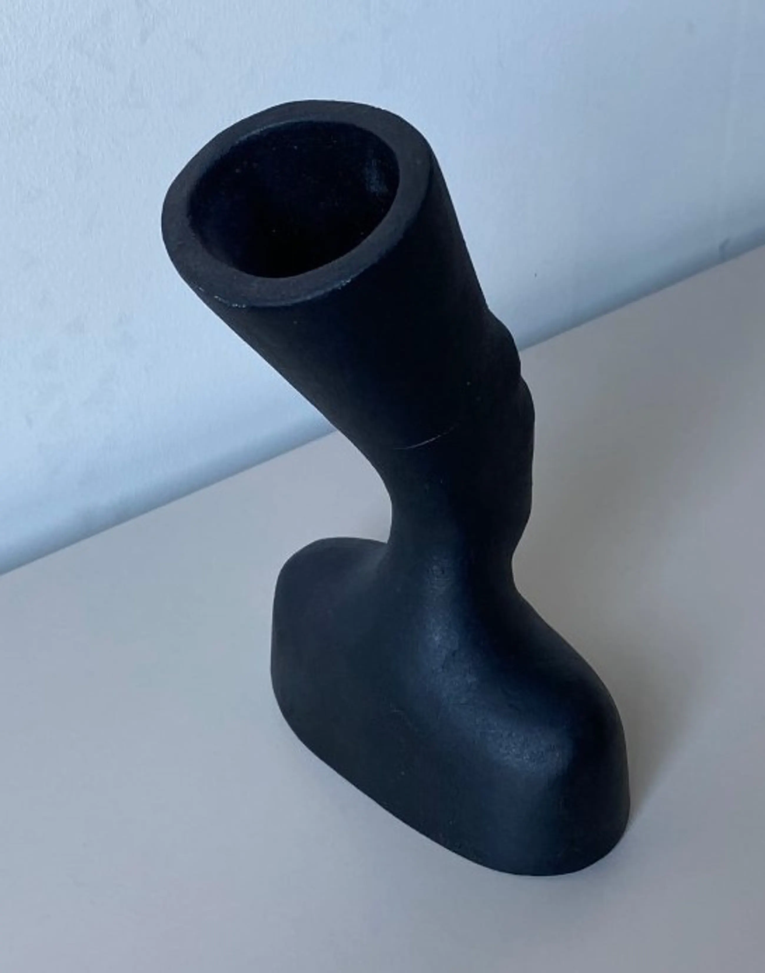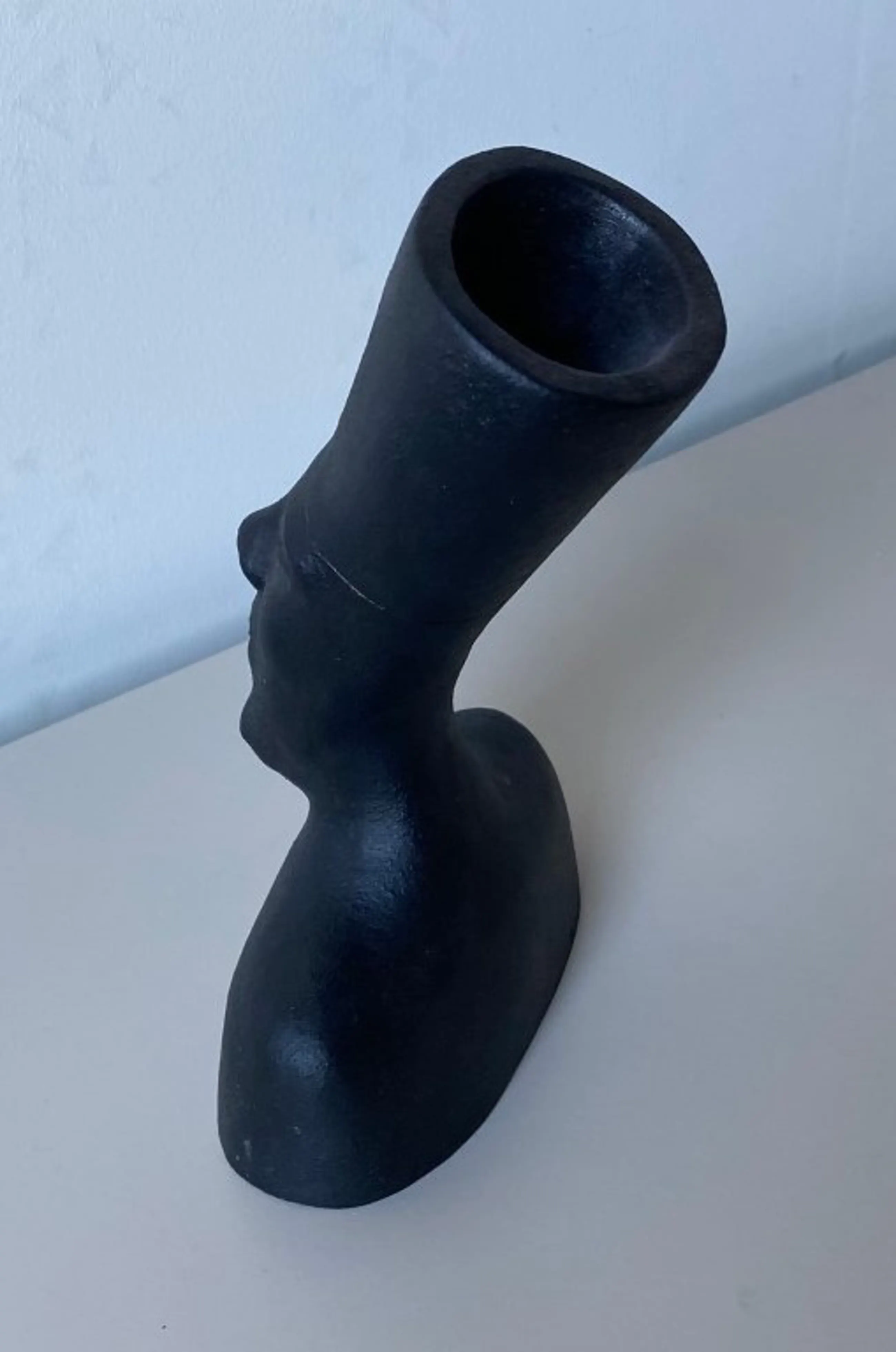 Keramische buste van vermoedelijk een Noorse Godheid, uitgevoerd in rood aardewerk en kolenzwart matglanzend wat vettig glazuur. Gesigneerd aan de onderzijde en aan de achterzijde voorzien van monogram BJD en jaartal.