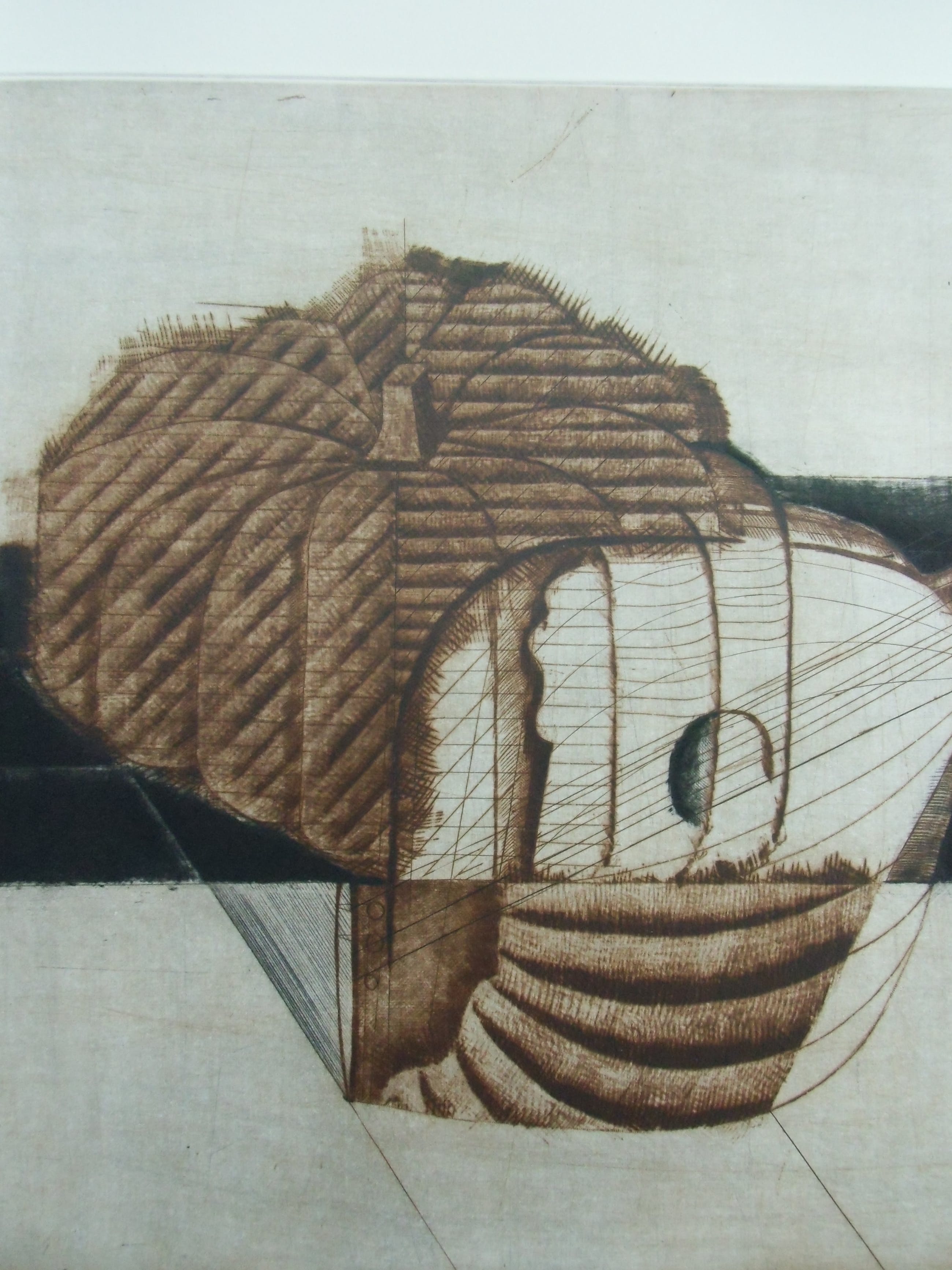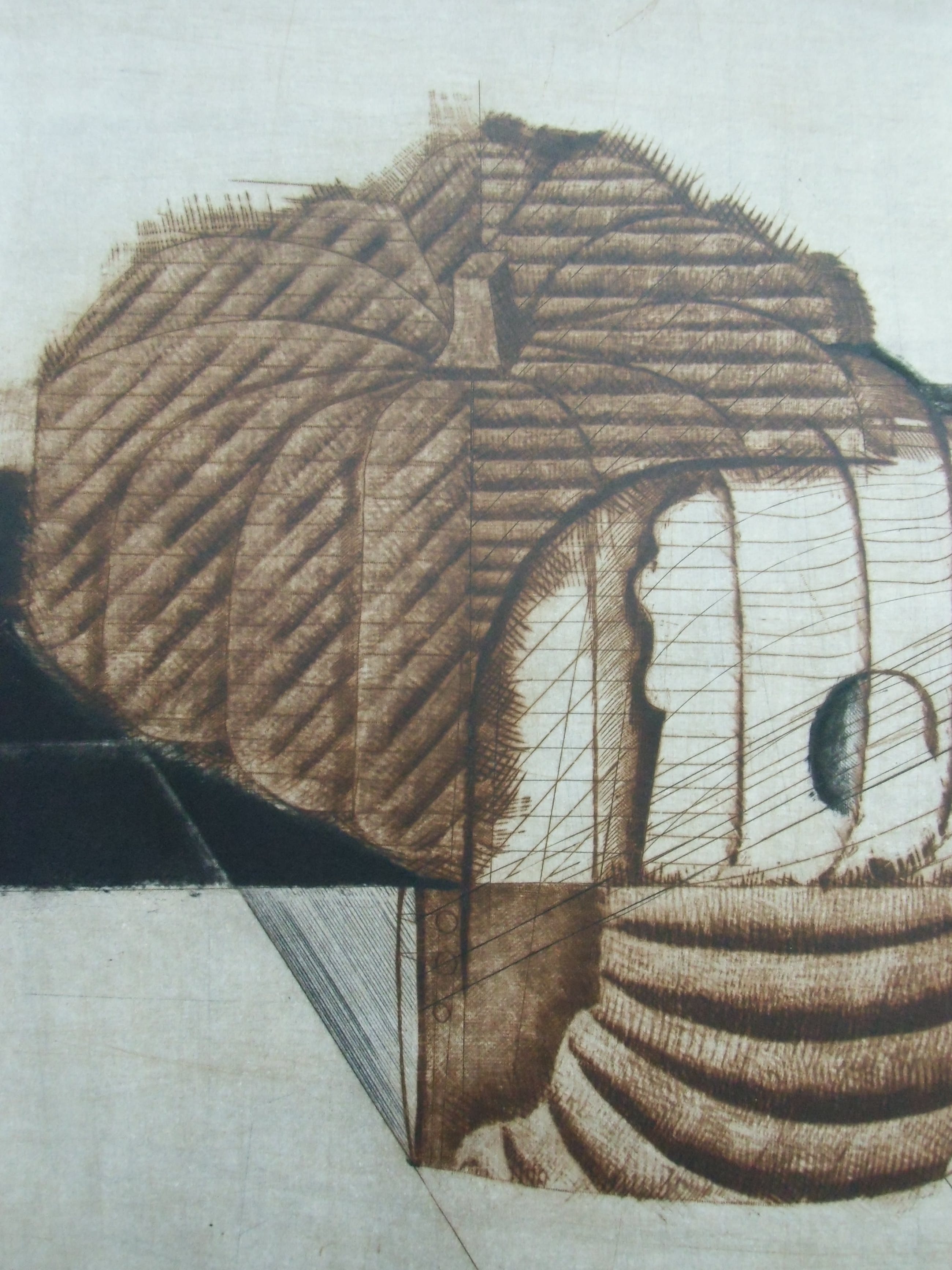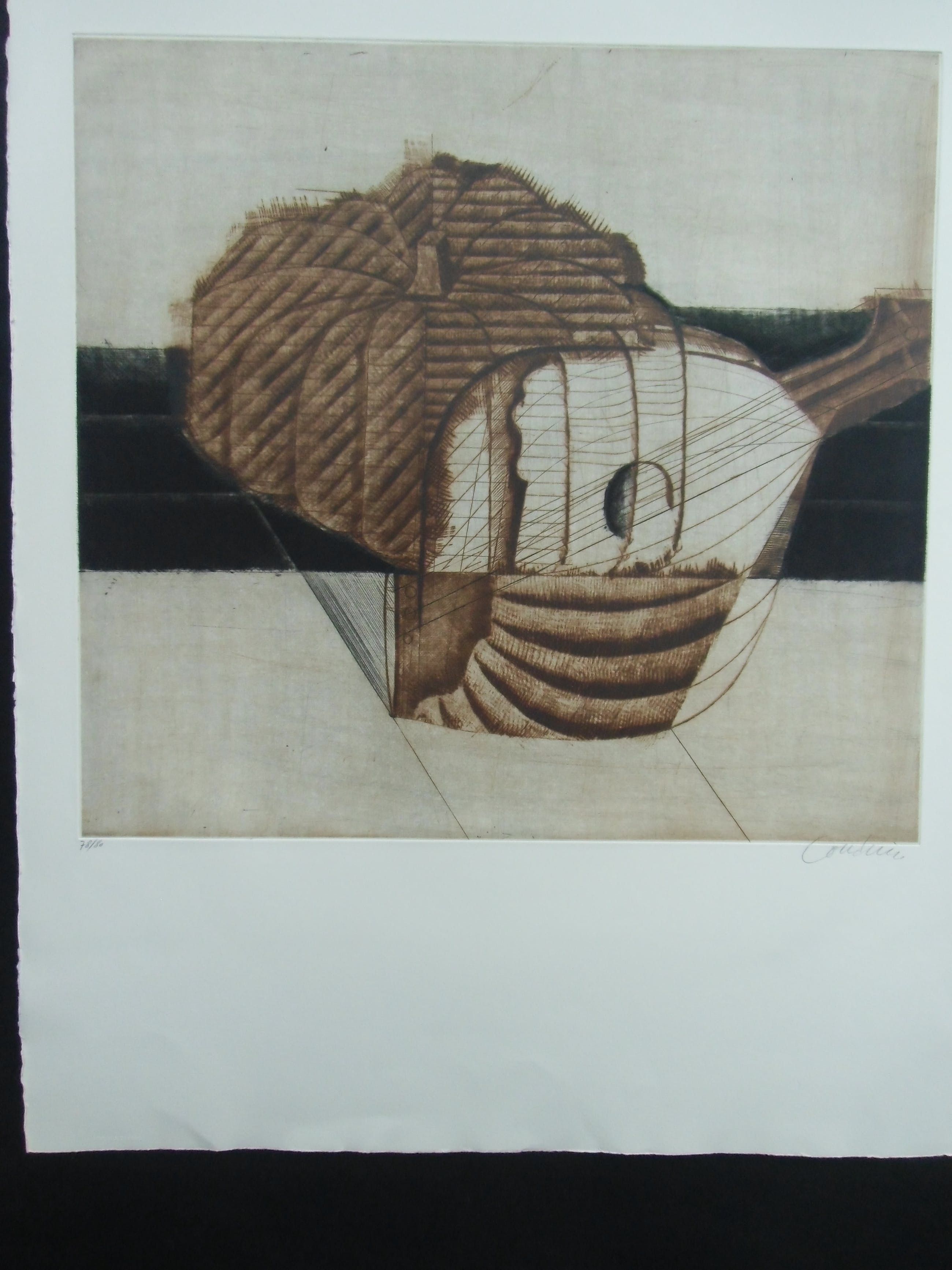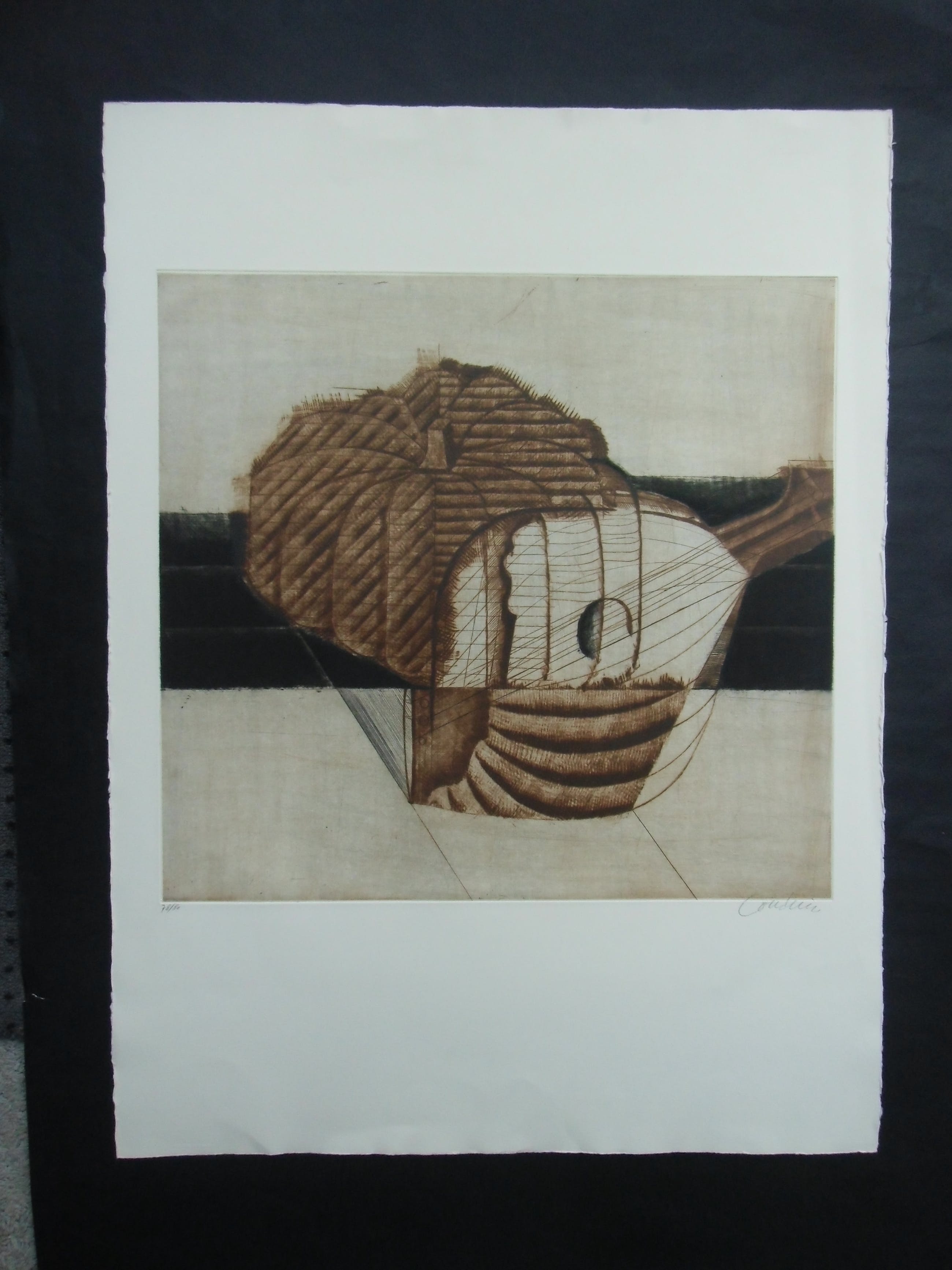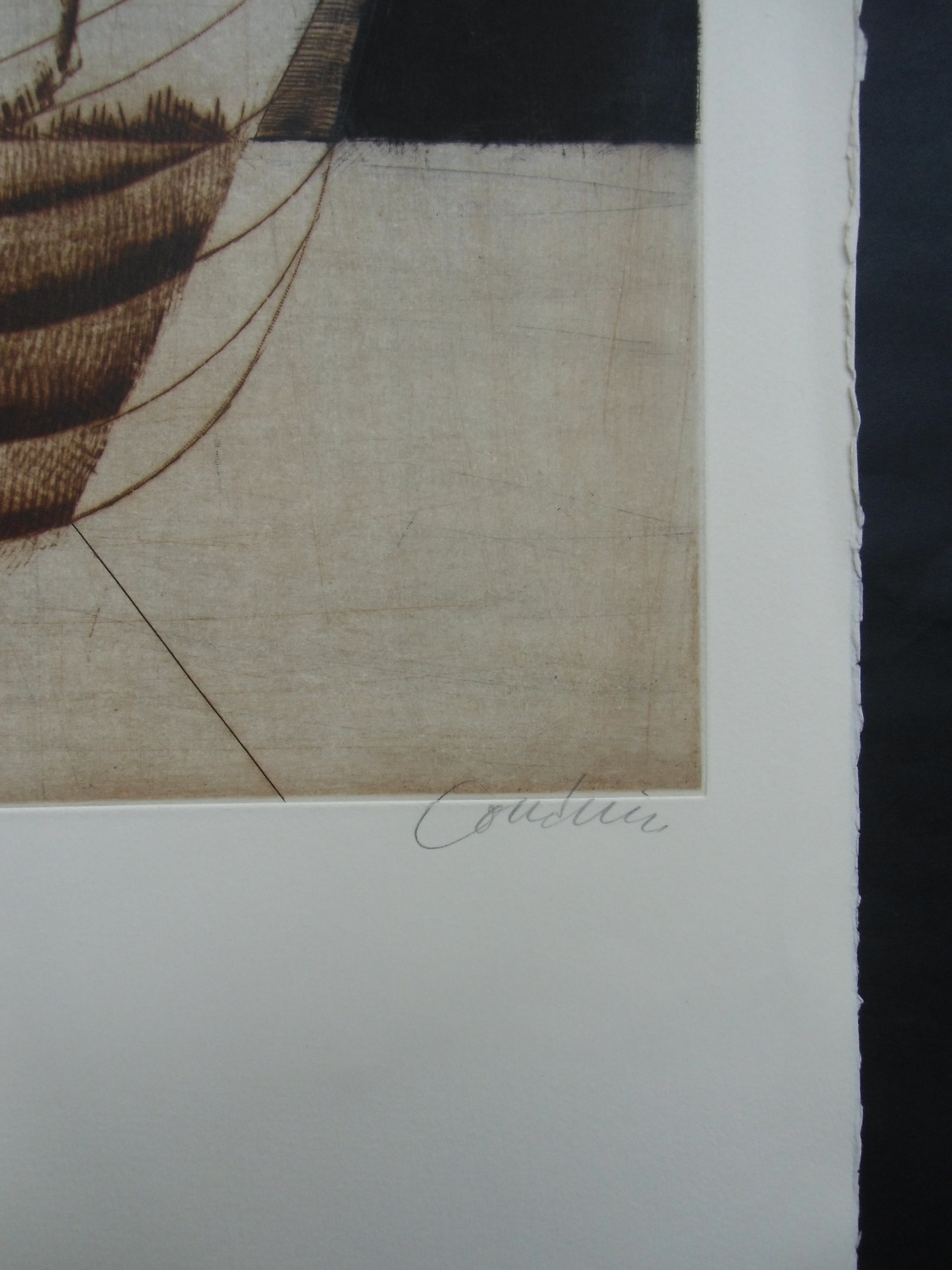 Deze kleurets van Brigitte Courdain heeft divers plantaardig materiaal tot onderwerp. Het beeld is afgedrukt op een blad van geschept papier van 76 bij 56 cm. Met potlood gesigneerd en fraaie staat.