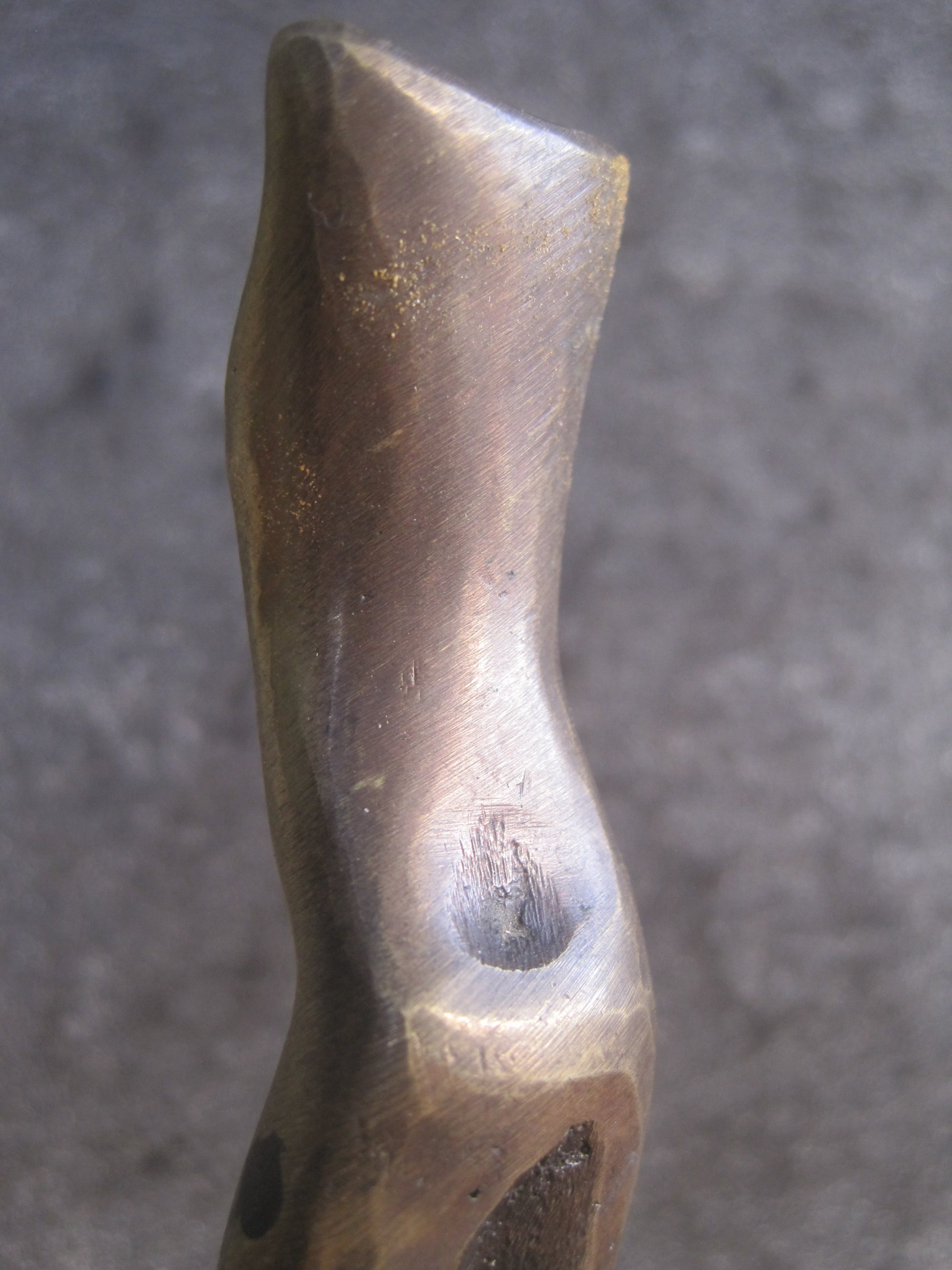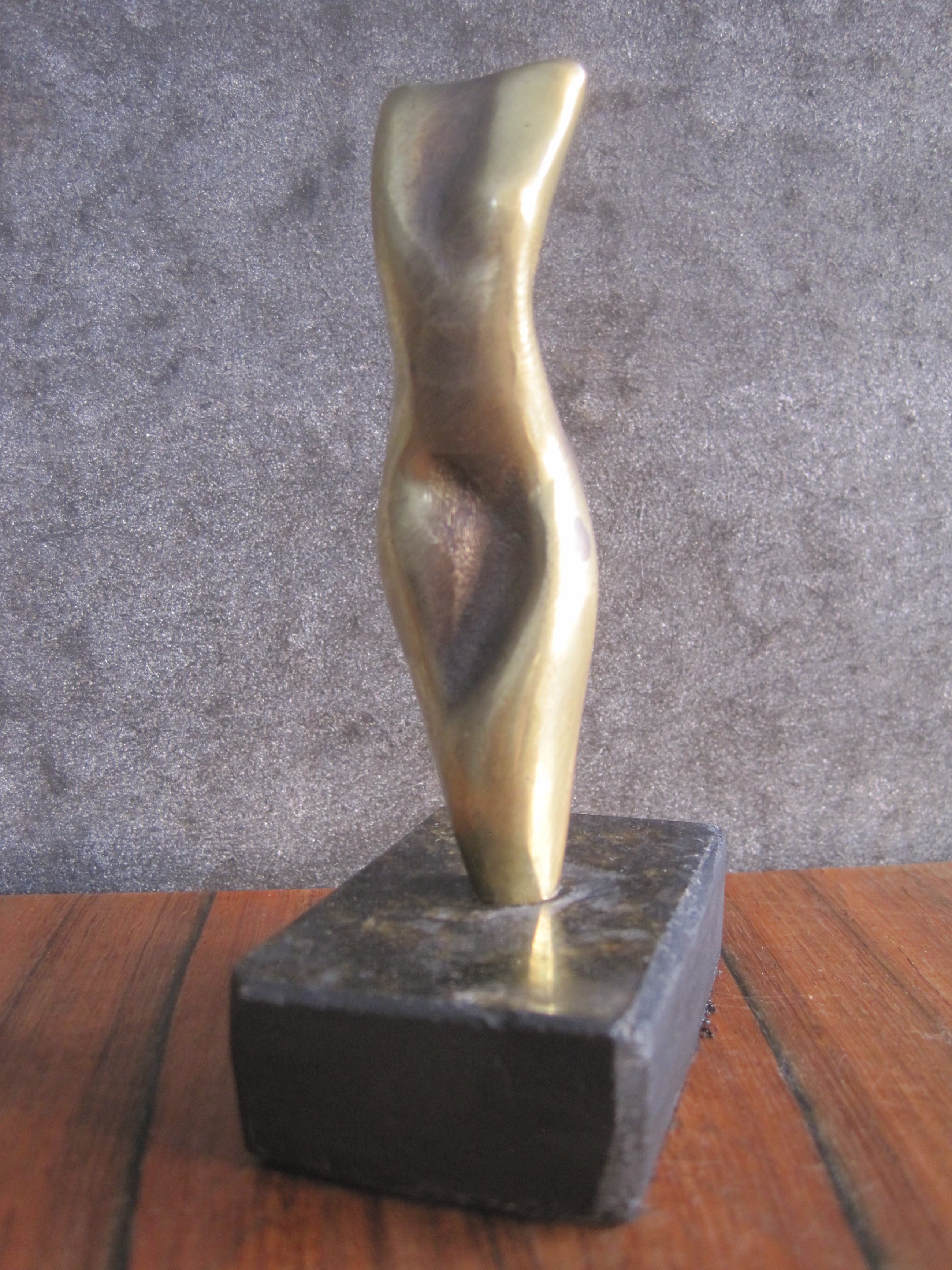 Een heel subtiel gevormd abstract bronzen beeldje. Het is gesigneerd Tonny. Naar mijn idee is het sokkeltje verkleind. Op de rechter dij van het beeldje zit een rond plekje, ik denk dat daar een stukje van het verguldsel weg is. Daar is ook te zien dat het beeldje van brons is.