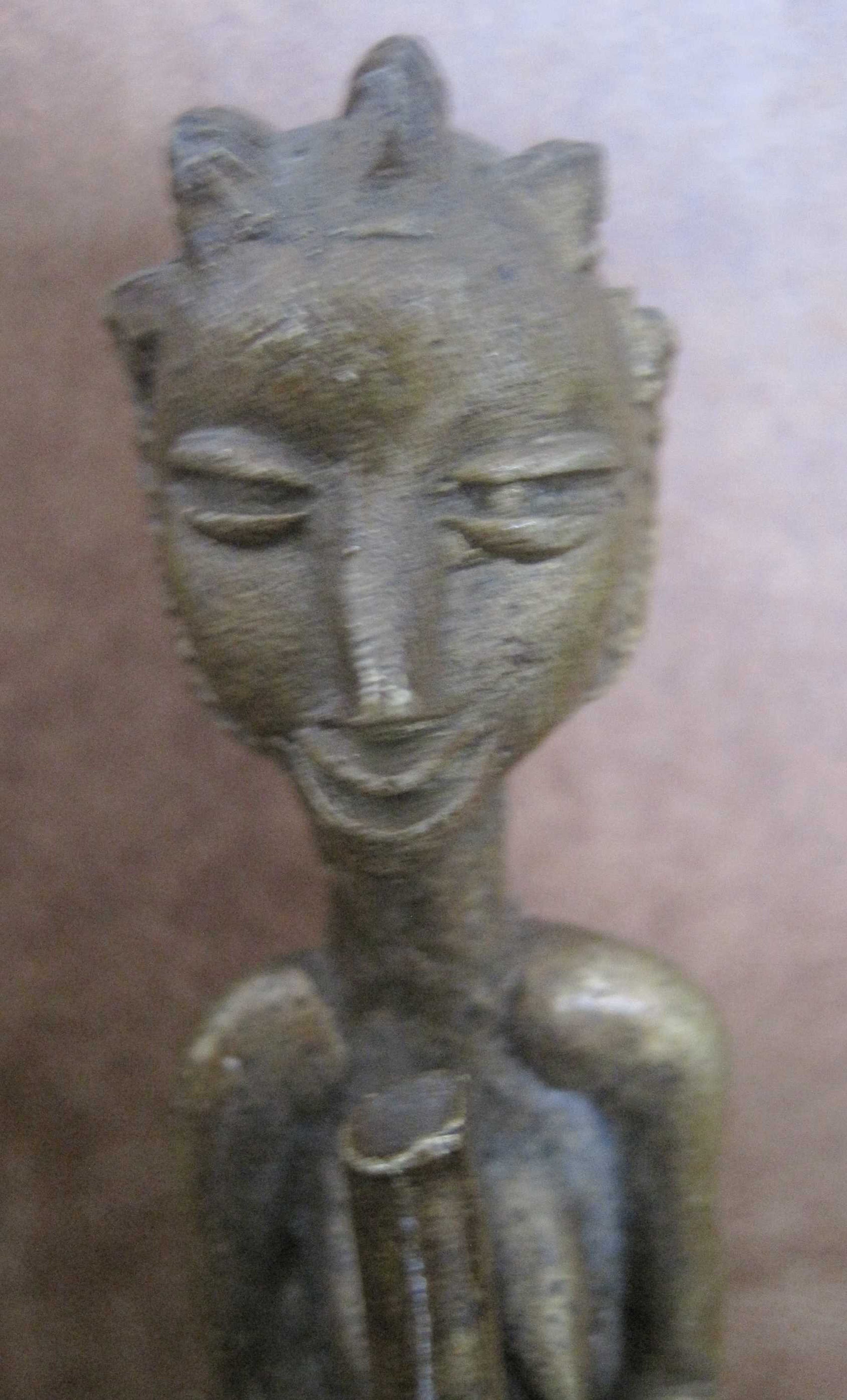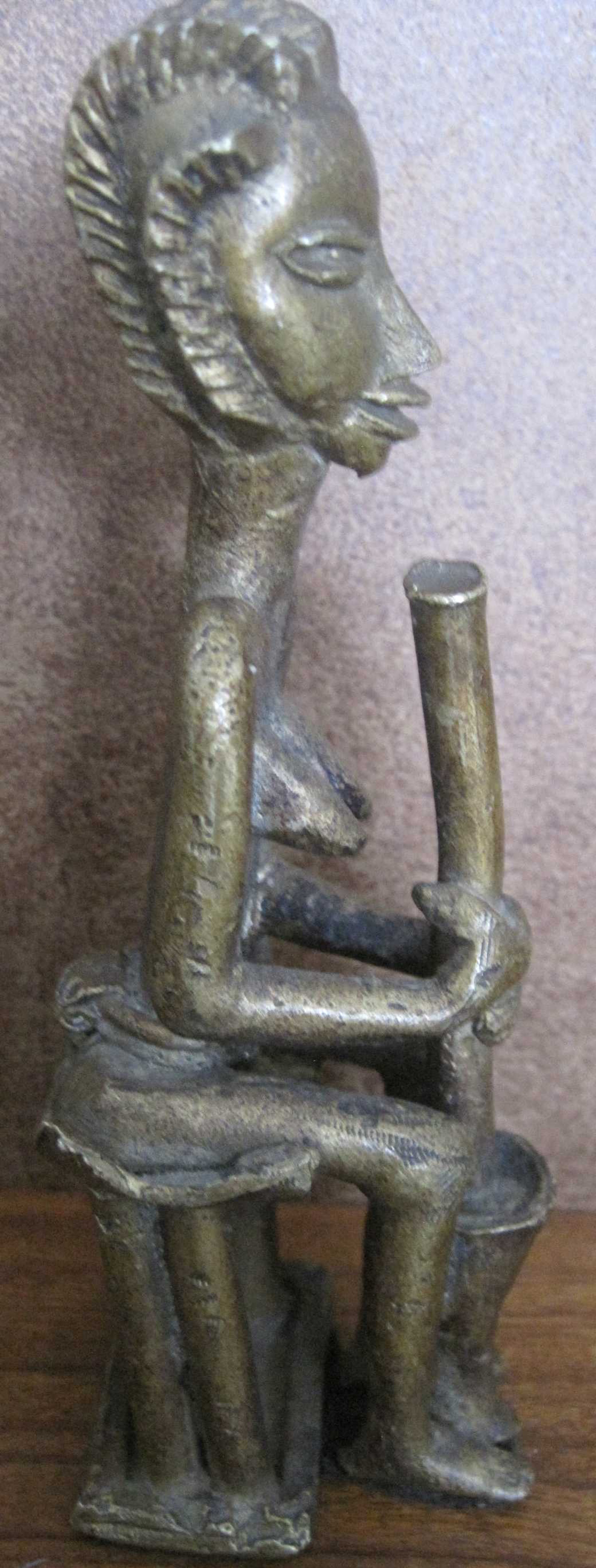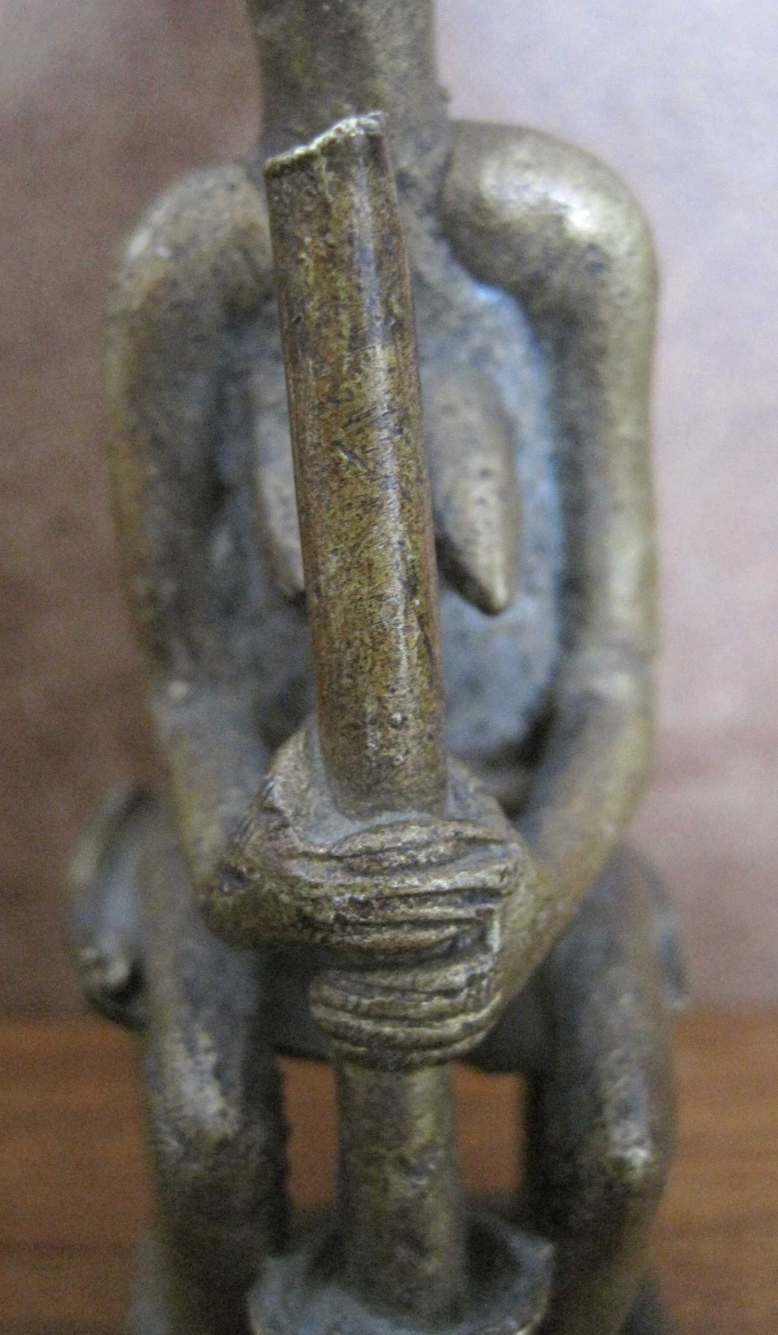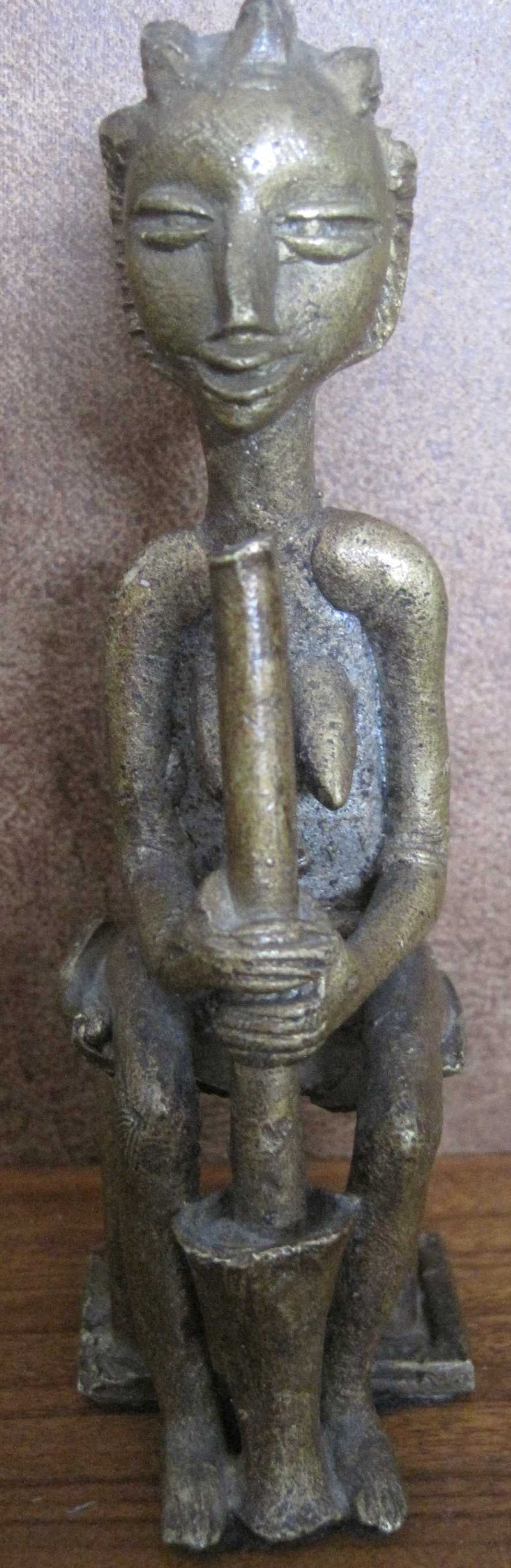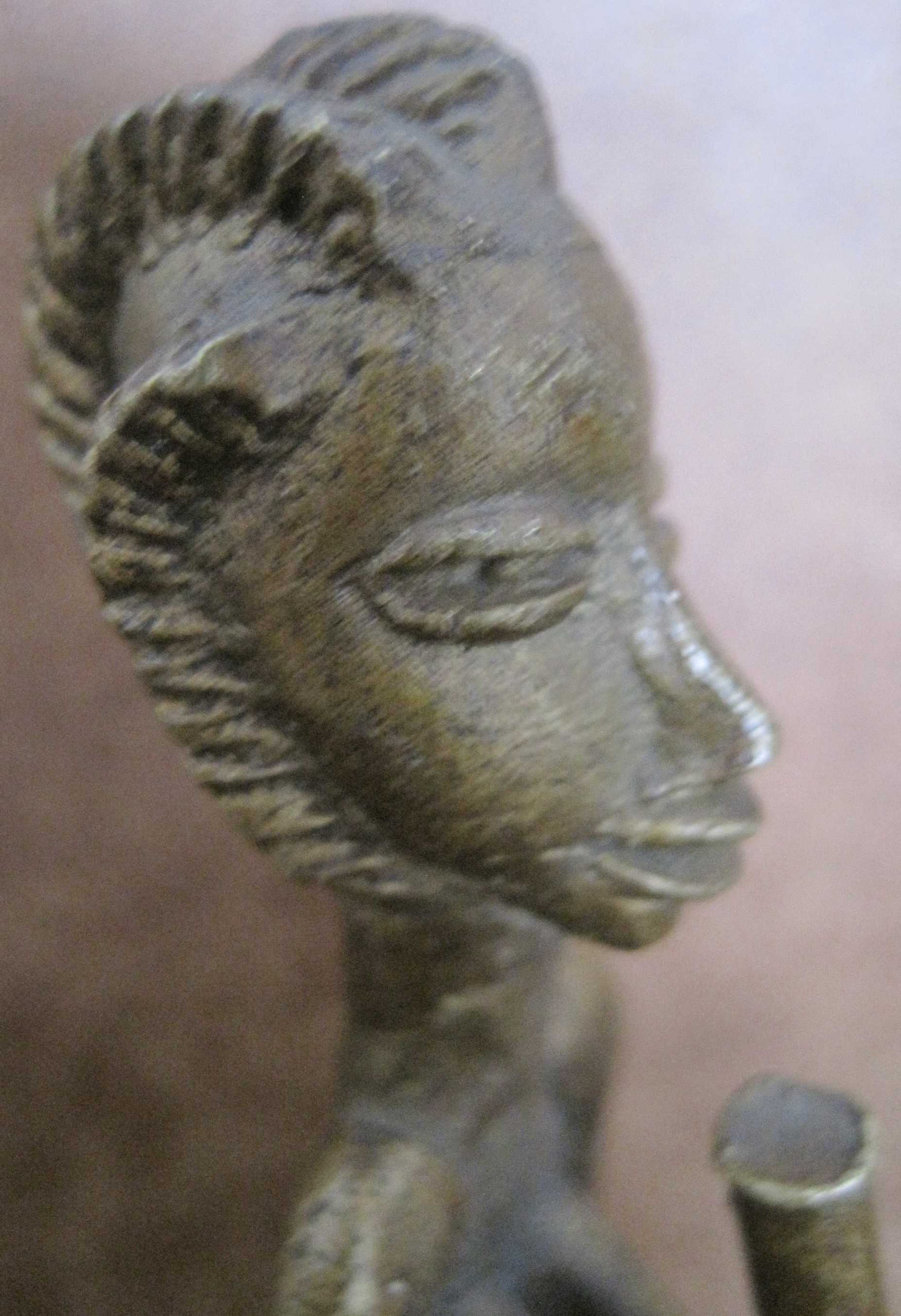 Een heel fraai bronzen beeldje welke diende als goudgewicht bij het Akan volk woonachtig in Ghana en Ivoorkust.Dit goudgewicht is gemaakt door een heel bekwame goudsmid die deze beeldjes in opdracht maakte.In tegenstelling tot de meeste goudgewichten is dit beeldje heel secuur gemodelleerd en afgwerkt, met mooie details zoals de haardracht.