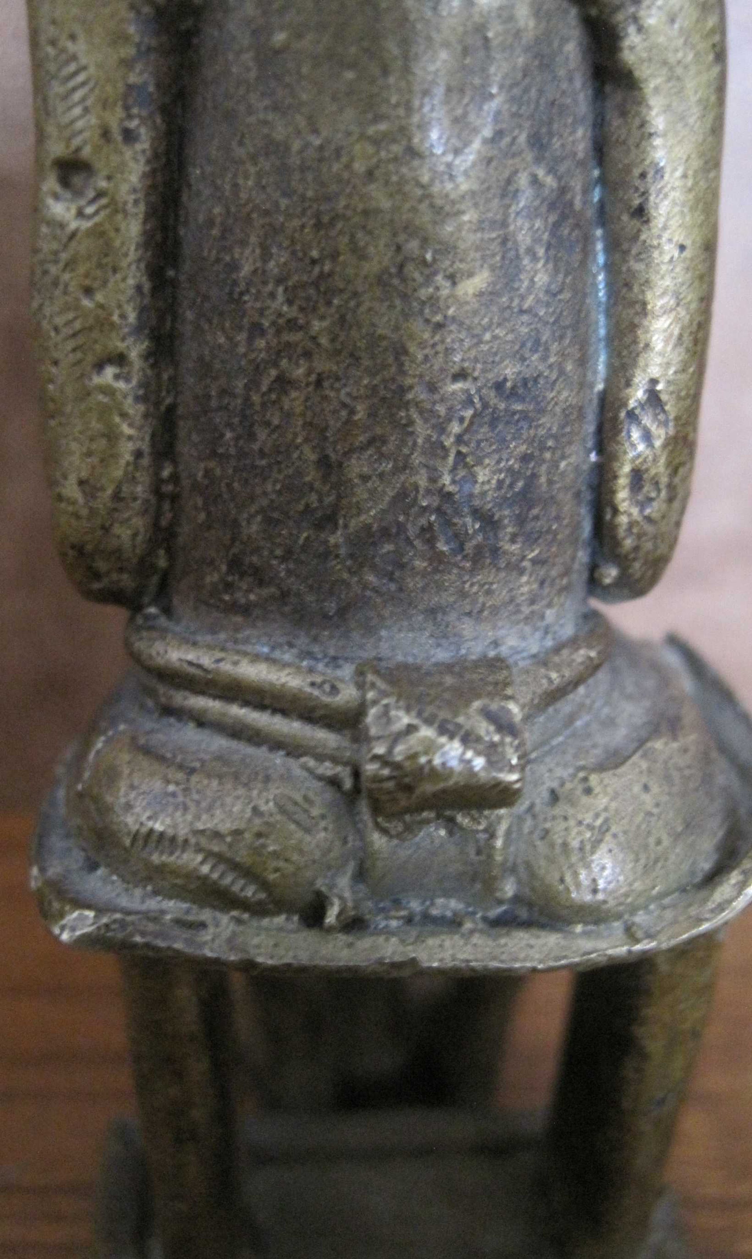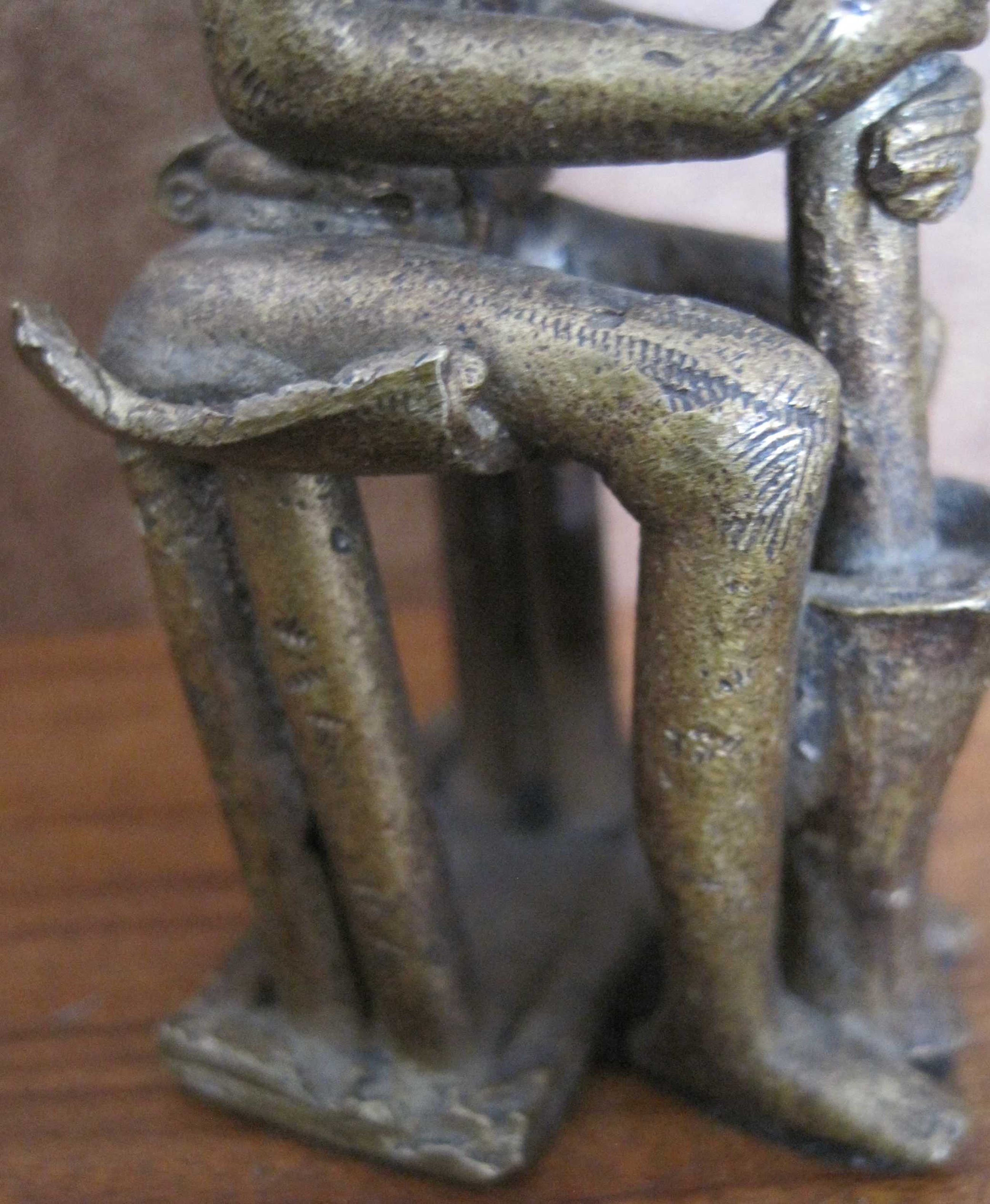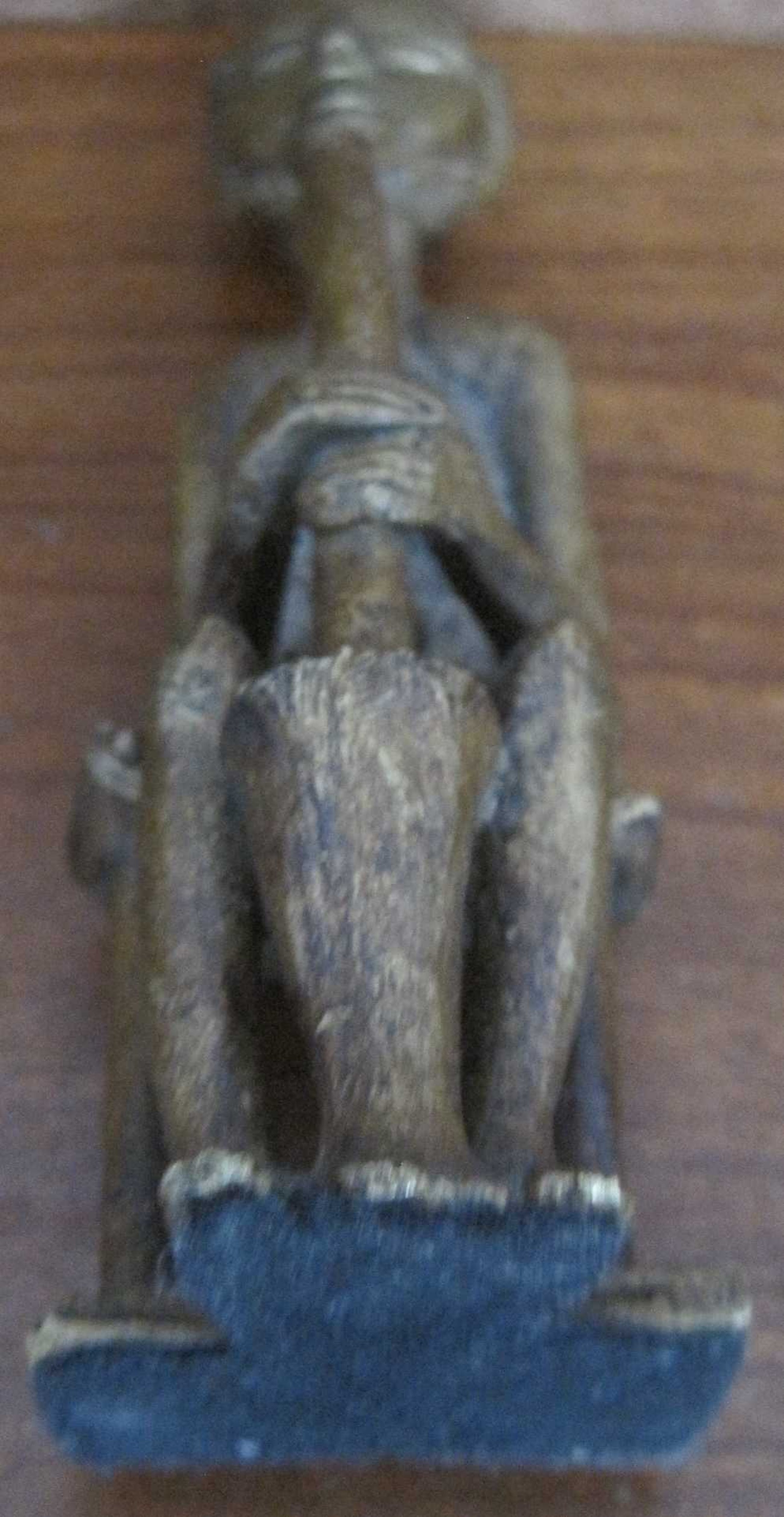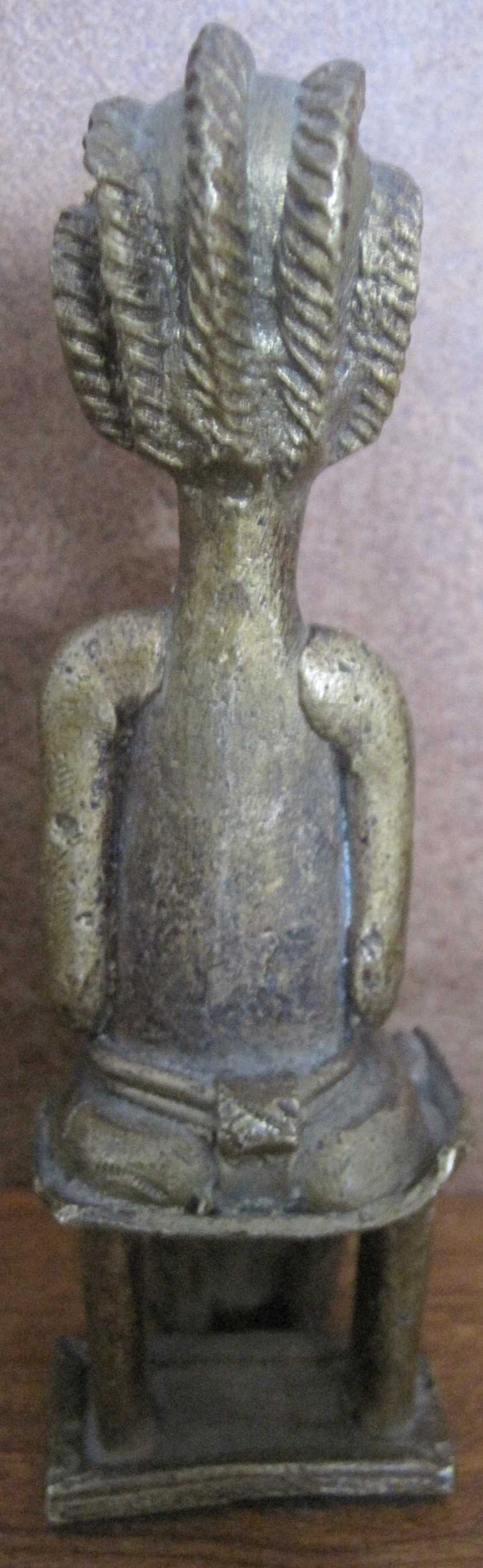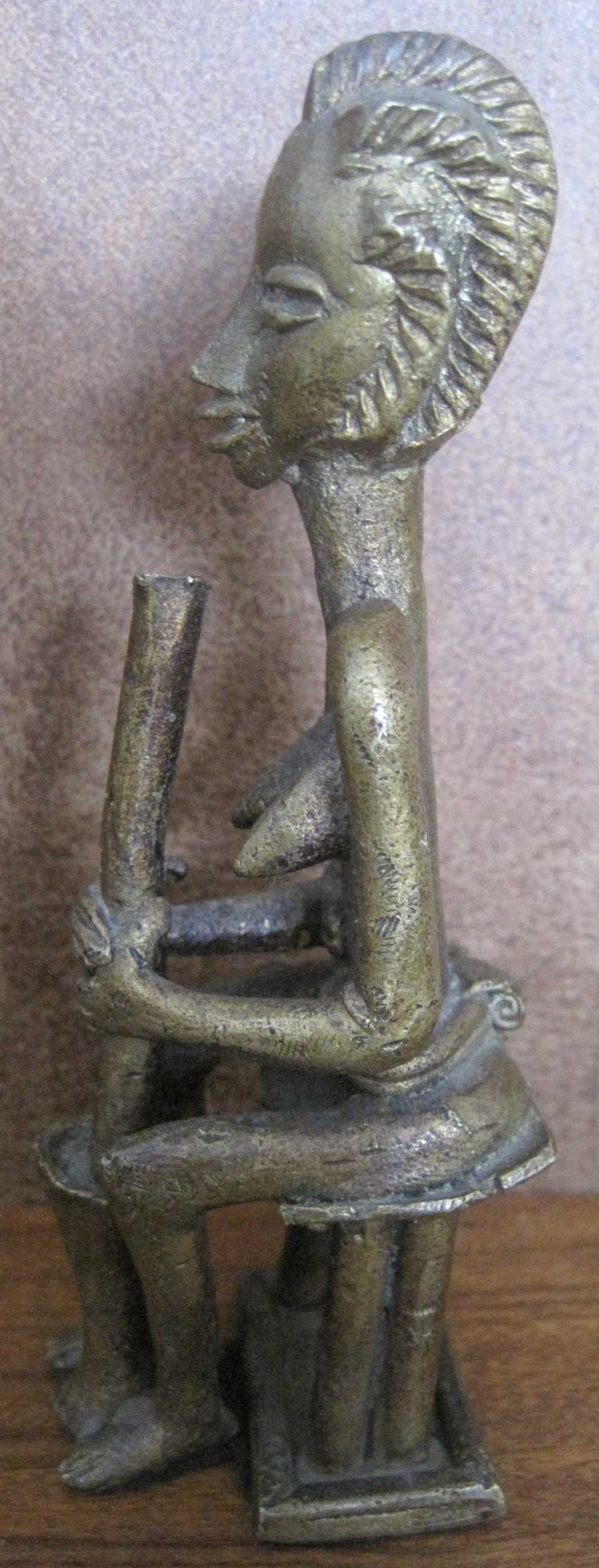 Een heel fraai bronzen beeldje welke diende als goudgewicht bij het Akan volk woonachtig in Ghana en Ivoorkust.Dit goudgewicht is gemaakt door een heel bekwame goudsmid die deze beeldjes in opdracht maakte.In tegenstelling tot de meeste goudgewichten is dit beeldje heel secuur gemodelleerd en afgwerkt, met mooie details zoals de haardracht.