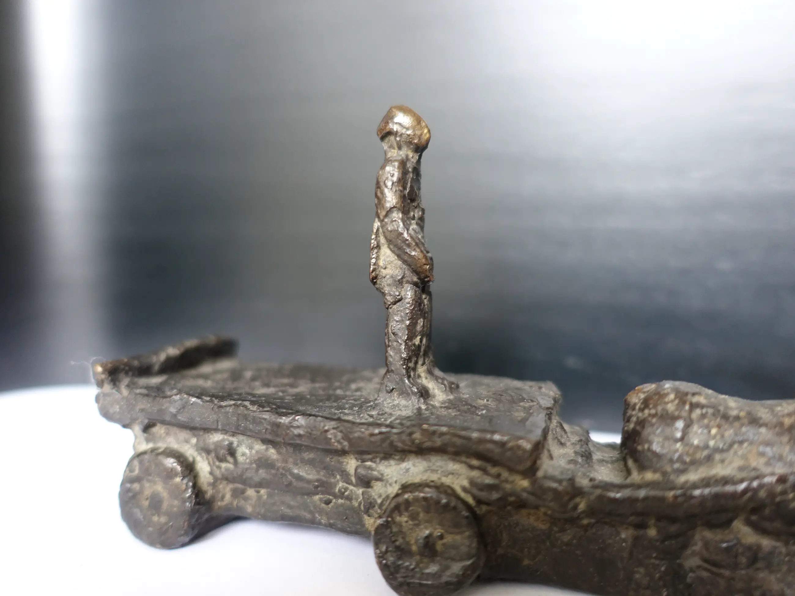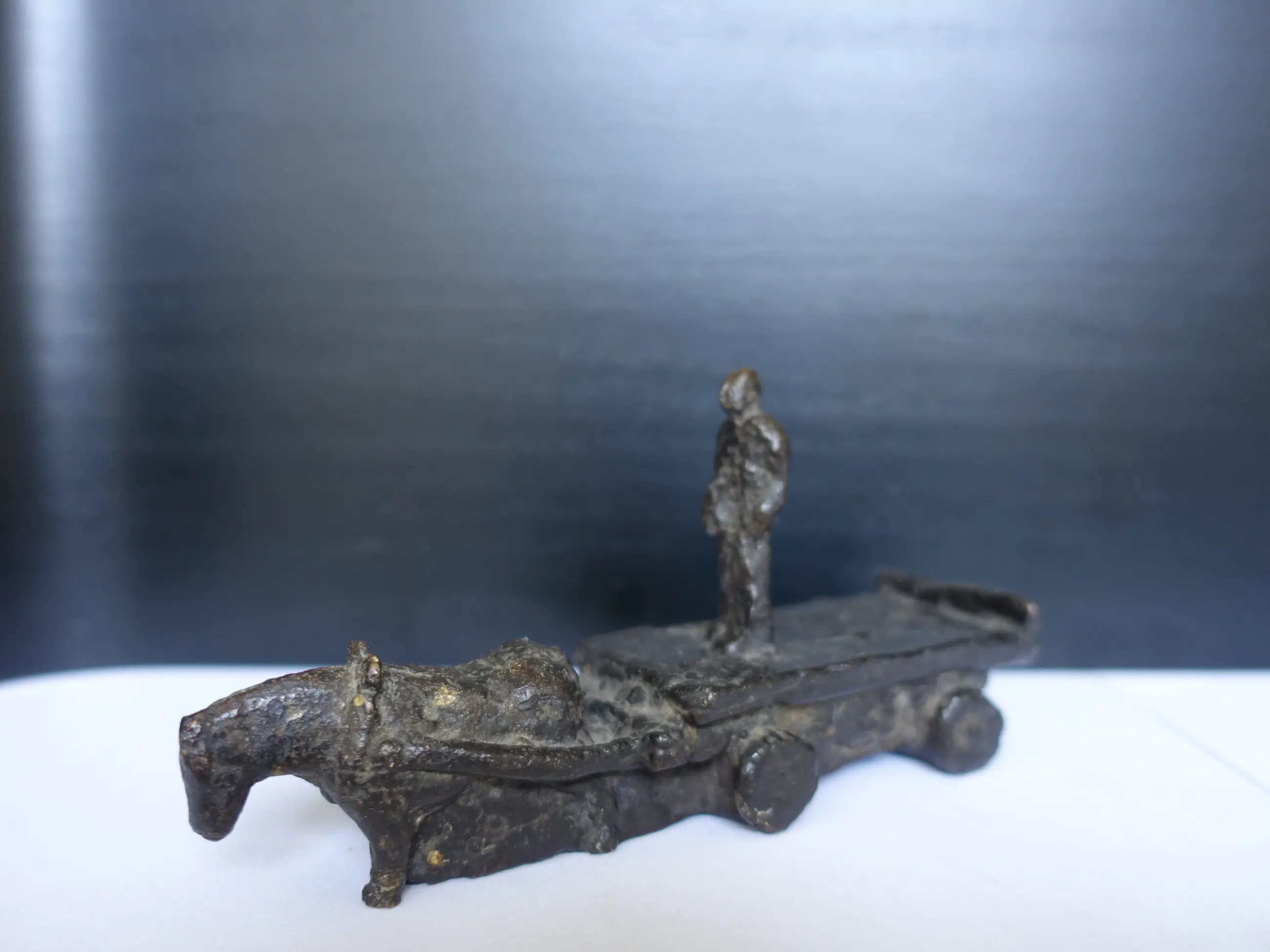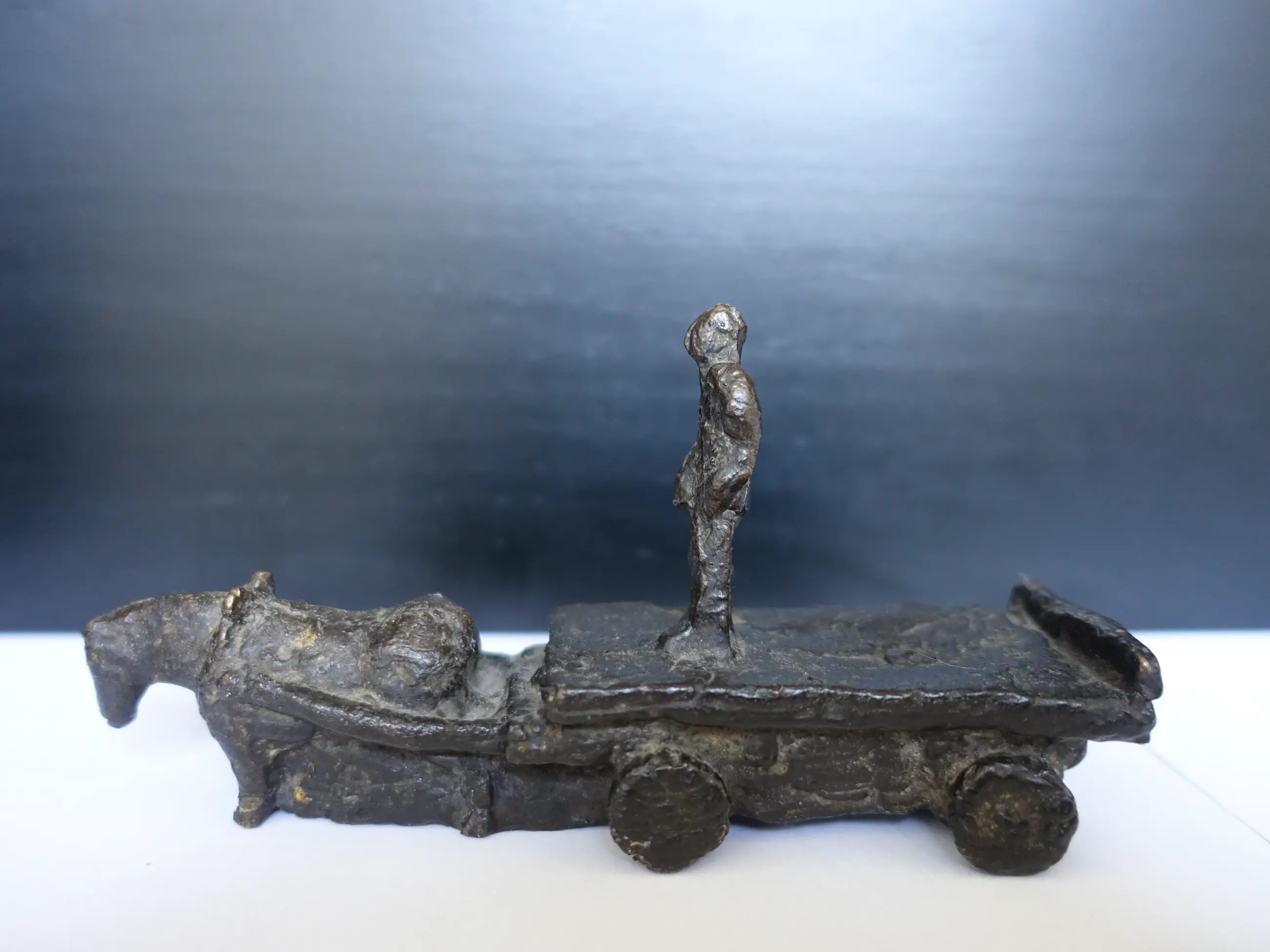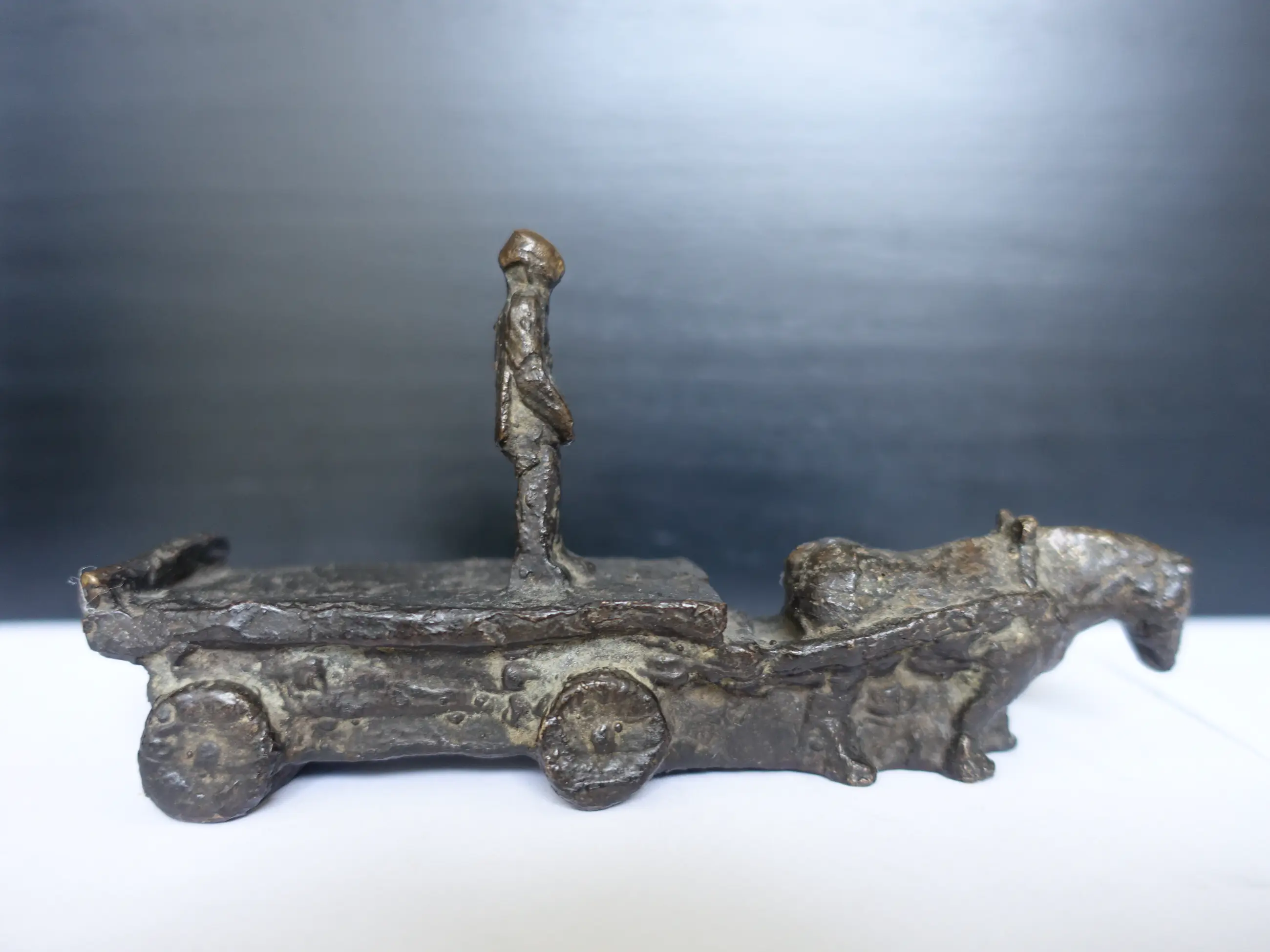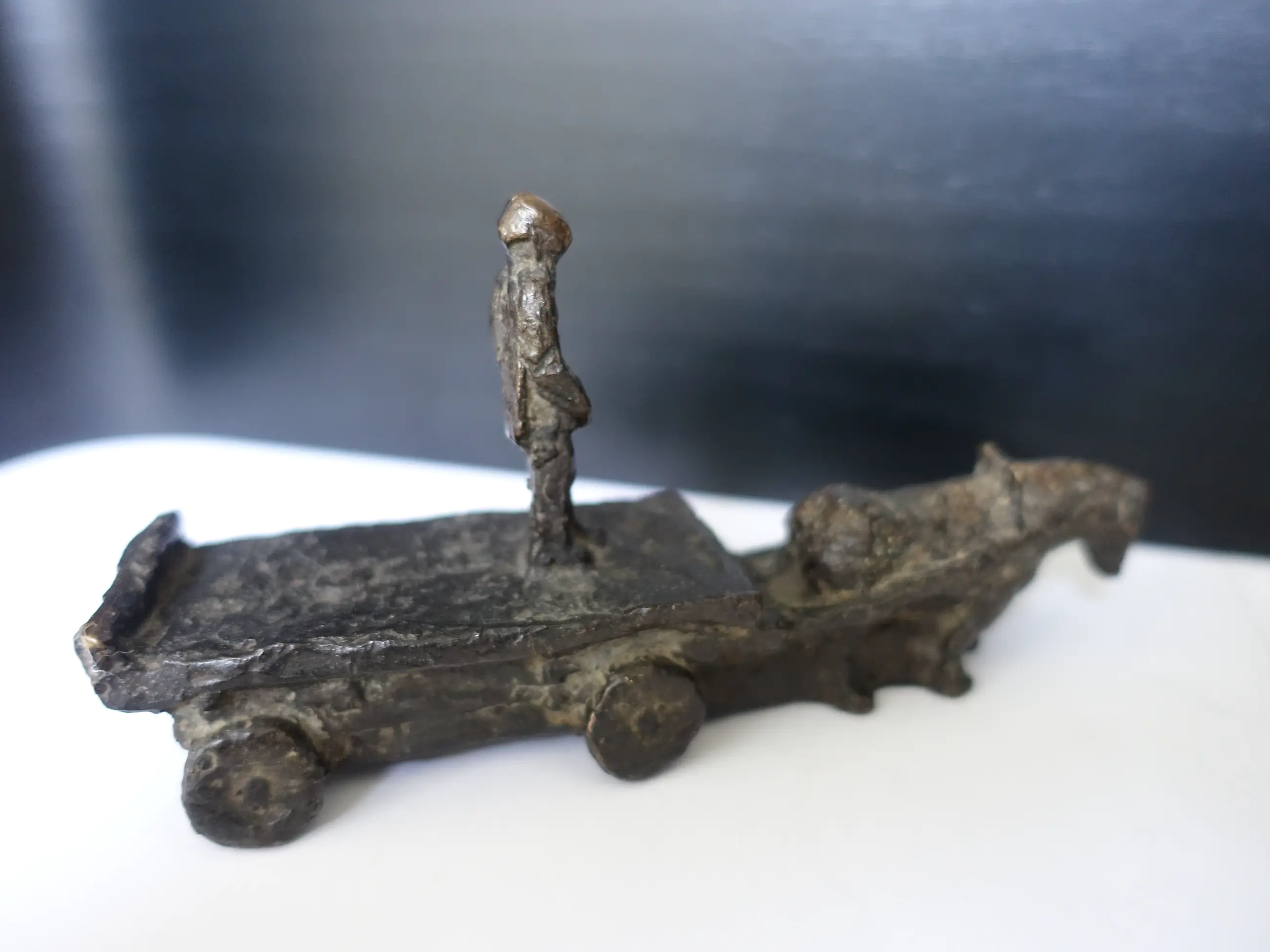 Zeer fraai bronzen beeldje van boerenknecht op platte kar voortgetrokken door een paard. Het heeft iets van de stijl van Gerard Brouwer, ik weet echter niet wie de maker is.