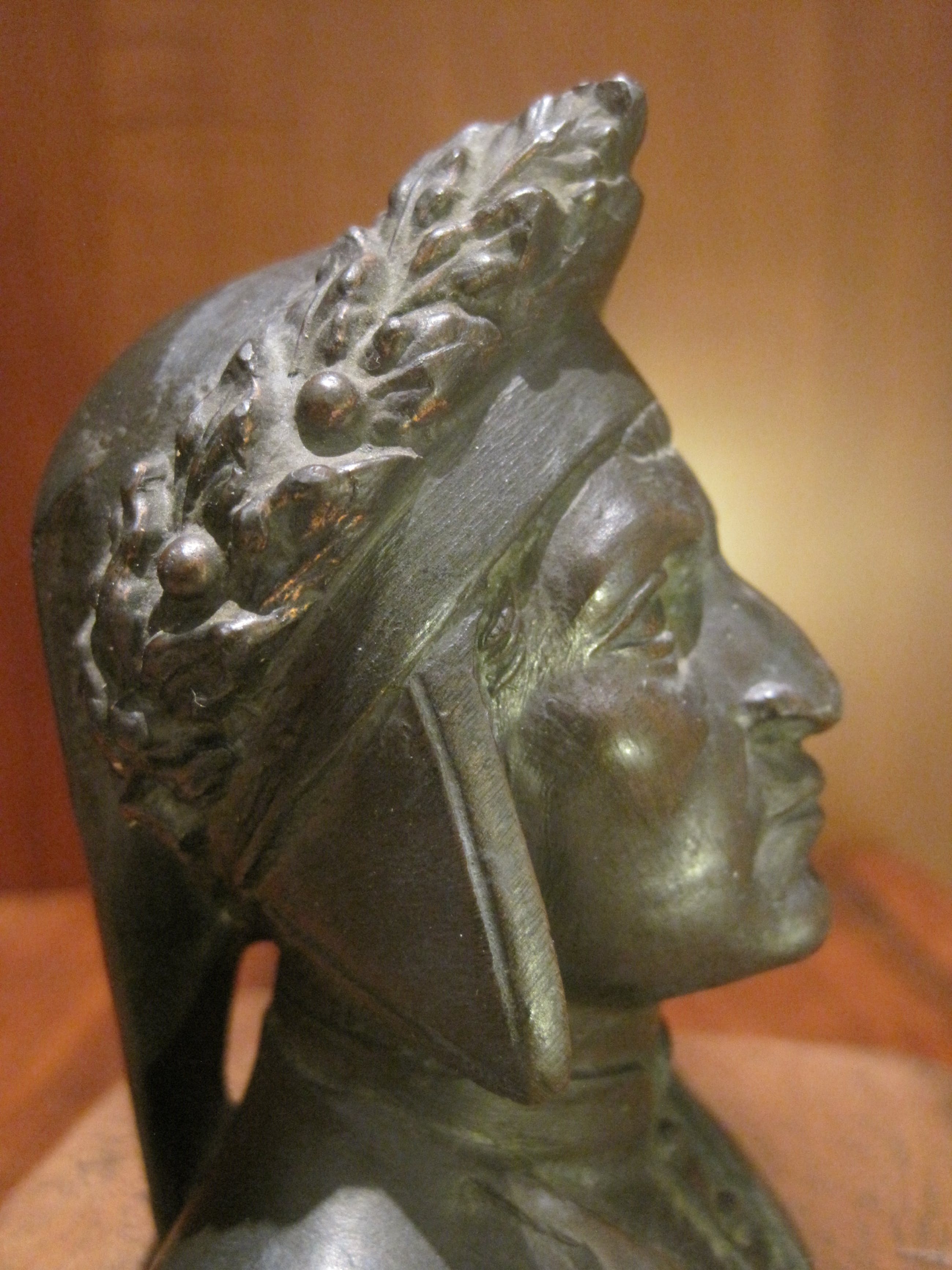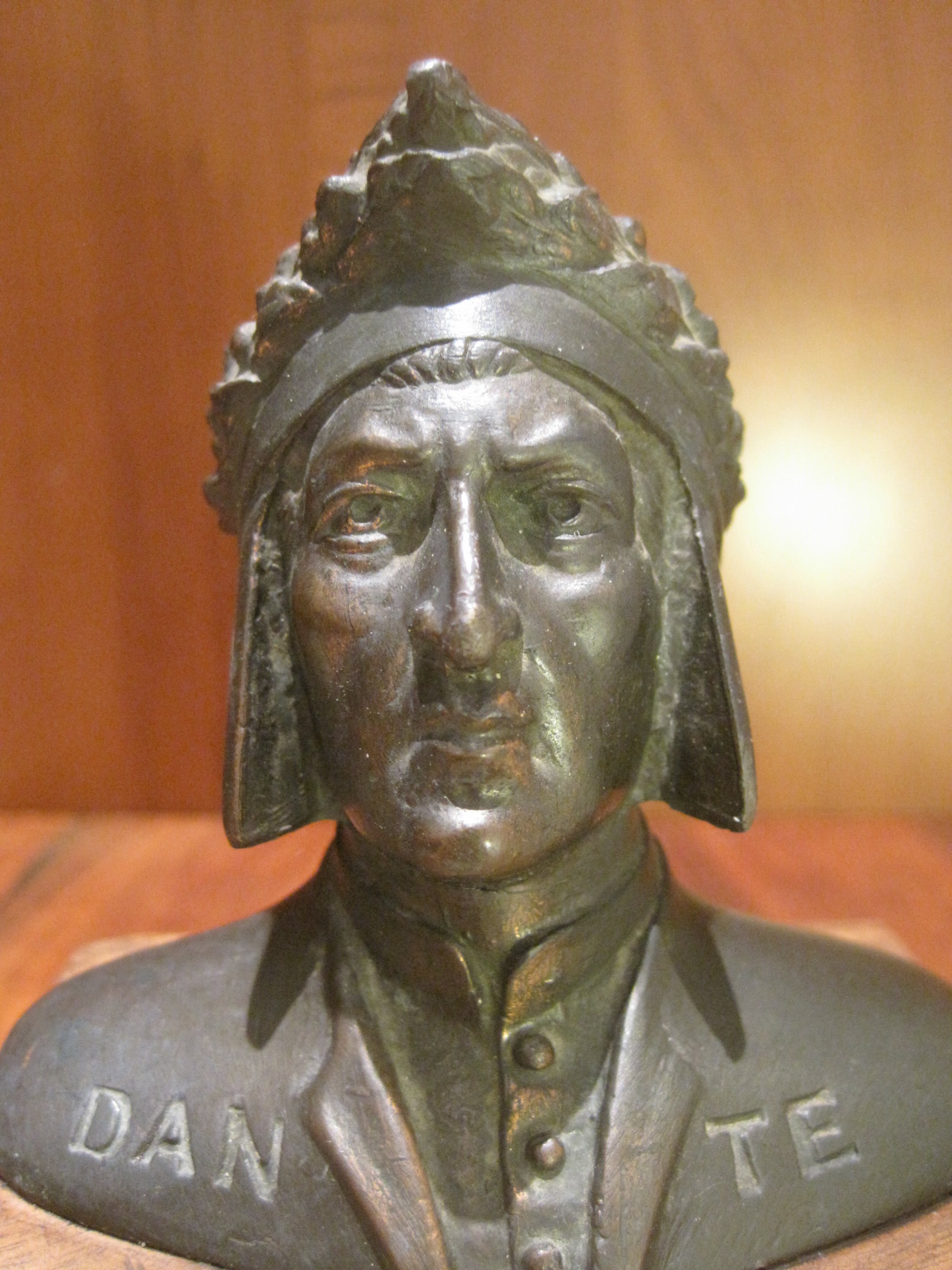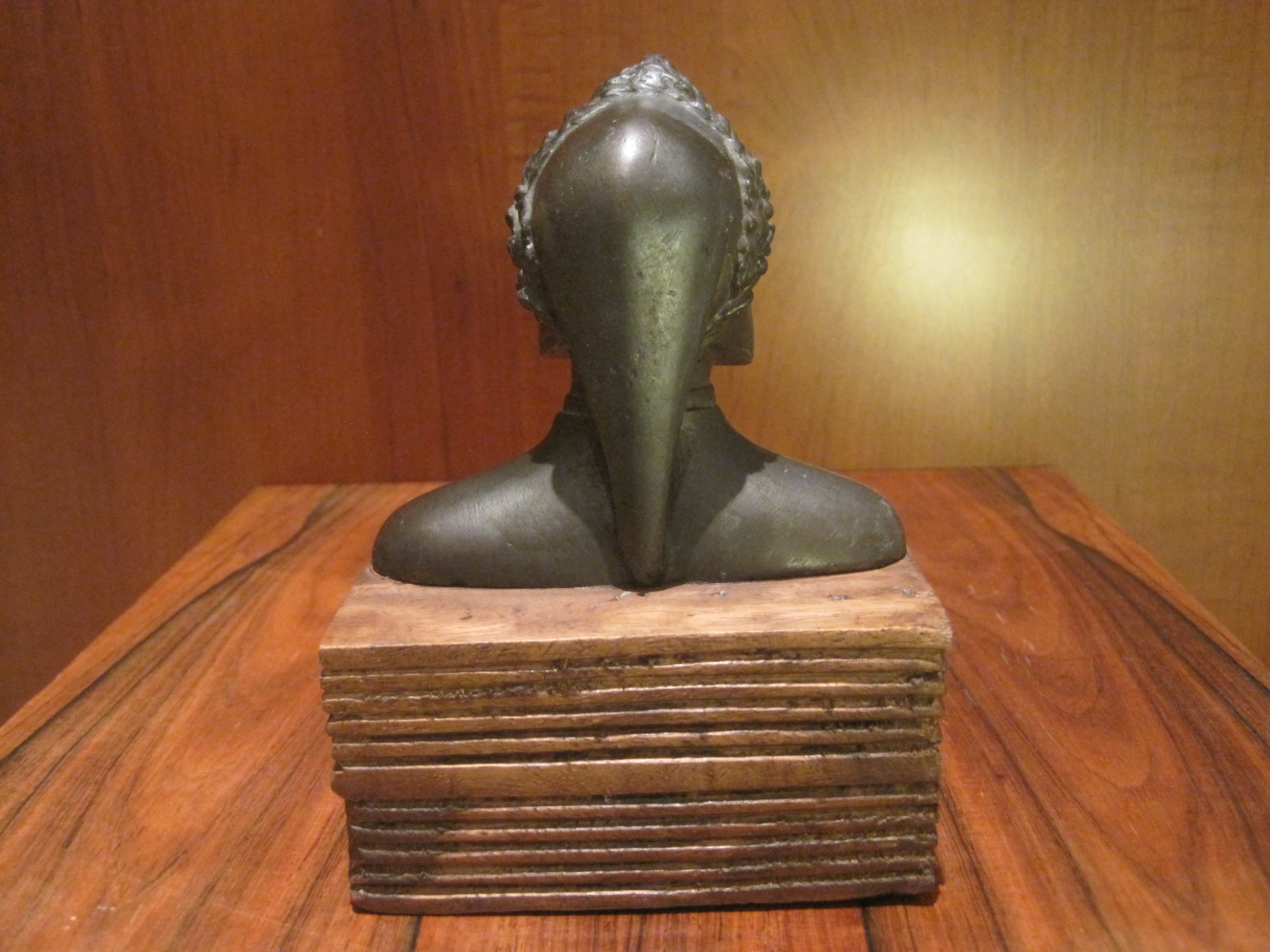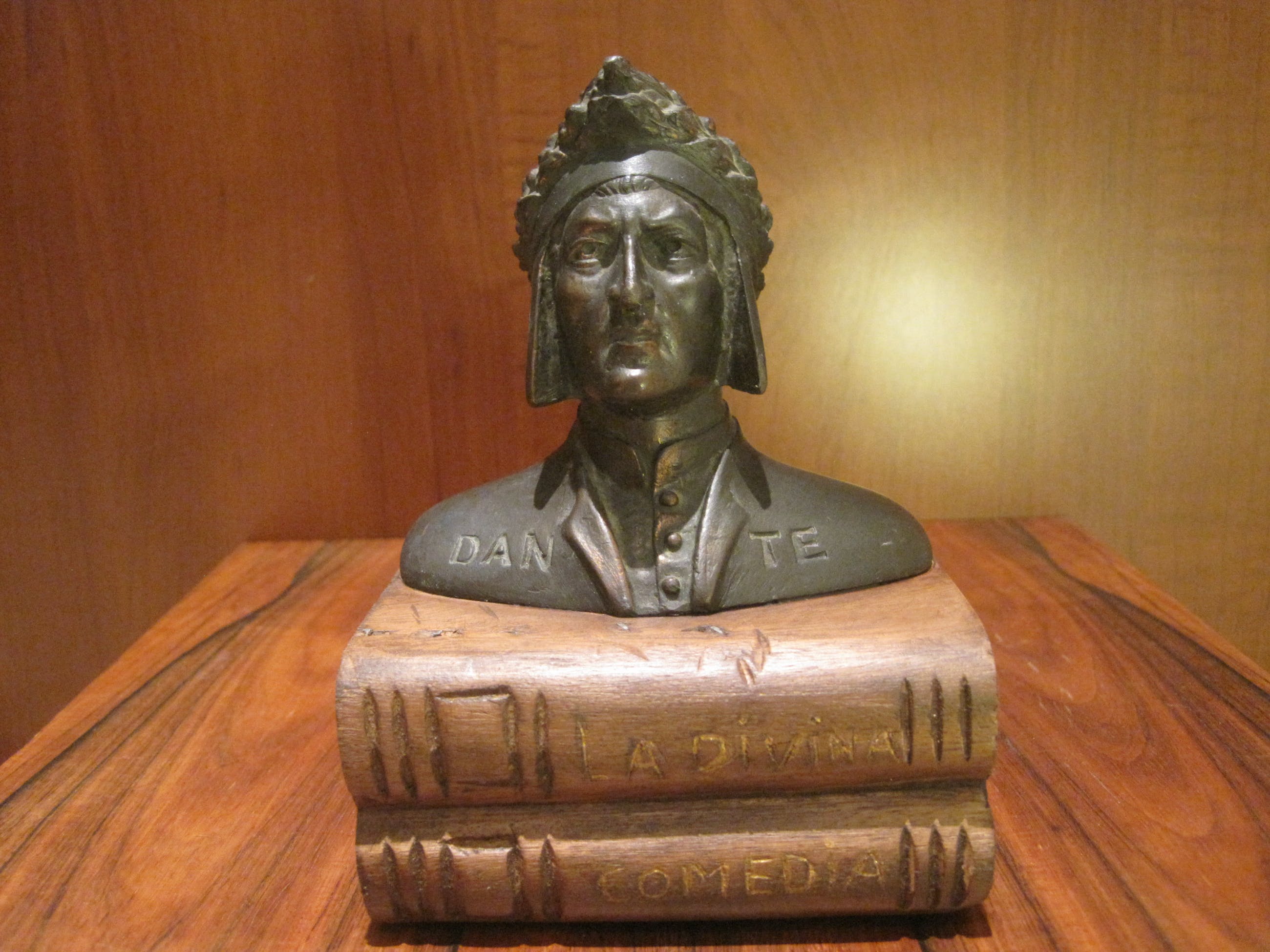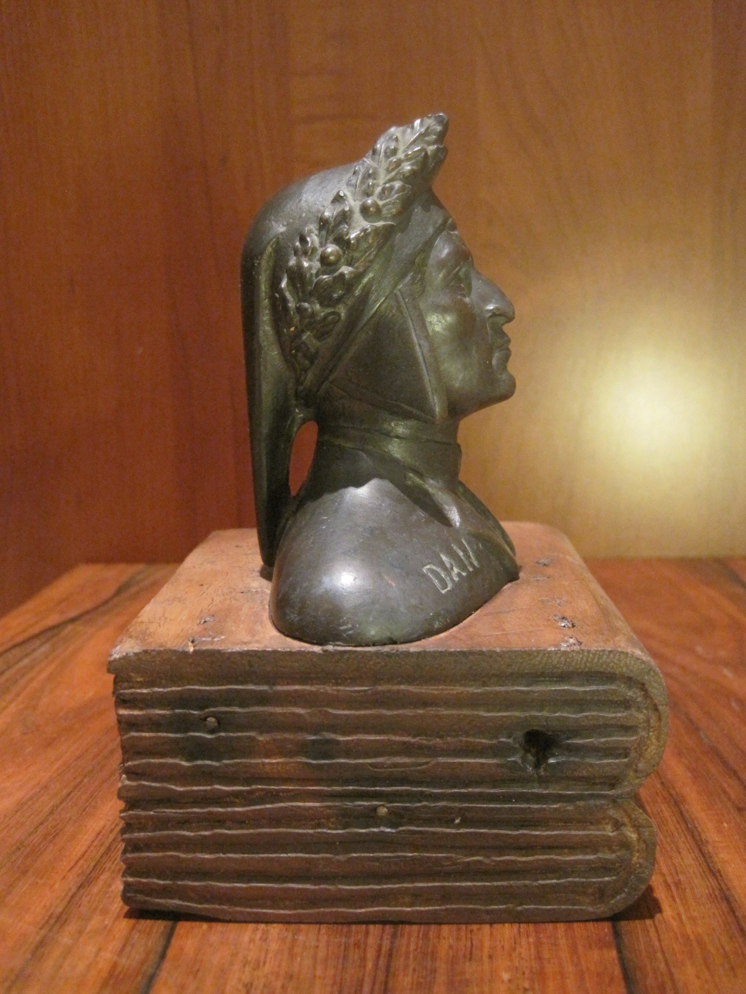 Bijzonder mooi en gedetailleerde bronzen buste van Dante Alighieri. Het beeldje is gemonteerd op een houten sokkel in de vorm van twee boeken. Op de rug van de boeken staat " La Divina Comedia". De buste zelf meet 9 cm hoog, 10 cm breed en 6 cm diep. Een heel decoratief geheel.