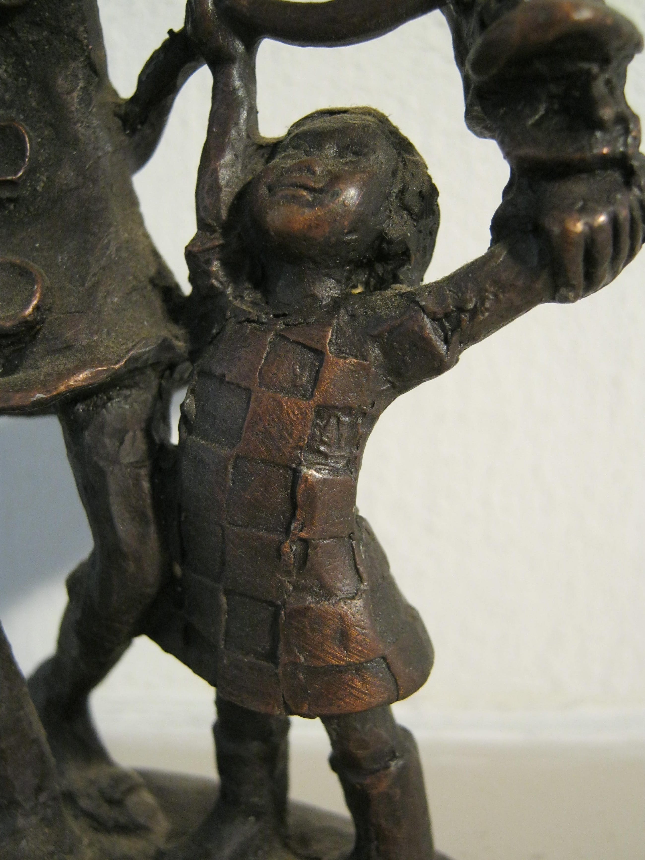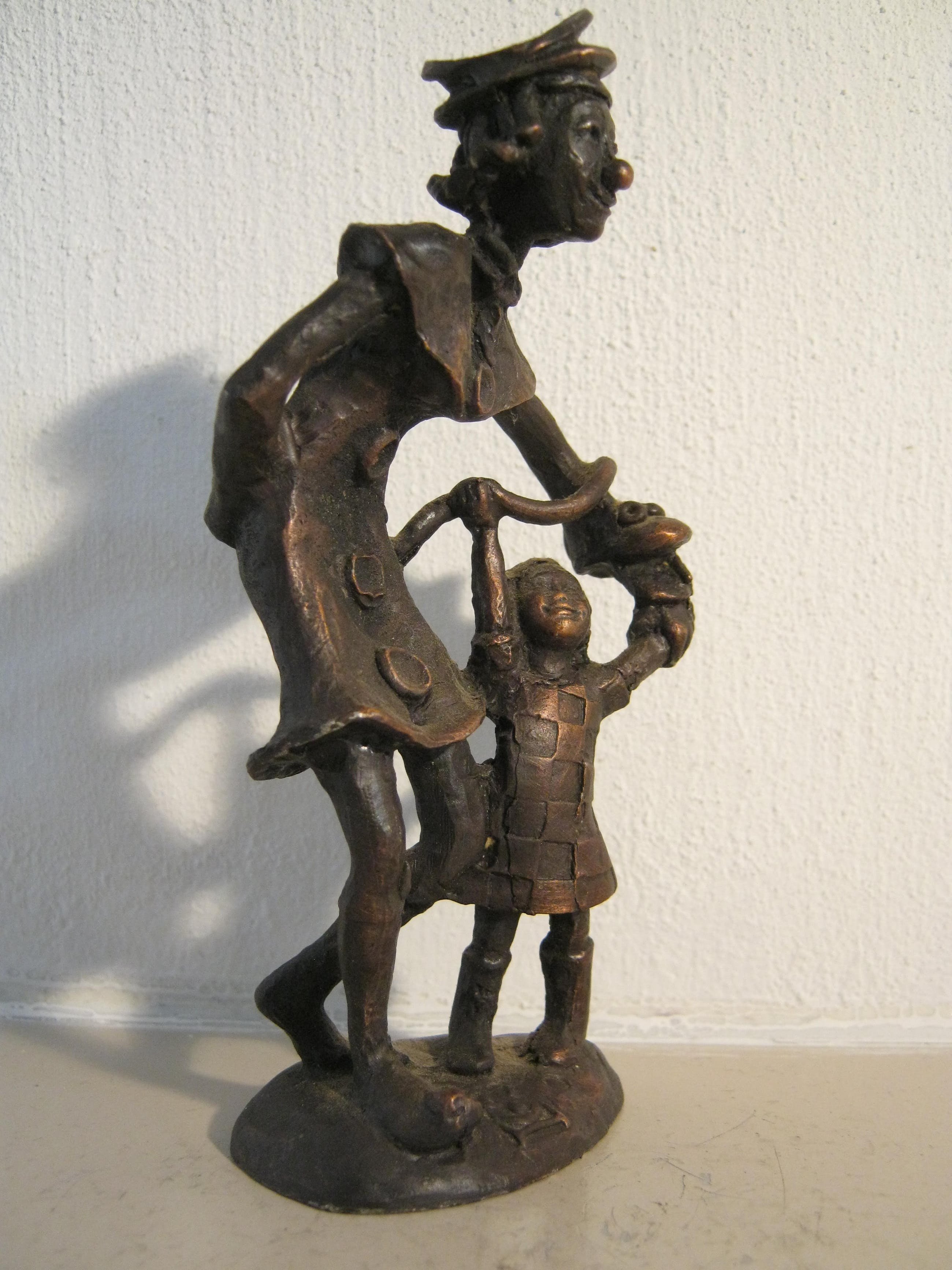 Vrolijk sculptuur van een clown met kind, in opdracht vervaardigd voor "De CliniClowns" door de Brigitte van den Houdt.