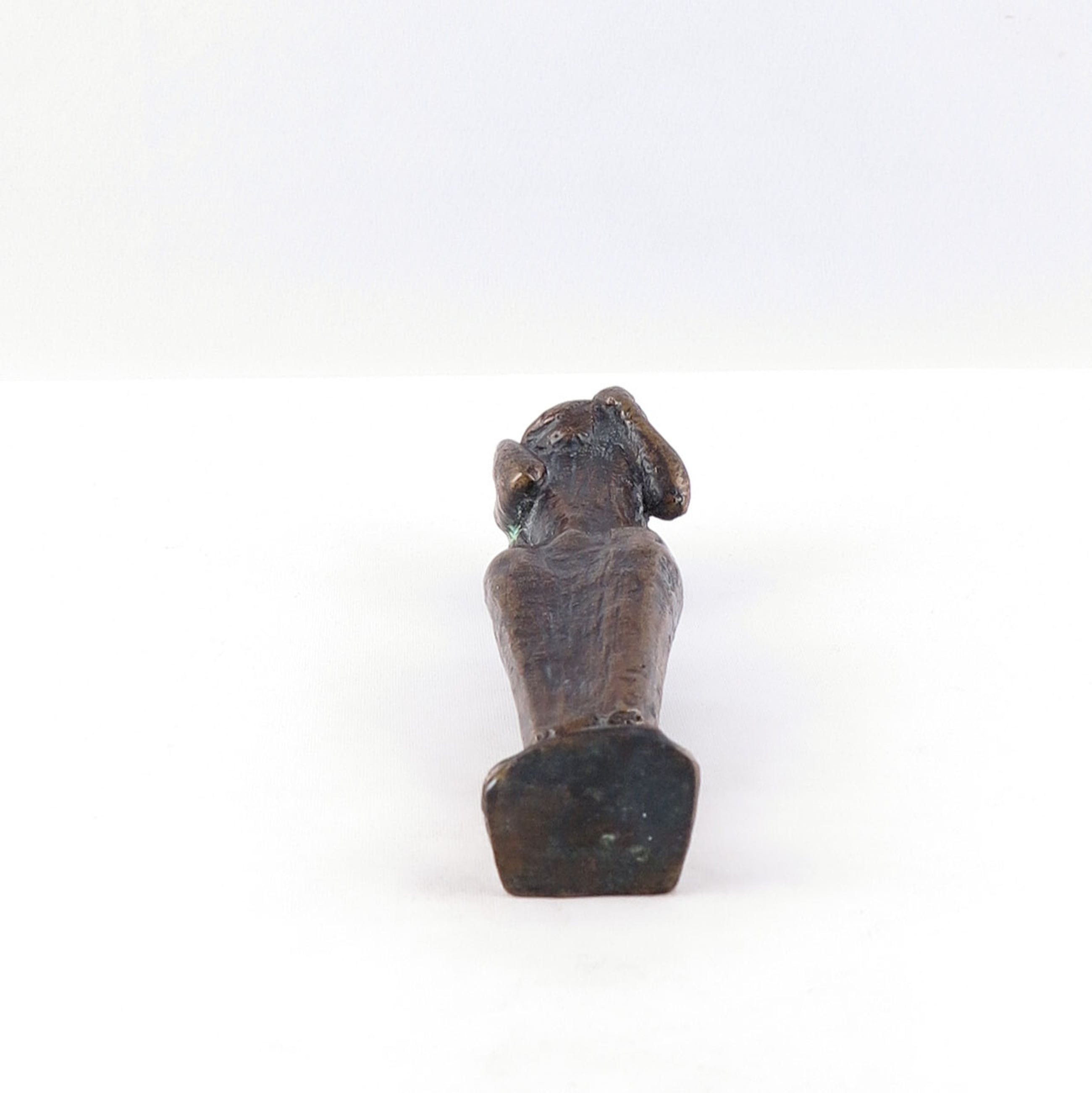 Het beeldje staat een beetje wankel doordat hij naar voren helt.