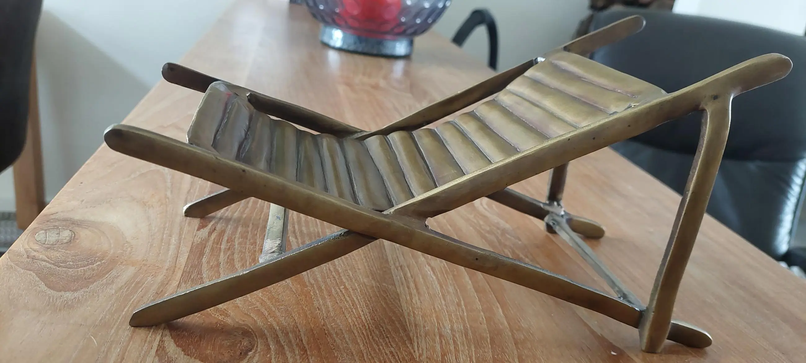 Bronzen beeldje; zittend meisje met boek, op strandstoel Mooie details