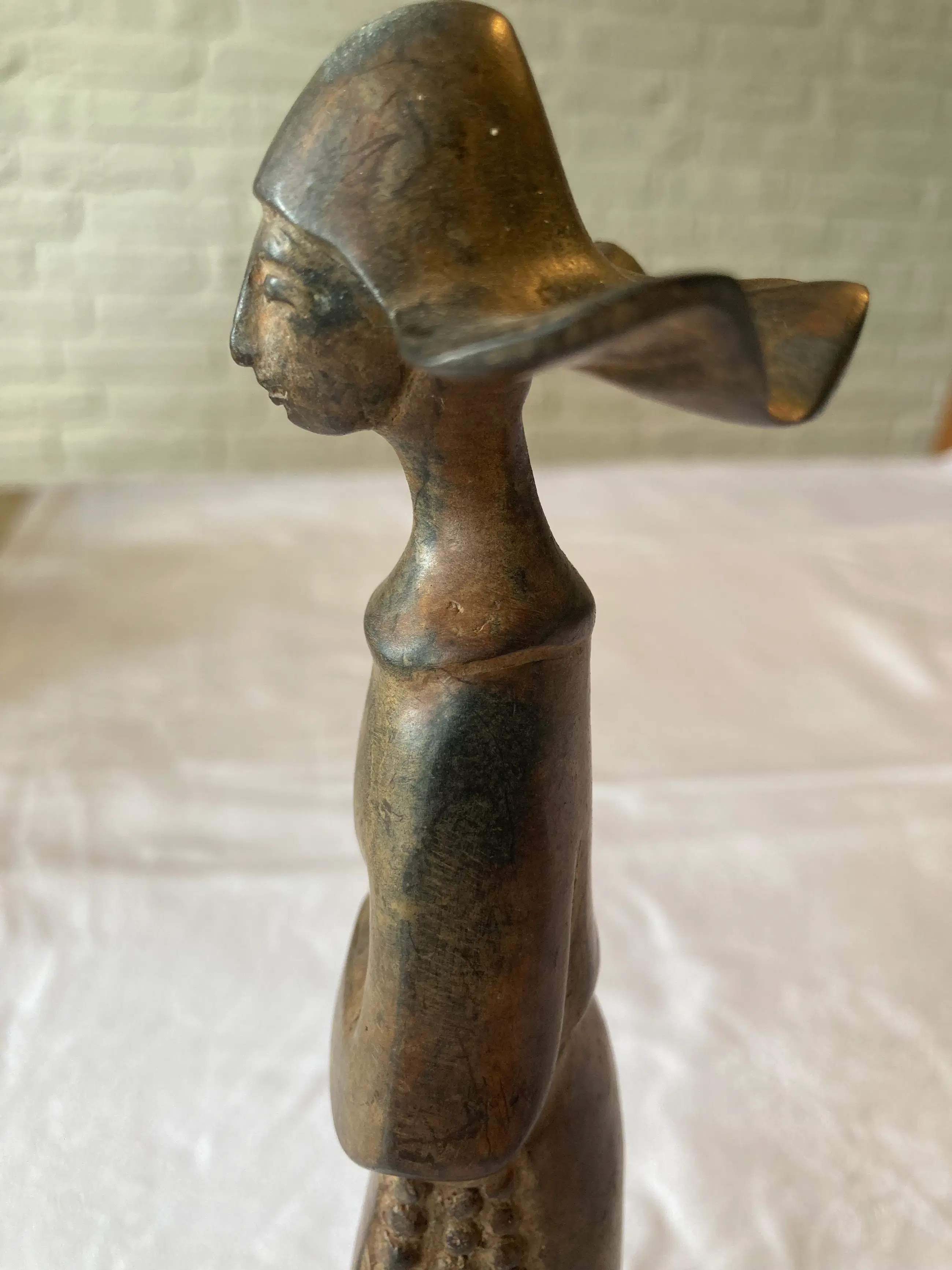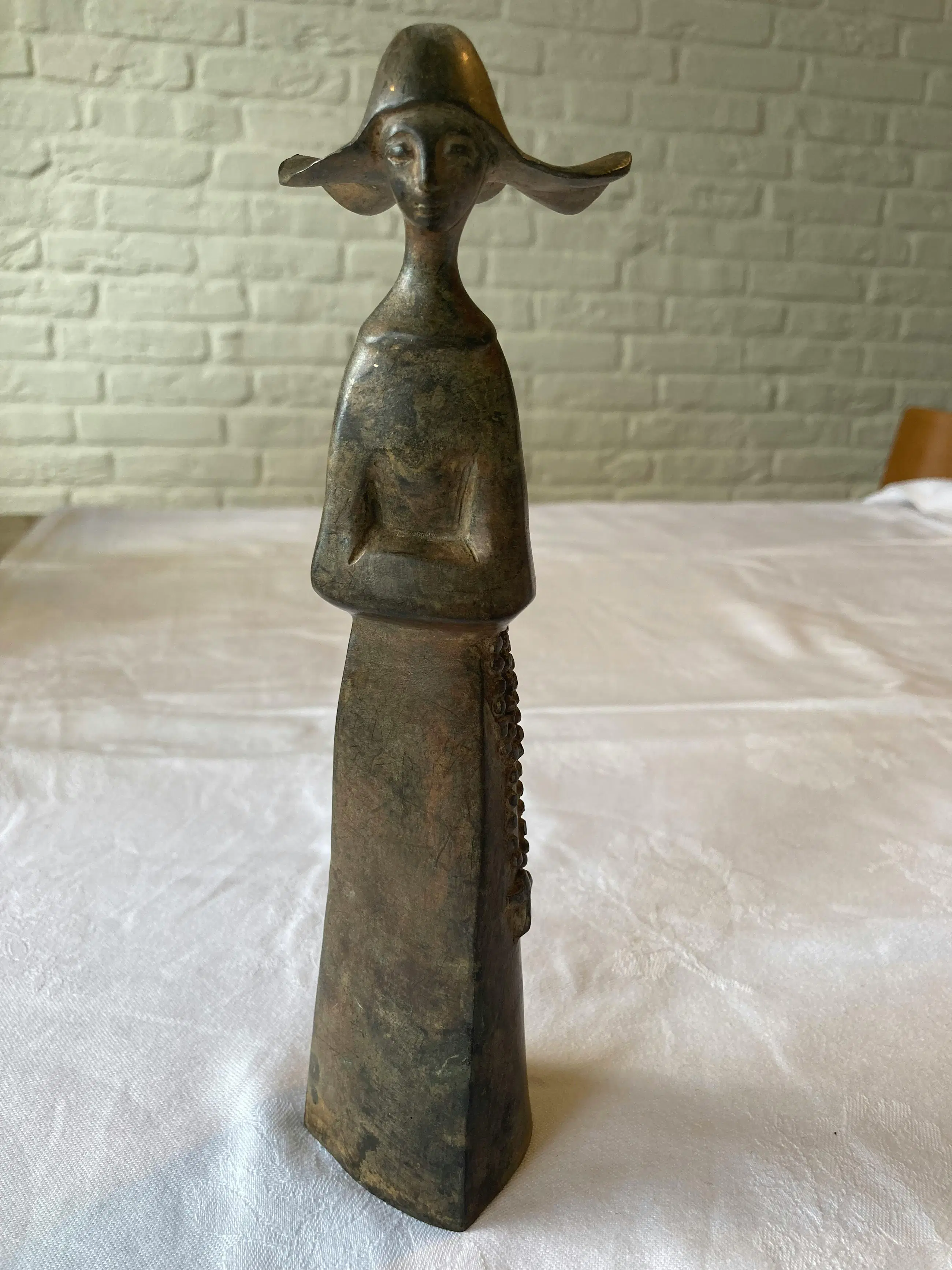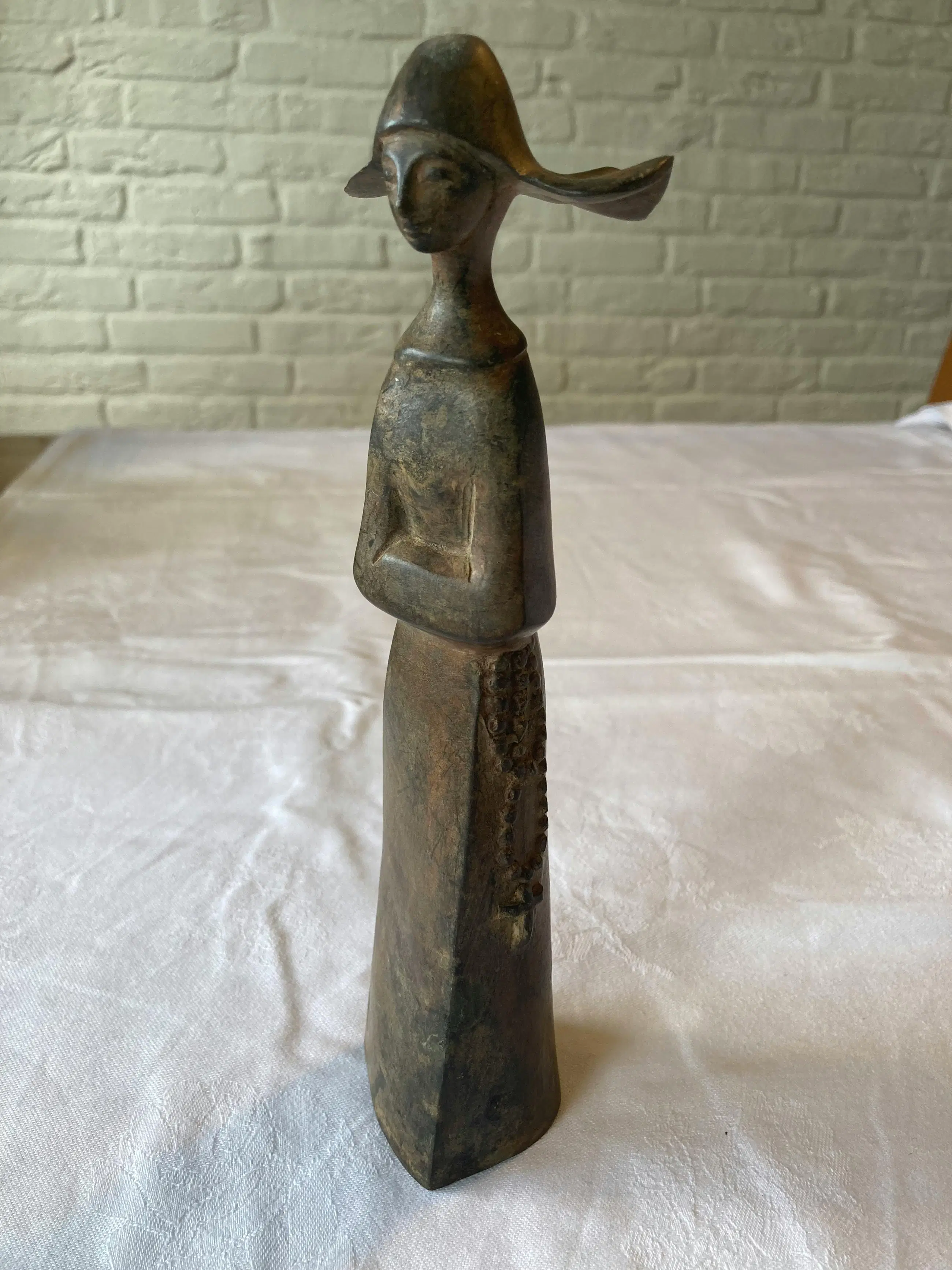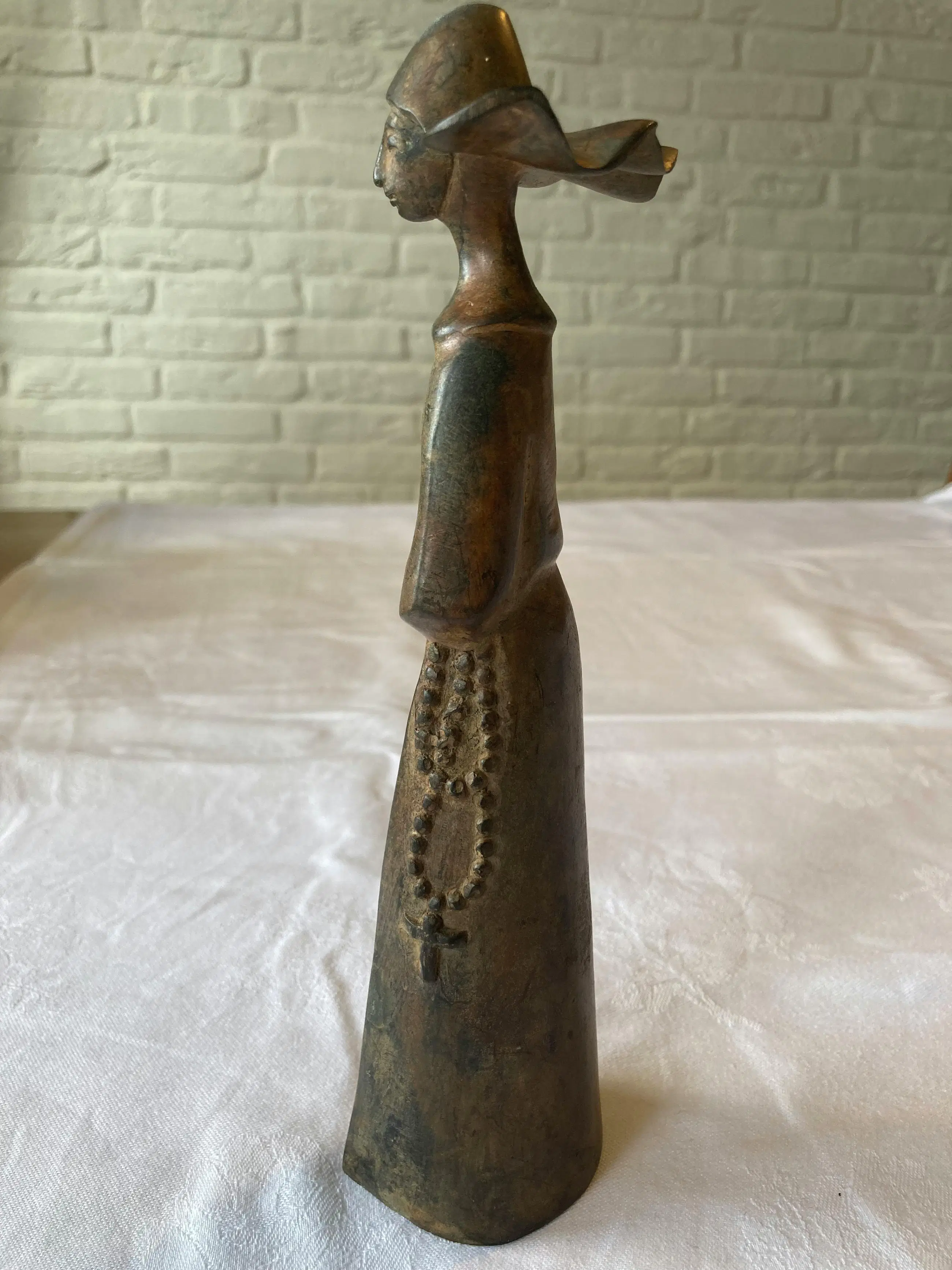 Bronzen beeld, prachtig gedetailleerd. Dit elegante nonnenbeeldje heeft een serene, minimalistische vormgeving met sierlijke lijnen en een tijdloze uitstraling.
