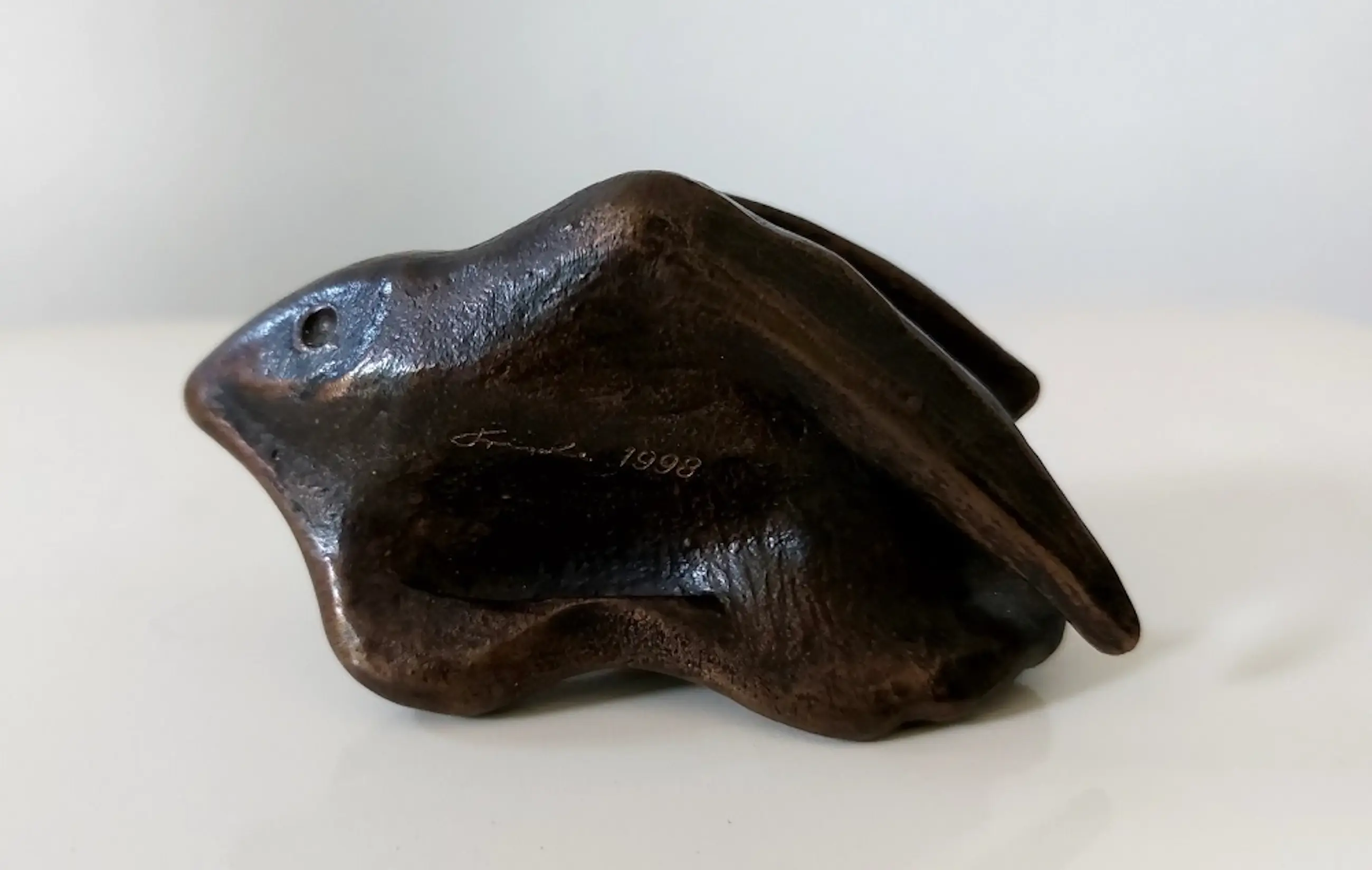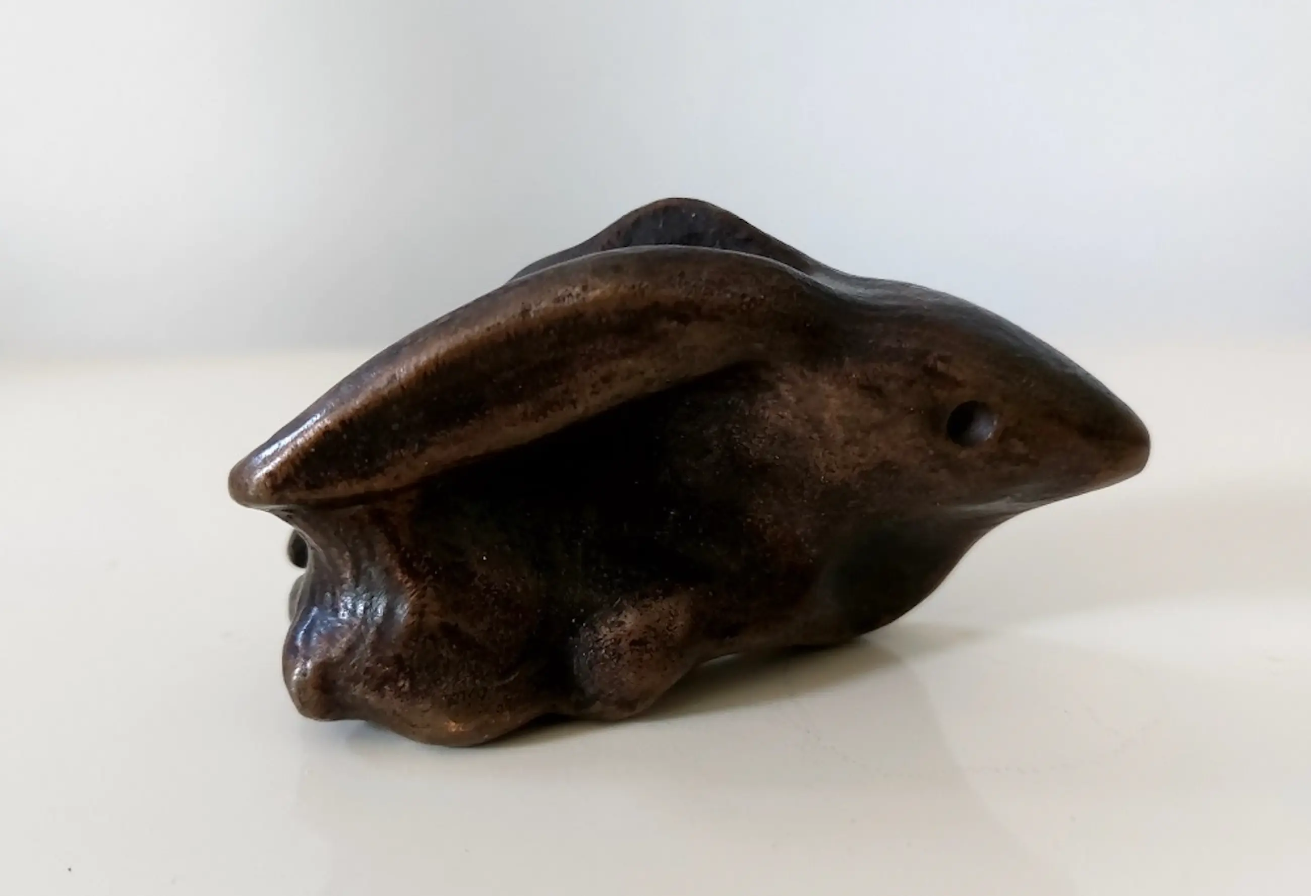 Fraai gegoten beeldje van een haas, (voor mij onleesbaar) gesigneerd en gedateerd 1998. Aan de onderzijde afgezet met een turquoise steentje.
