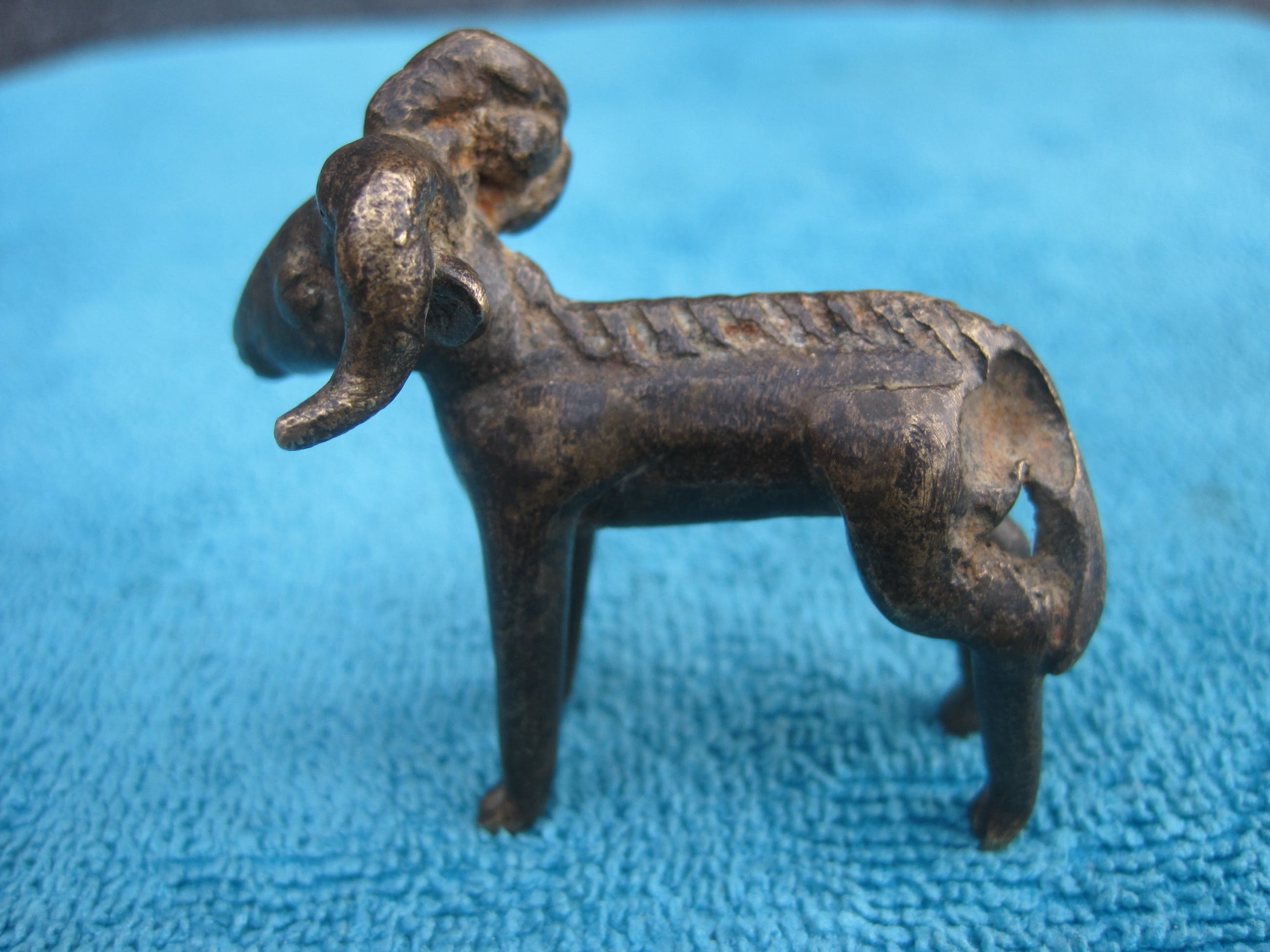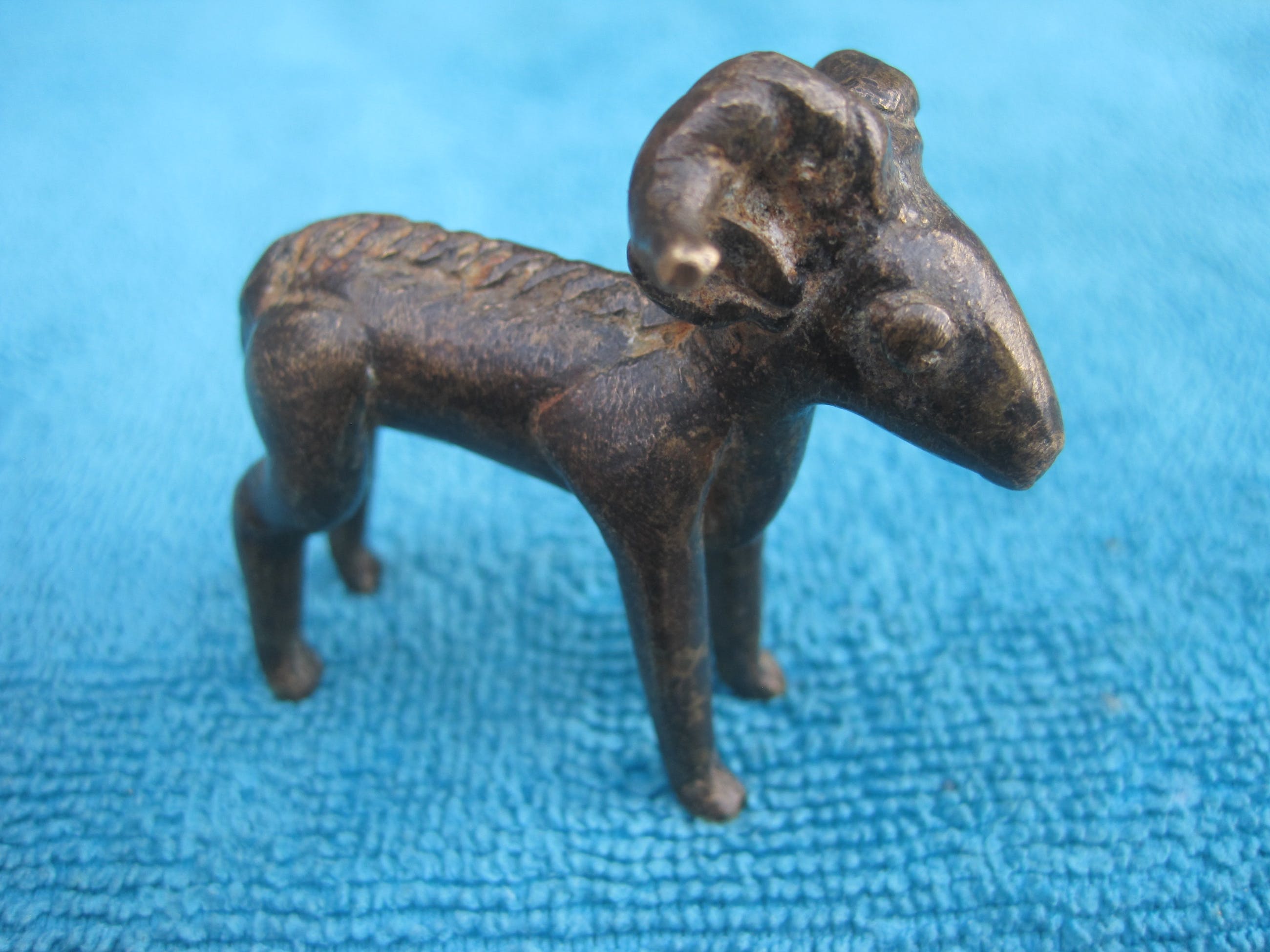 Mooi beeldje van een ram, gemaakt volgens de verloren was methode. Regio Afrika of Midden oosten. Gietfout bij z'n staart.