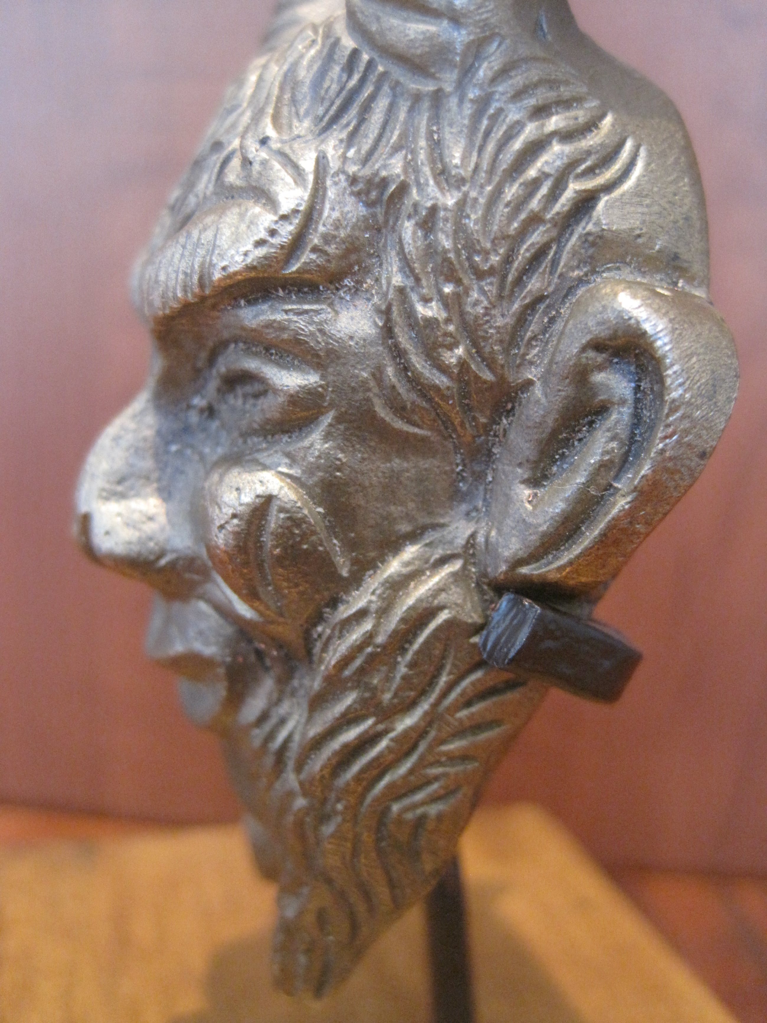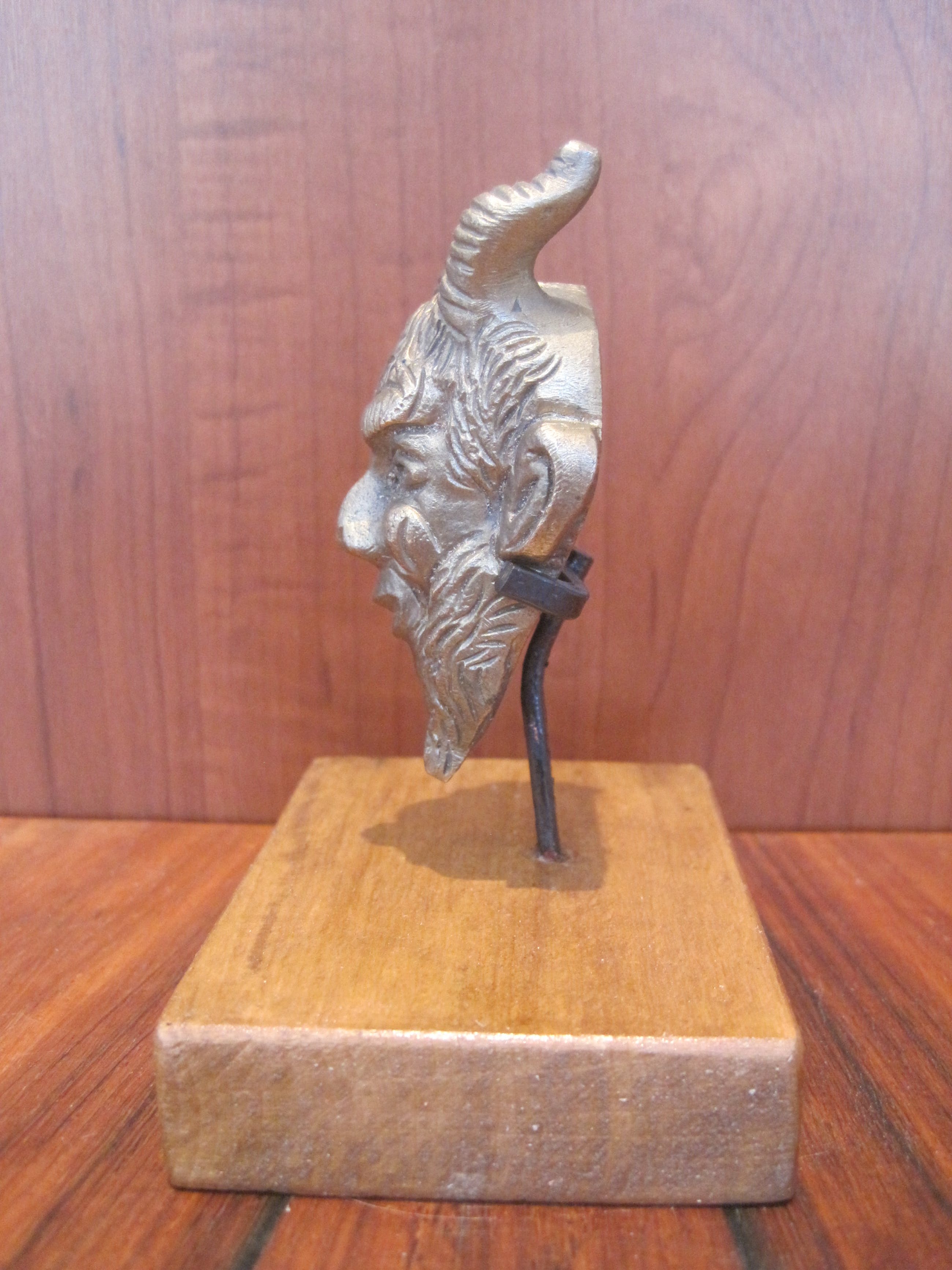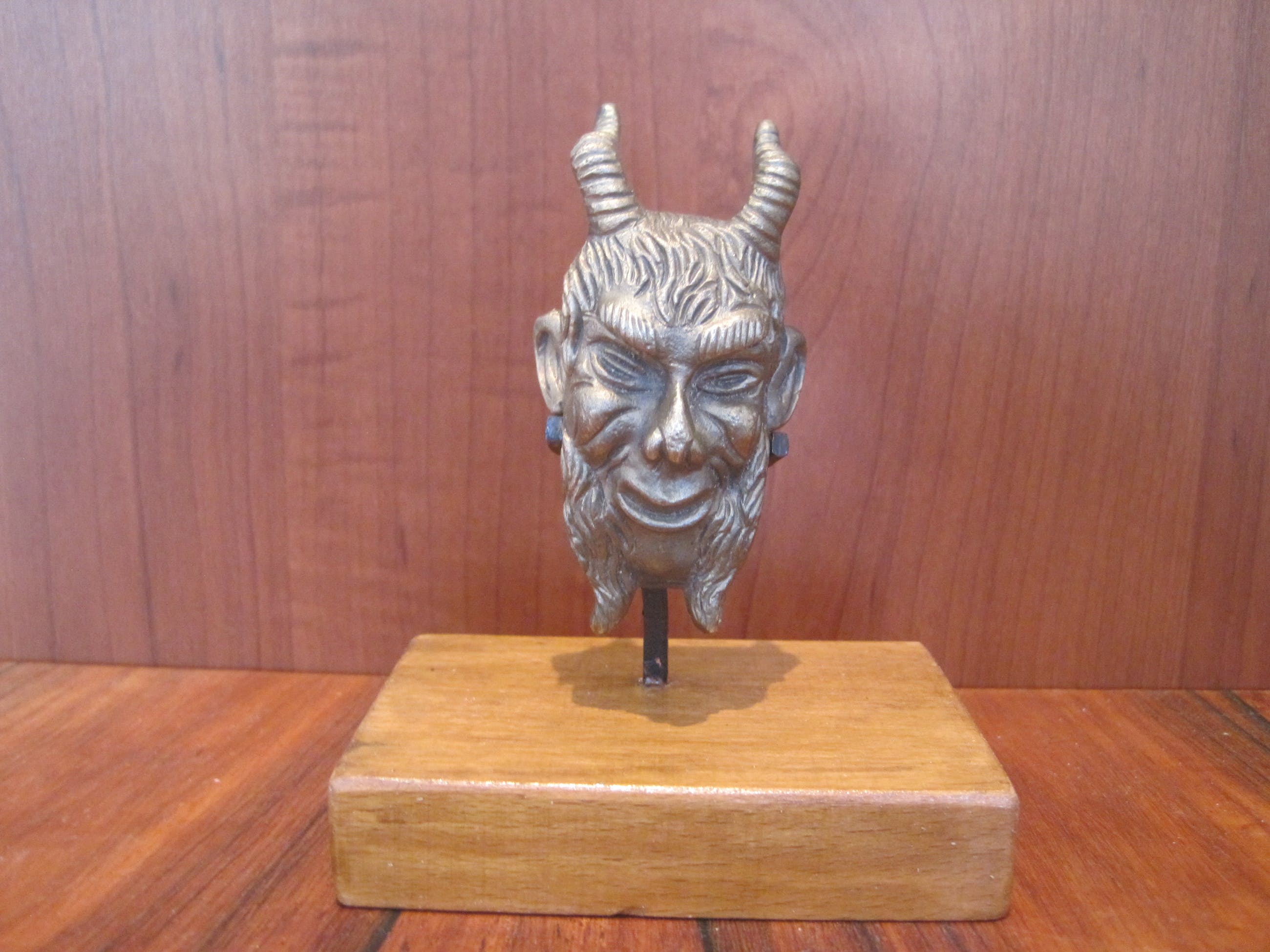 Heel fraai uitgewerkt bronzen kopje van een sater. Gemonteerd op een naar mijn mening zelf gefabriceerd houten sokkeltje met staander waarin hij zit geklemd. Het kopje kan er gewoon uit. De afmetingen zijn van het kopje. De sater of satyr is een bosgeest, behorend tot het gevolg van de god Dyonisos. De satyr staat bekend om zijn lust voor wijn en het verleiden van nimfen, ze laten instinct boven rede gaan, anarchie boven orde, extase boven ascese en overvloed boven matigheid. Zij symboliseren wellust en vervoering. (deels uit tekst Wikipedia).