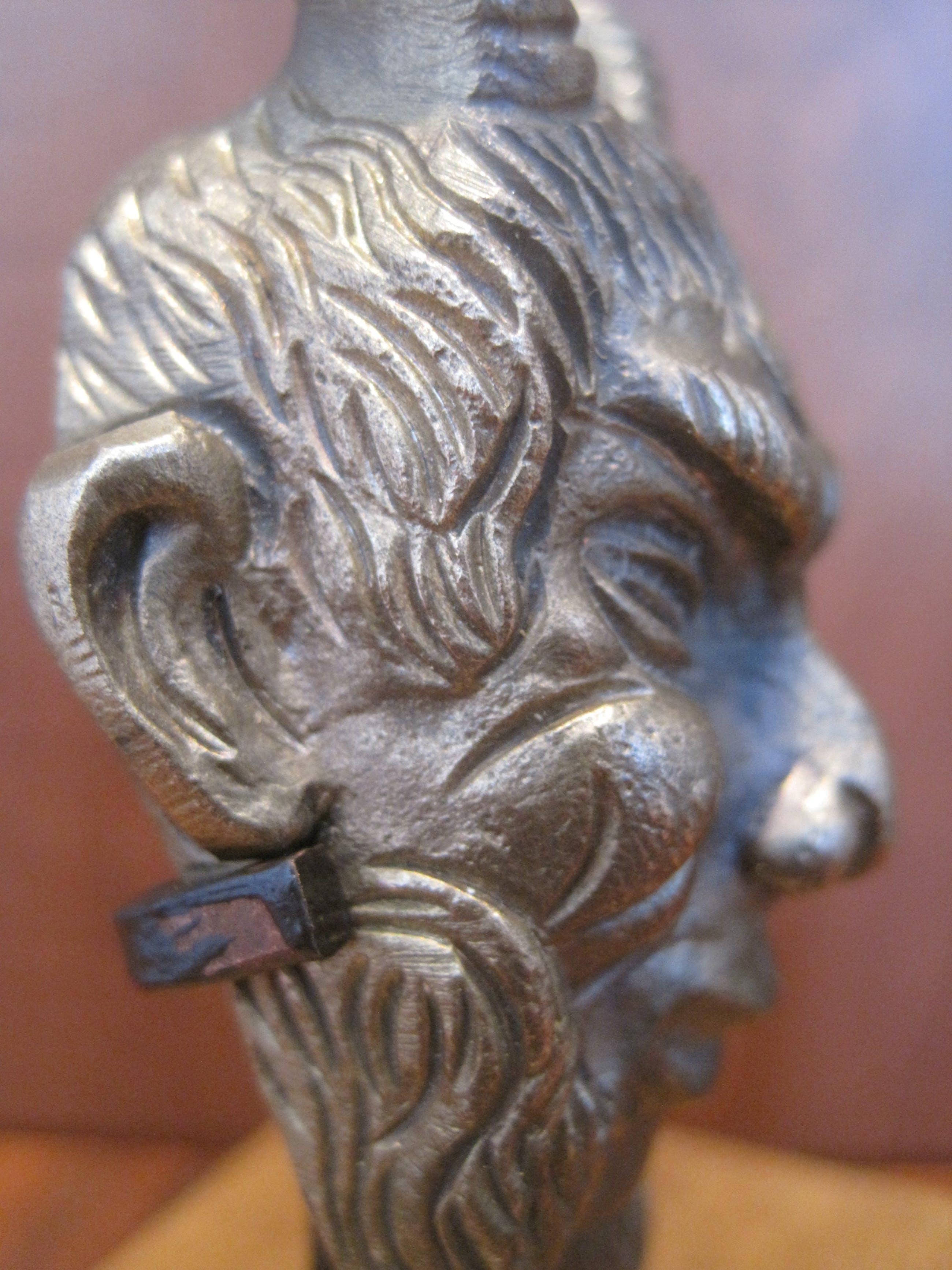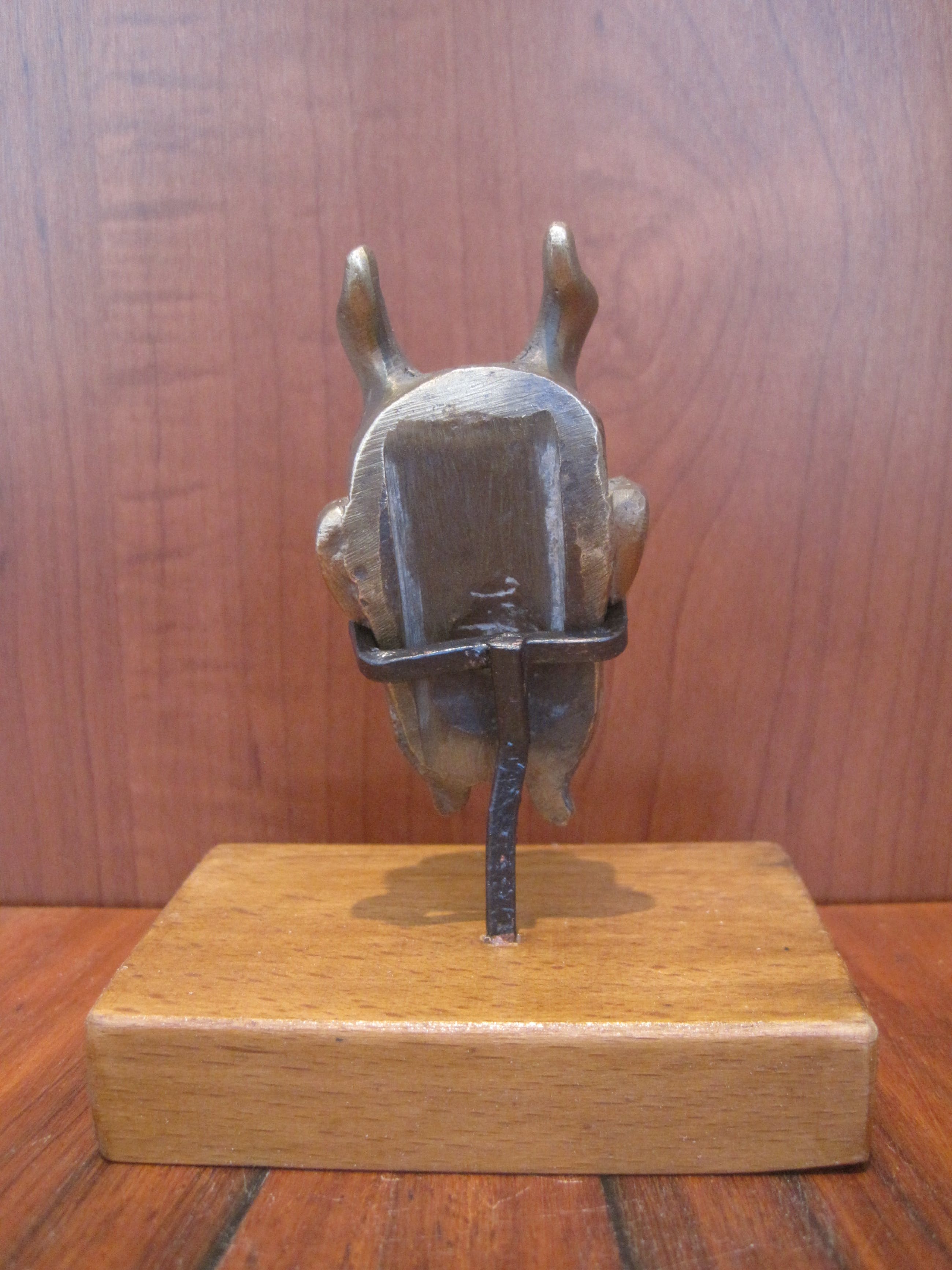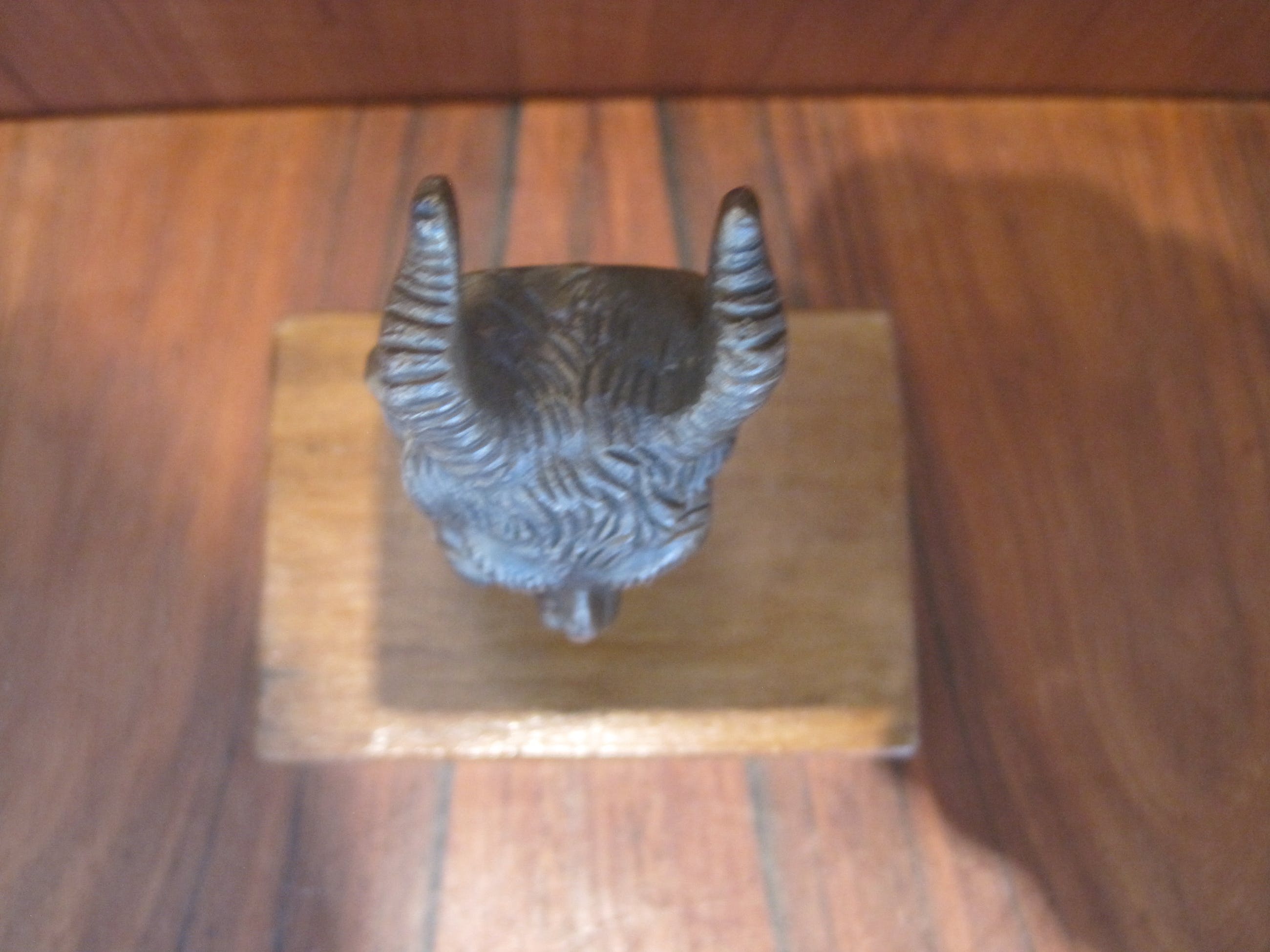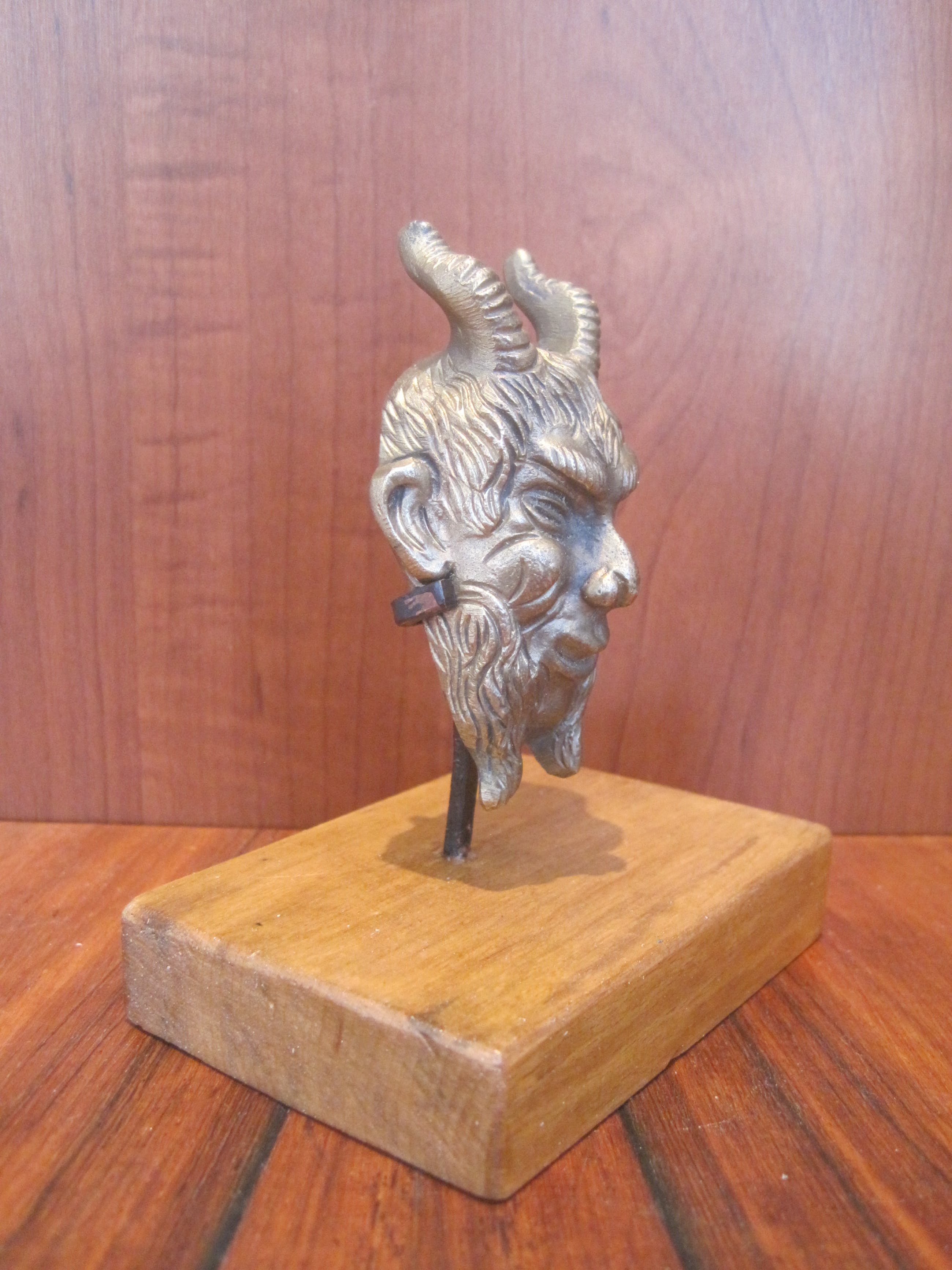 Heel fraai uitgewerkt bronzen kopje van een sater. Gemonteerd op een naar mijn mening zelf gefabriceerd houten sokkeltje met staander waarin hij zit geklemd. Het kopje kan er gewoon uit. De afmetingen zijn van het kopje. De sater of satyr is een bosgeest, behorend tot het gevolg van de god Dyonisos. De satyr staat bekend om zijn lust voor wijn en het verleiden van nimfen, ze laten instinct boven rede gaan, anarchie boven orde, extase boven ascese en overvloed boven matigheid. Zij symboliseren wellust en vervoering. (deels uit tekst Wikipedia).