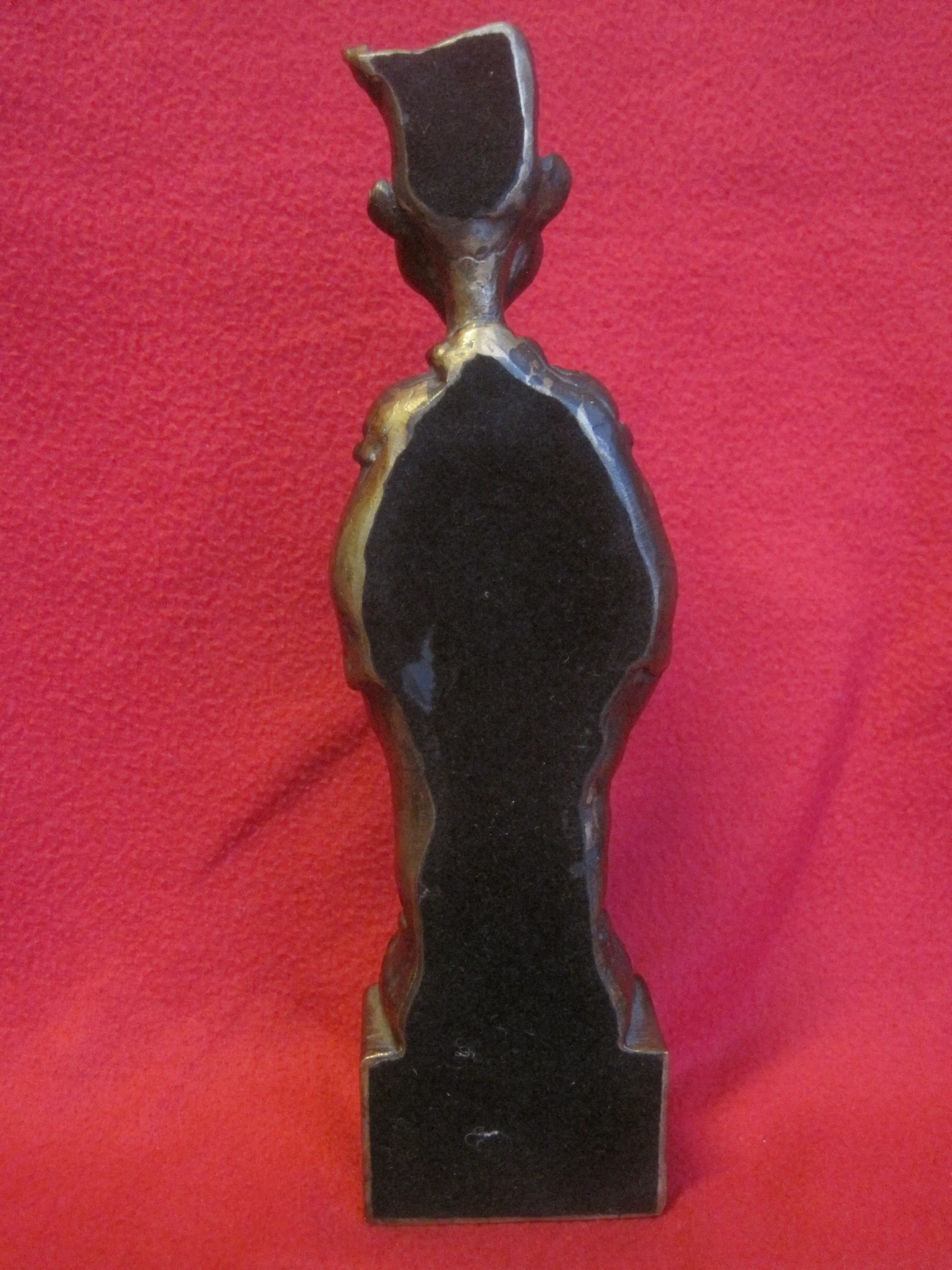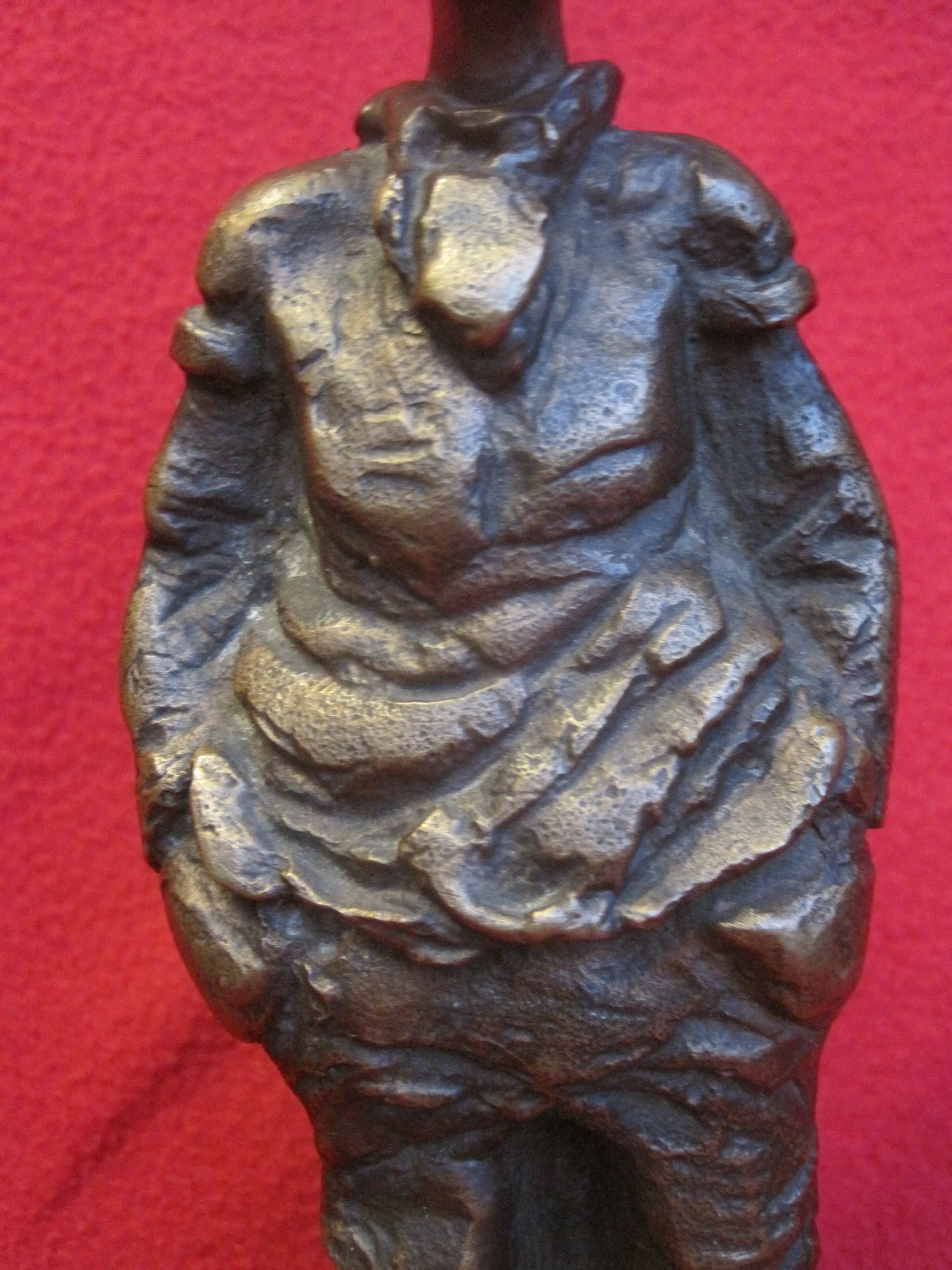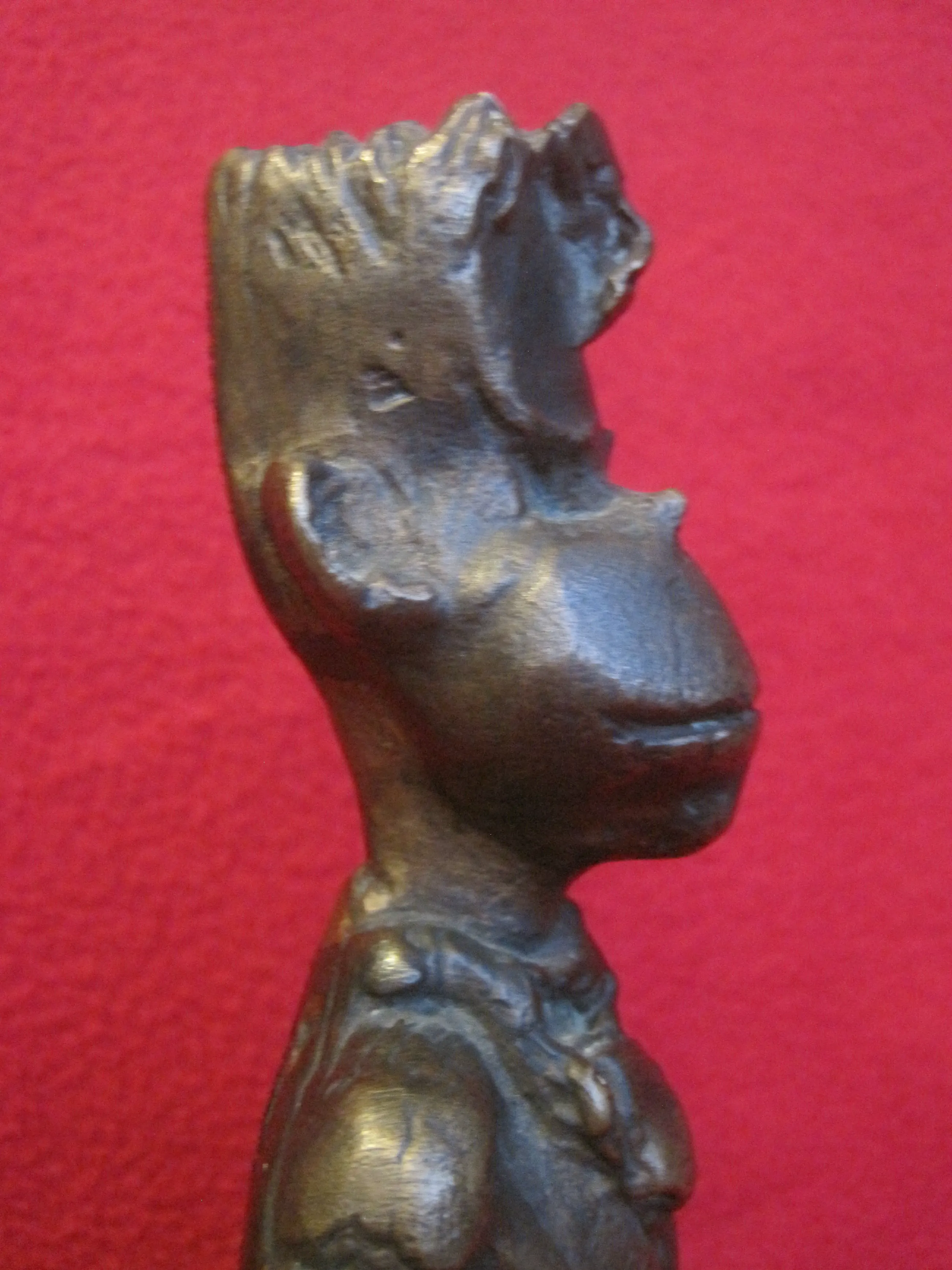 Een bronzen beeld van een jongen met een aapachtig gezicht en zijn handen in de zakken. Het beeld is aan de achterkant afgeplat en bekleed met zwart fluweel. Wie weet wie dit beeld heeft gemaakt of wat het voorstelt?