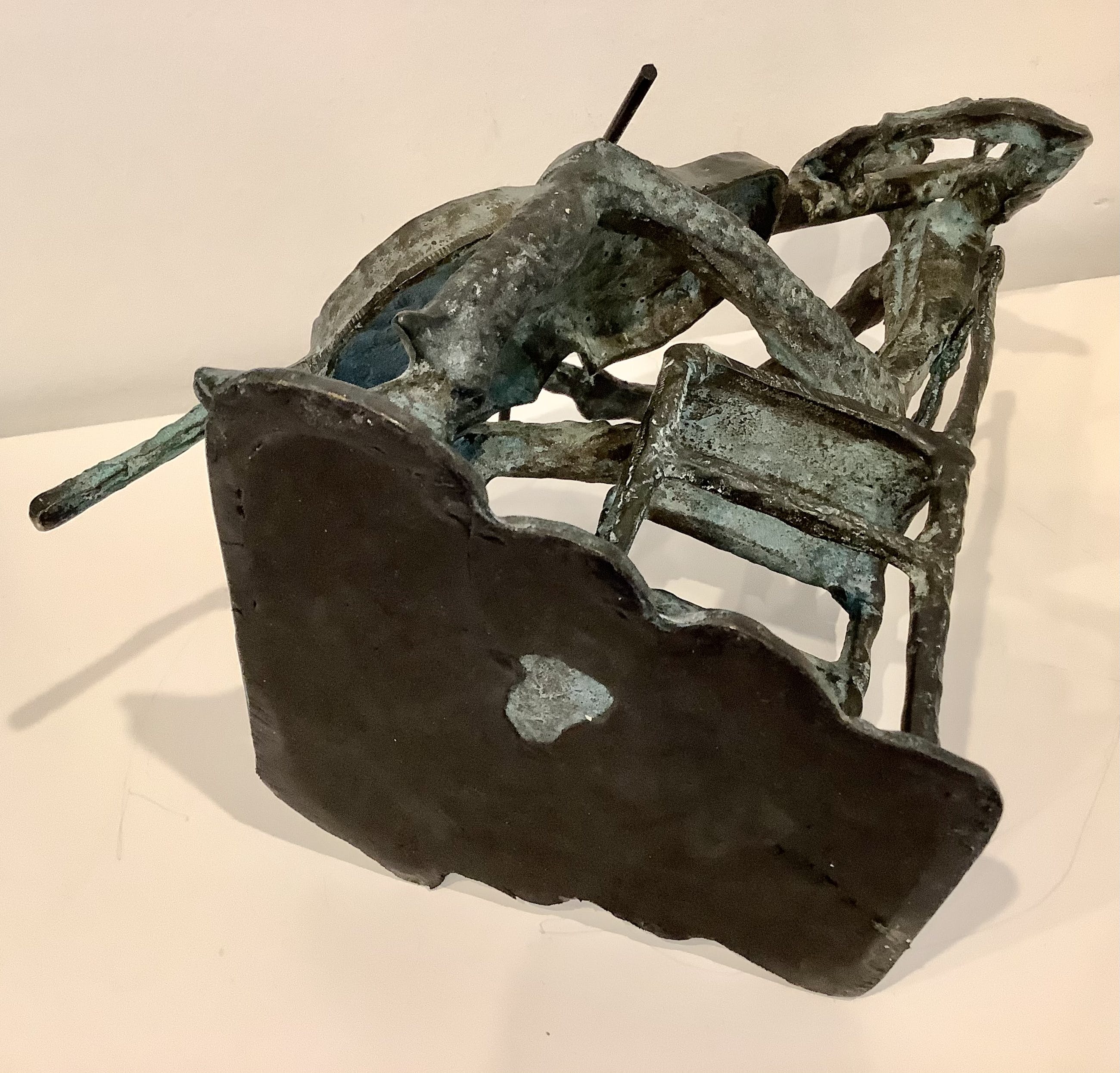 Fraaie bronzen sculptuur van een cello speler. Expressief en krachtig beeld. Mooie groen/blauwe patina.