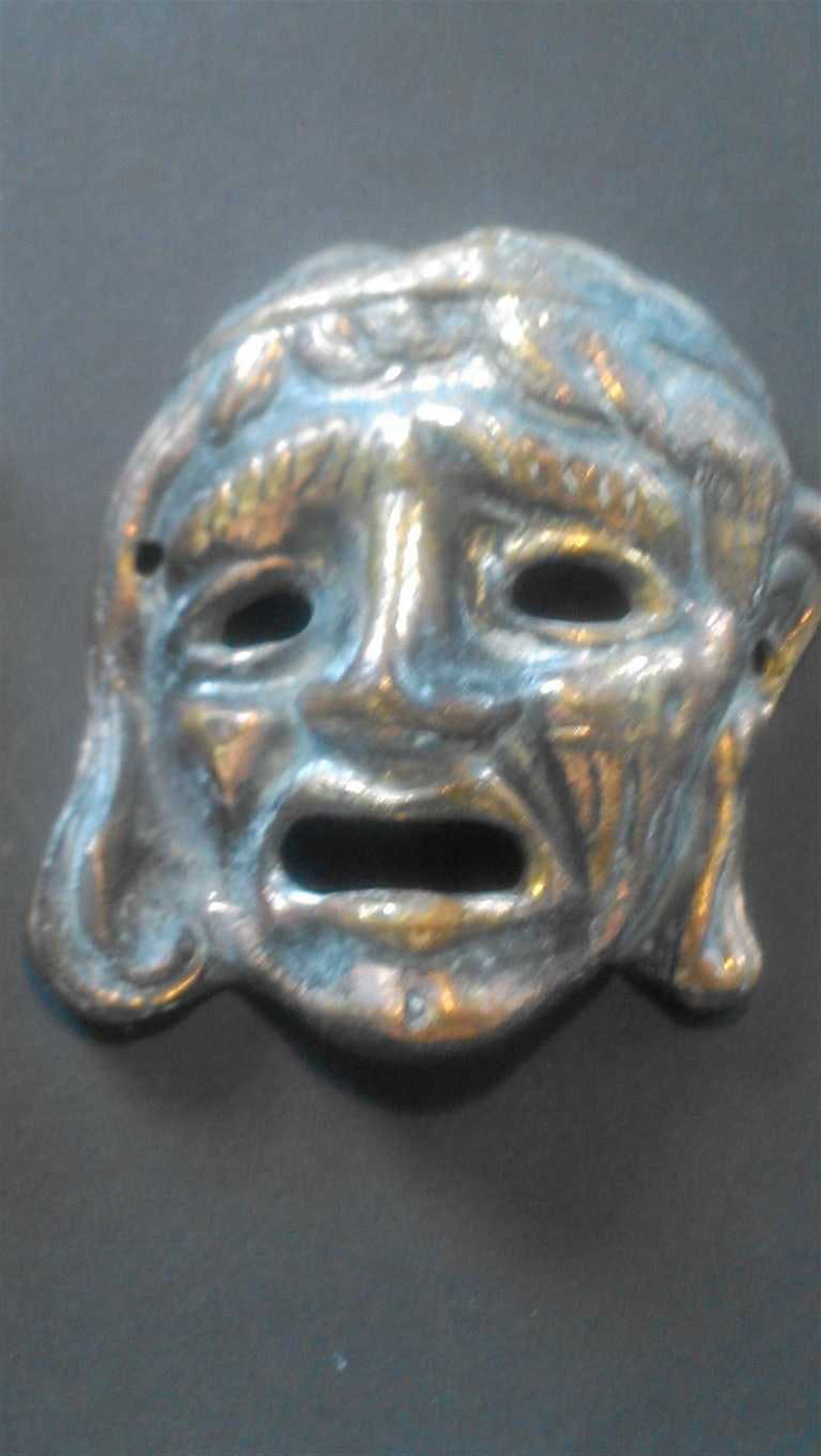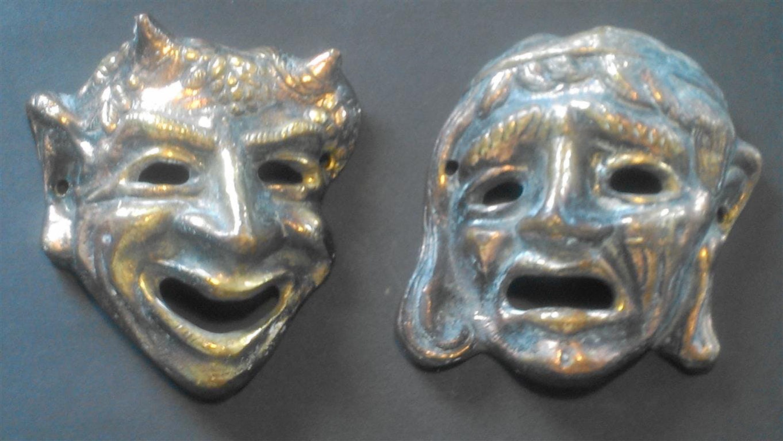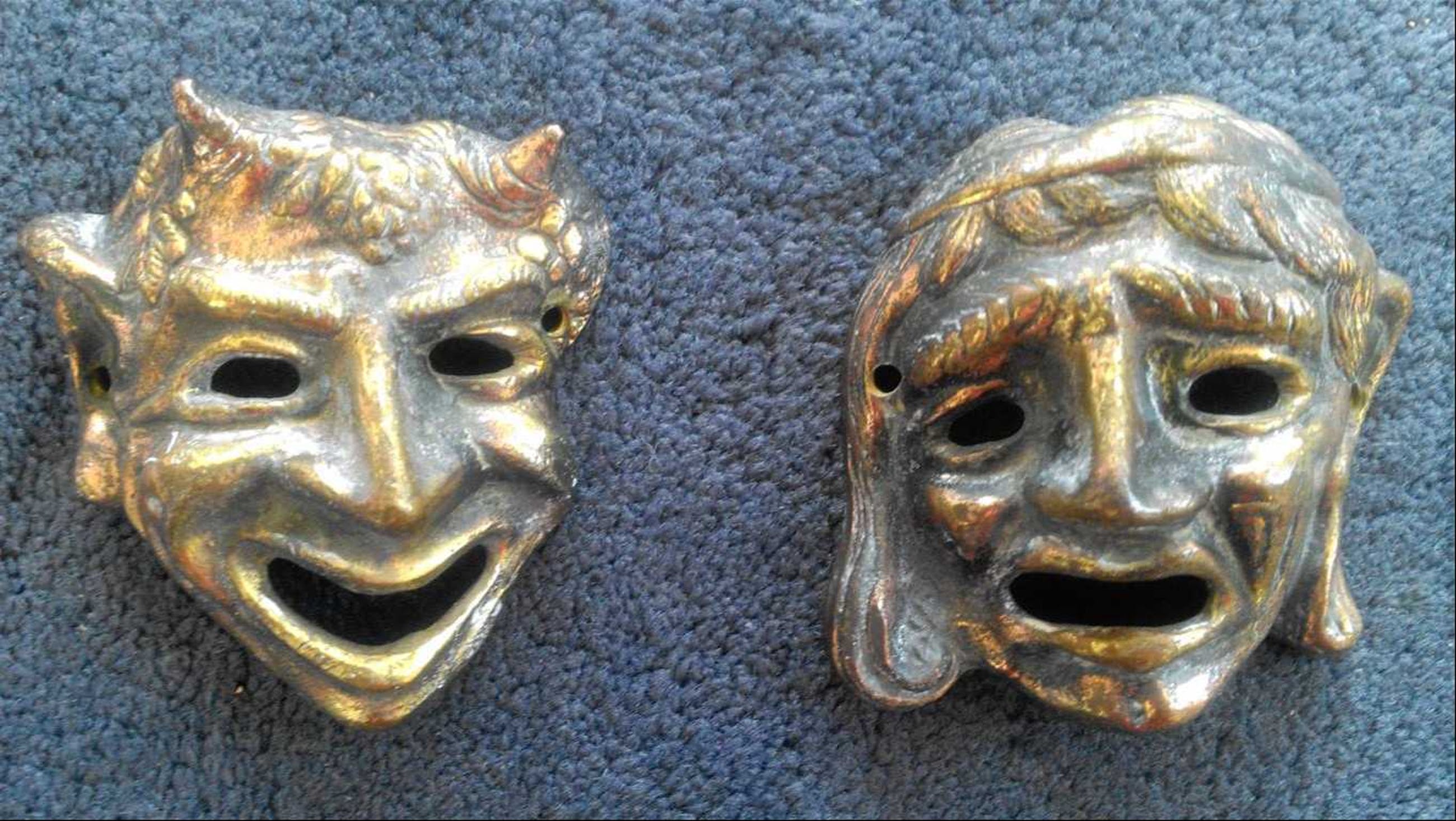 Twee geelbronzen maskers om op te hangen van Commedia del Arte figuren zoals de duivel met zijn hoorntjes Zwaar en mooi gedetailleerd
