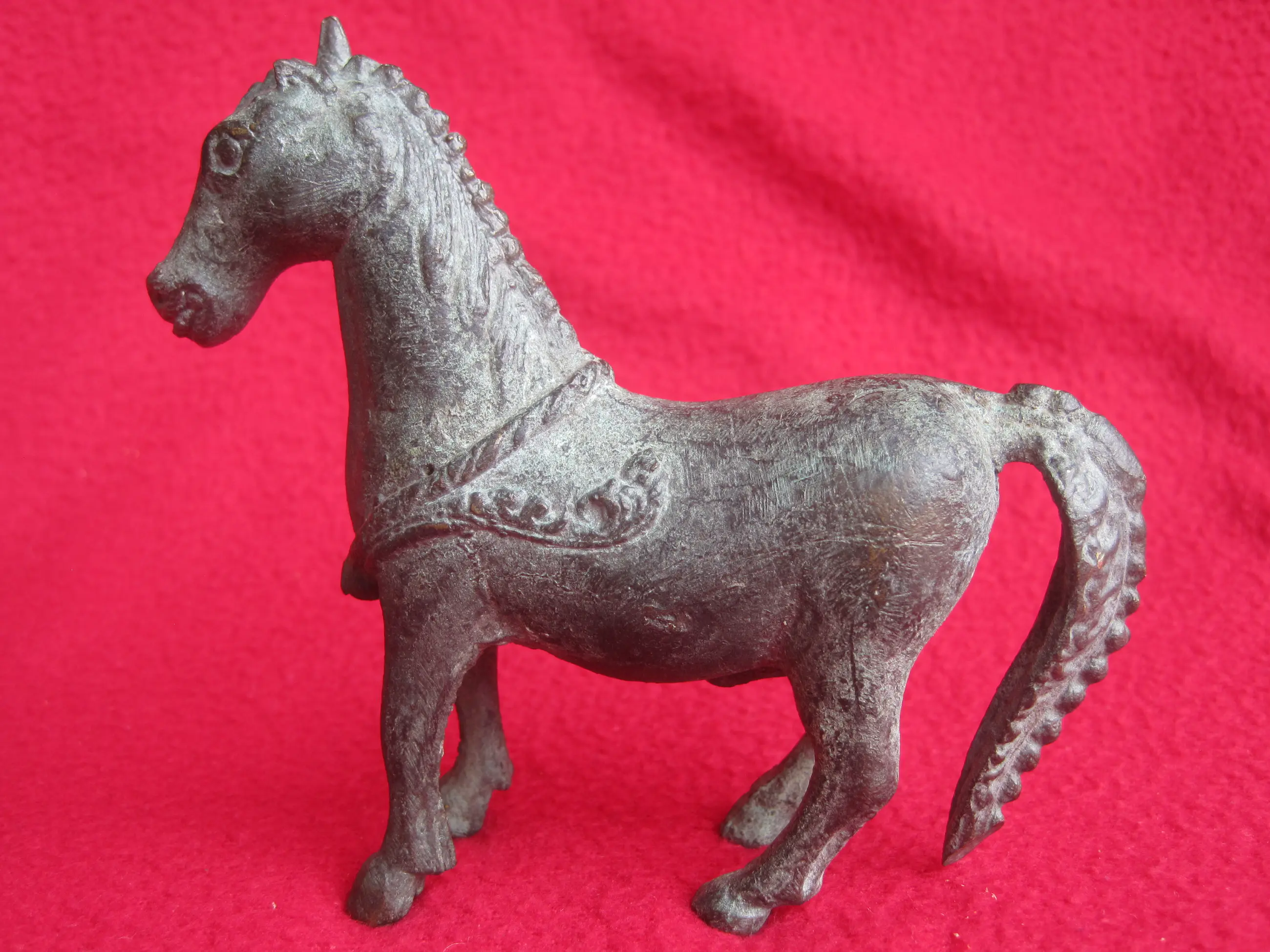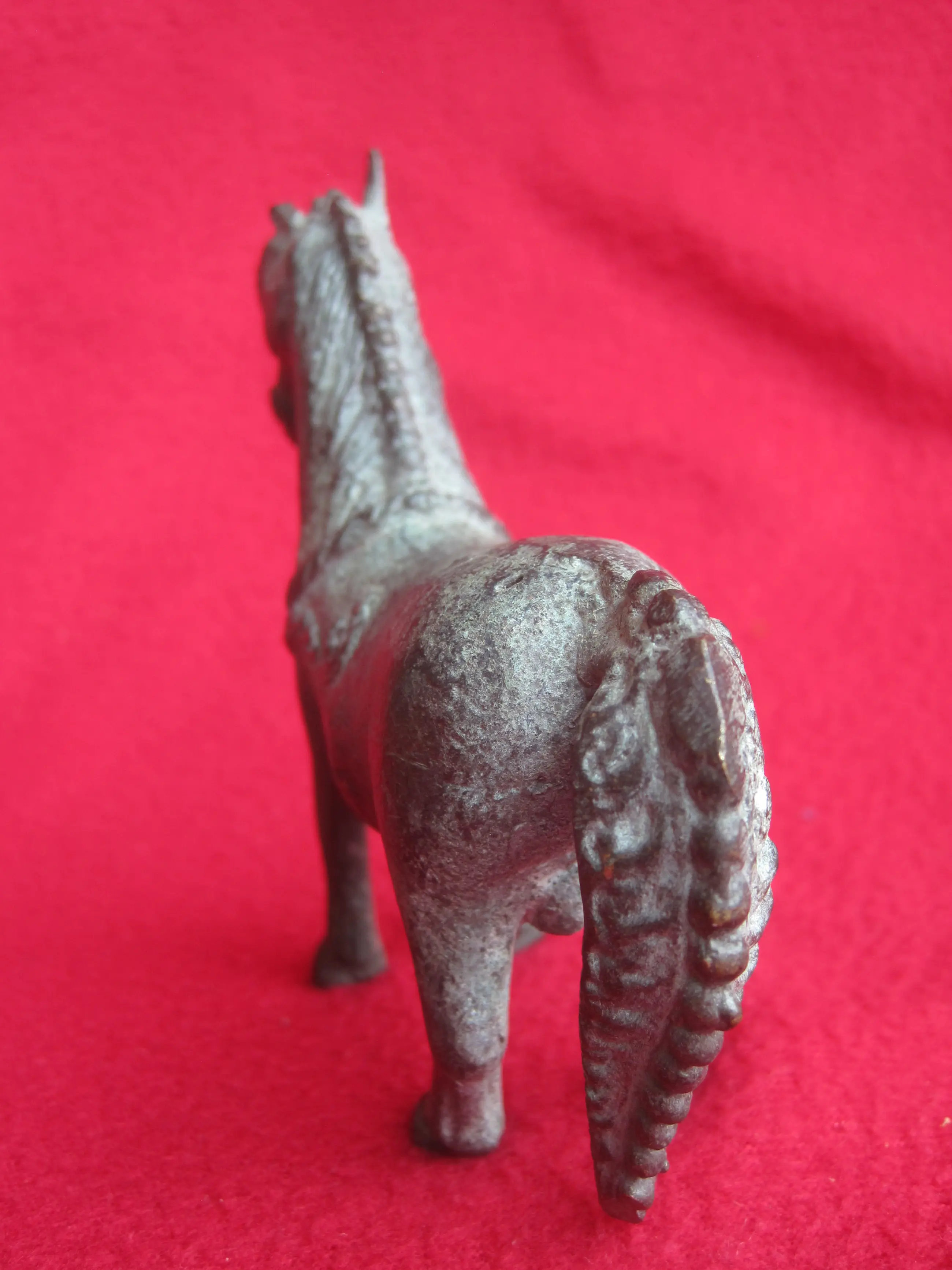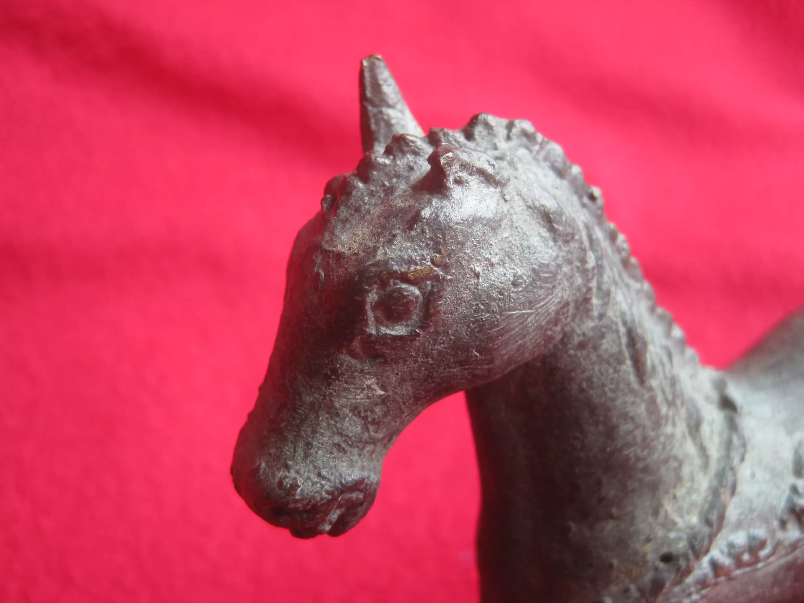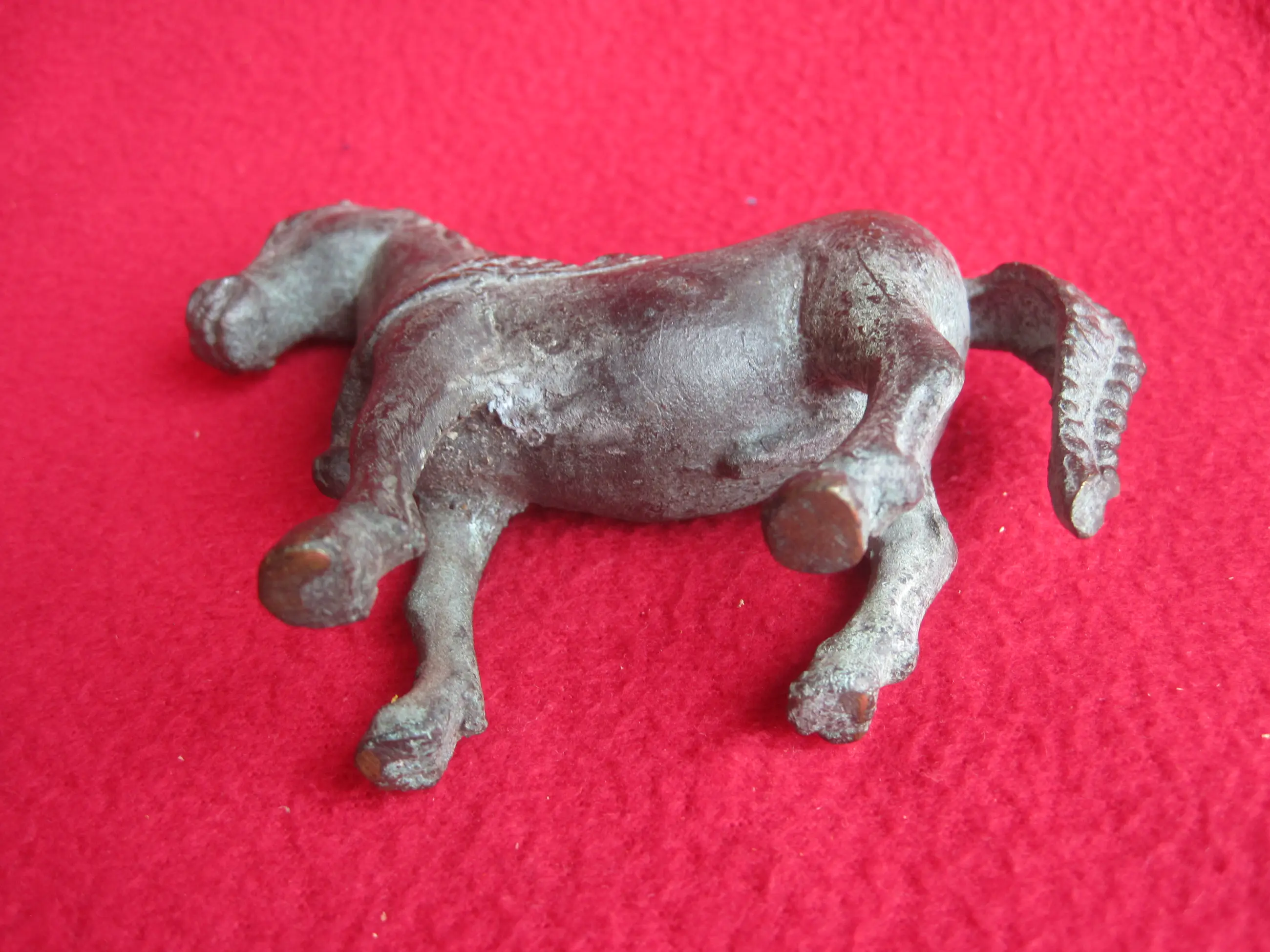Bronzen beeldje van een jonge hengst. Een hengst is een onbesneden mannelijk paard. Dit beeldje mist 'n stukje van zijn linker oor.