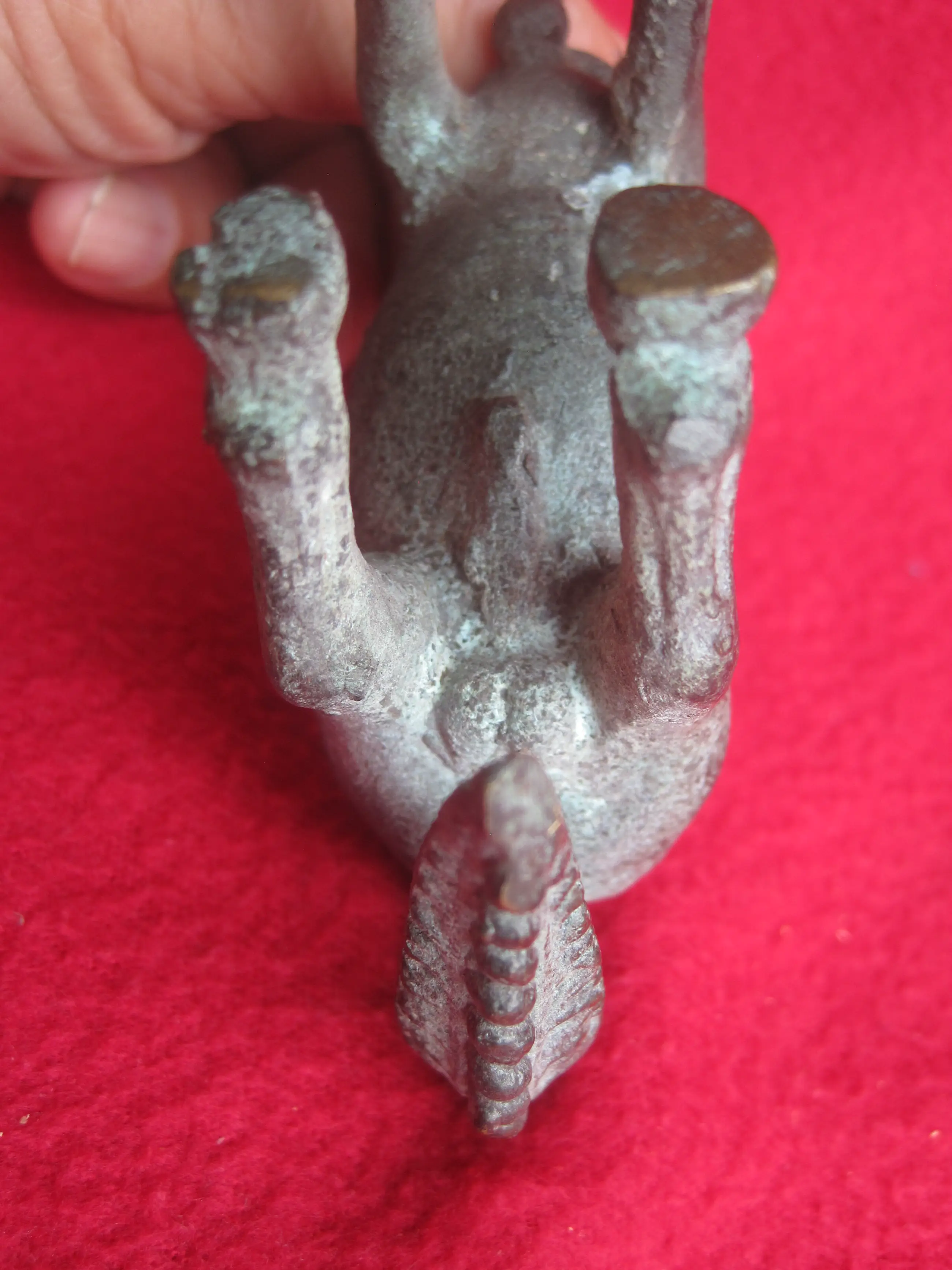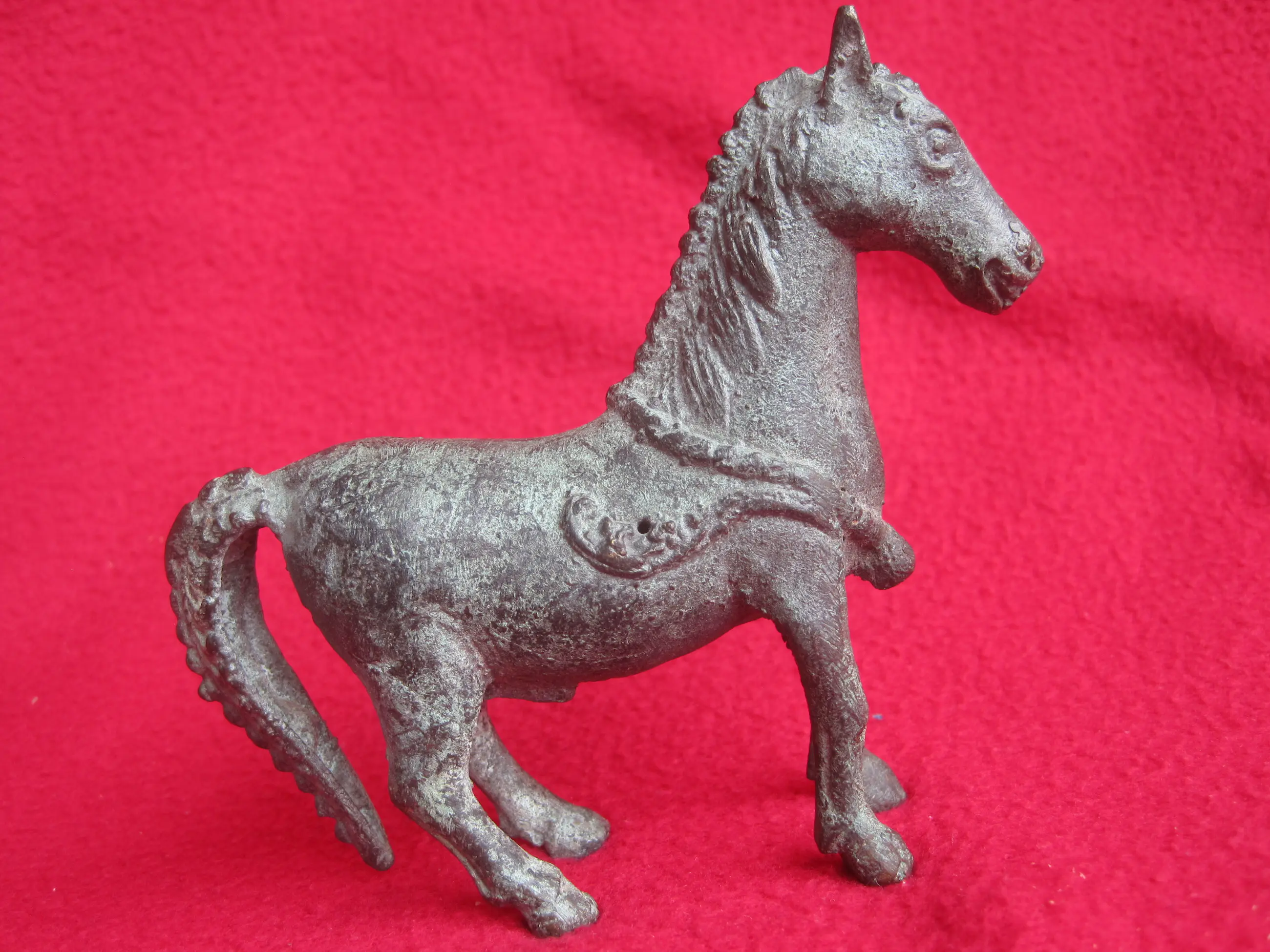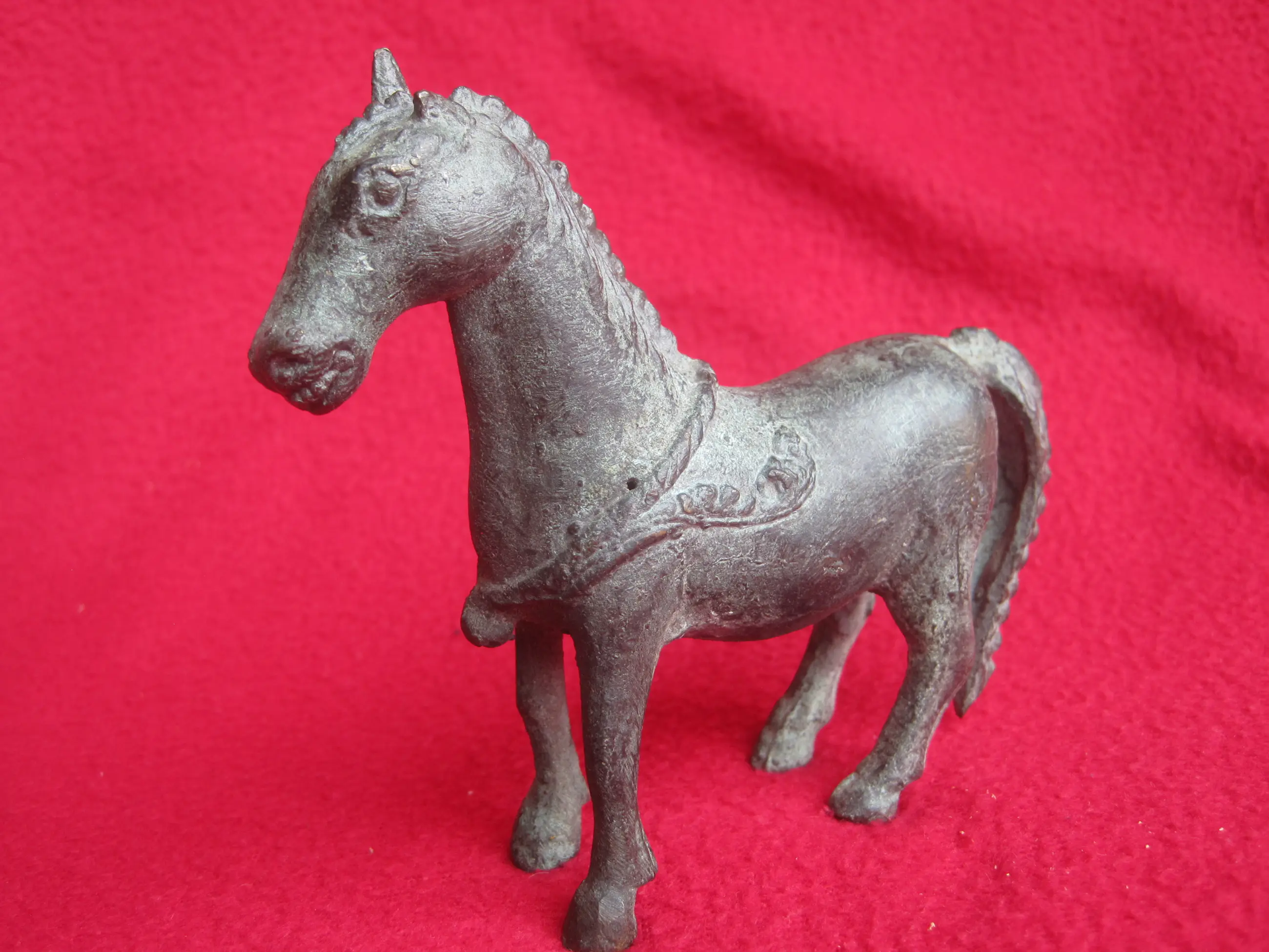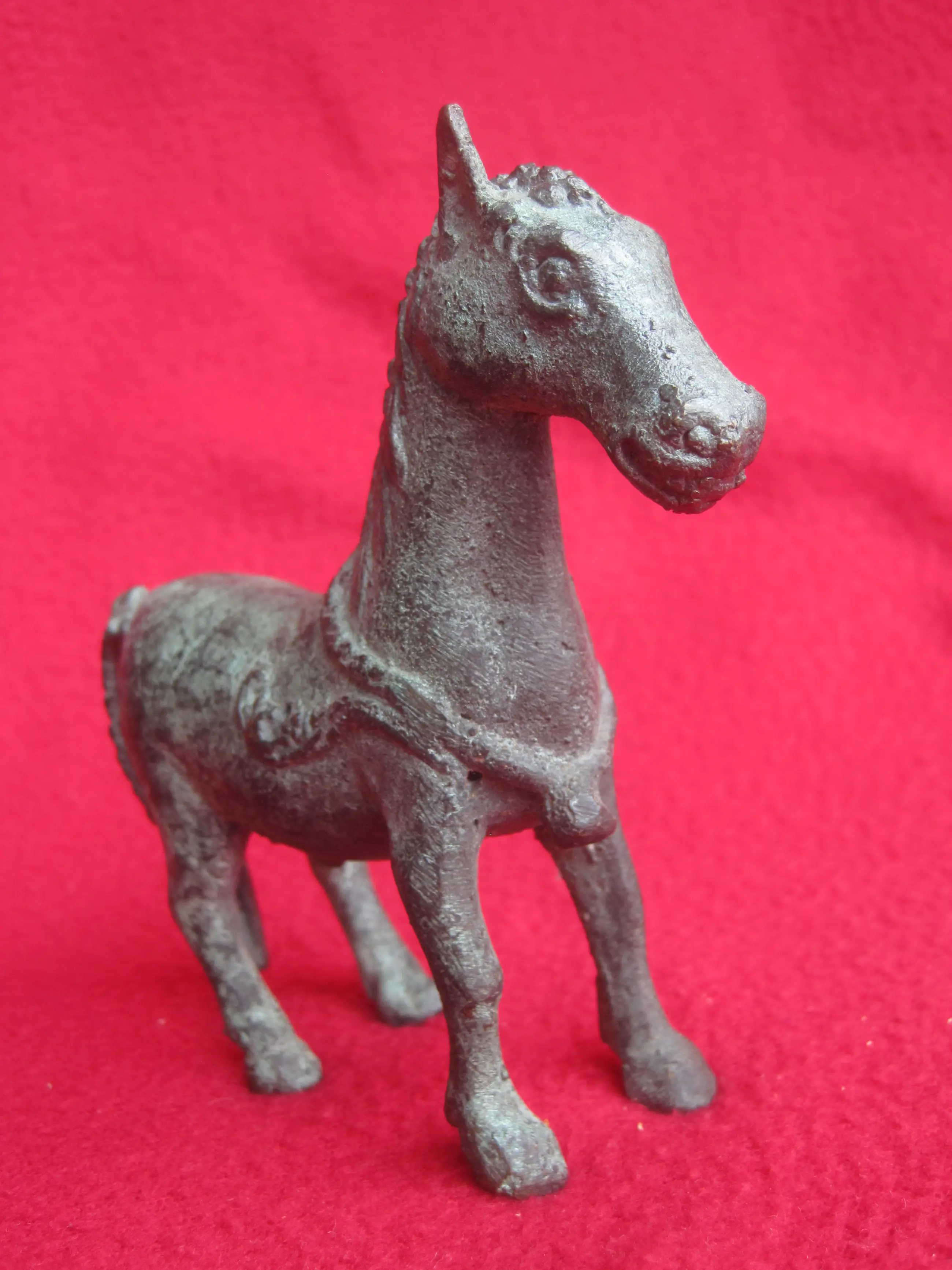 Bronzen beeldje van een jonge hengst. Een hengst is een onbesneden mannelijk paard. Dit beeldje mist 'n stukje van zijn linker oor.