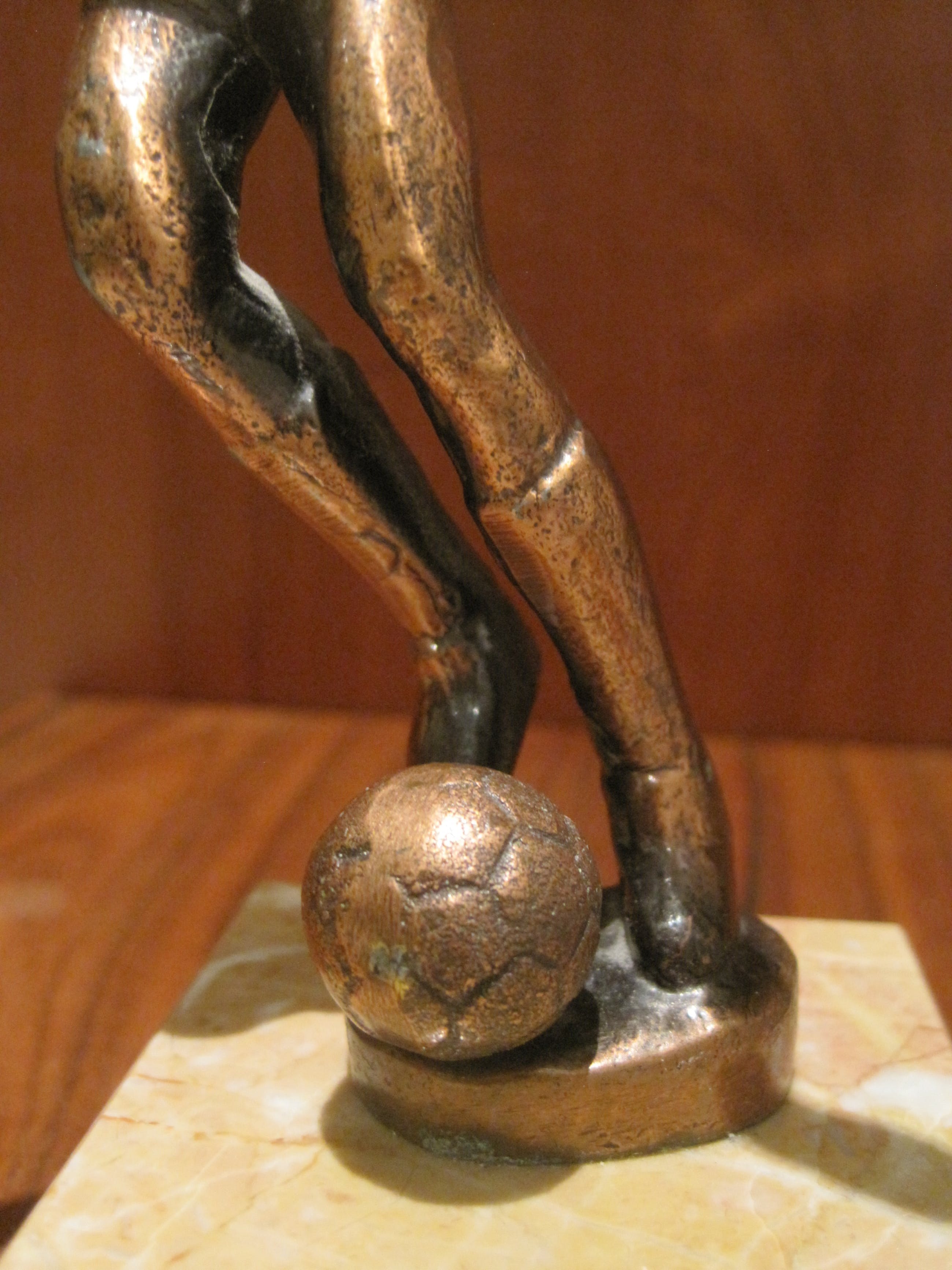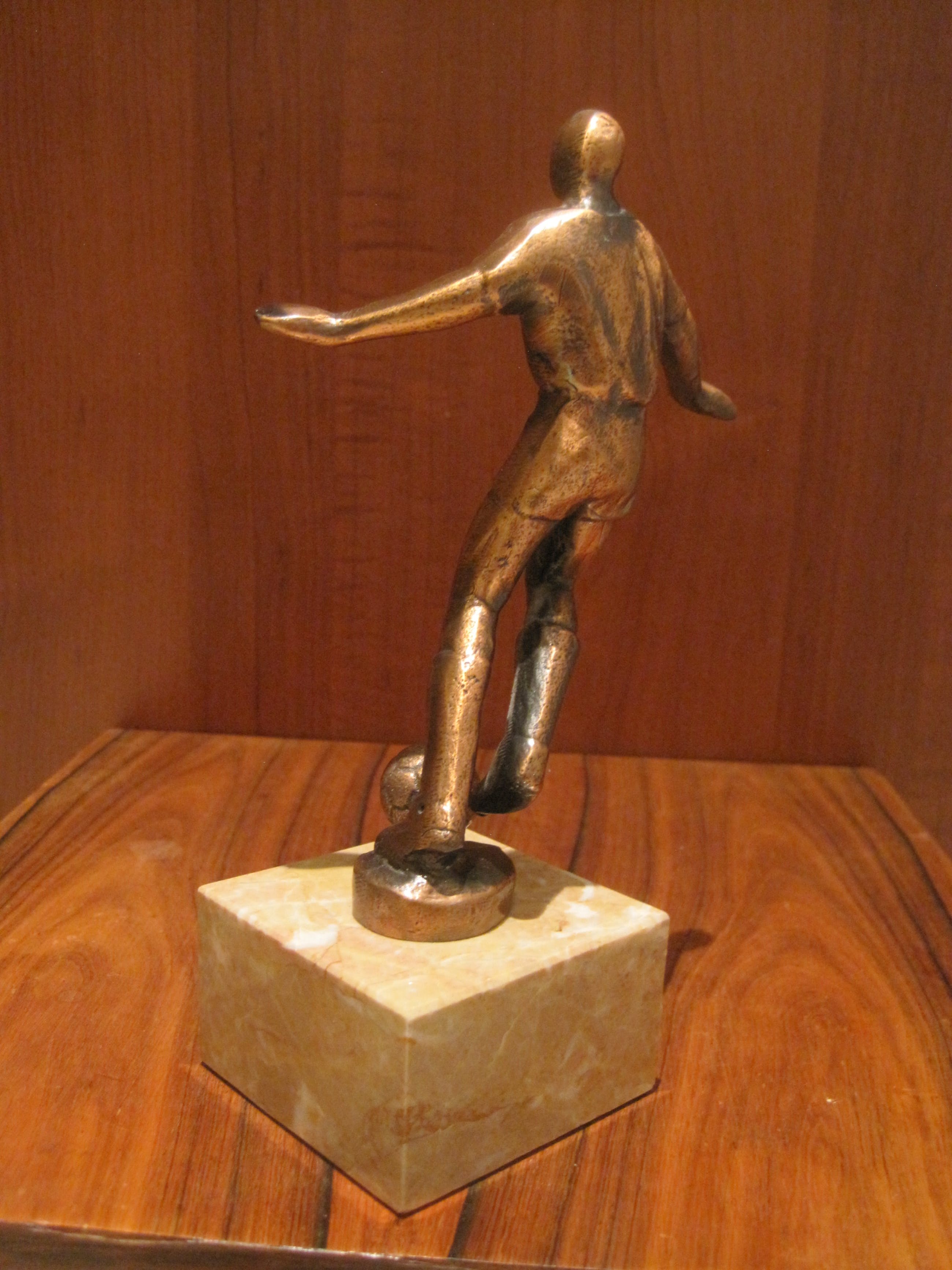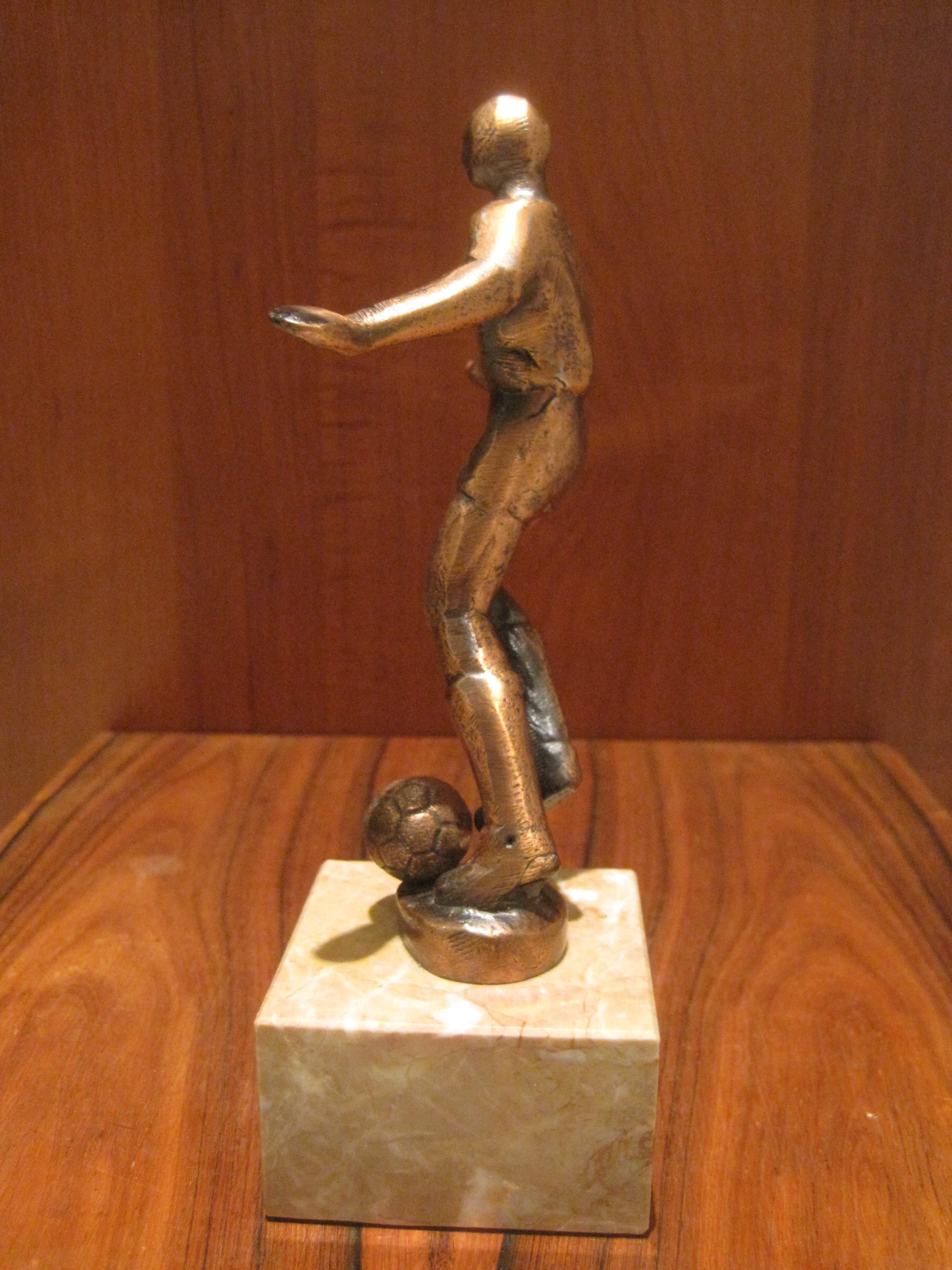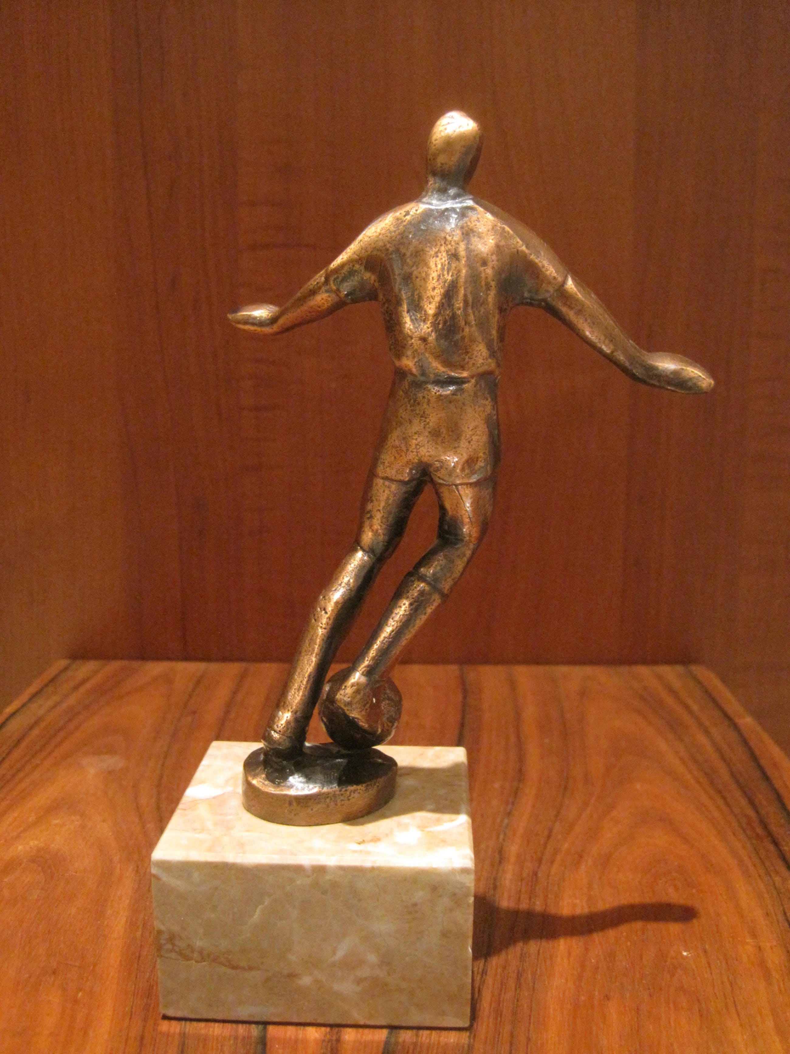 Een enigszins abstract massief bronzen beeldje van een pingelende voetballer. Dit beeld is in beweging. De afmetingen zijn van het beeldje zonder de sokkel.