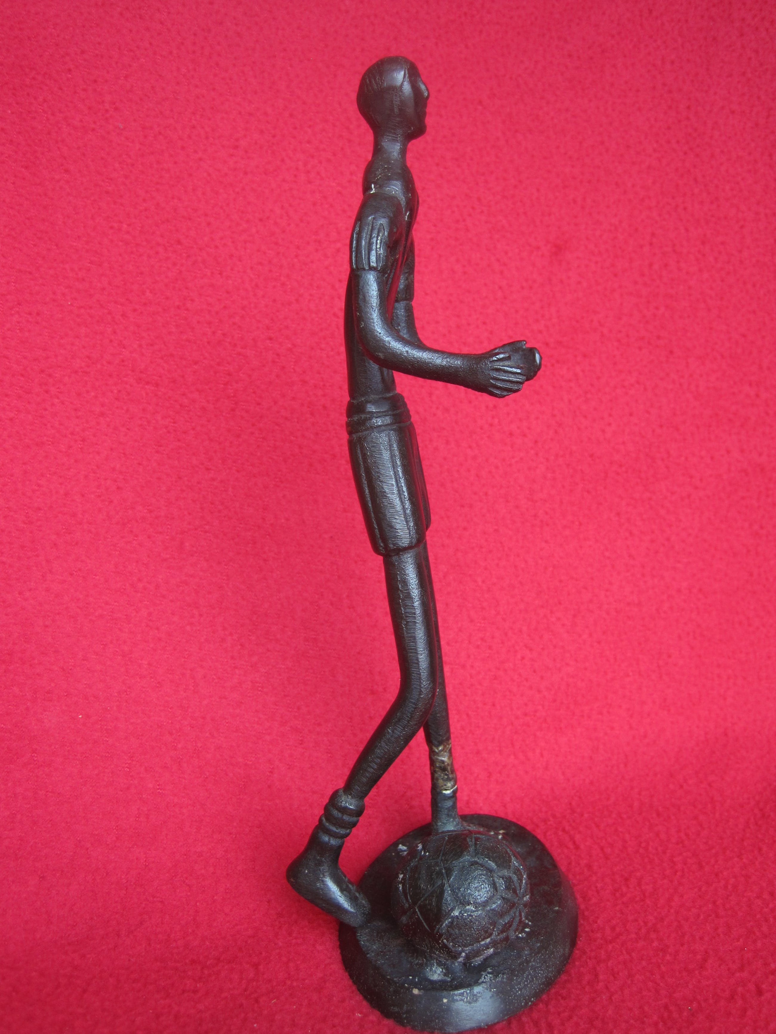 Een duidelijk apart ouder beeld van een voetballer. Zijn tenue is ouderwets. Het beeld is donker gepatineerd, met hier en daar wat patine verlies waardoor het brons zichtbaar is. Ik kan geen monogram of signatuur vinden, maar het bloemvormig motief op de voetbal of de letter A op de rug is mogelijk een aanduiding.