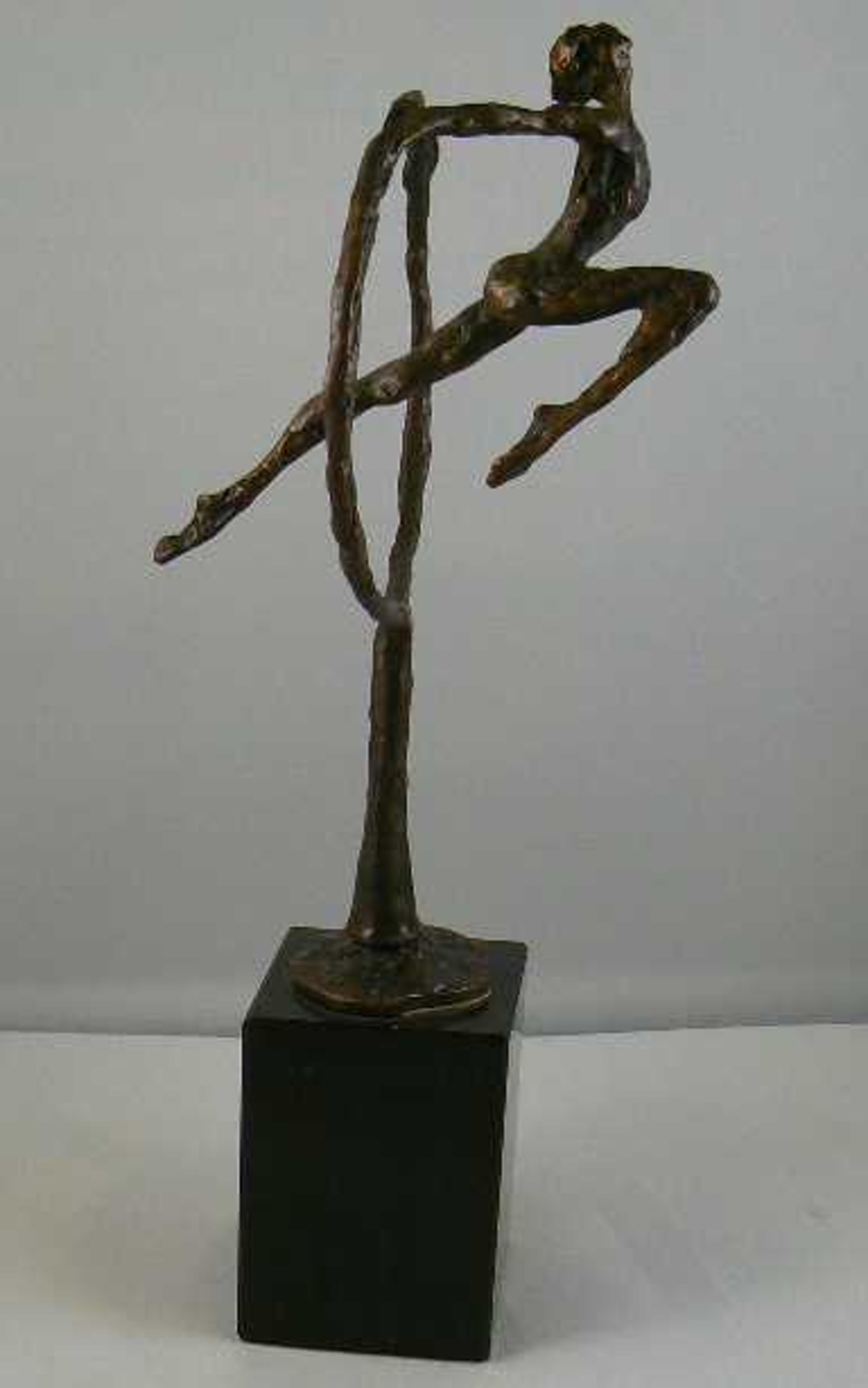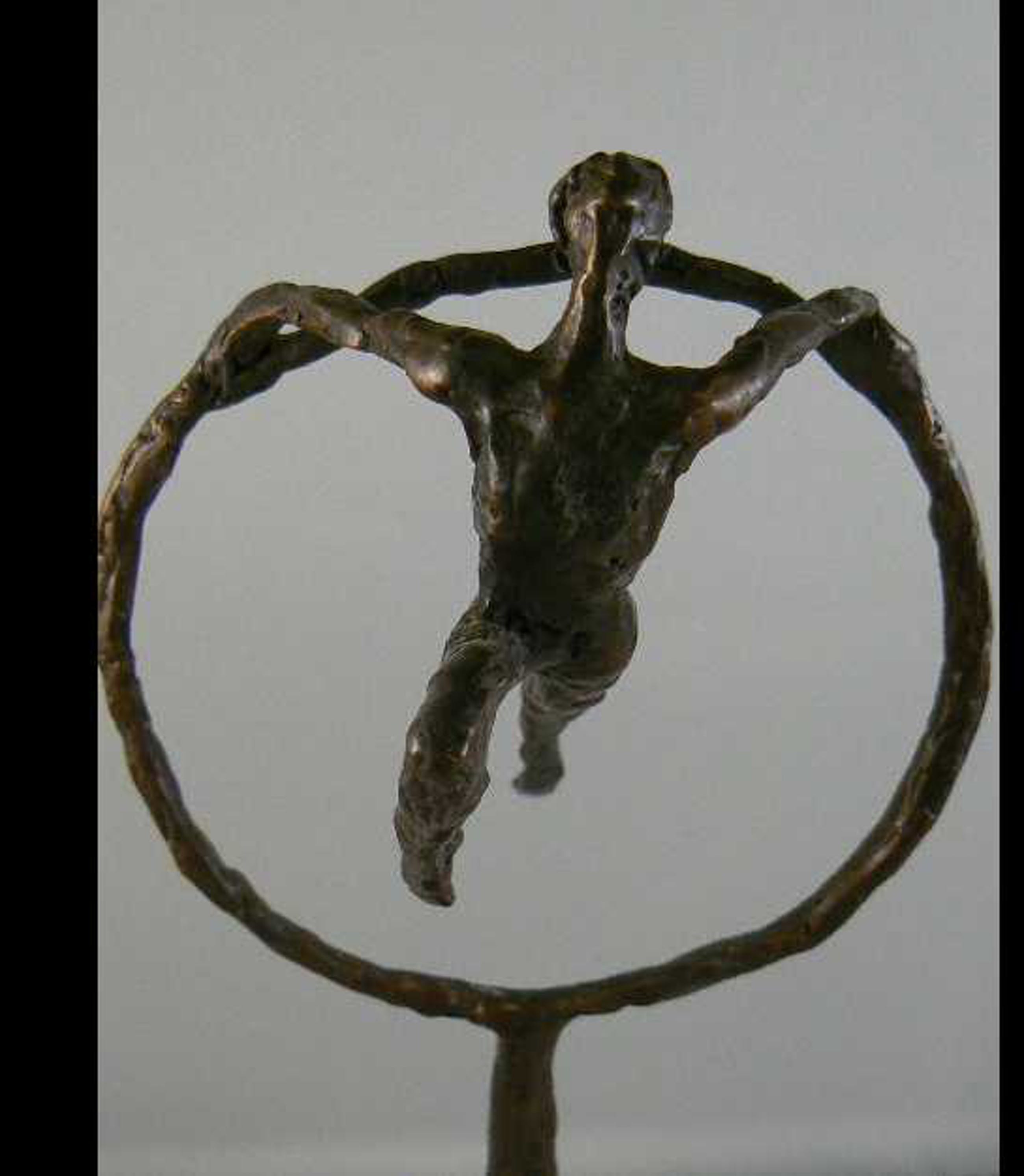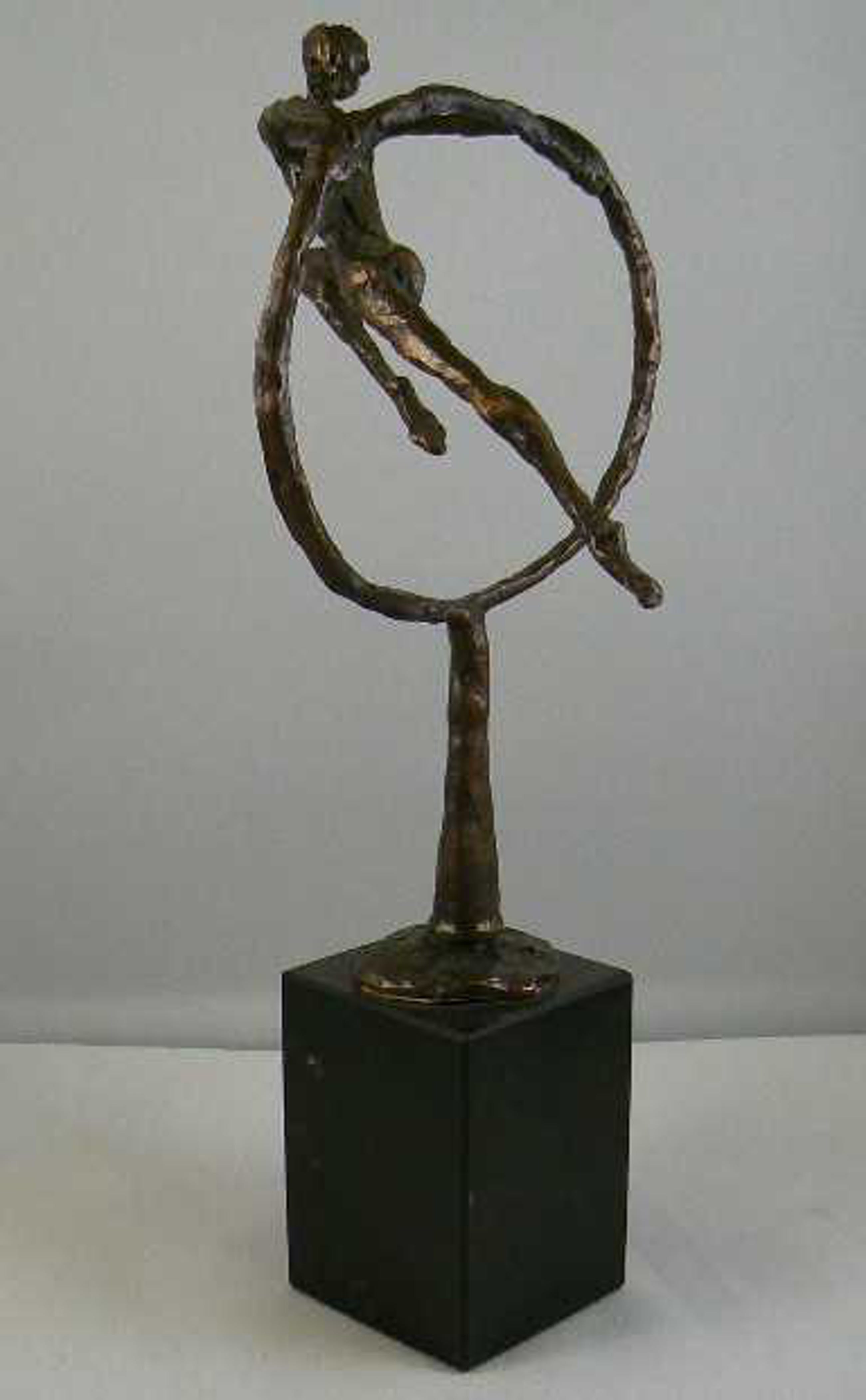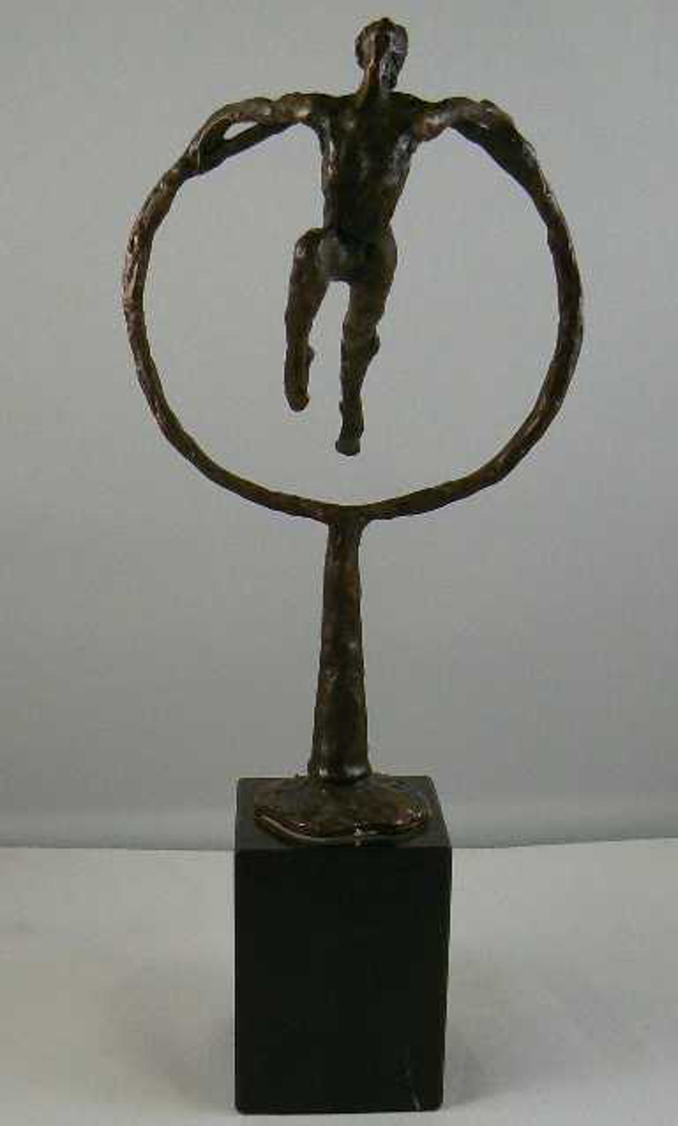 Verbronsd beeldje op sokkel. Sokkel maat 5 x 5 x 7 Persoon die door de cirkel springt.