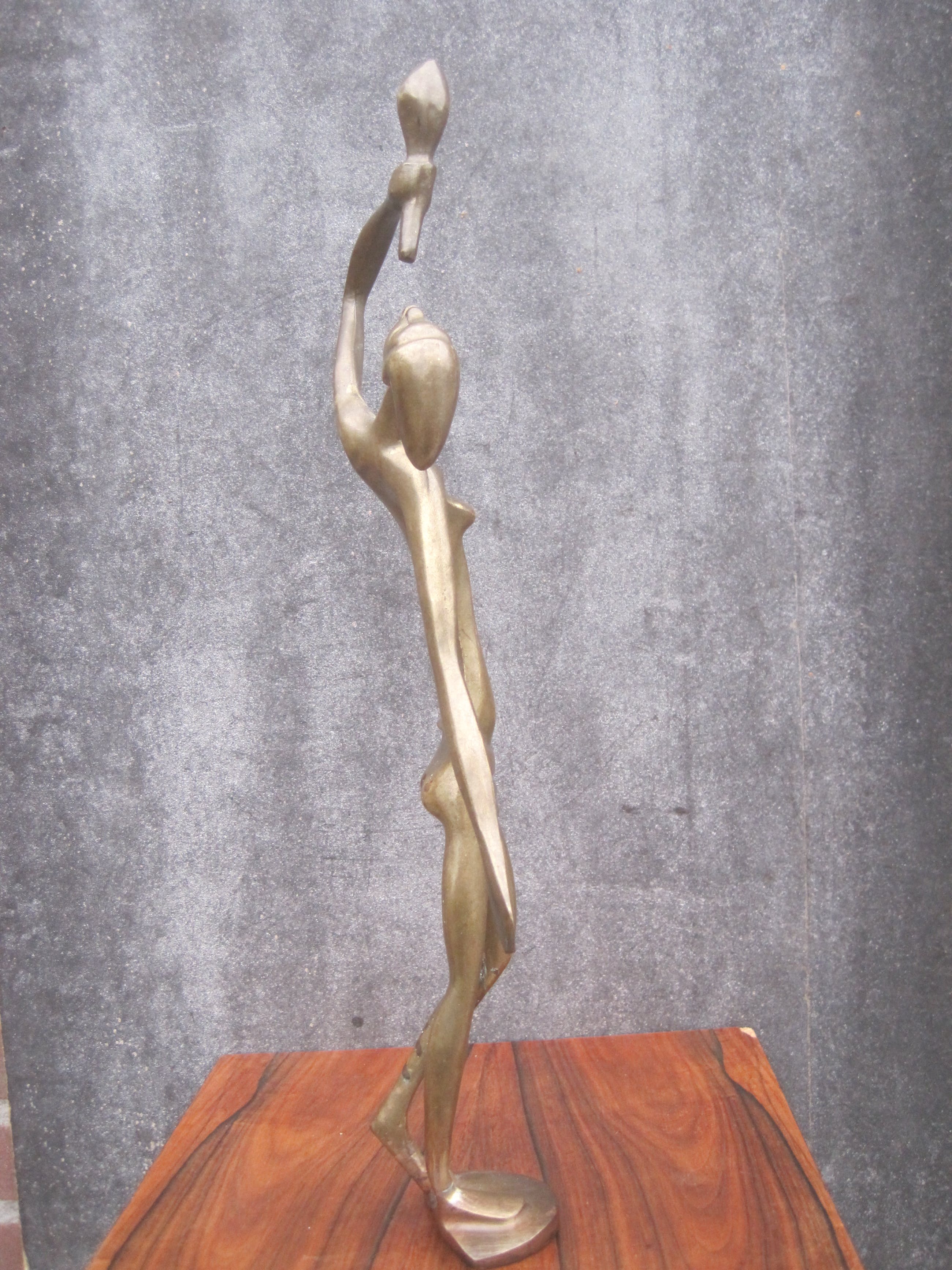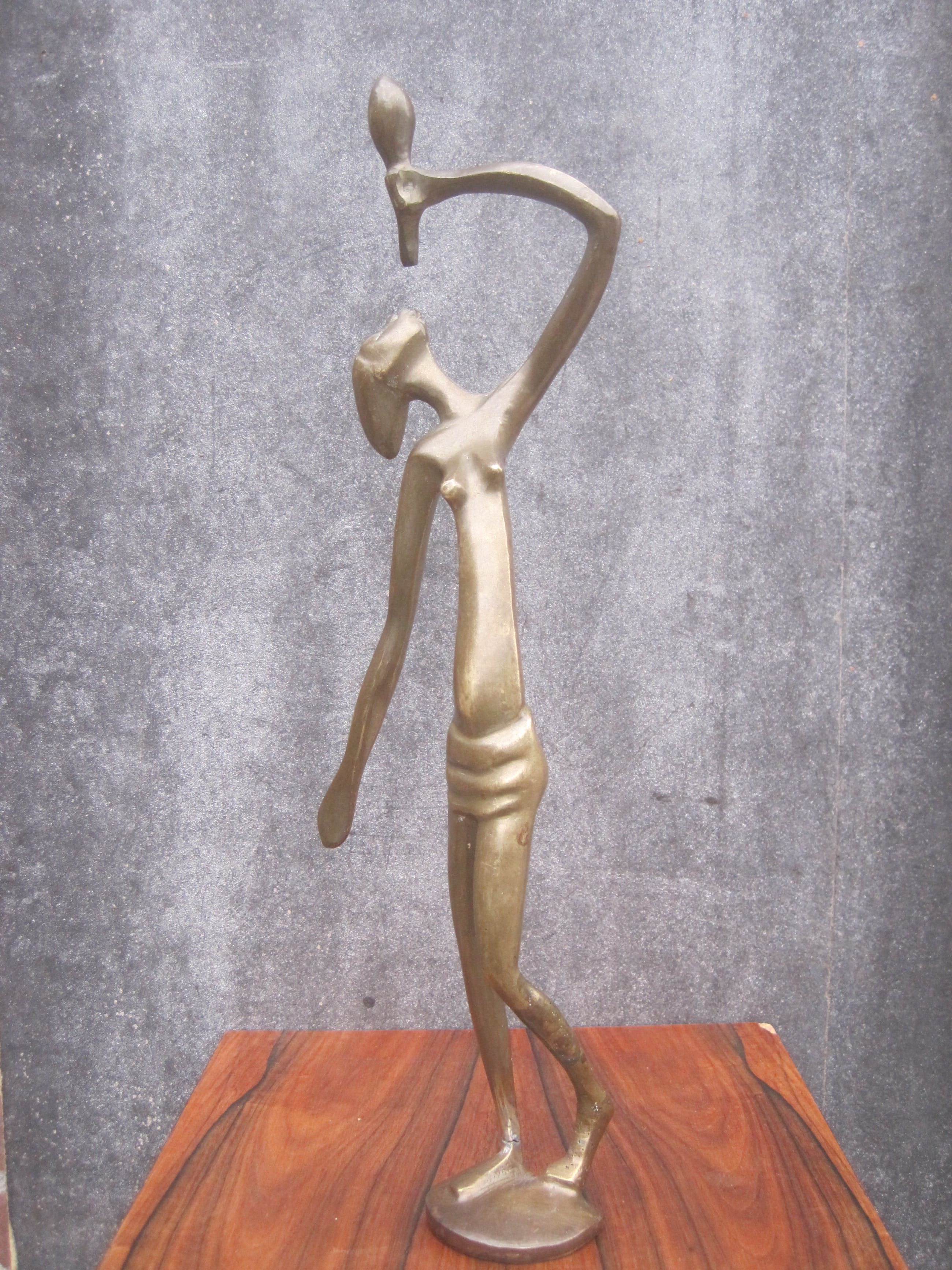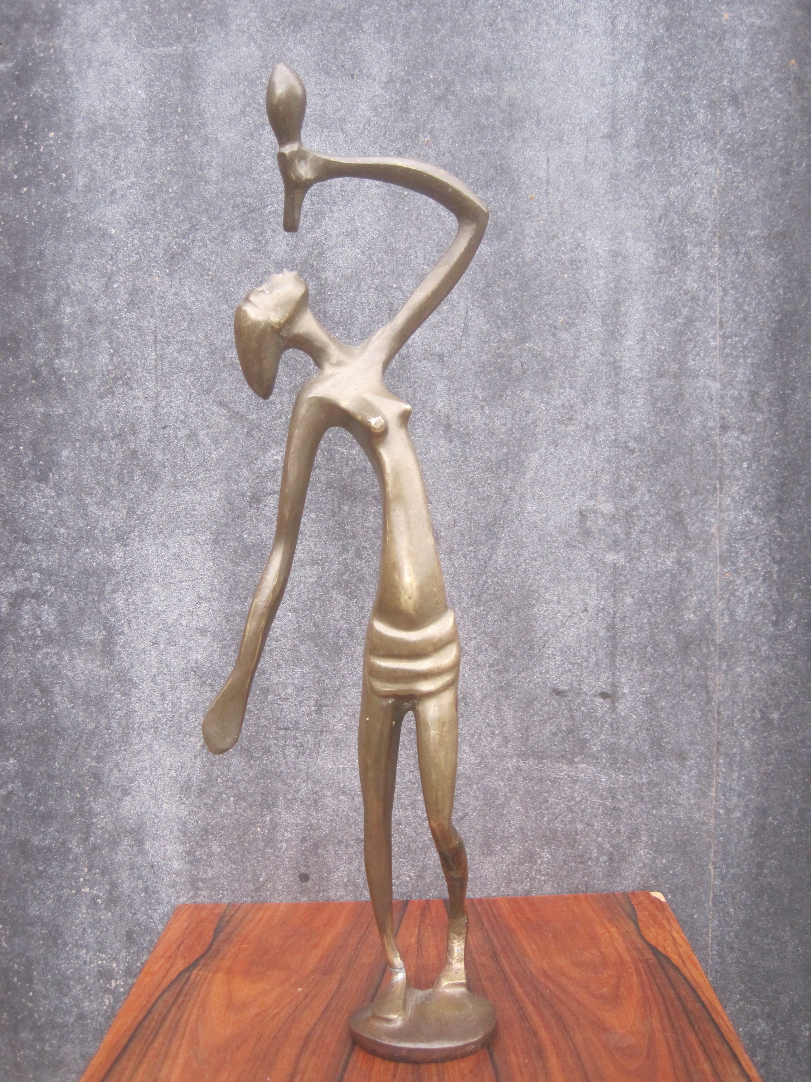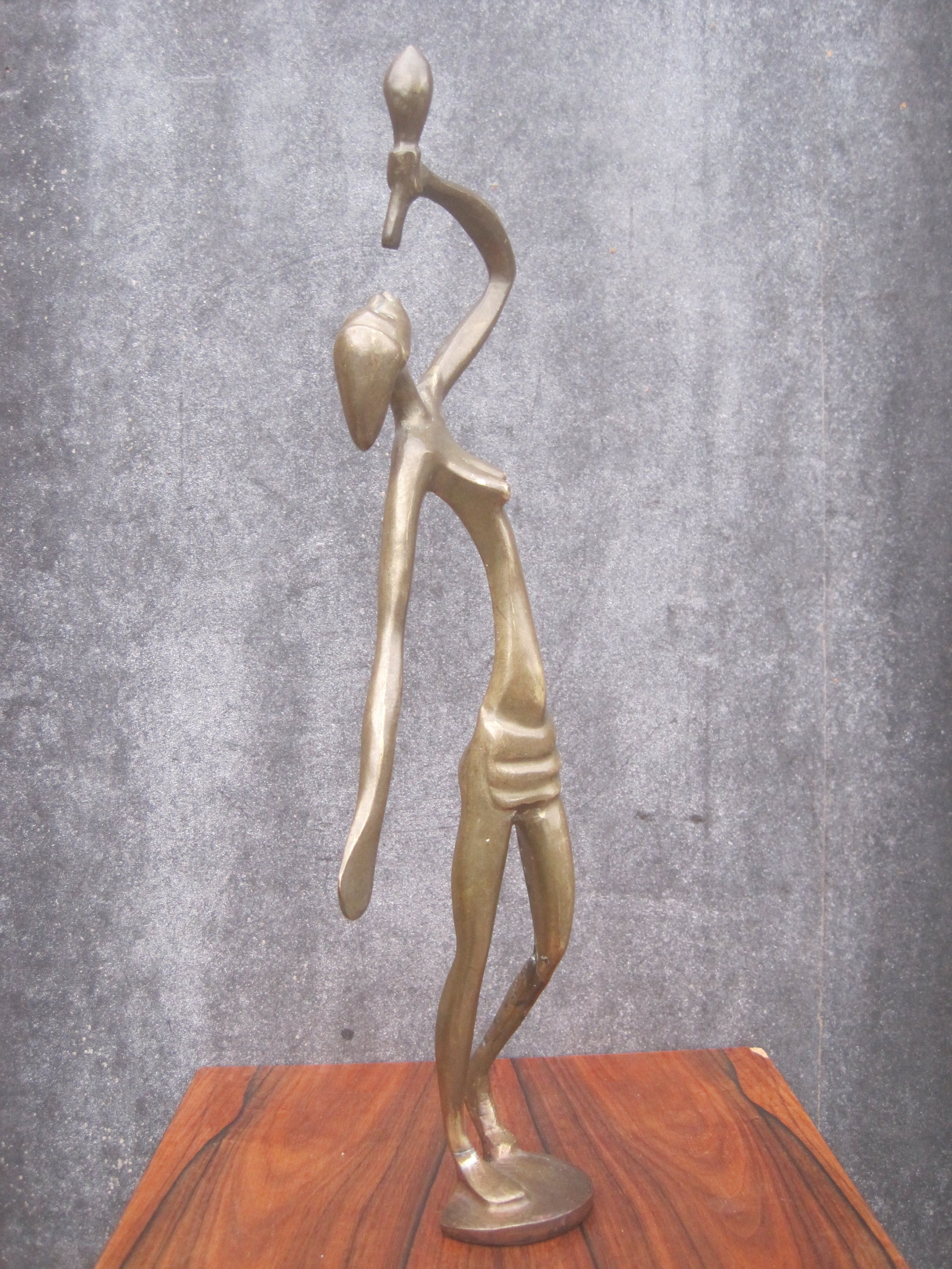 Een slank en gestileerd zwaar bronzen beeld van een feestende vrouw. Gegoten in Hagenauer stijl. Dit beeld heeft aan de achterkant enkele plekken met wat donkerder brons. In haar rechter enkel zit een barst.